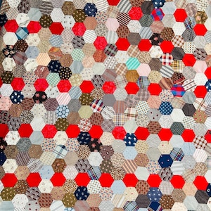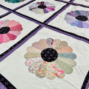 The quilt top is from a smoke-free, pet-free home and is pictured on a queen-size bed.