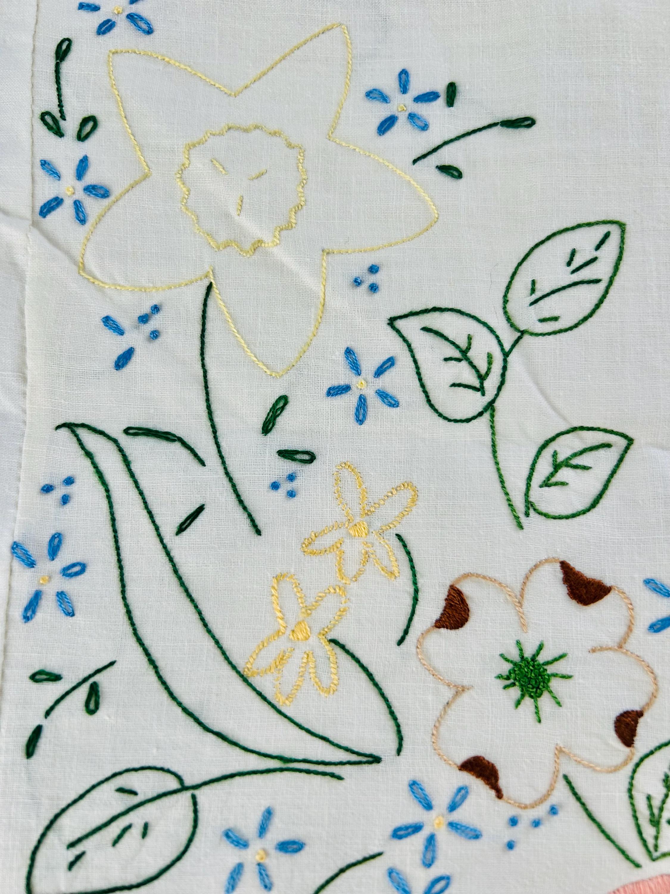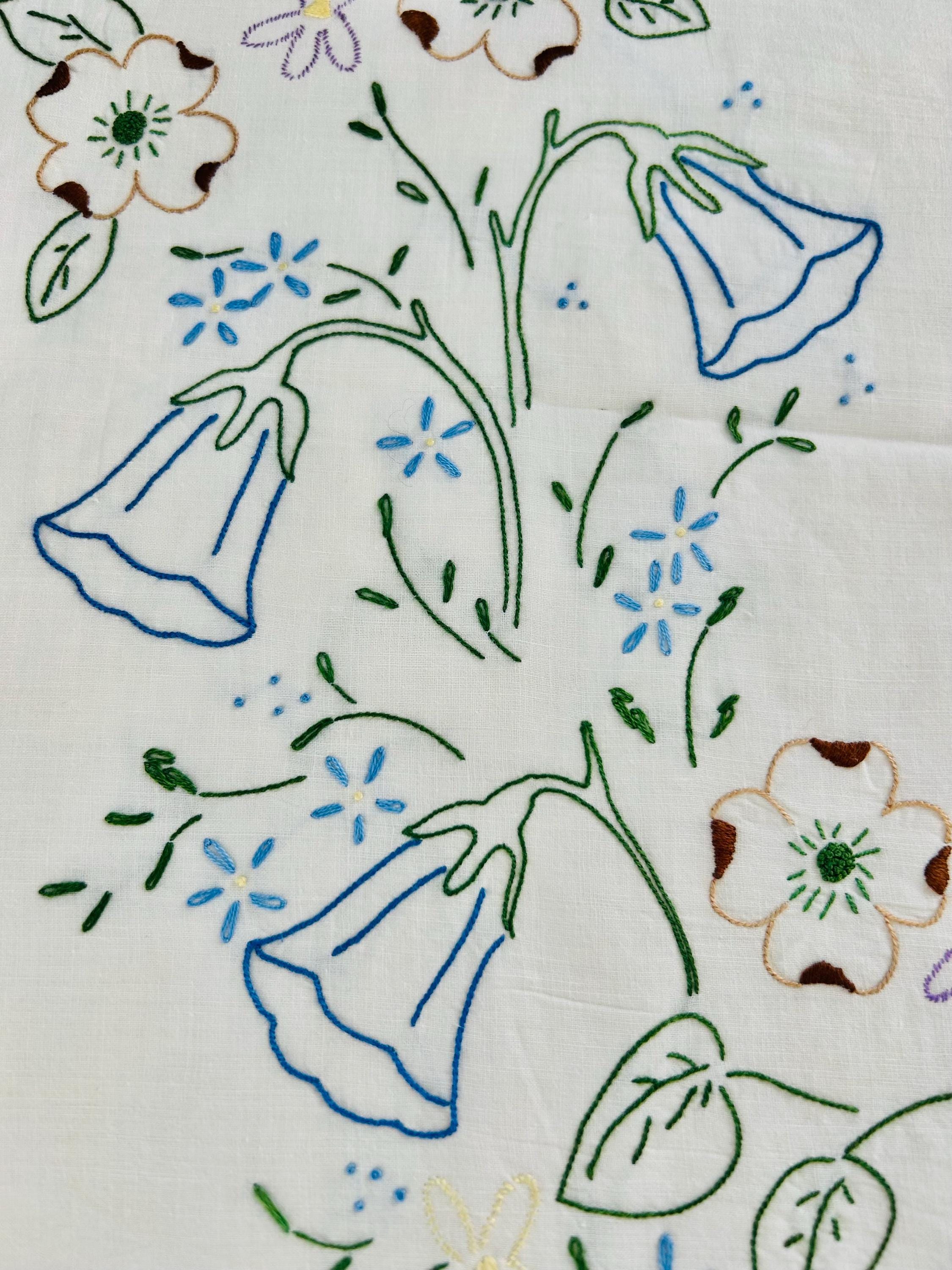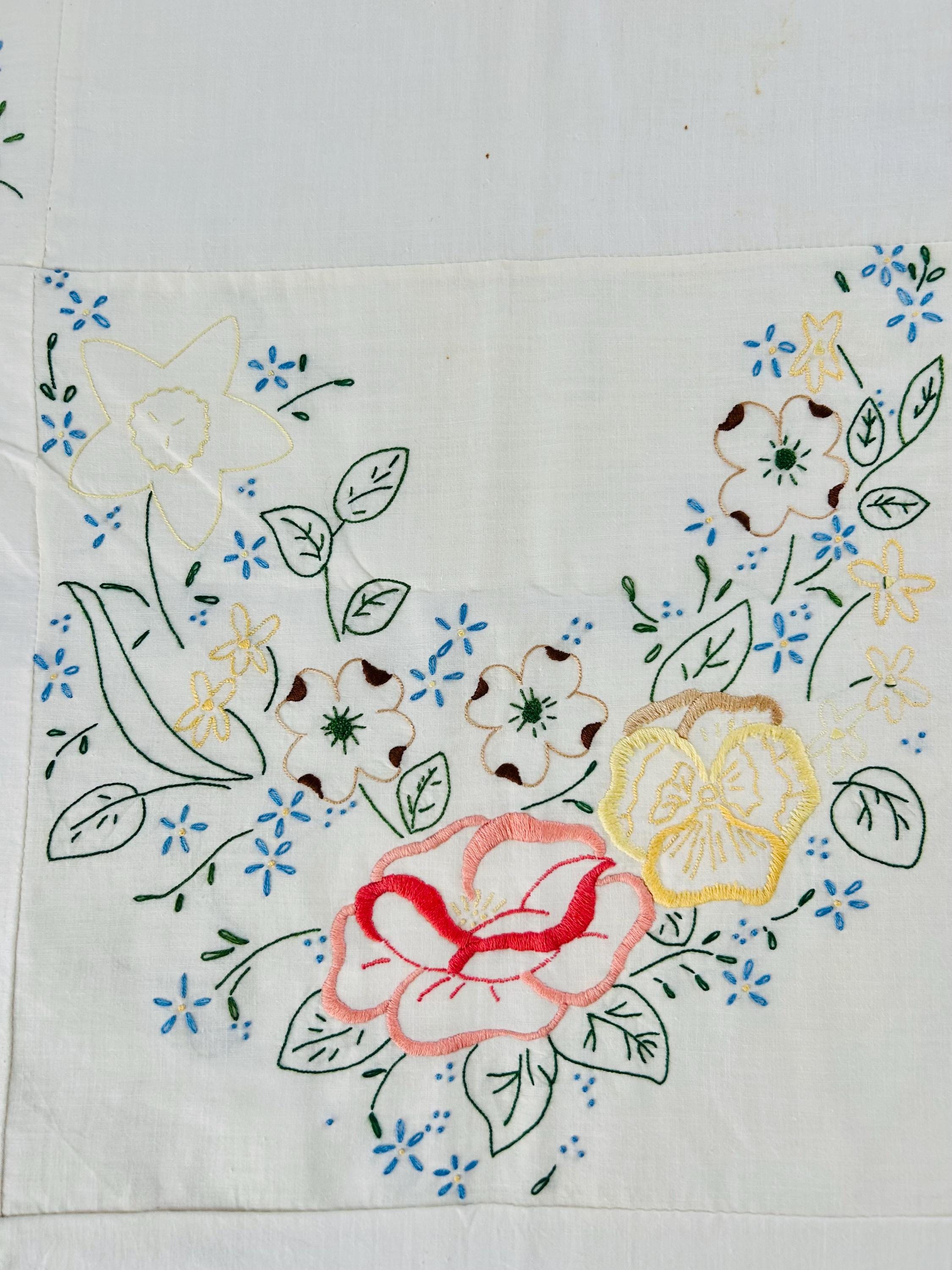 The design showcases embroidered roses, bellflowers, and small garden florals stitched in soft pastel shades of blue, yellow, pink, lavender, and green on a white ground. The embroidery is consistent and neatly executed and the quilt top is in excellent vintage condition.