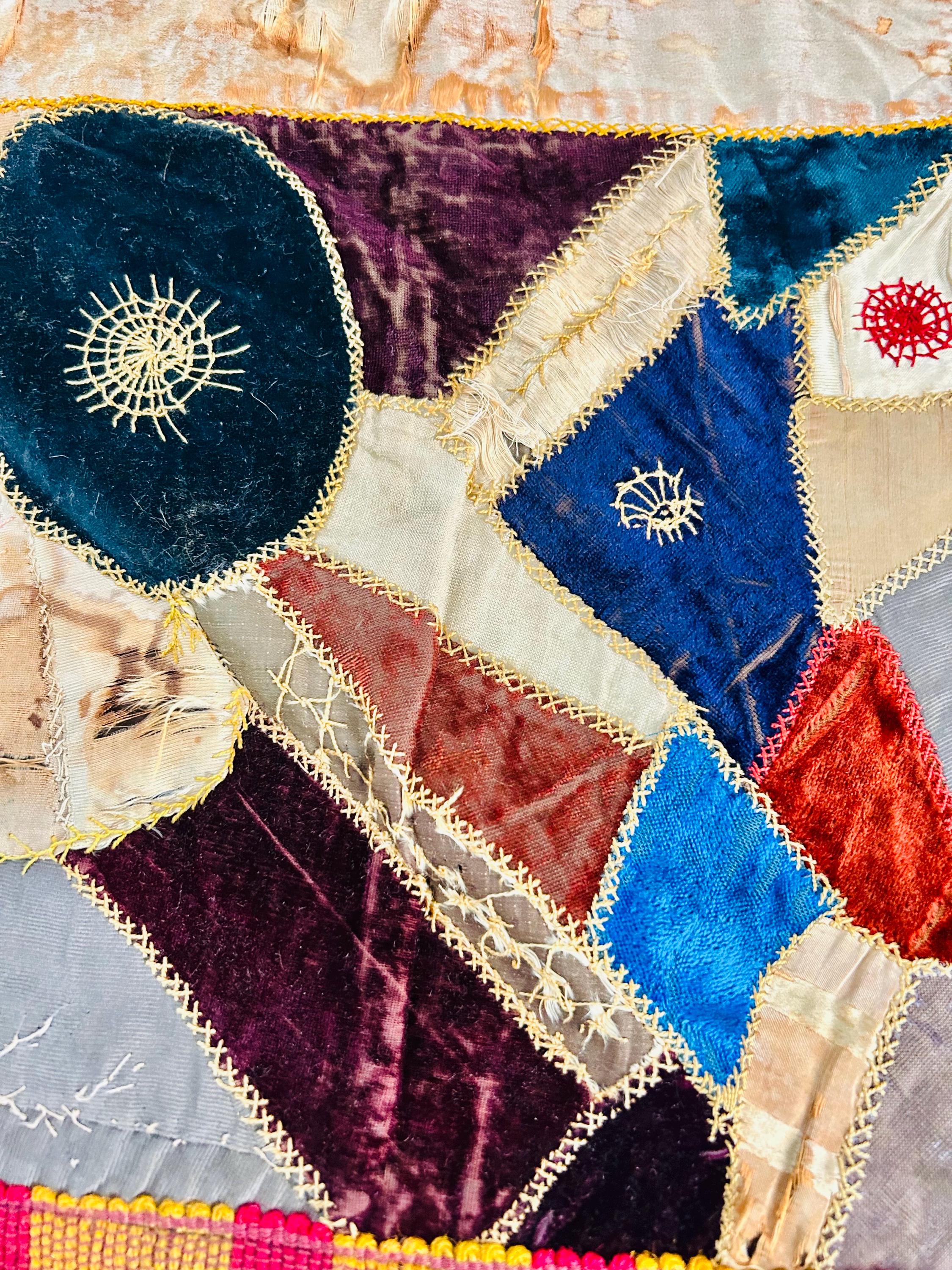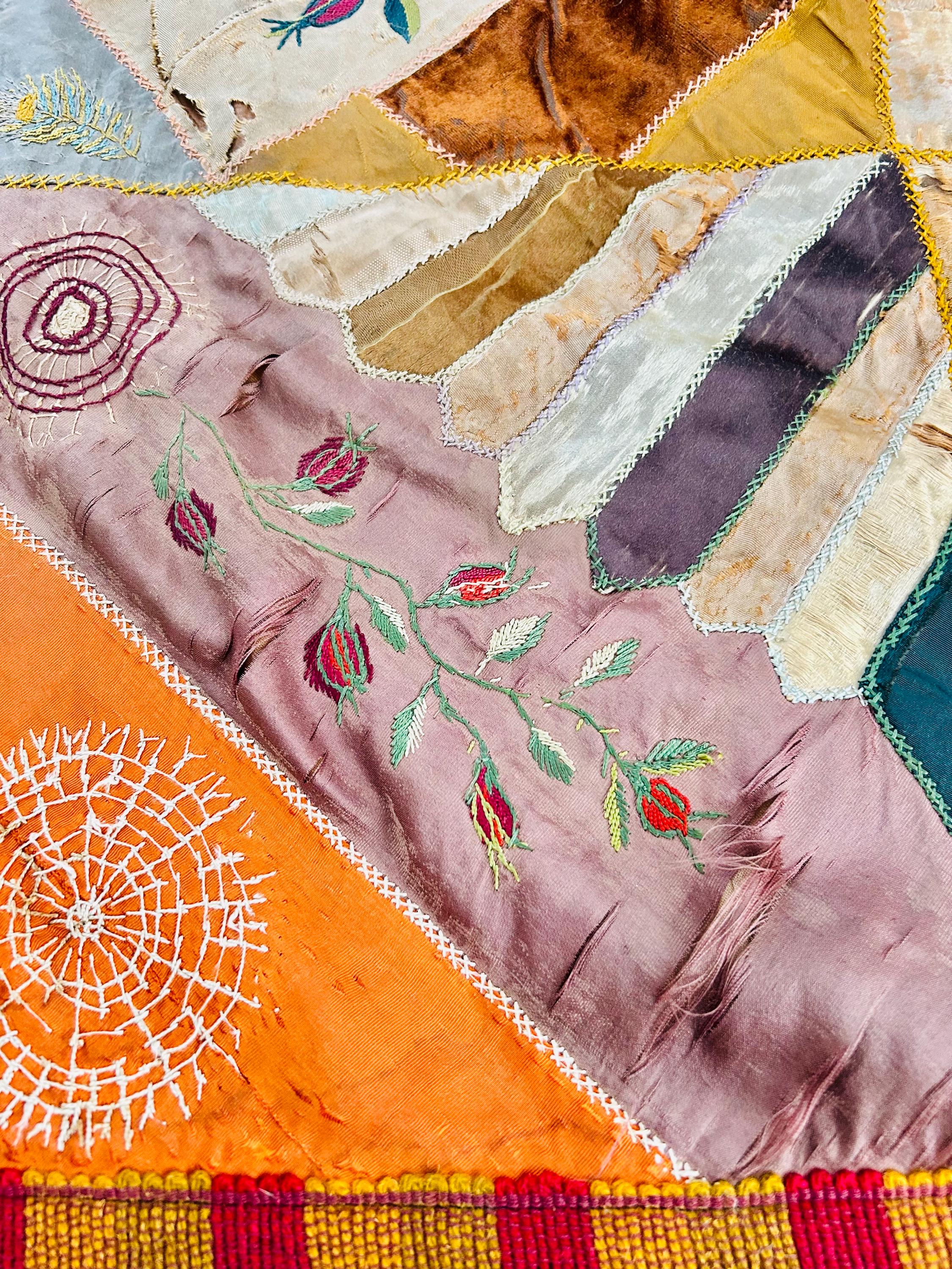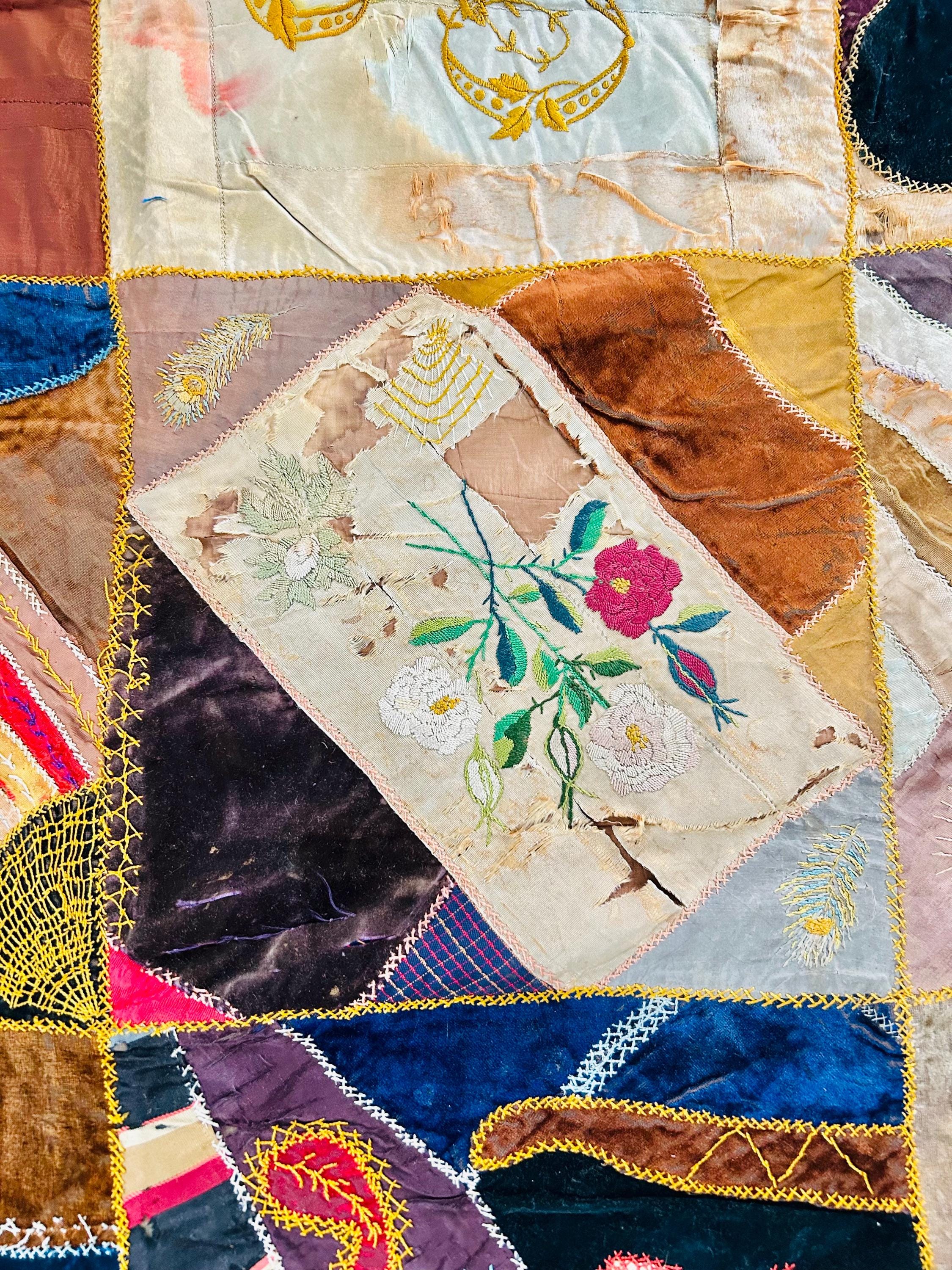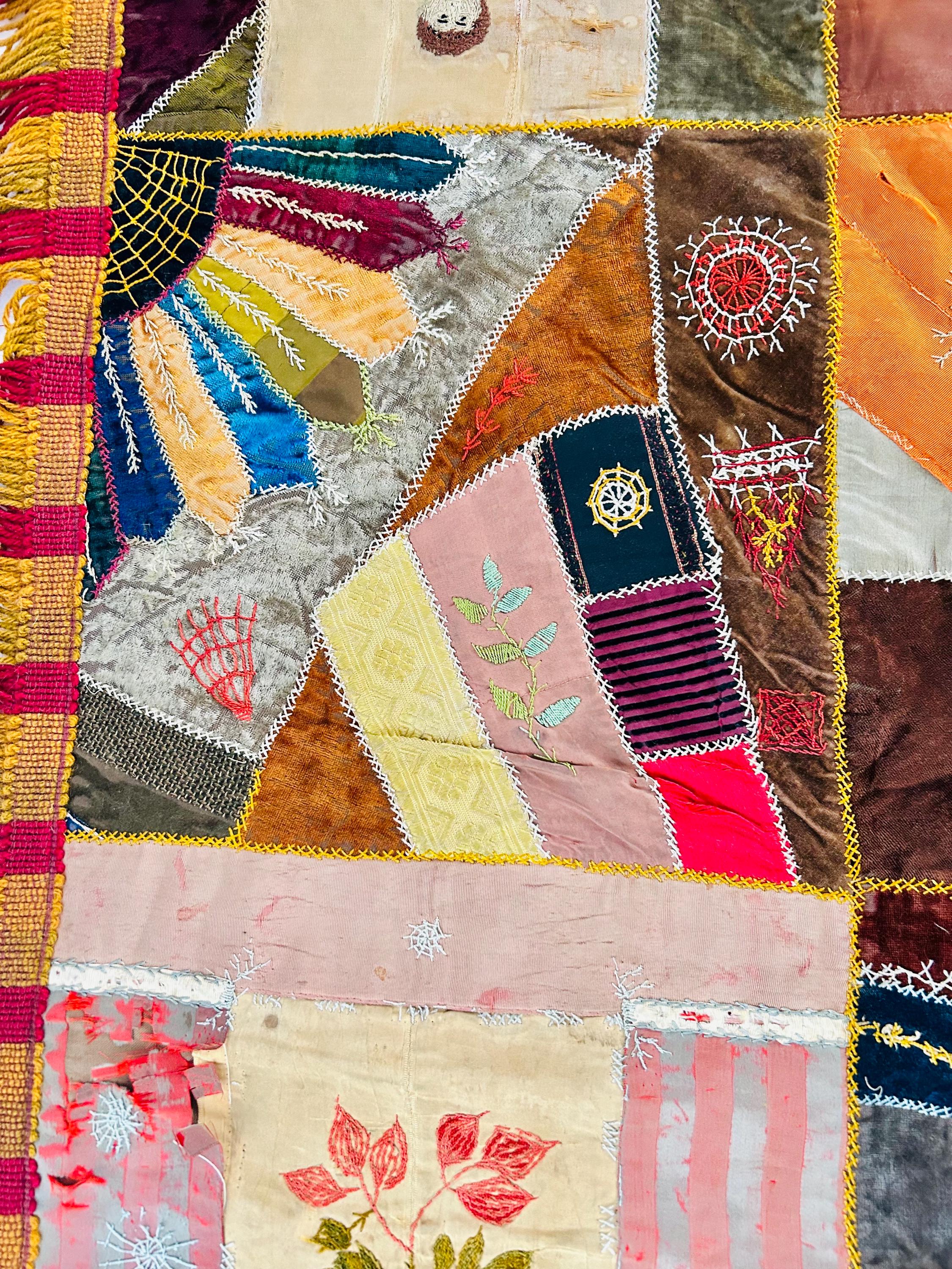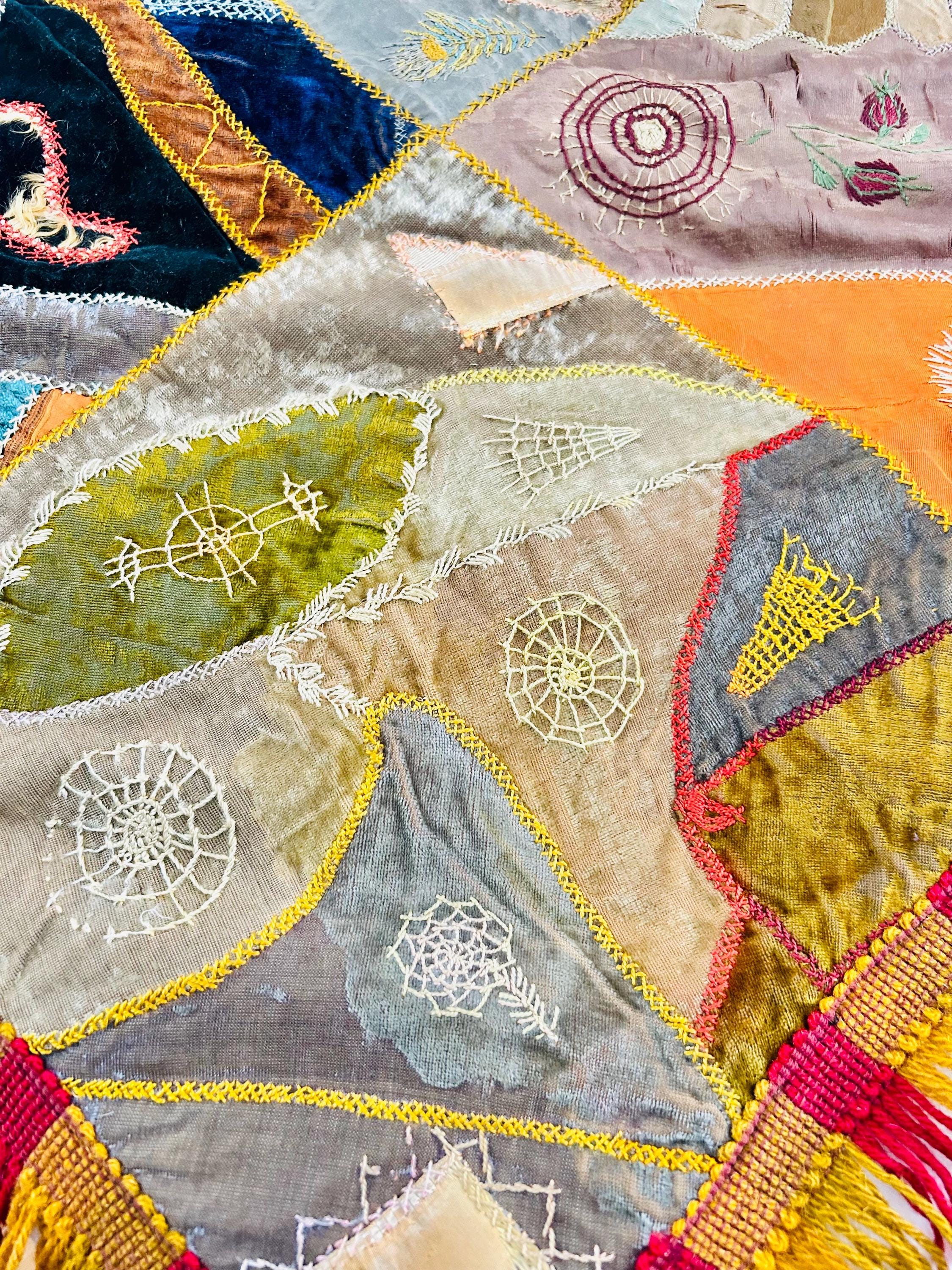 The quilt is pieced from an exceptional assortment of silk taffetas, satins, silk velvet, and fine wool fabrics, many of which originated as dress silks. The irregular “crazy” construction is richly embellished with extensive hand embroidery, including feather stitch, herringbone, cross-stitch, spiderweb motifs, laid thread work, and other decorative seam treatments typical of late-19th-century needlework.