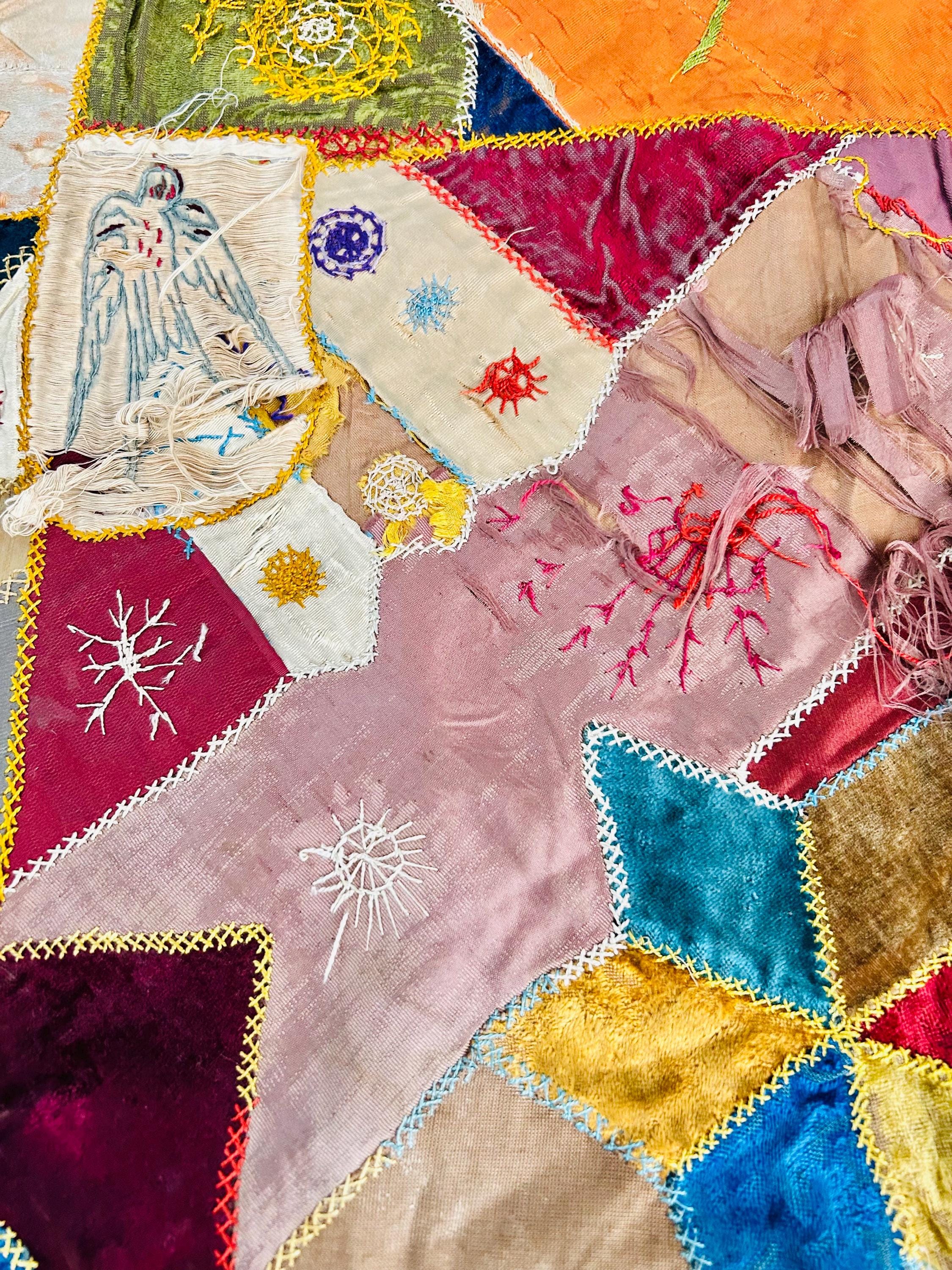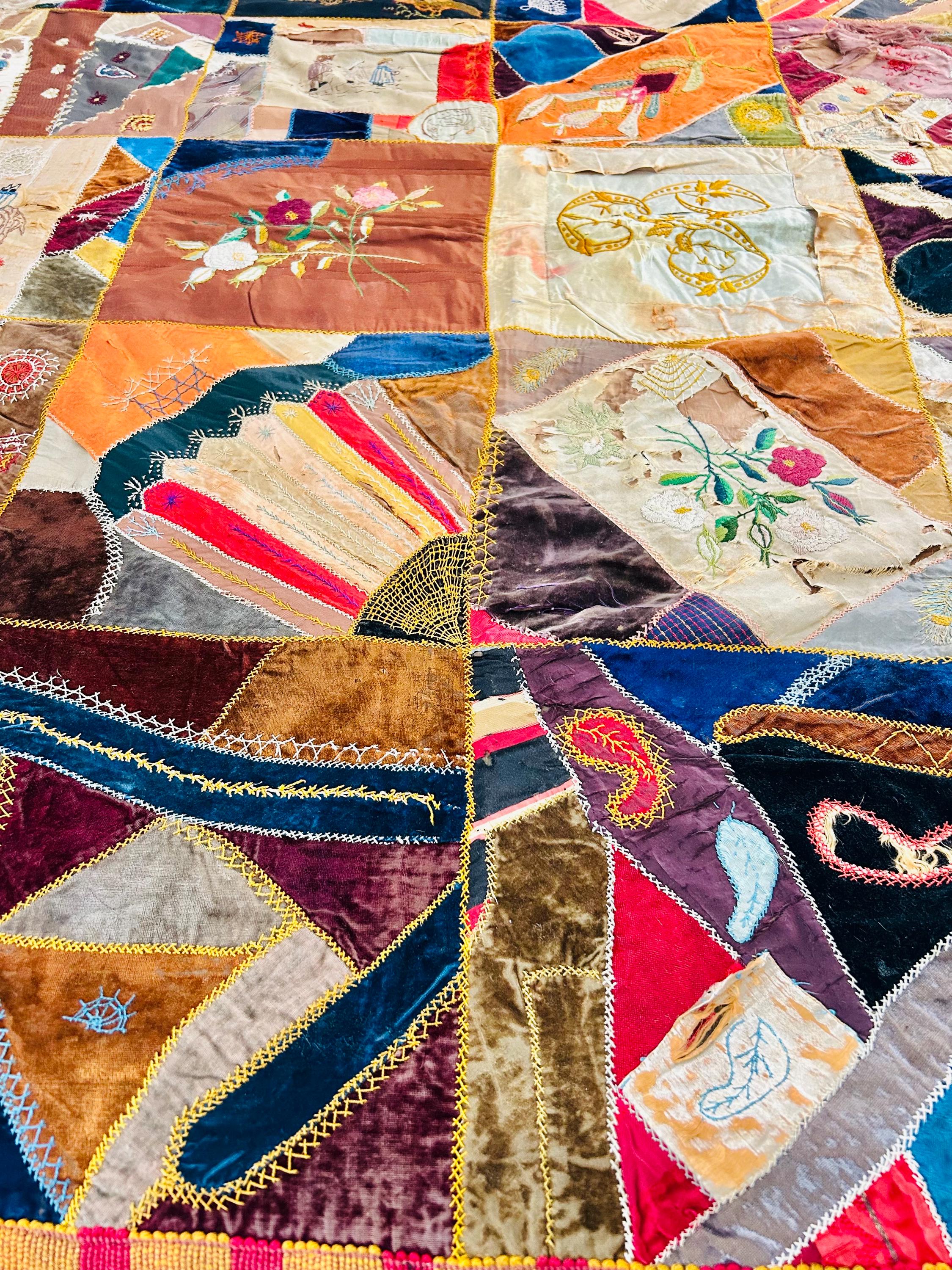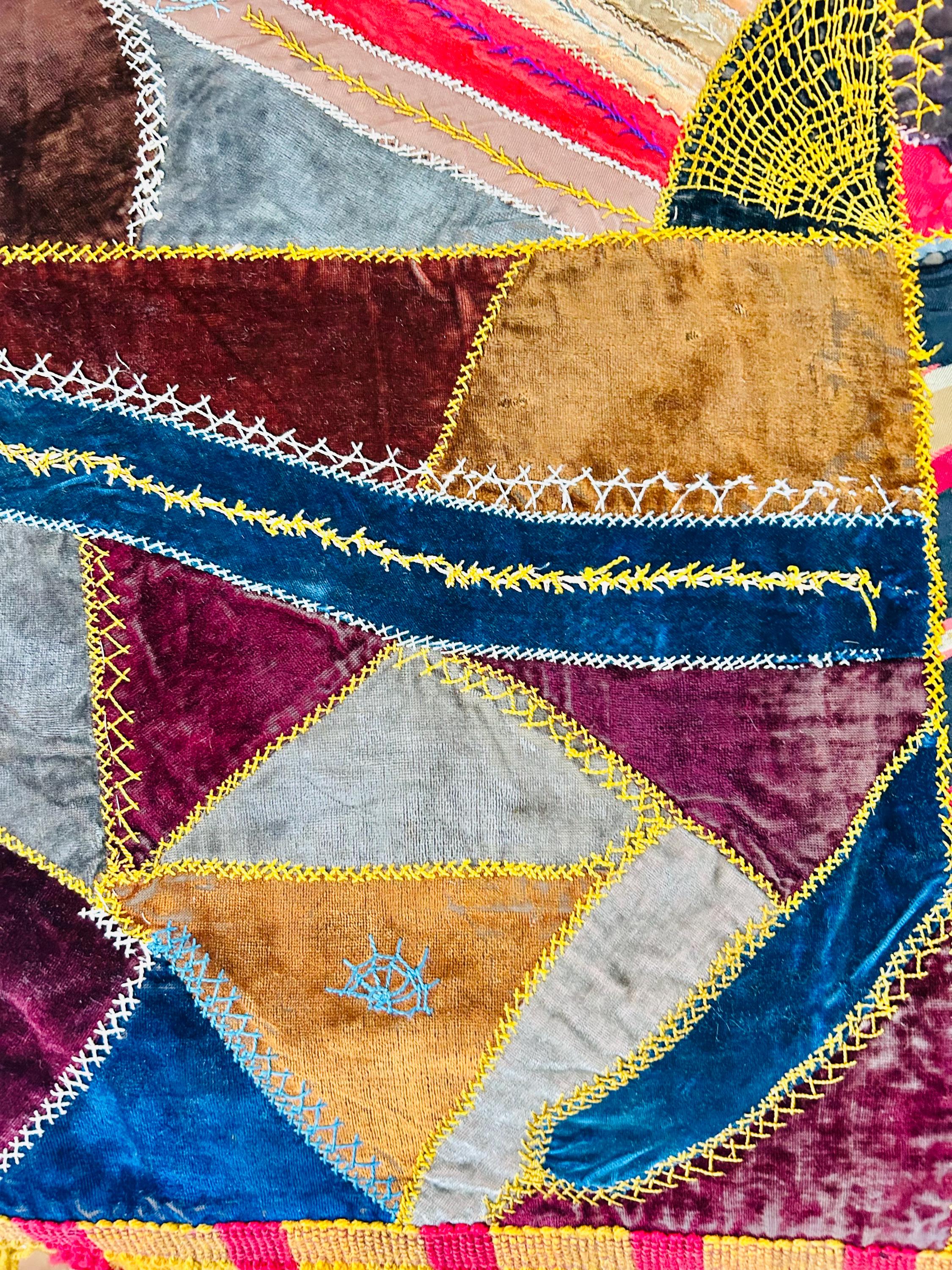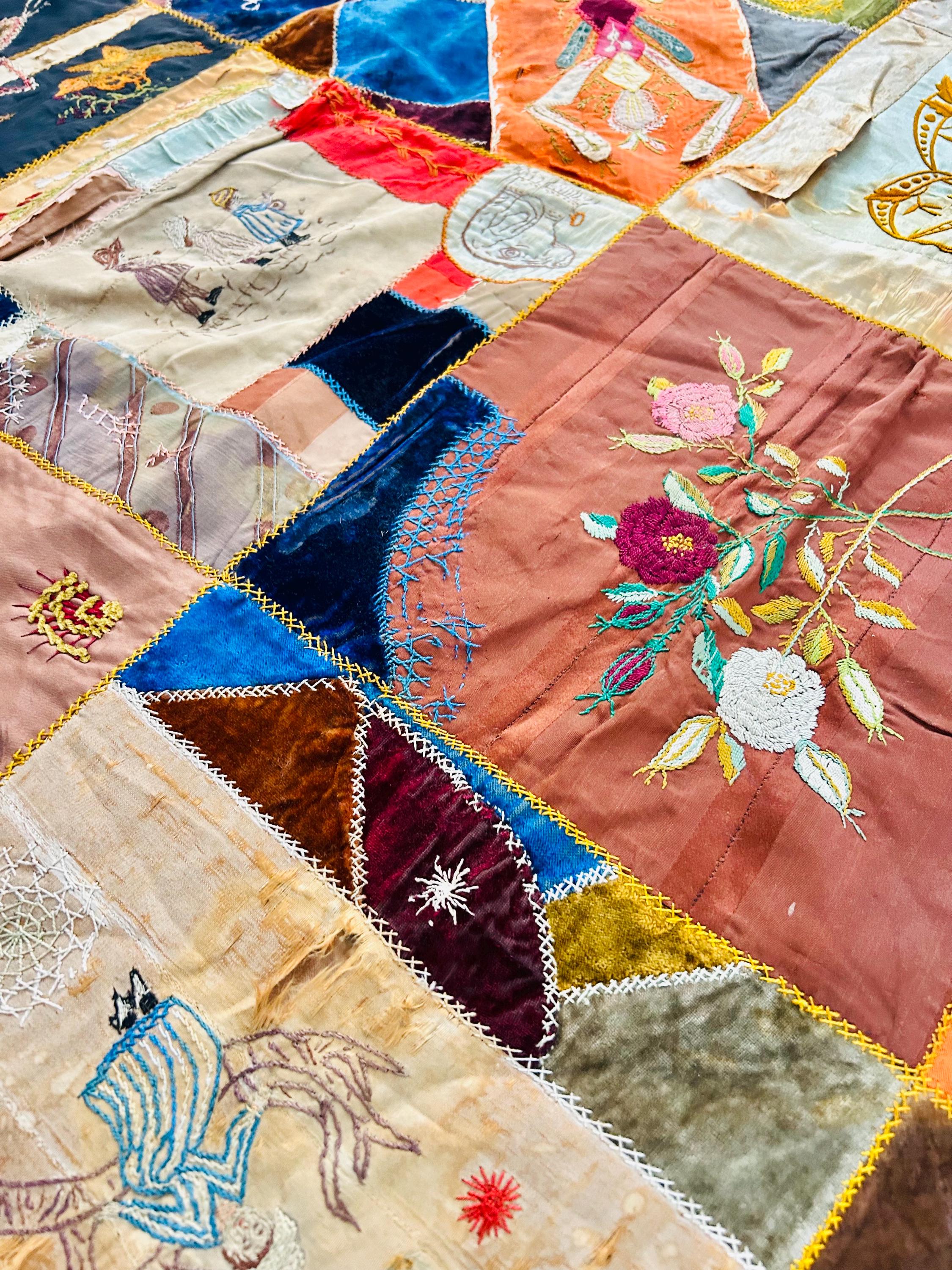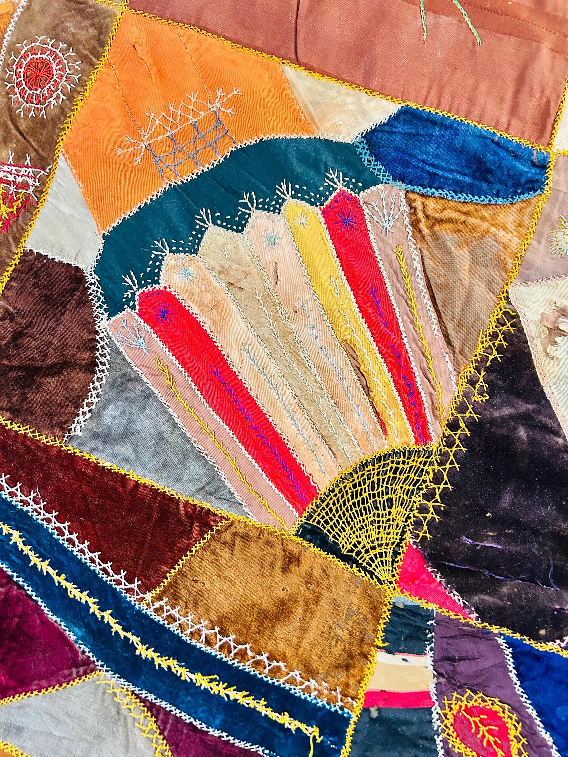 The quilt is pieced from an exceptional assortment of silk taffetas, satins, silk velvet, and fine wool fabrics, many of which originated as dress silks. The irregular “crazy” construction is richly embellished with extensive hand embroidery, including feather stitch, herringbone, cross-stitch, spiderweb motifs, laid thread work, and other decorative seam treatments typical of late-19th-century needlework.