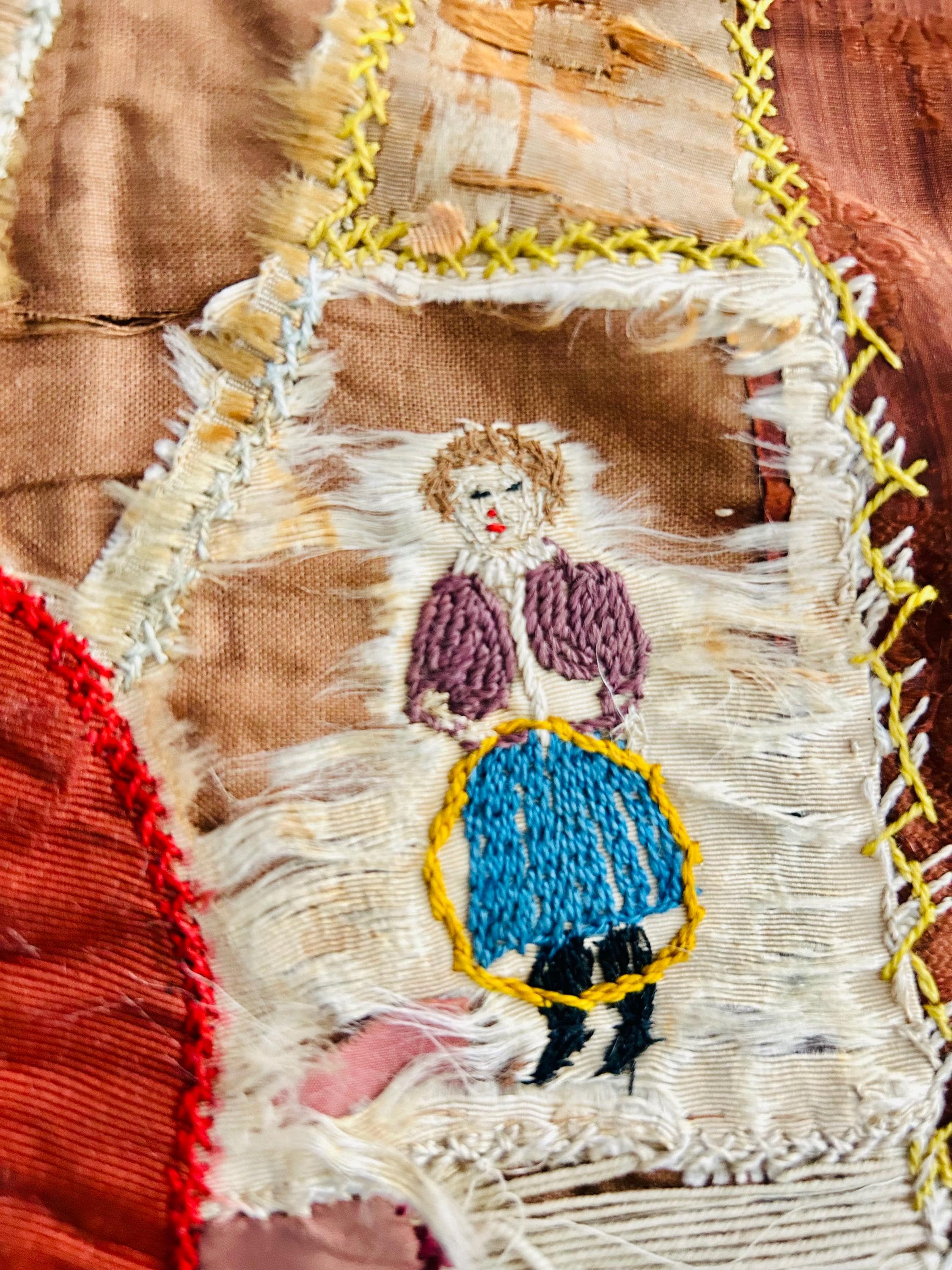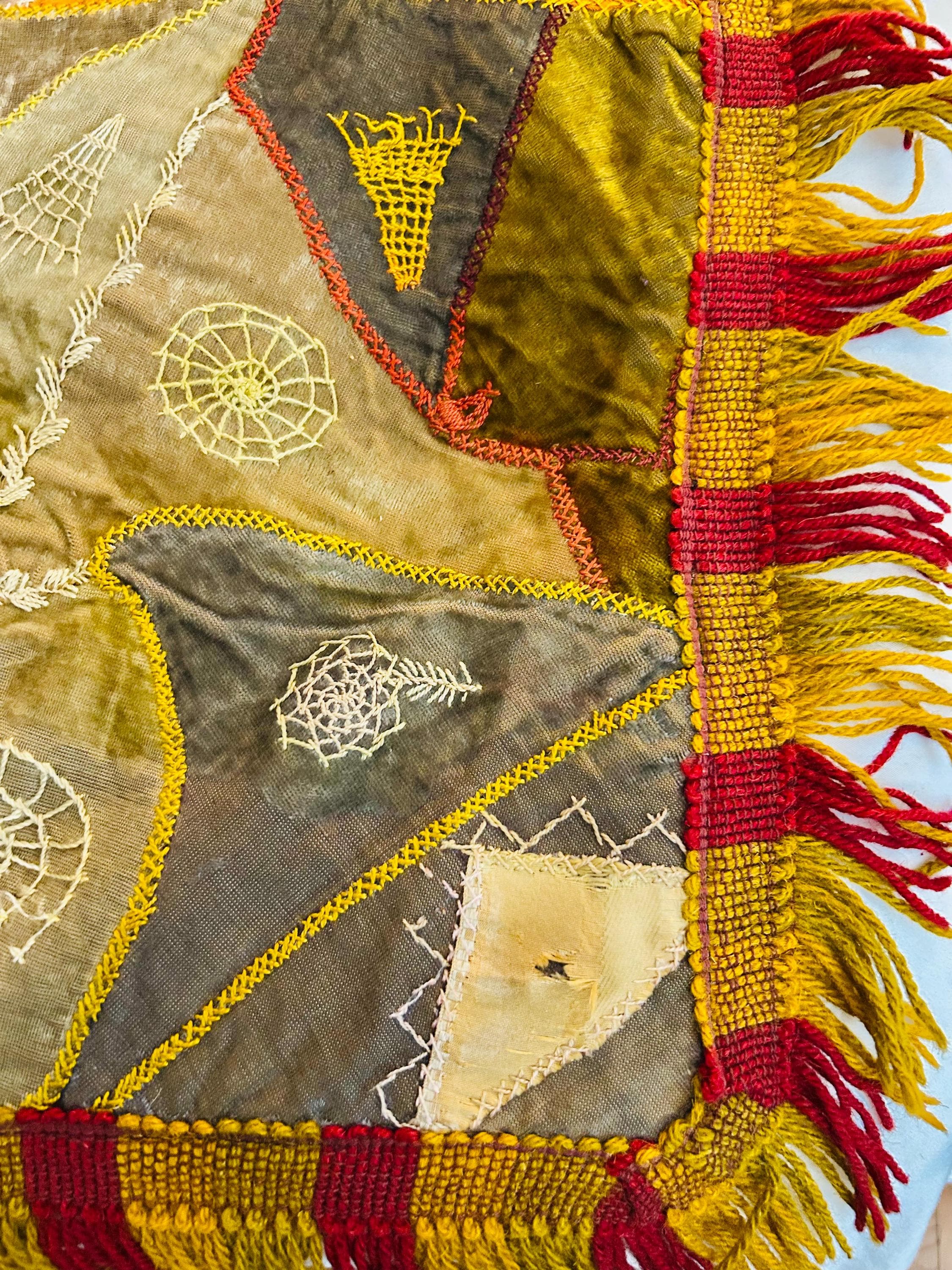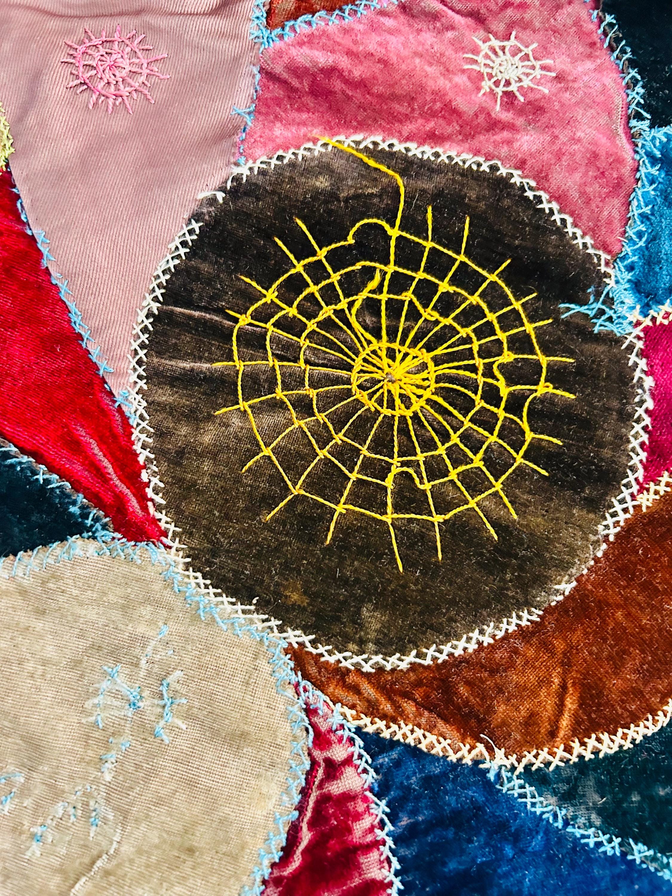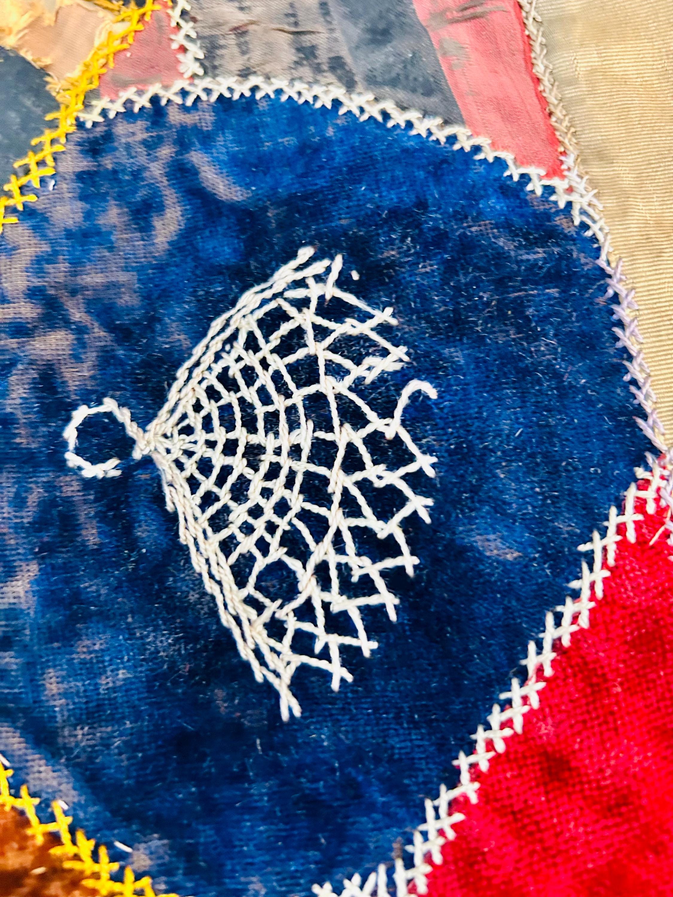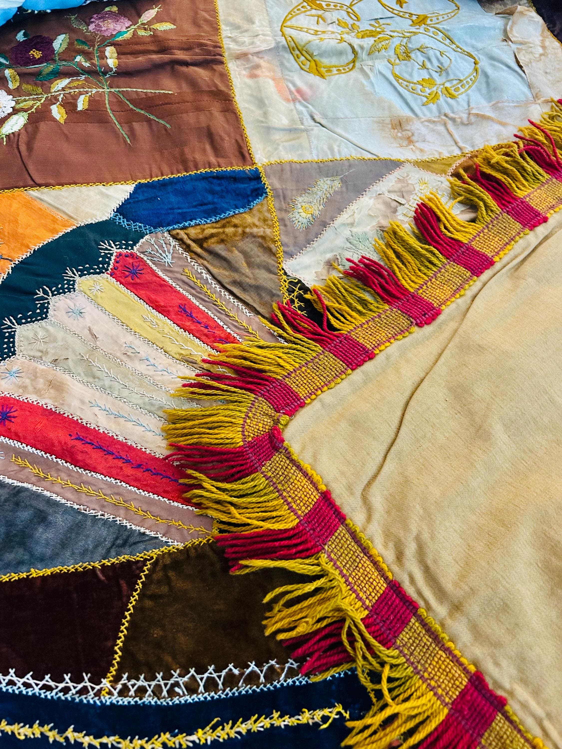 The quilt is pieced from an exceptional assortment of silk taffetas, satins, silk velvet, and fine wool fabrics, many of which originated as dress silks. The irregular “crazy” construction is richly embellished with extensive hand embroidery, including feather stitch, herringbone, cross-stitch, spiderweb motifs, laid thread work, and other decorative seam treatments typical of late-19th-century needlework.