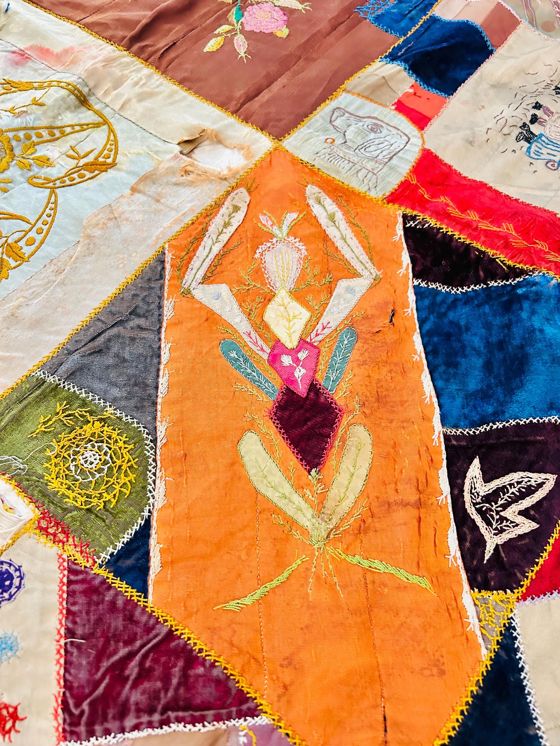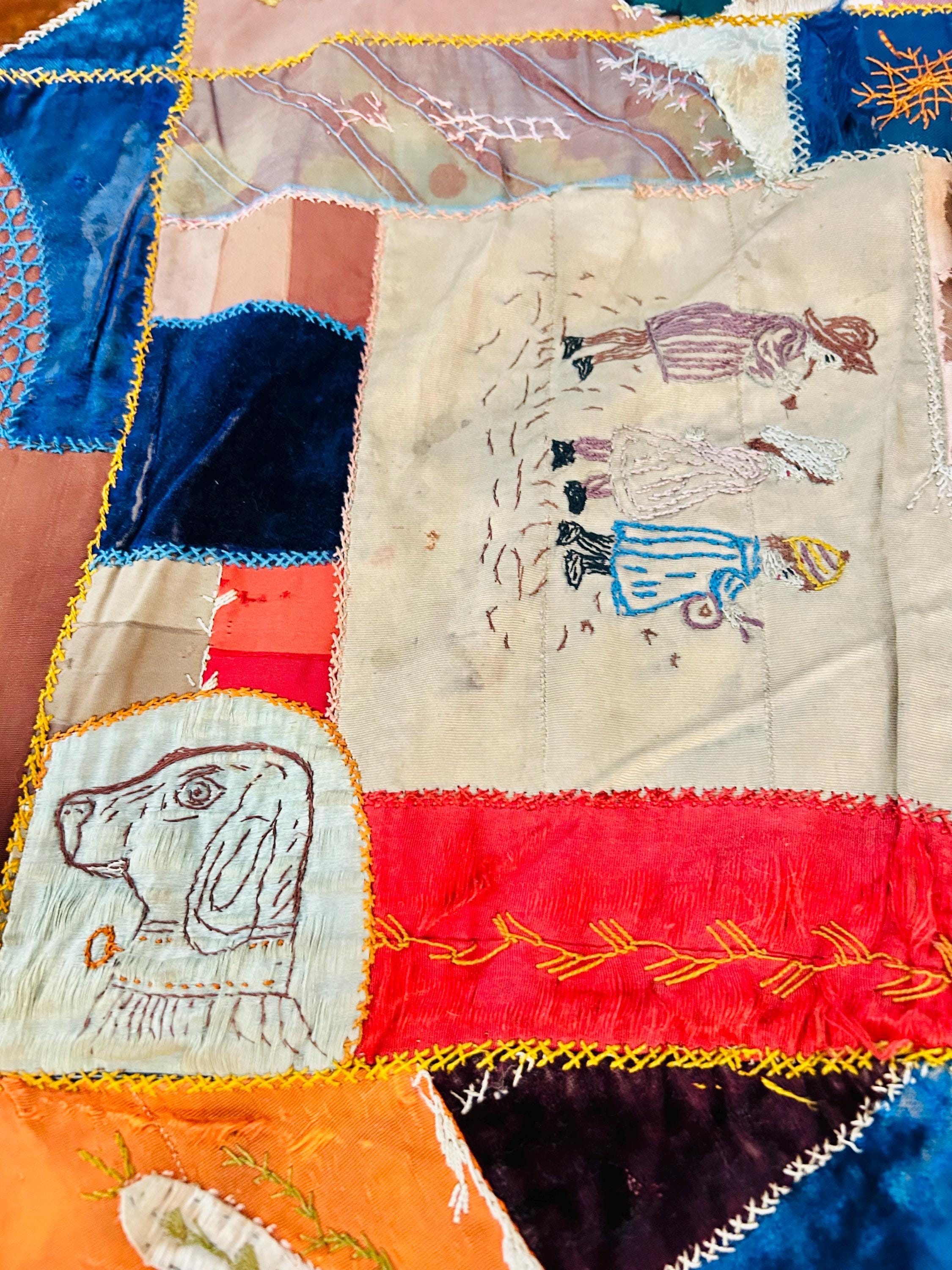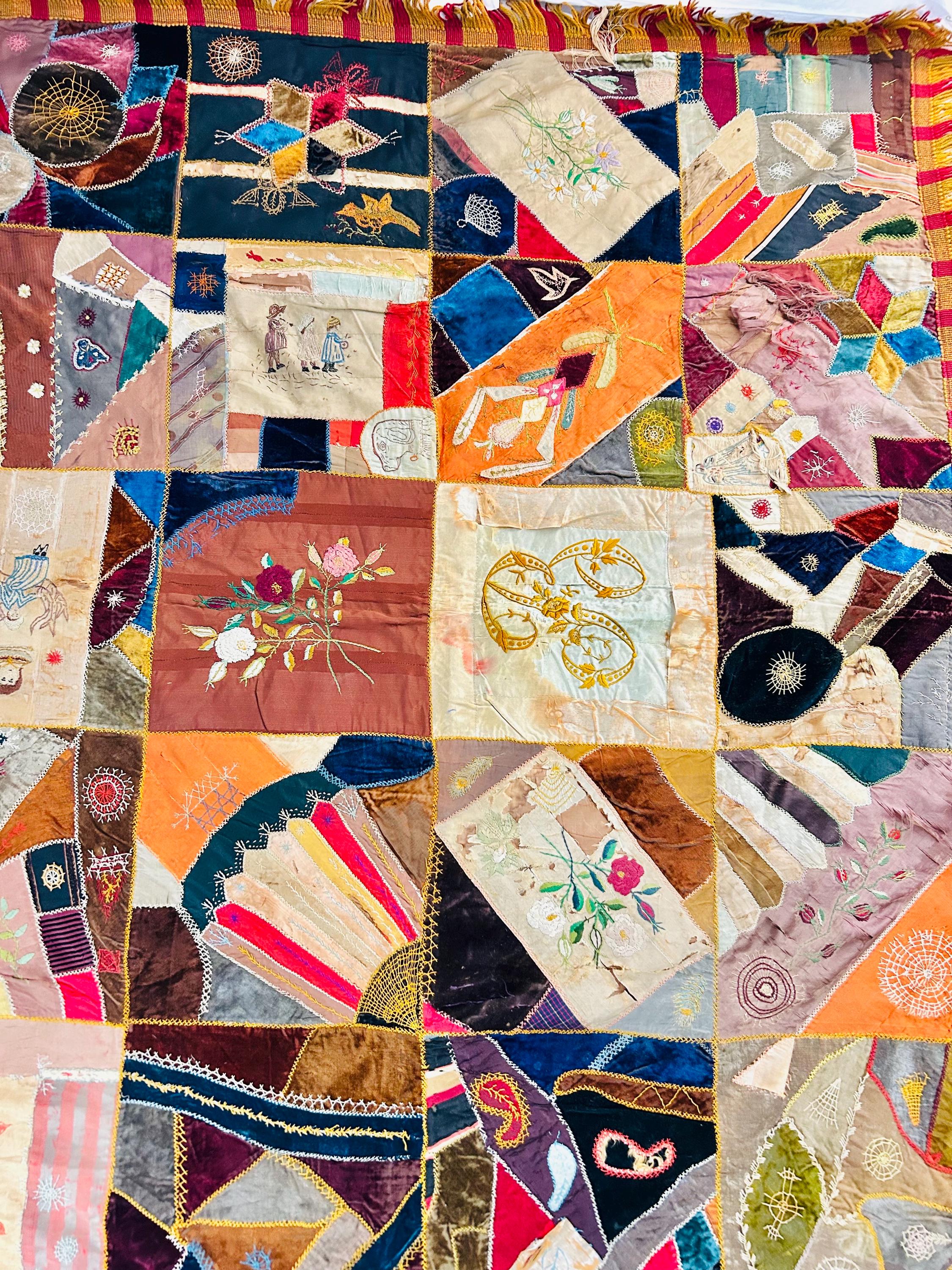Panels feature fans and whimsical and unique pictorial embroidery, including children, animals, florals, and symbolic motifs—hallmarks of Victorian-era crazy quilts made as conversation pieces for the parlor.