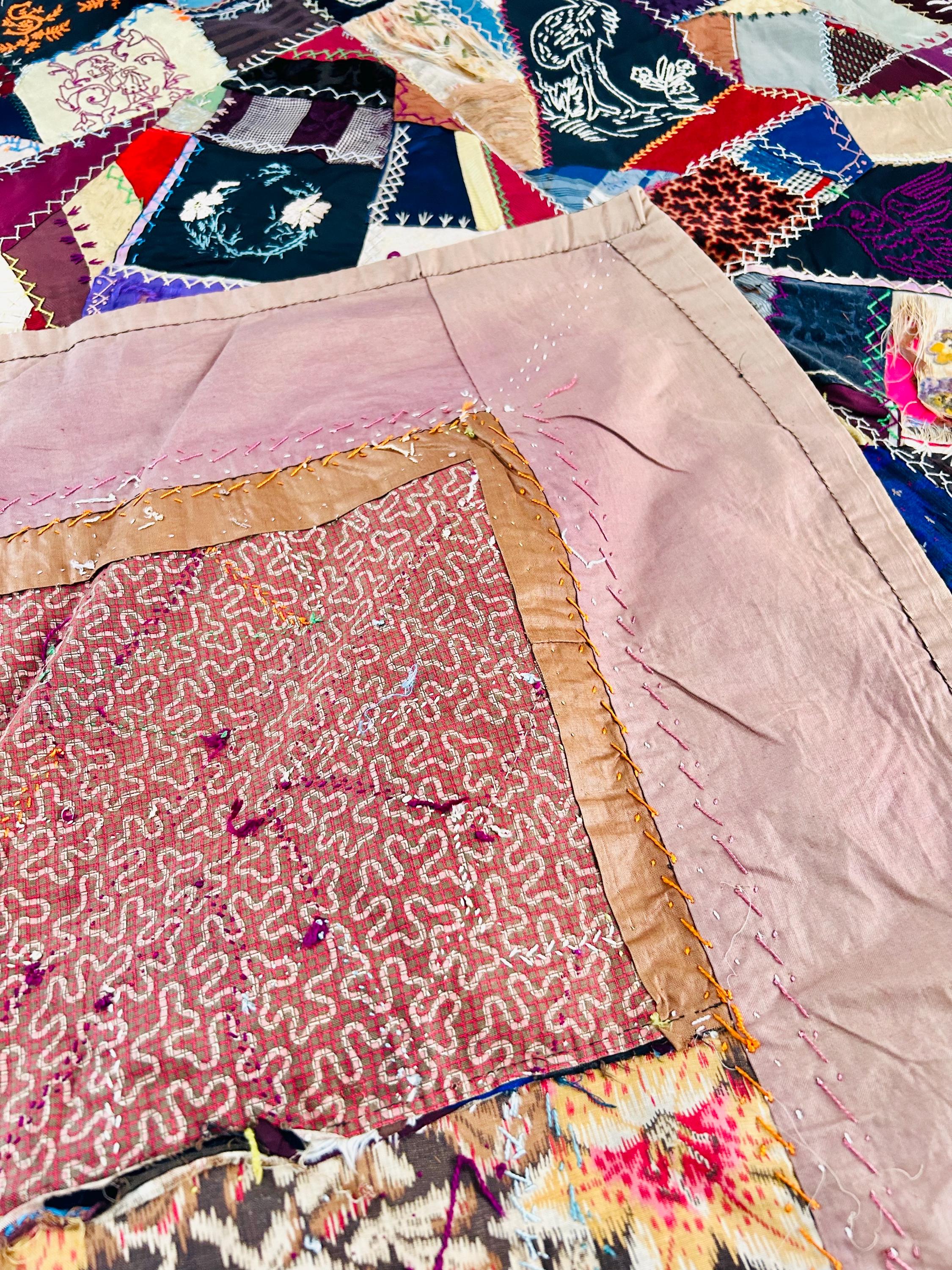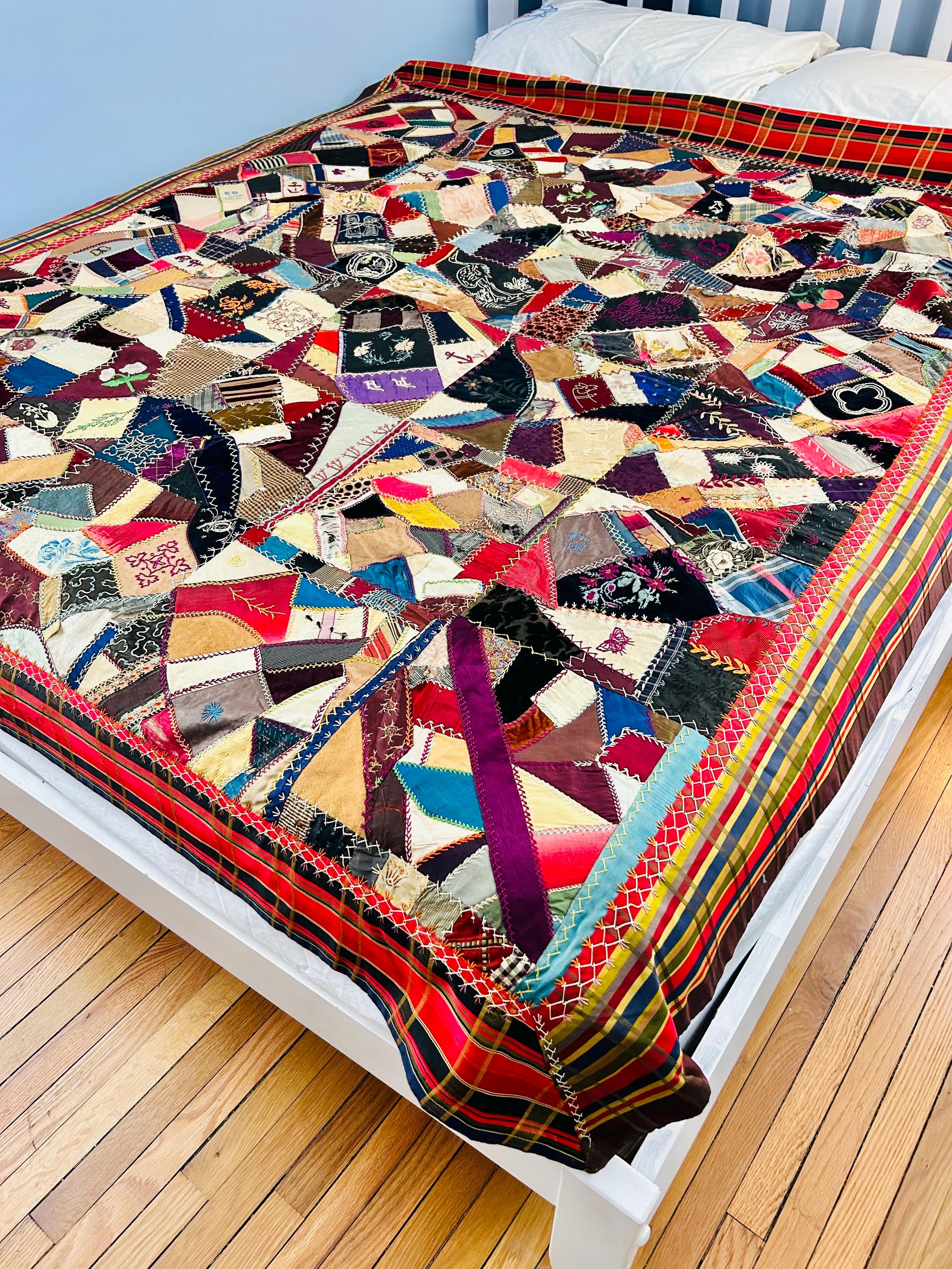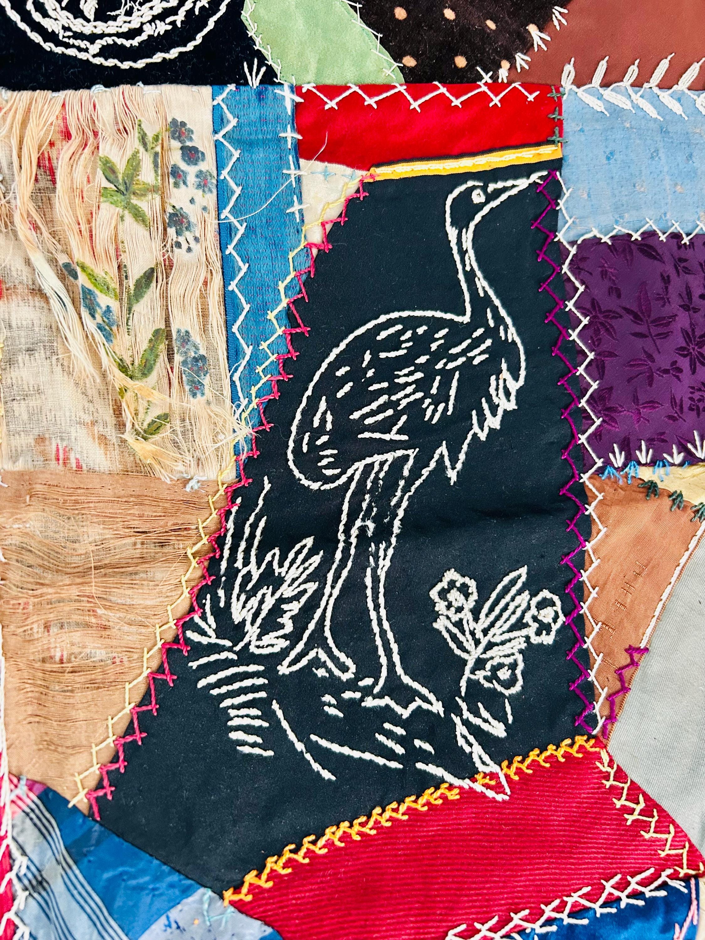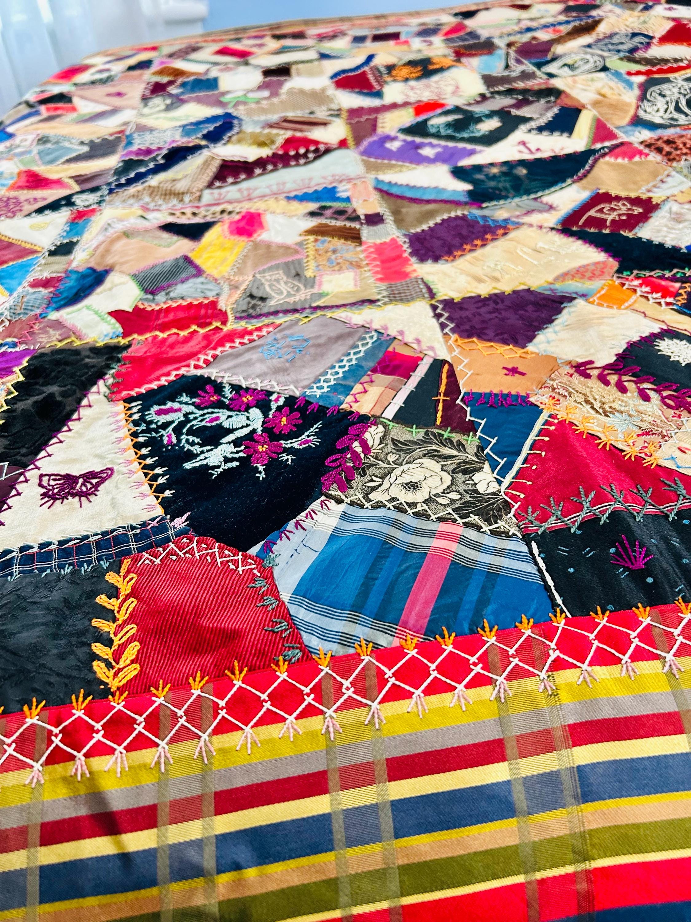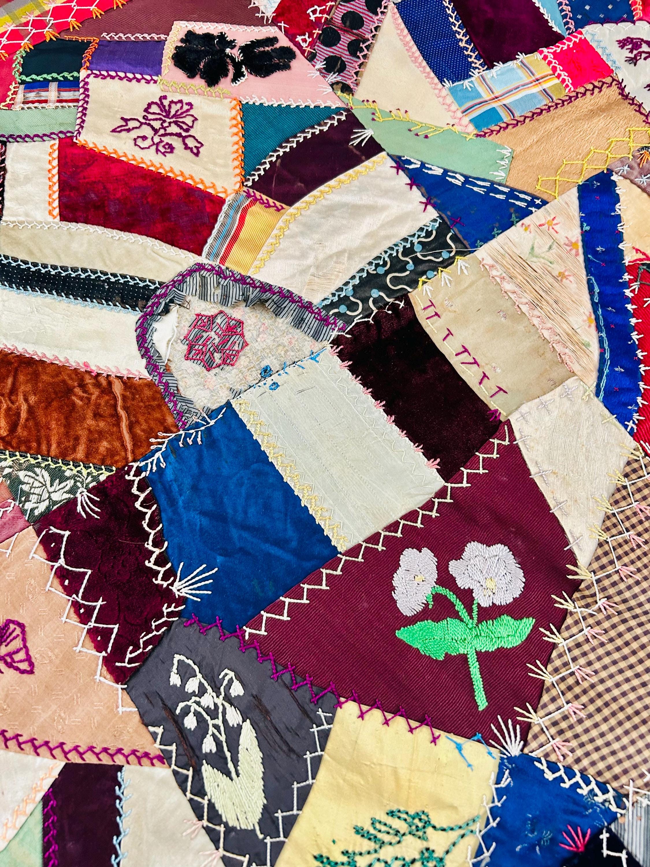 Details: • Era: late 19th century; 1880s • Construction: Hand foundation pieced • Embroidery: Entirely hand embroidered • Materials: Antique silks, velvets, brocades, and dress fabrics • Size: 64” x 72”
