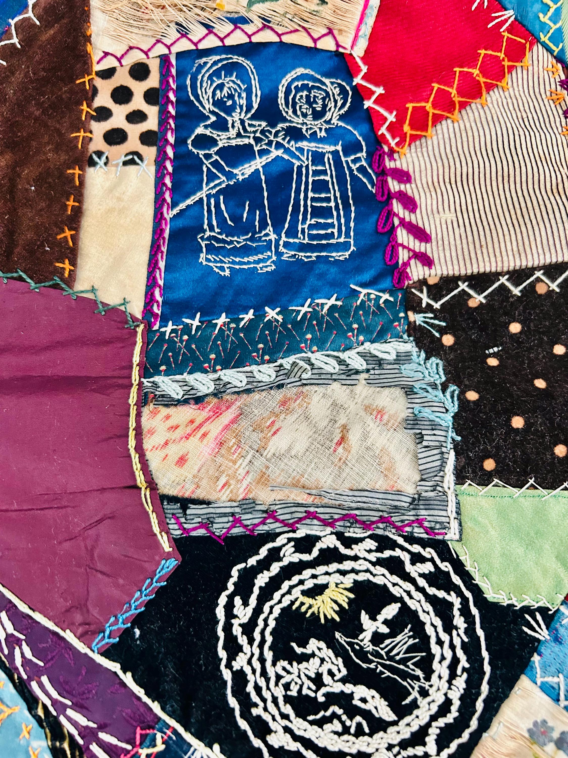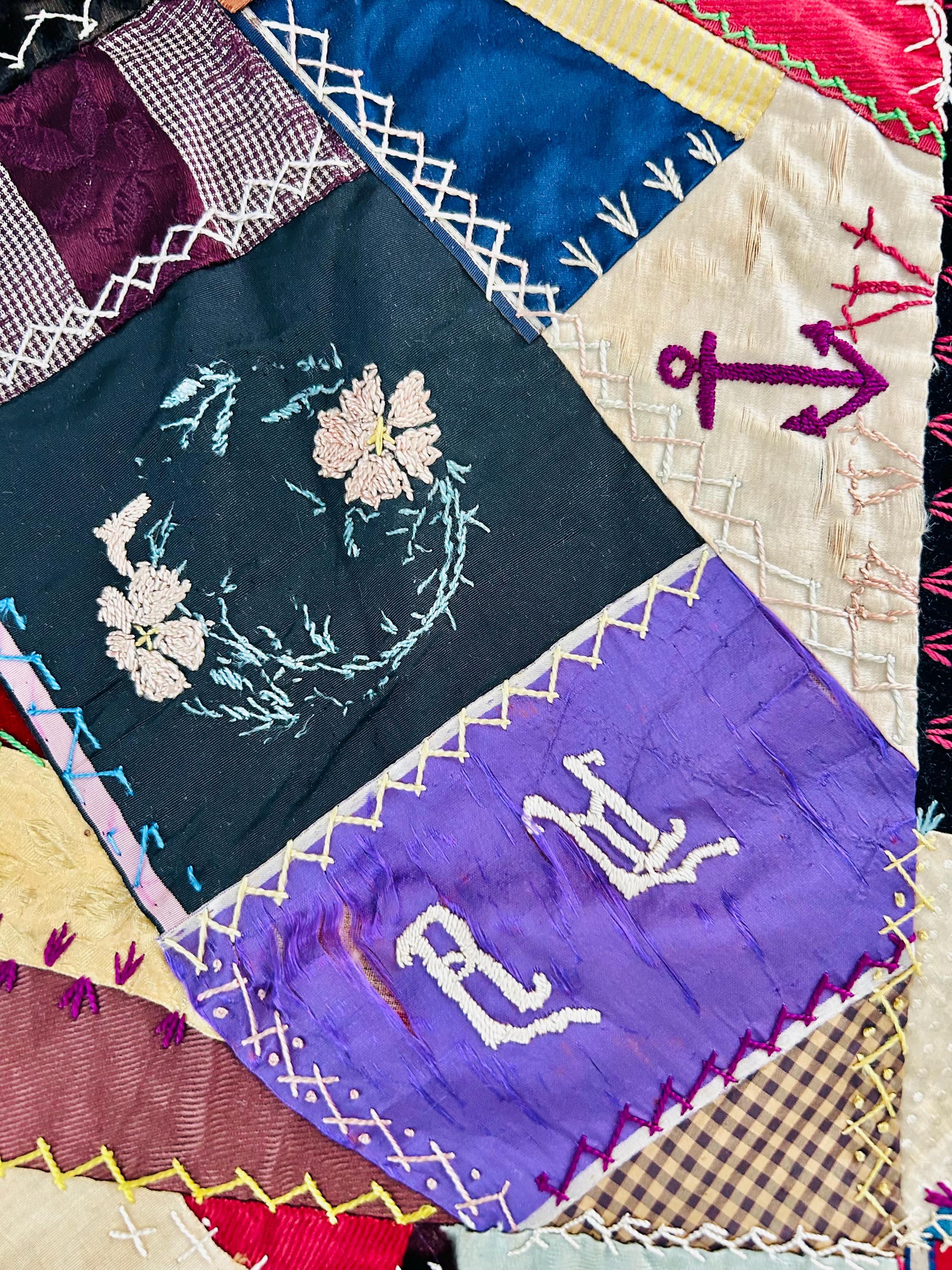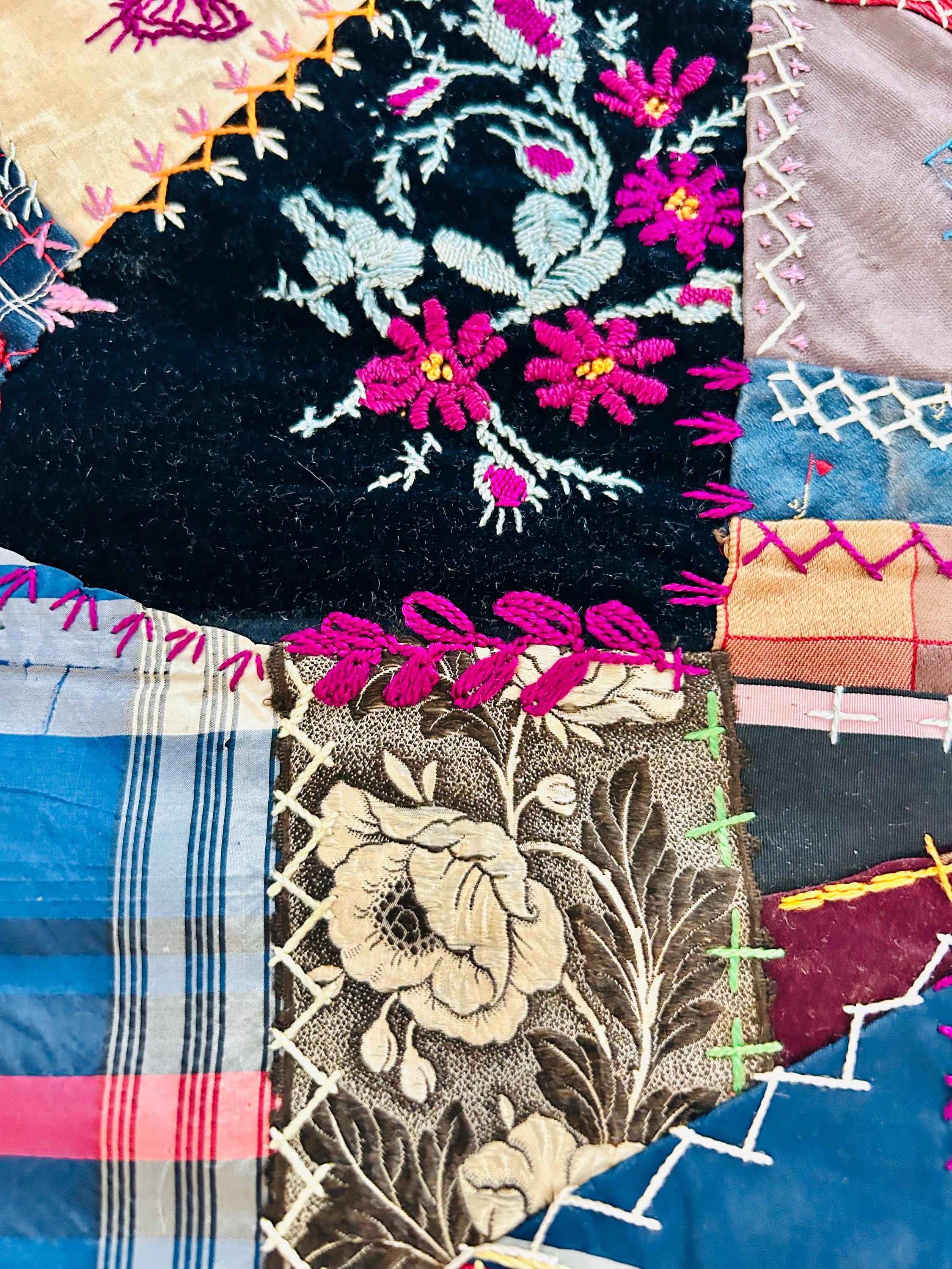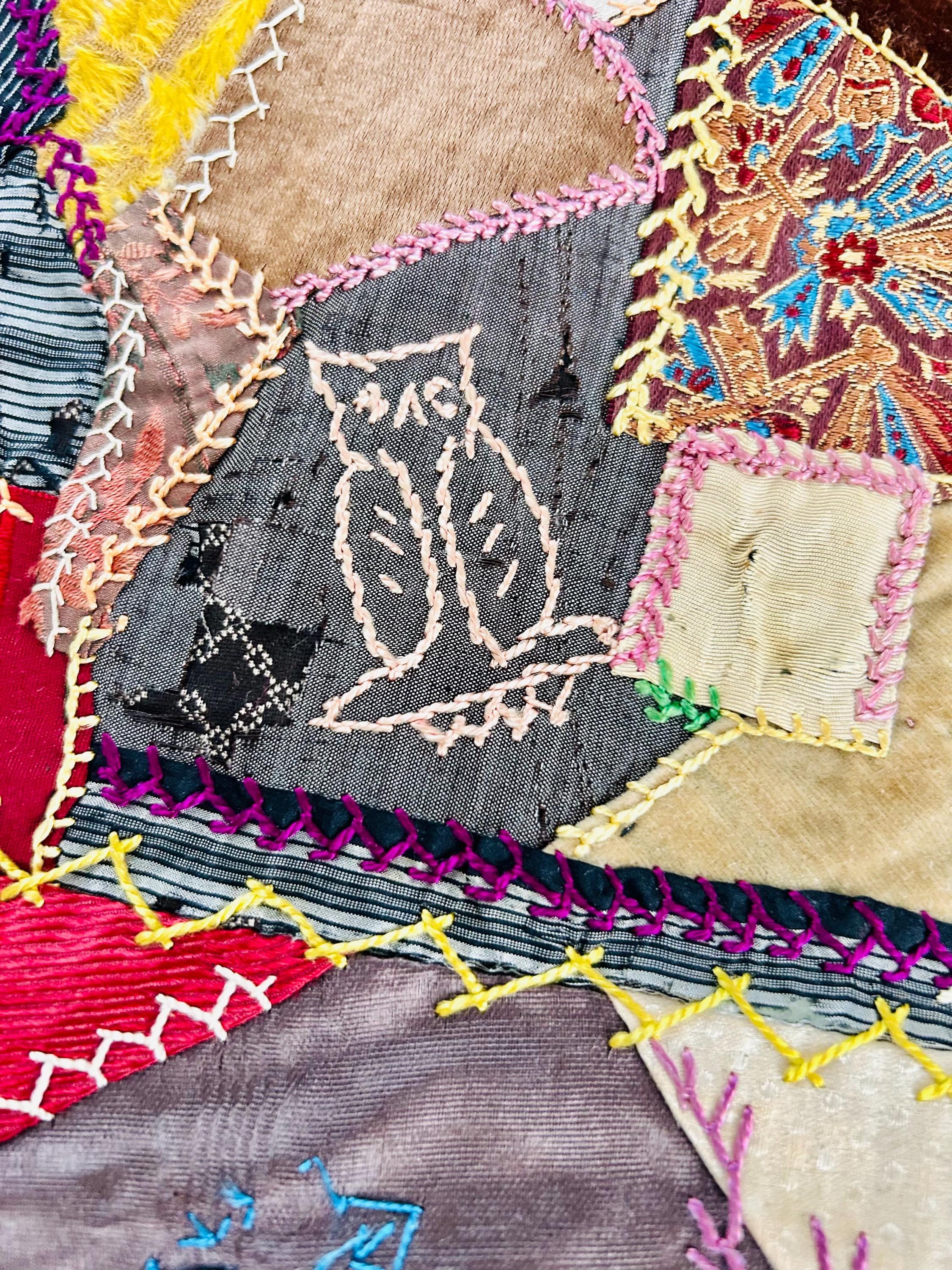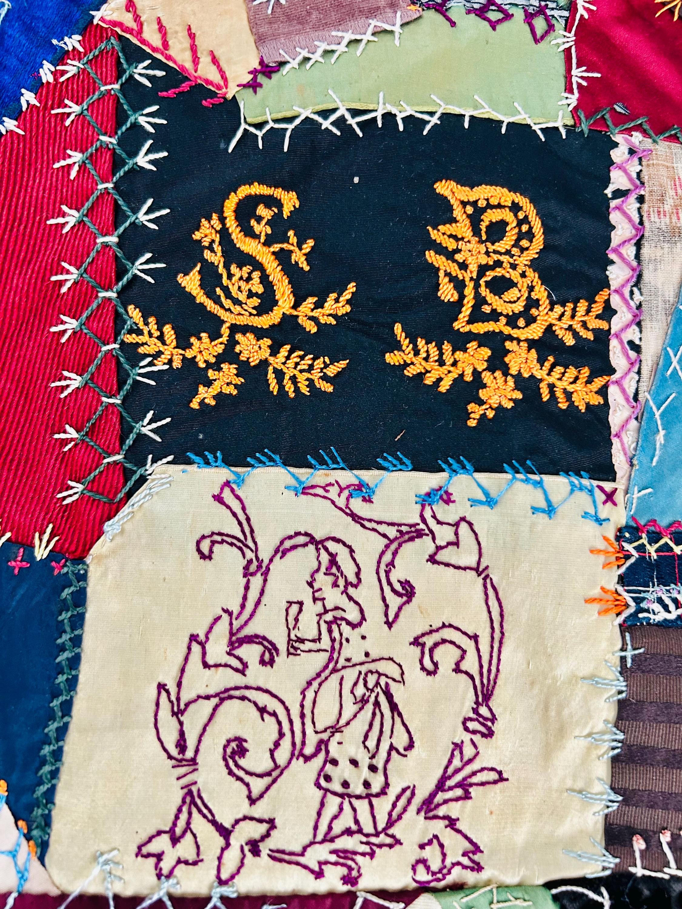 Throughout the surface are beautiful hand-embroidered details, including dozens of different embroidery stitches, floral motifs, pictorial scenes, initials, and symbolic imagery. Every section reflects the Victorian love of embellishment and personal storytelling, and thus their love of crazy quilts.