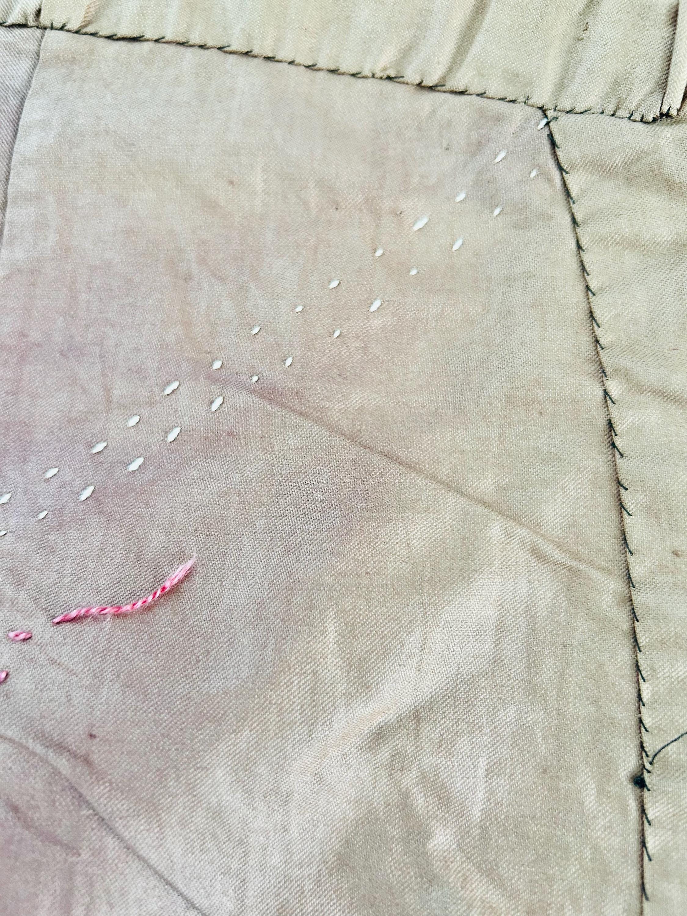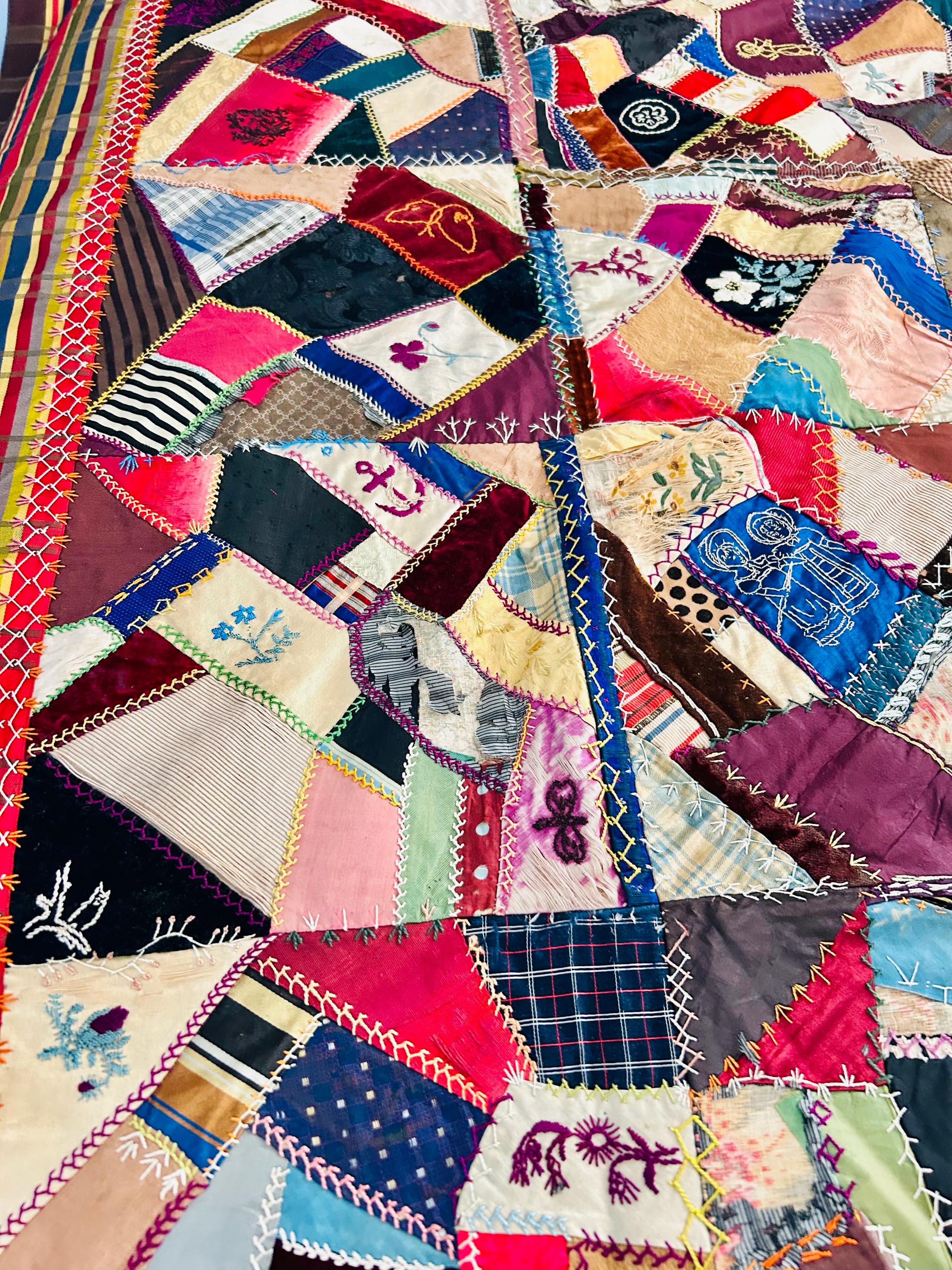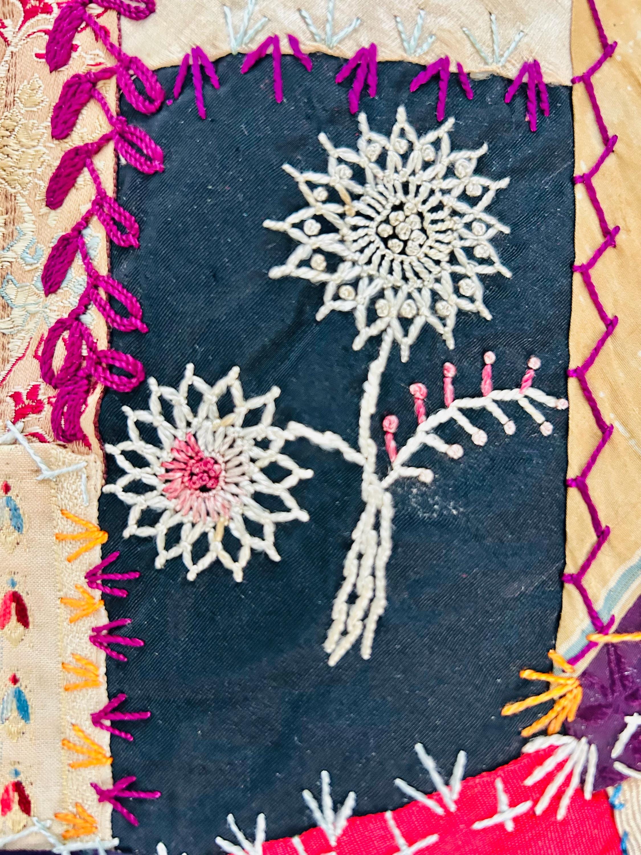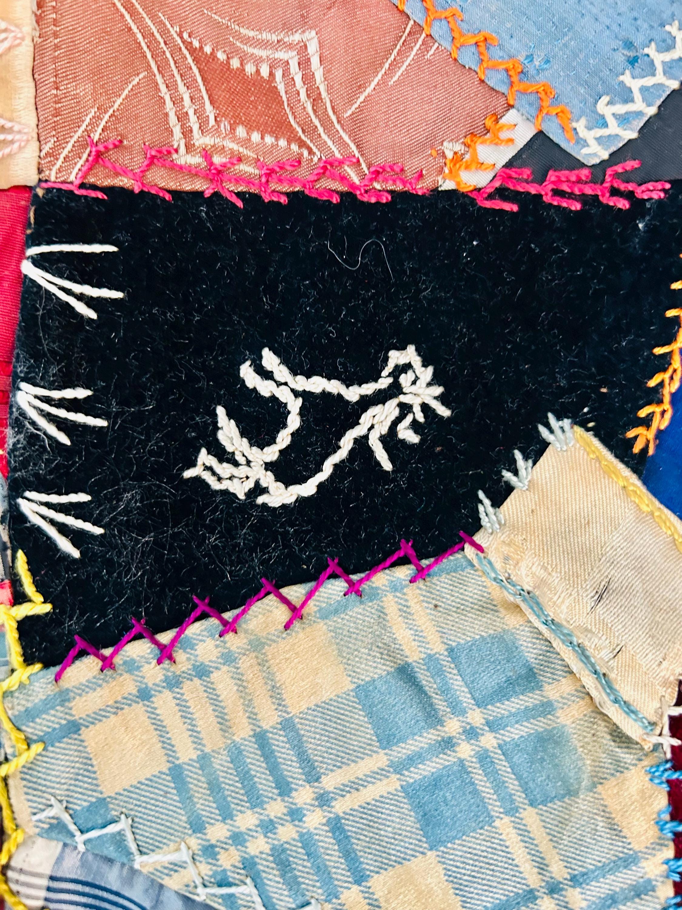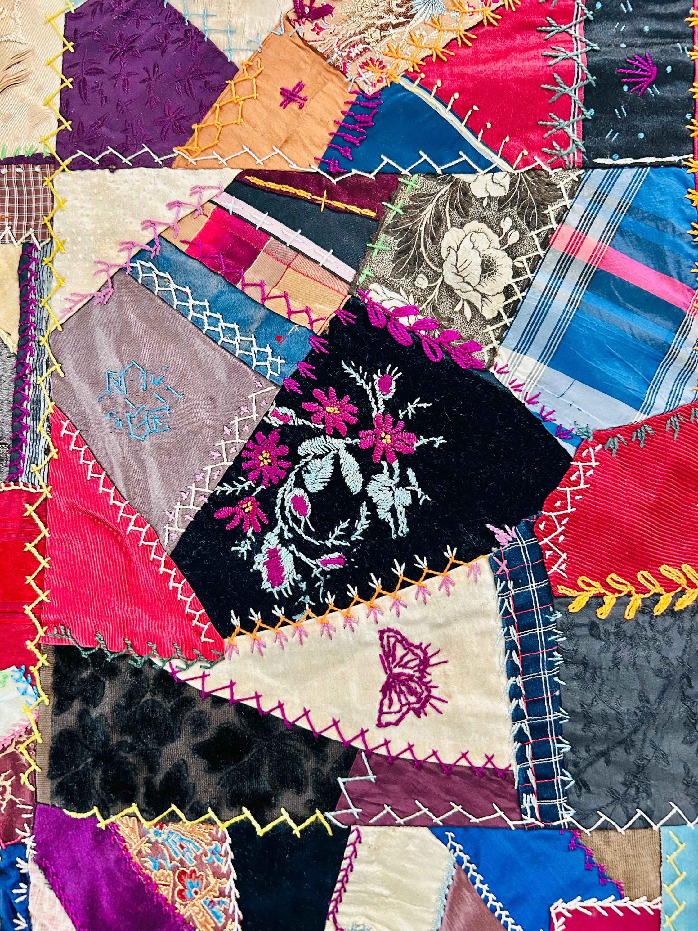 Throughout the surface are beautiful hand-embroidered details, including dozens of different embroidery stitches, floral motifs, pictorial scenes, initials, and symbolic imagery. Every section reflects the Victorian love of embellishment and personal storytelling, and thus their love of crazy quilts.