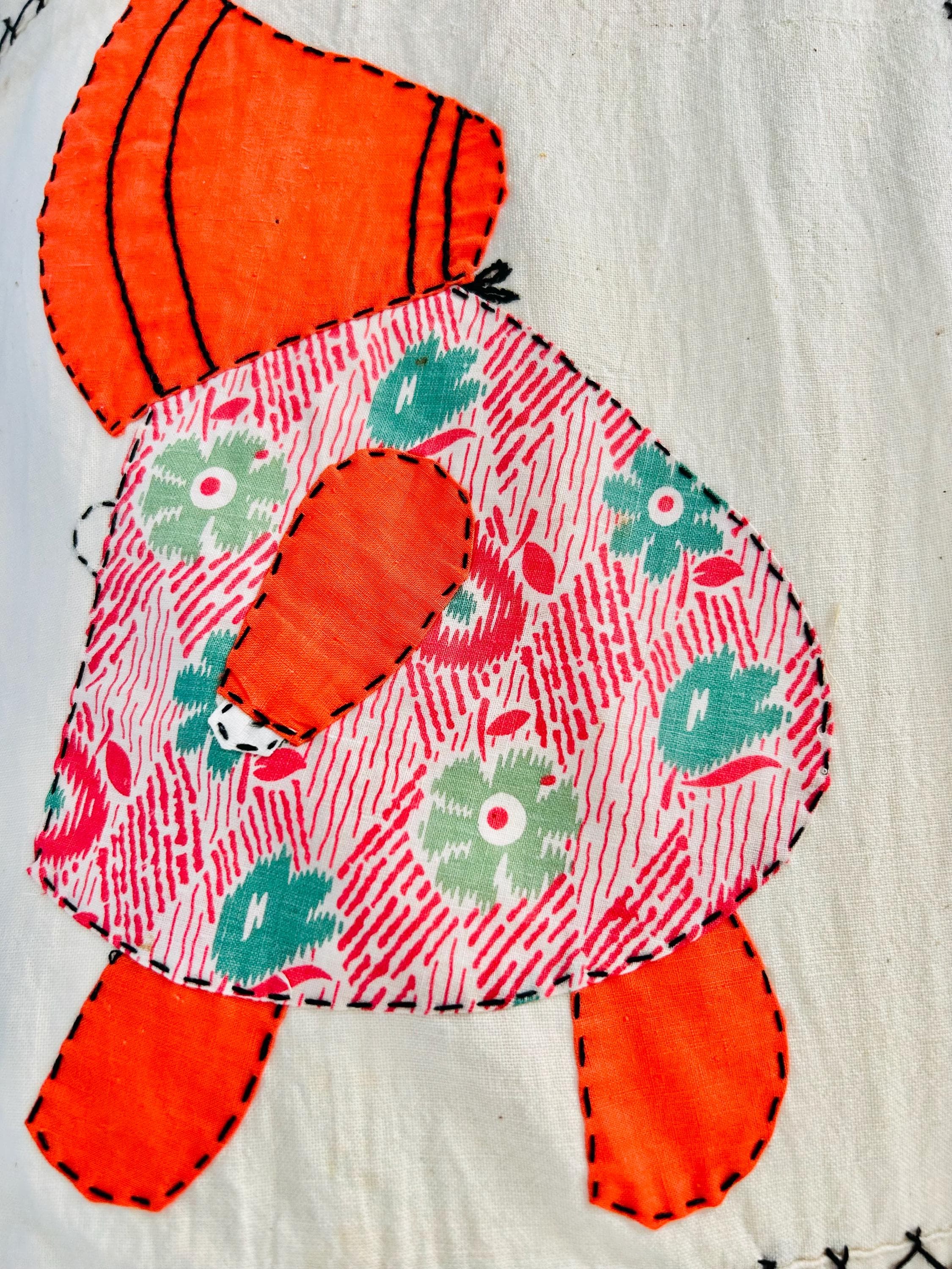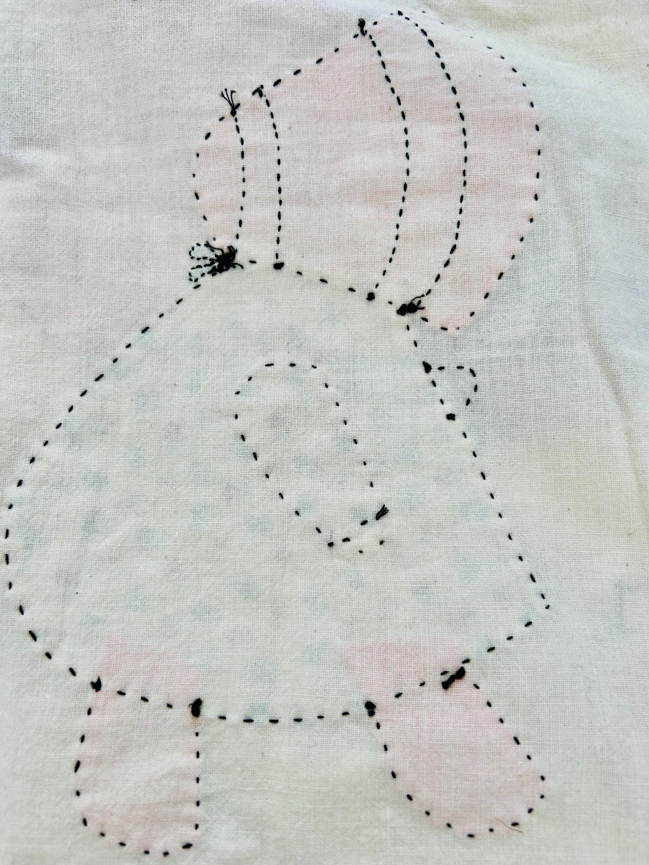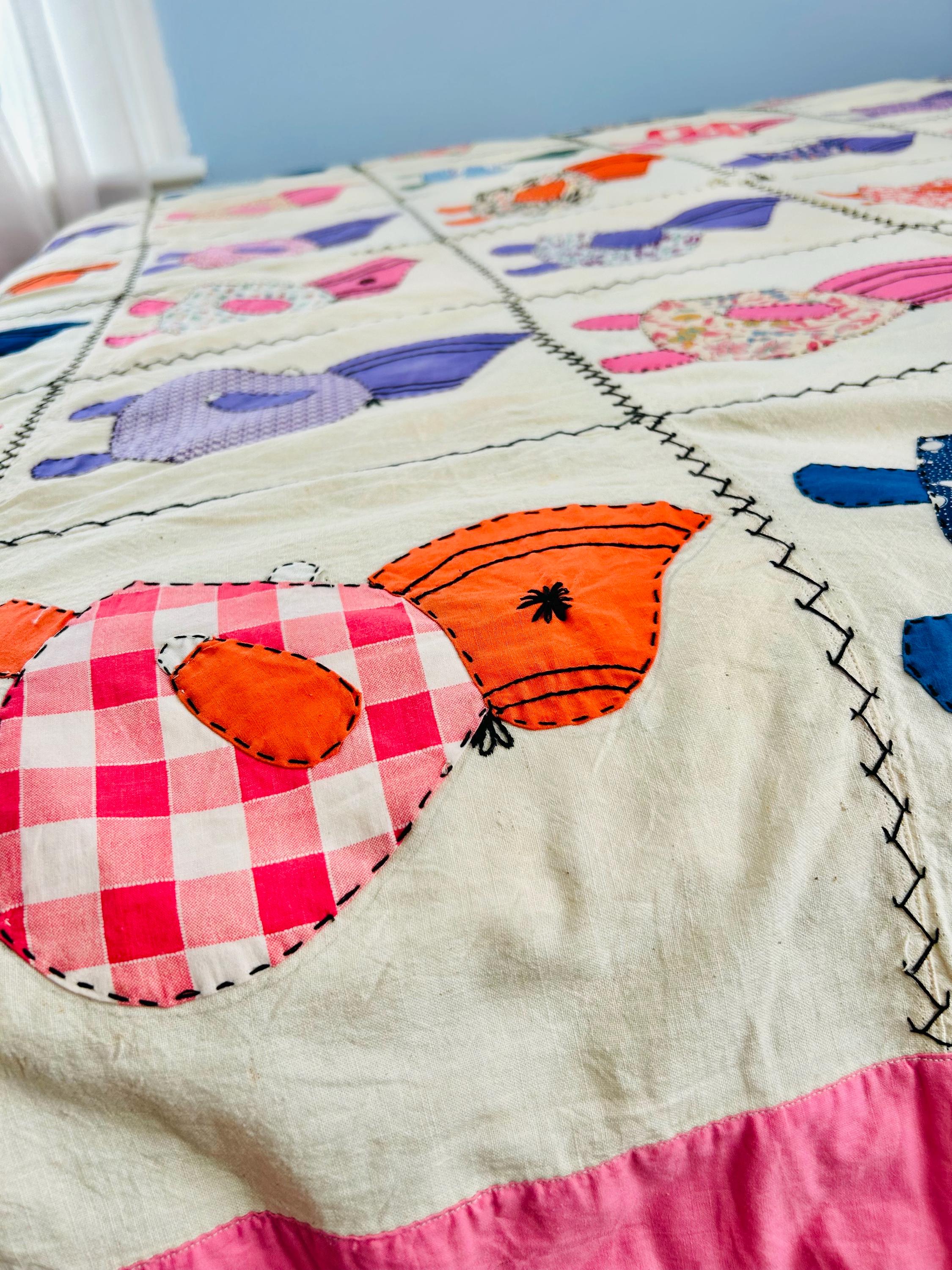 The quilt is in overall excellent condition with three small areas repaired from the back with stamped feedsack fabric. Note the embroidery on the top that was effected by these repairs was not replaced.