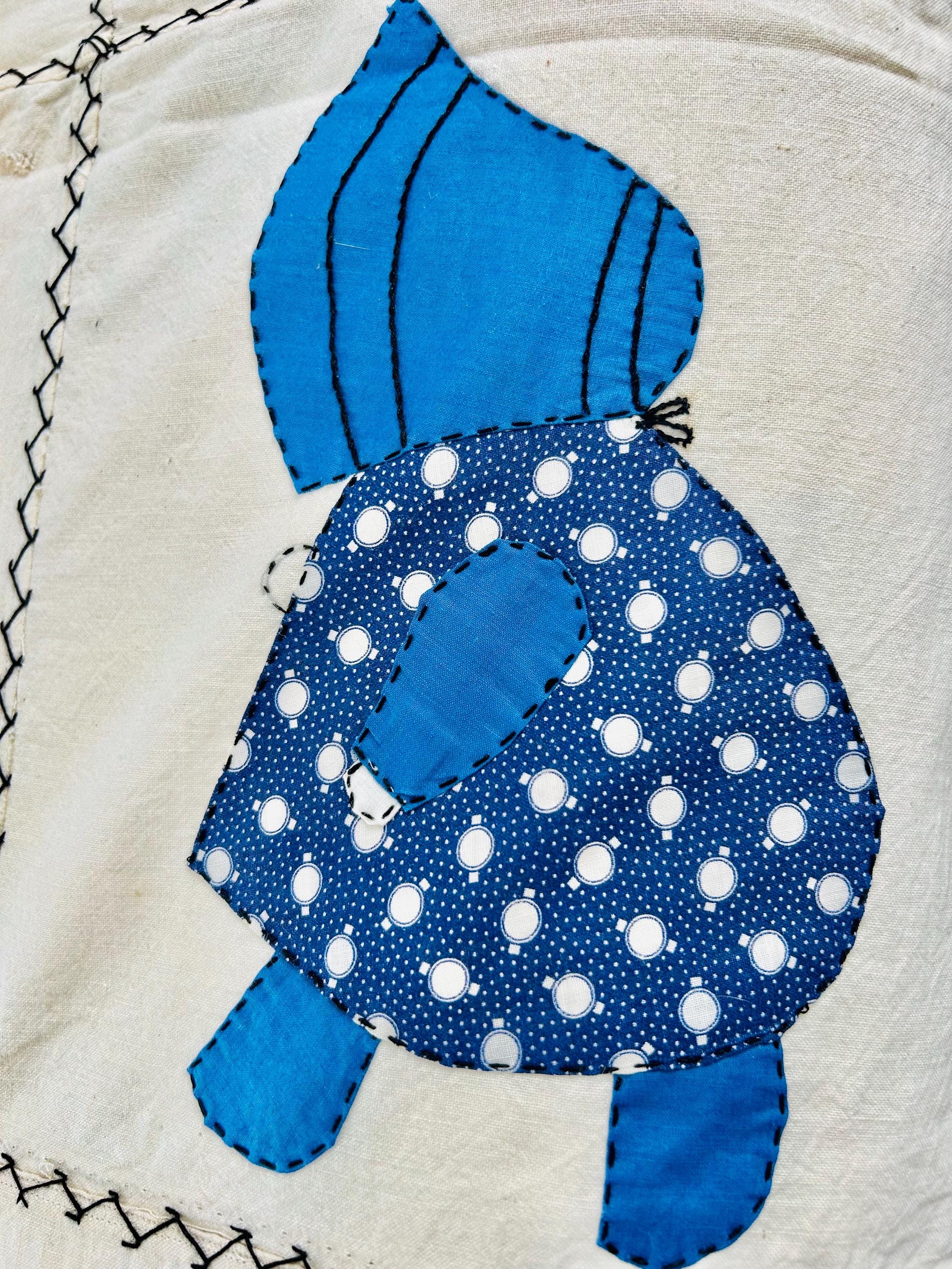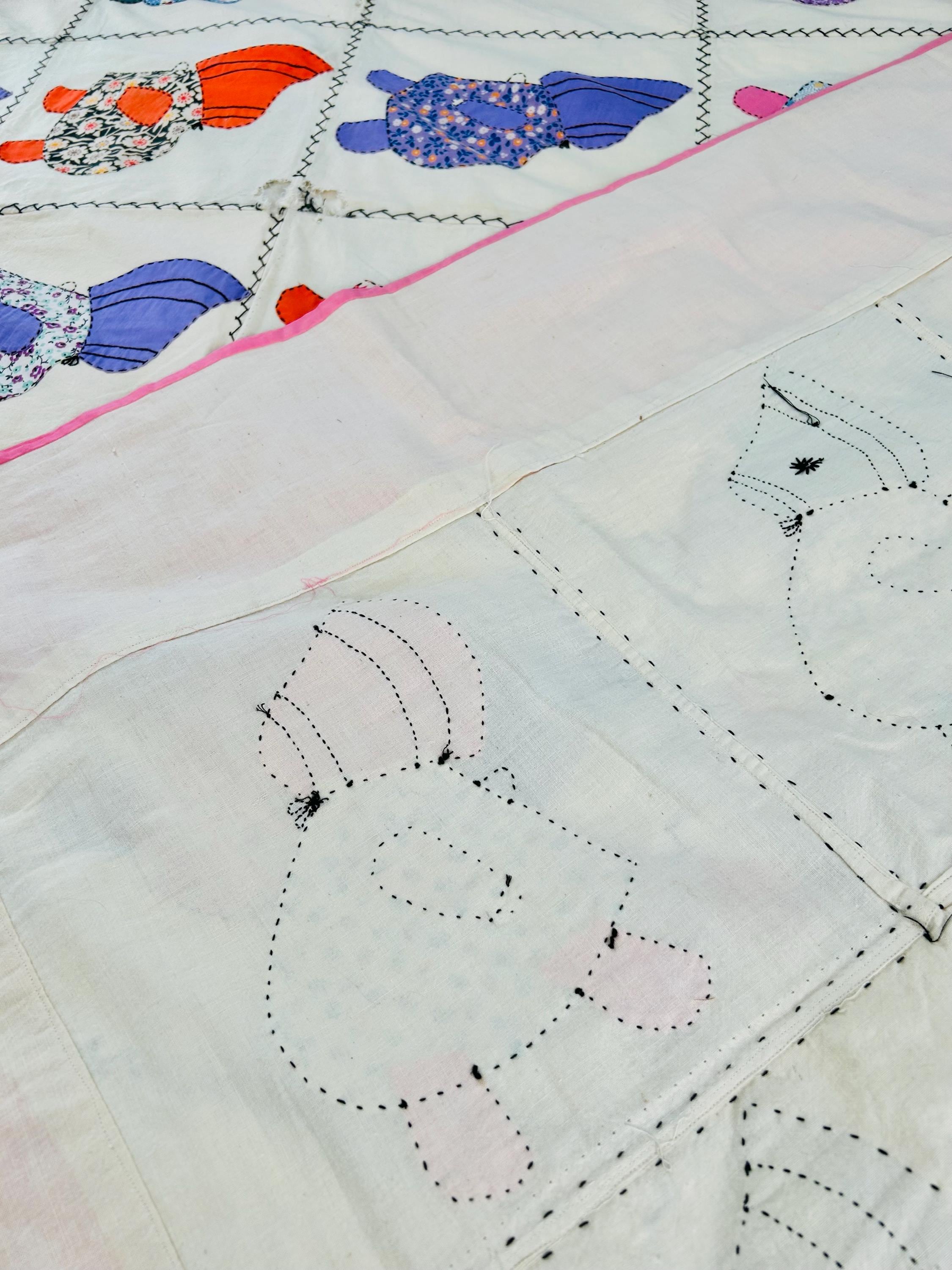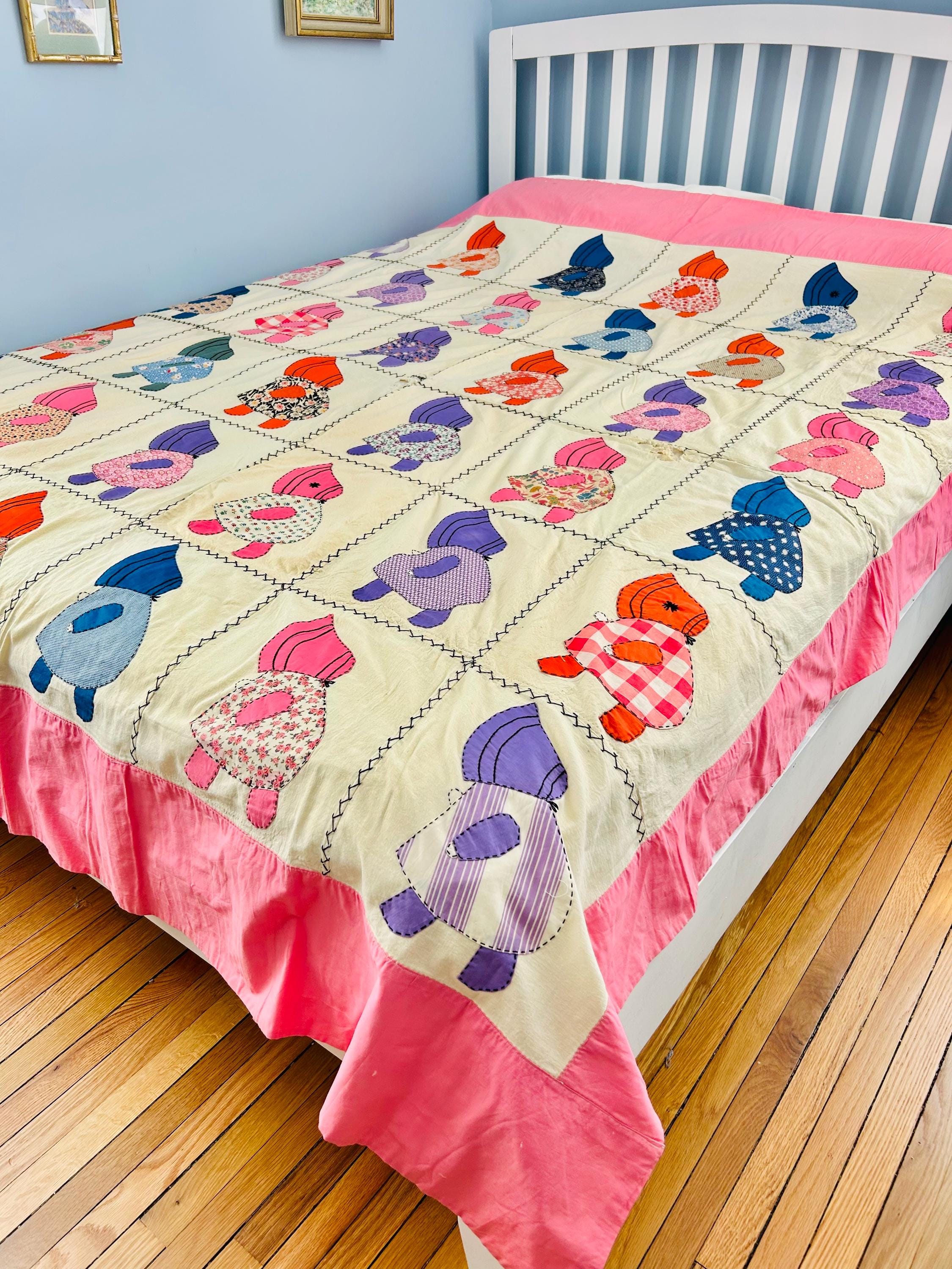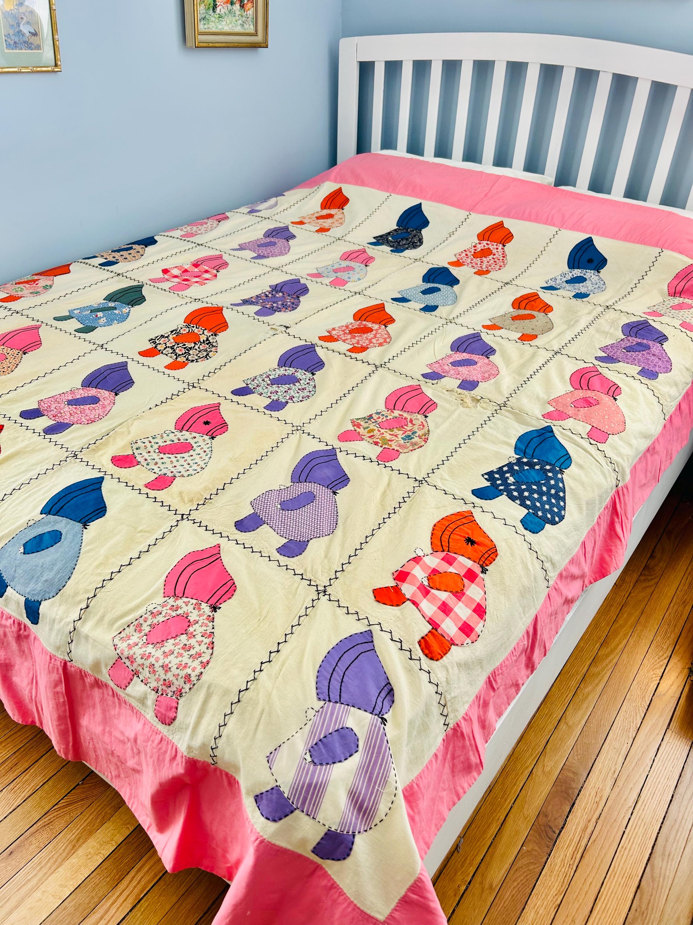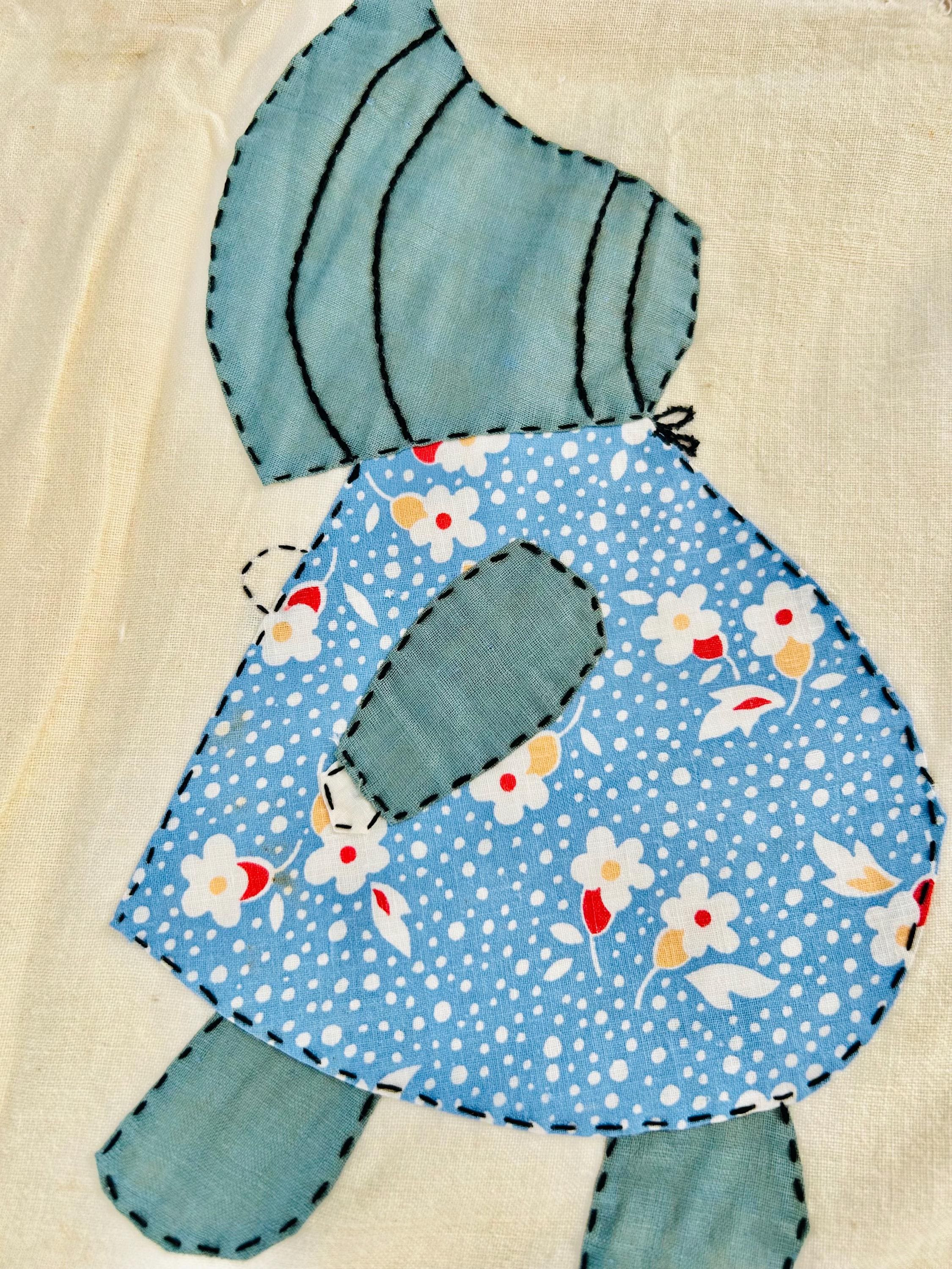 Details • Item: Quilt top/Summer Coverlet Only (no batting, no backing, no quilting) • Pattern: Sunbonnet Sue • Date: c. 1930s–early 1940s • Size: 74” x 86” • Fabrics: Vintage cottons/authentic feed sack prints • Construction: Hand appliquéd, hand stitched • Edges: Finished • Condition:Three areas previously repaired from the back using vintage feed sack fabric; embroidery in these areas was not repaired.