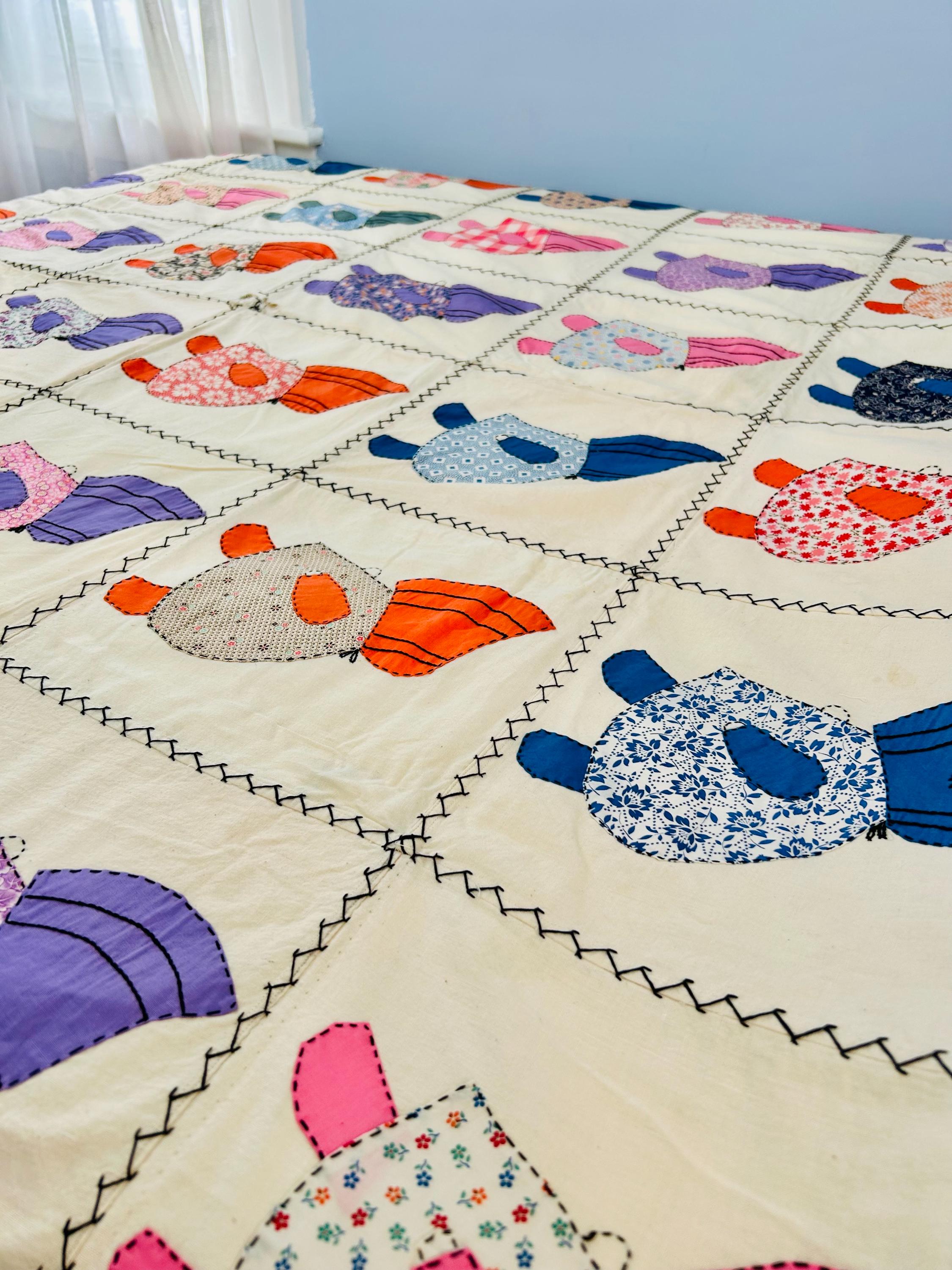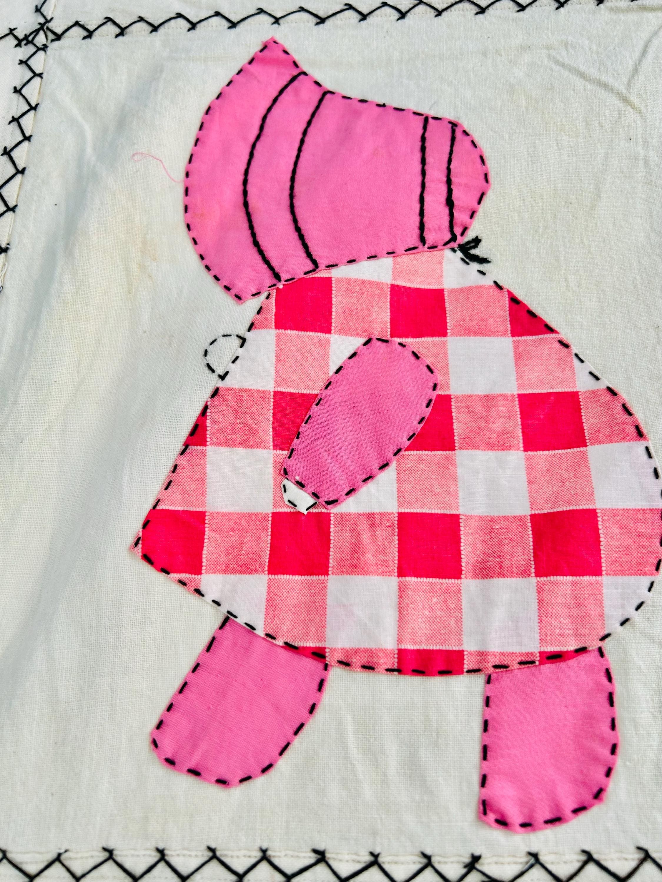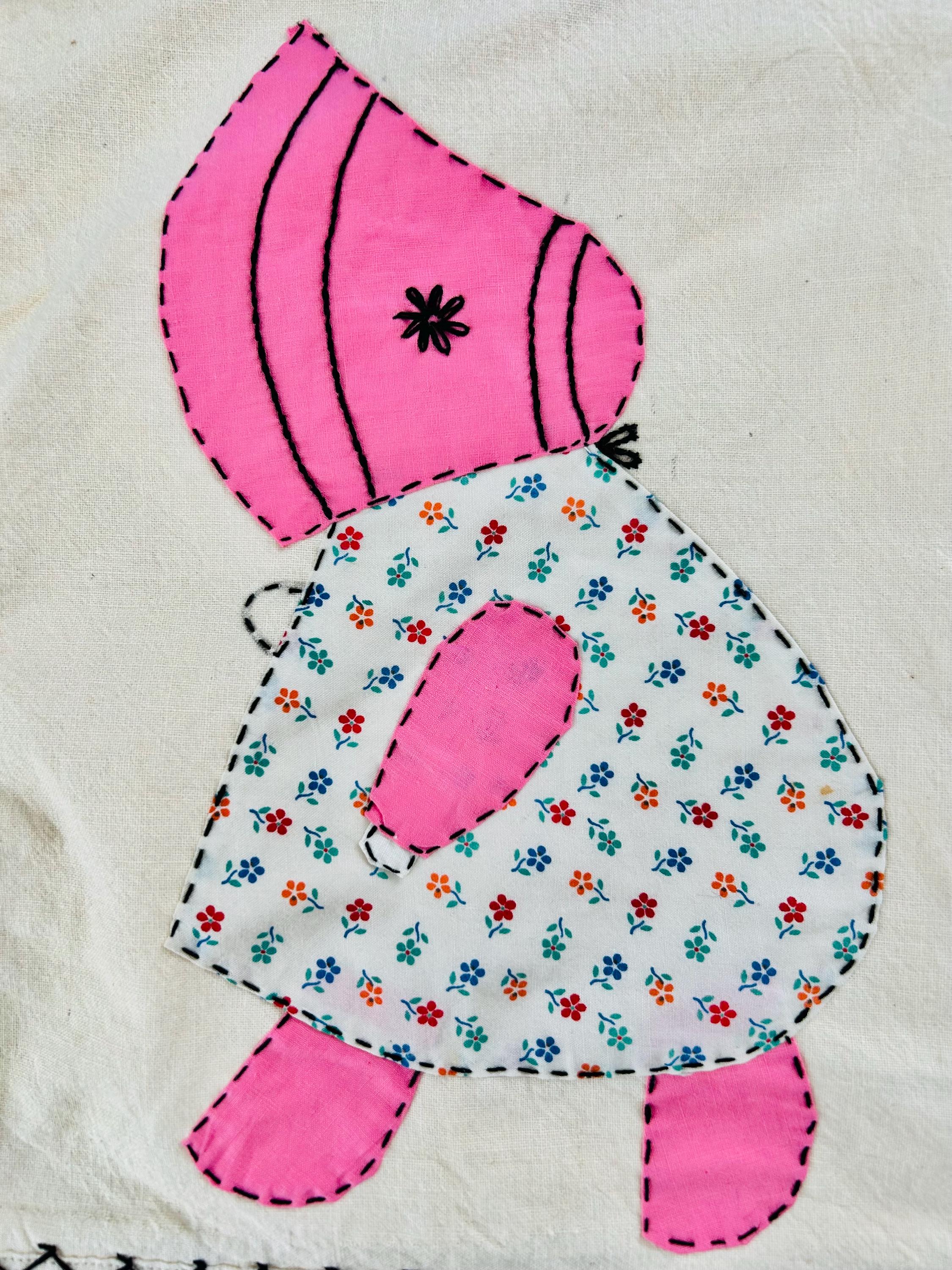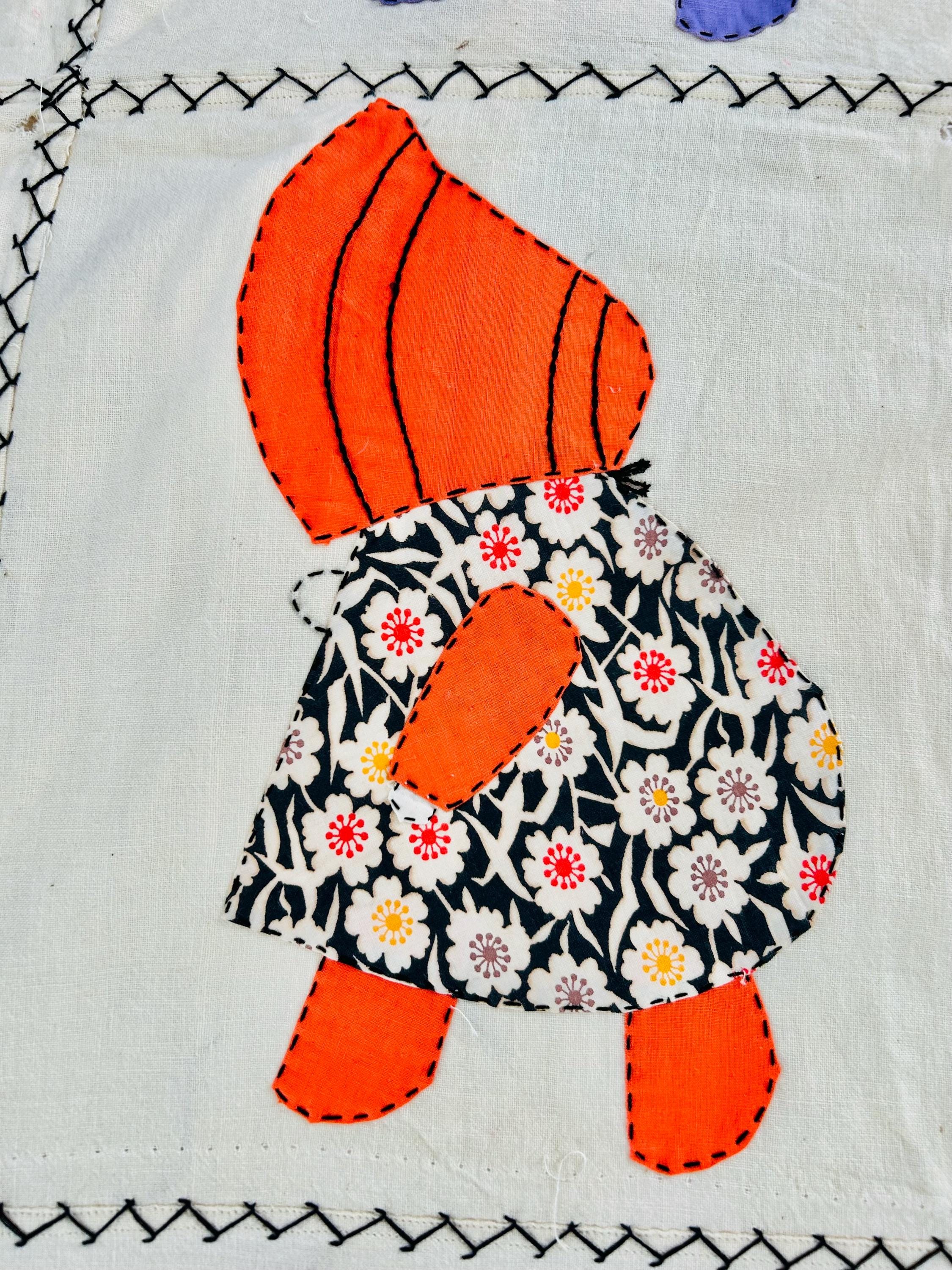 Details • Item: Quilt top/Summer Coverlet Only (no batting, no backing, no quilting) • Pattern: Sunbonnet Sue • Date: c. 1930s–early 1940s • Size: 74” x 86” • Fabrics: Vintage cottons/authentic feed sack prints • Construction: Hand appliquéd, hand stitched • Edges: Finished • Condition:Three areas previously repaired from the back using vintage feed sack fabric; embroidery in these areas was not repaired.