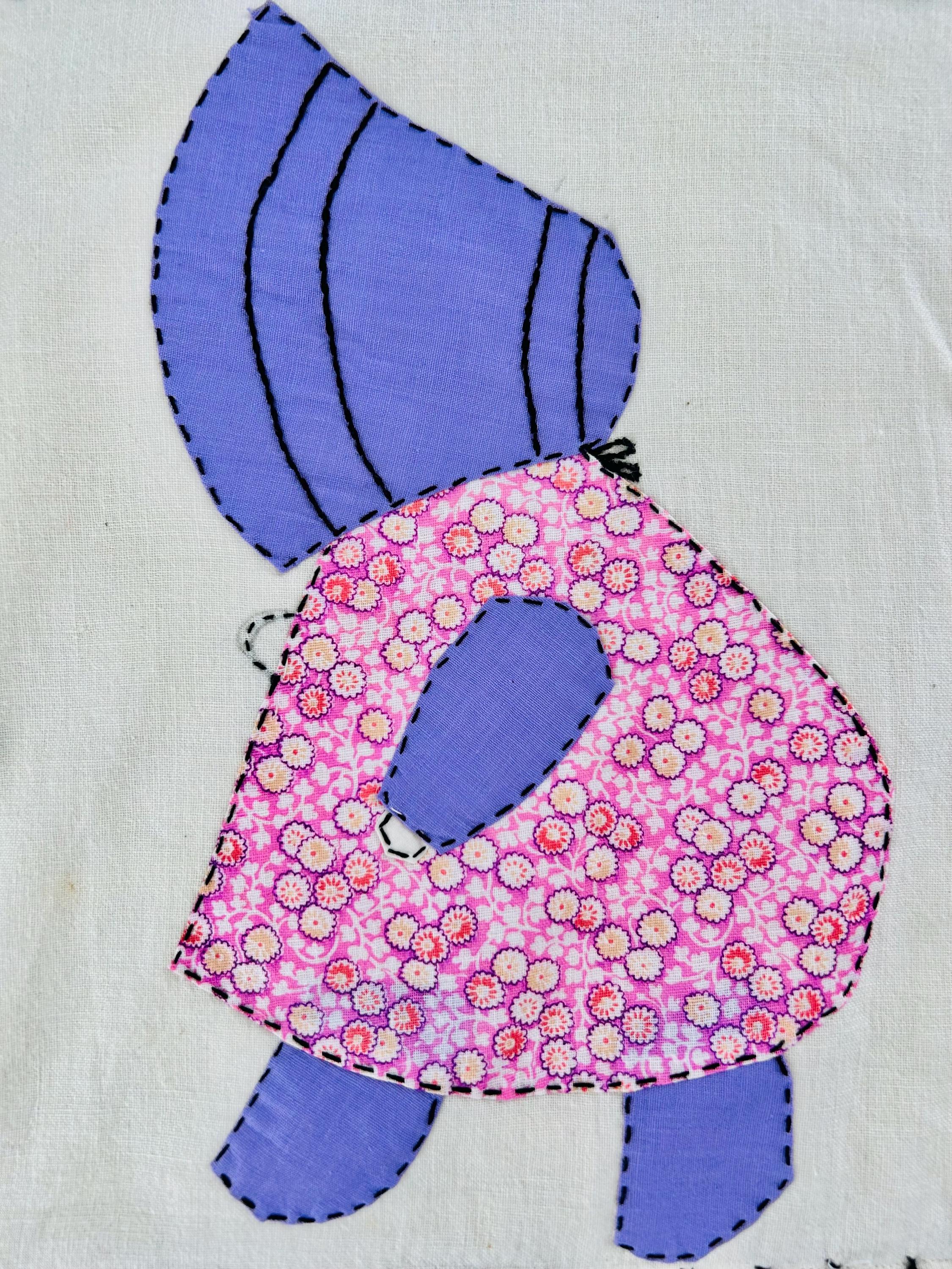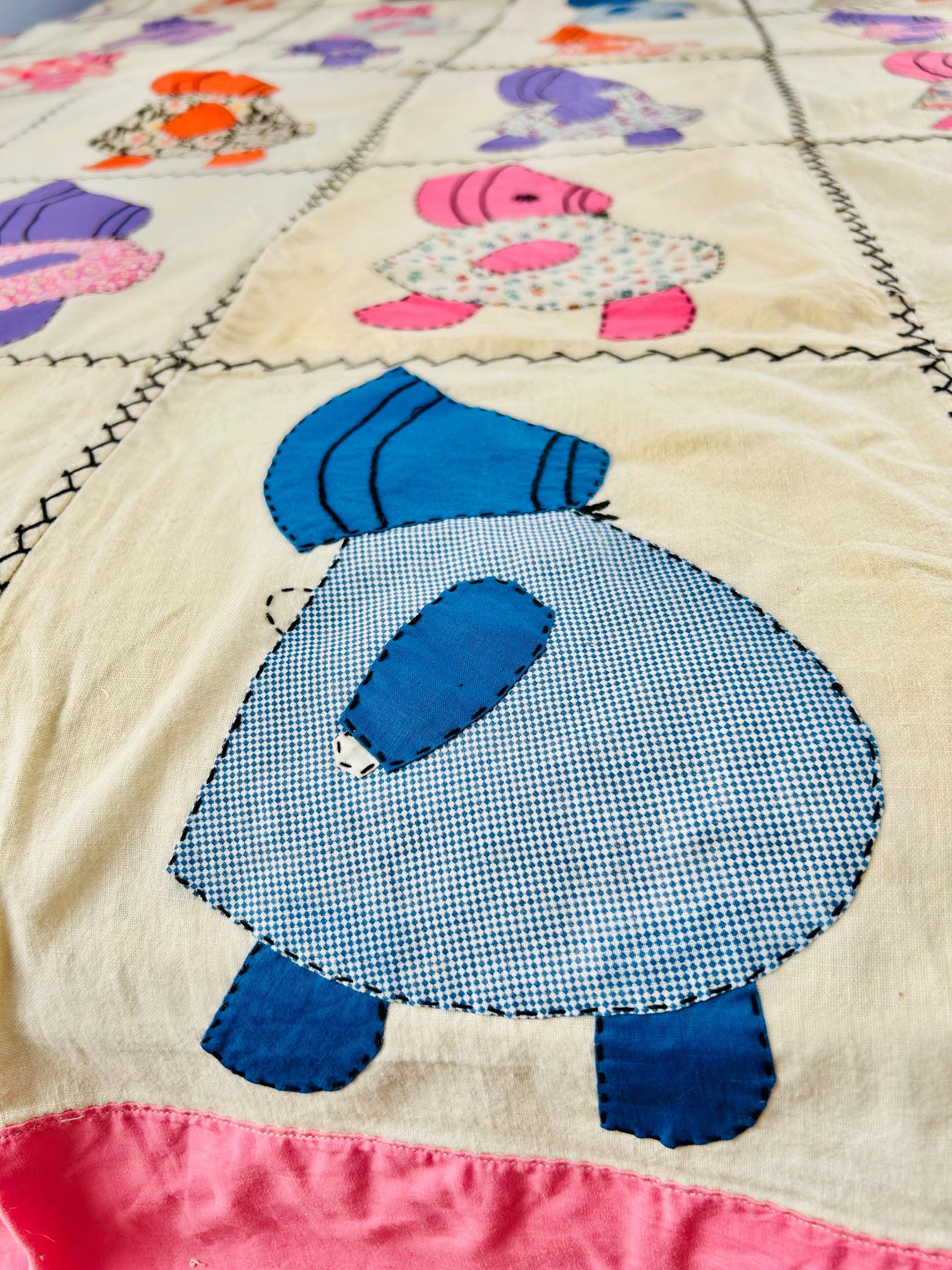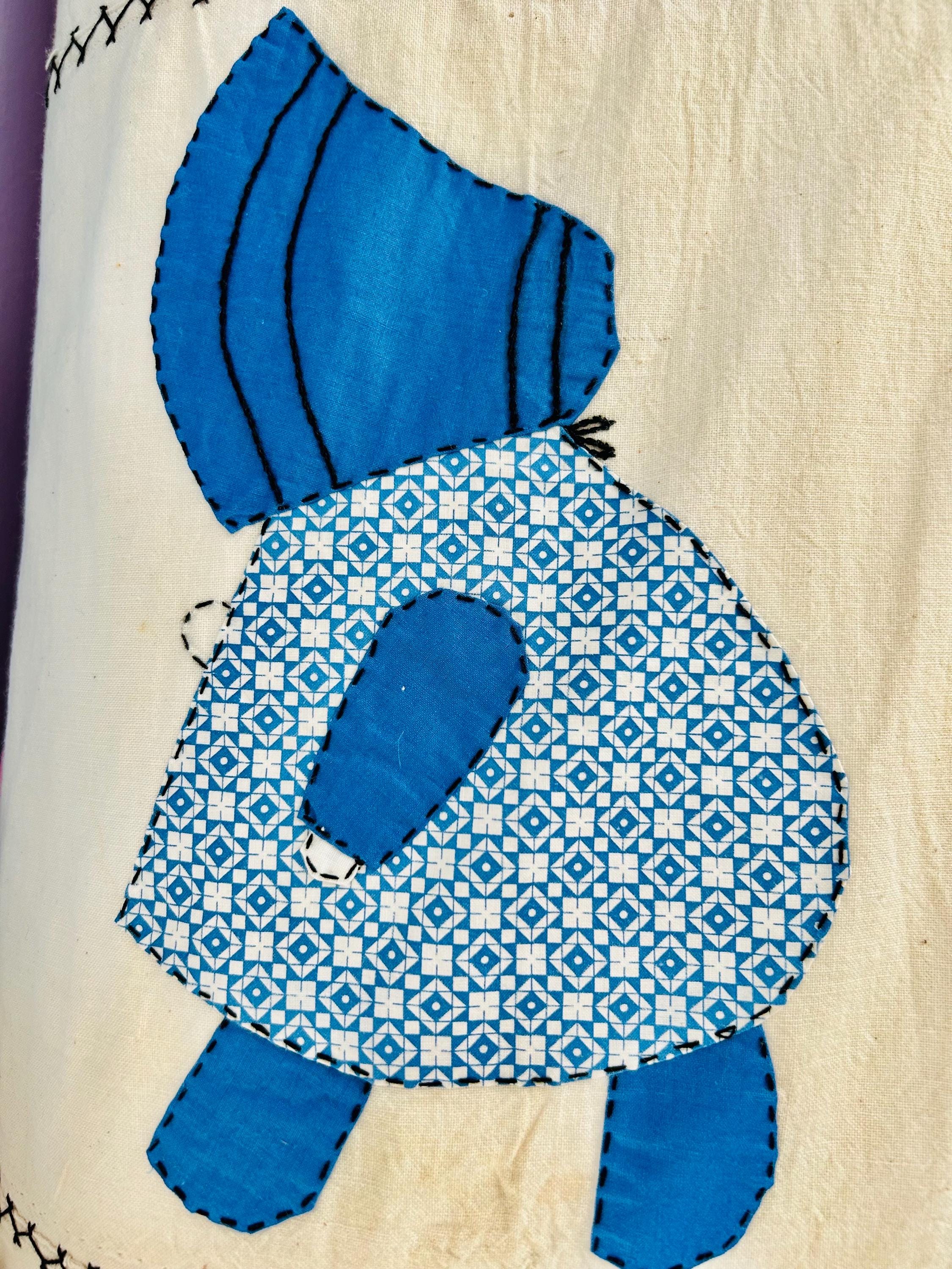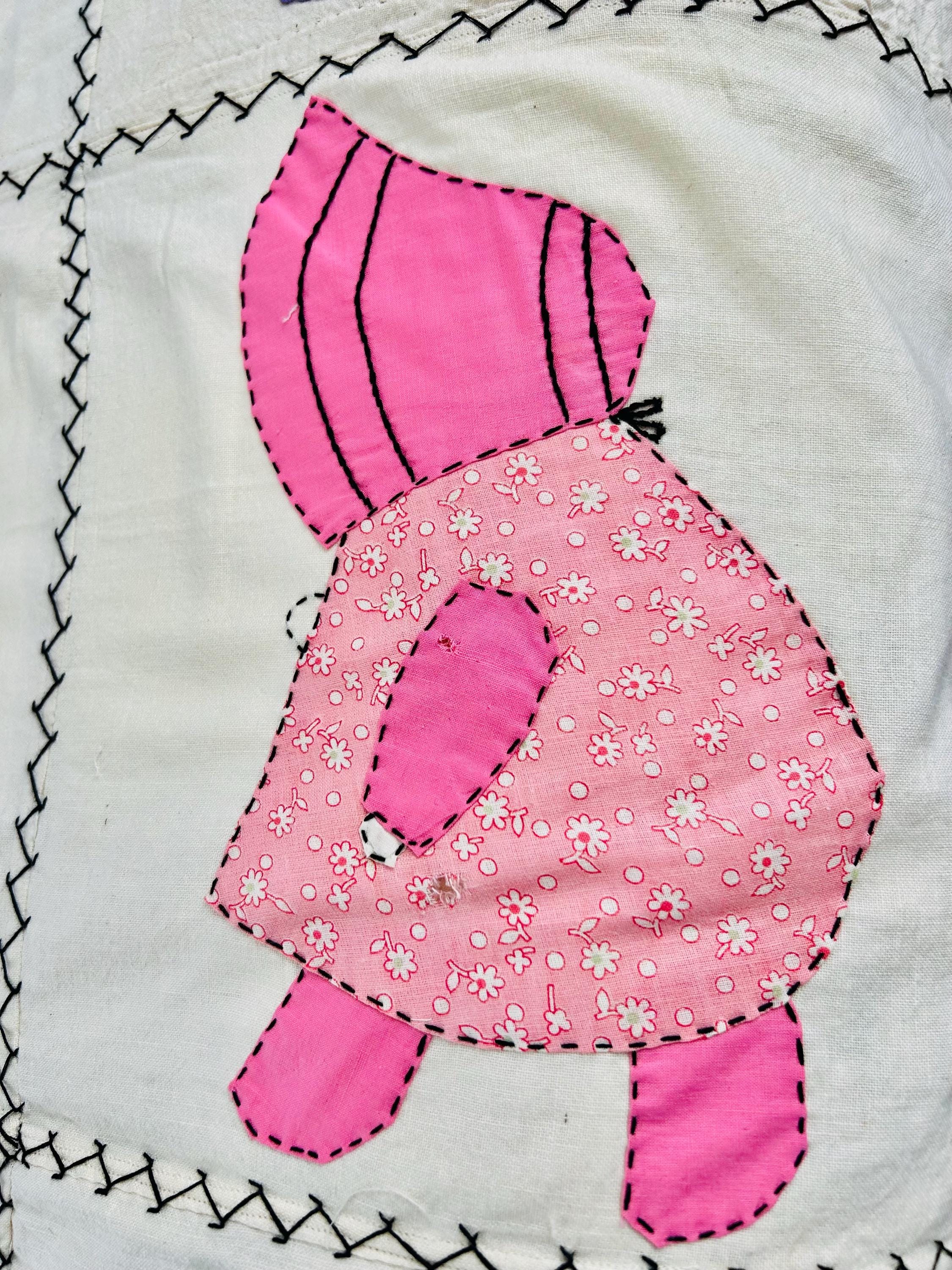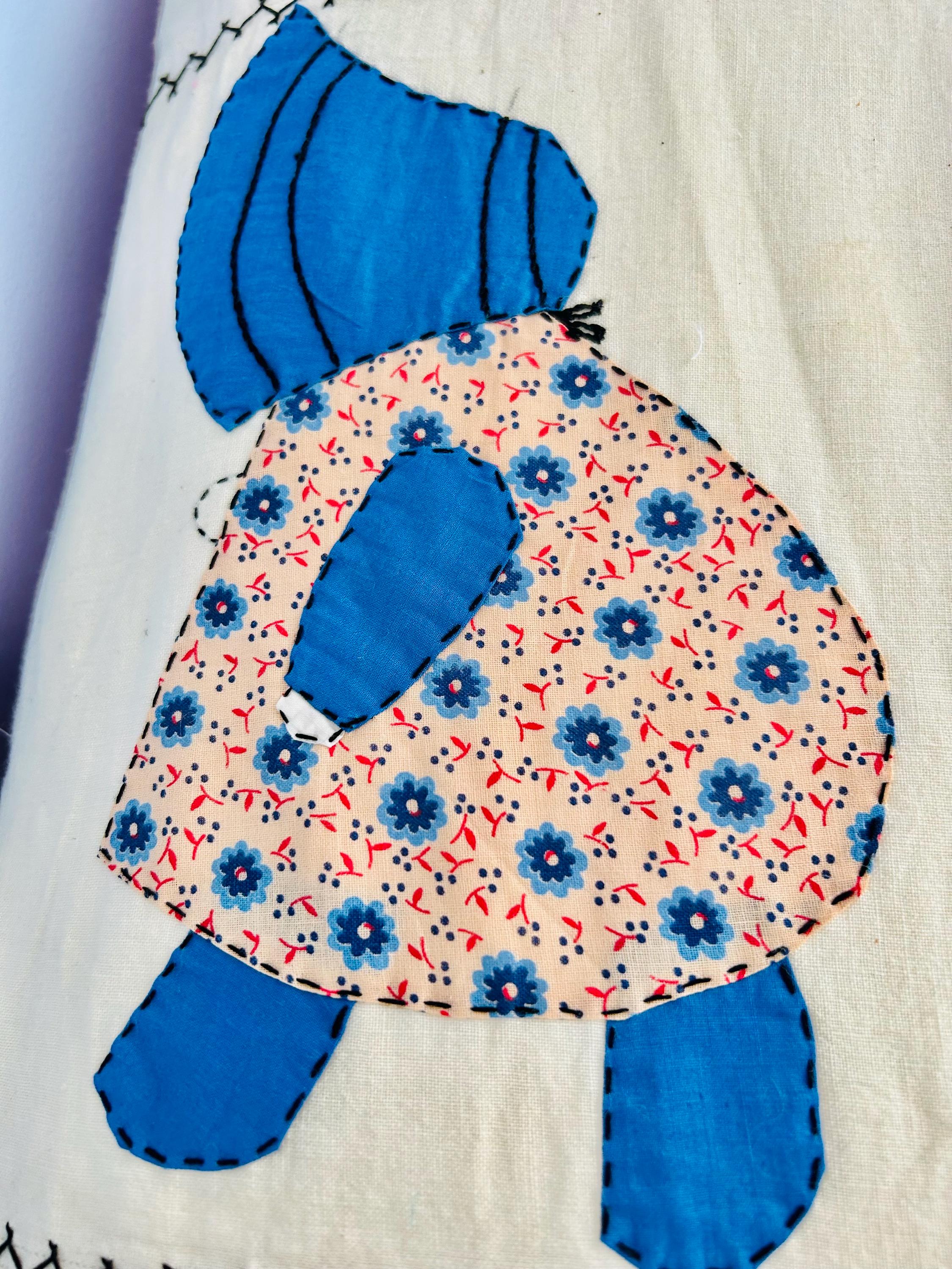 Details • Item: Quilt top/Summer Coverlet Only (no batting, no backing, no quilting) • Pattern: Sunbonnet Sue • Date: c. 1930s–early 1940s • Size: 74” x 86” • Fabrics: Vintage cottons/authentic feed sack prints • Construction: Hand appliquéd, hand stitched • Edges: Finished • Condition:Three areas previously repaired from the back using vintage feed sack fabric; embroidery in these areas was not repaired.