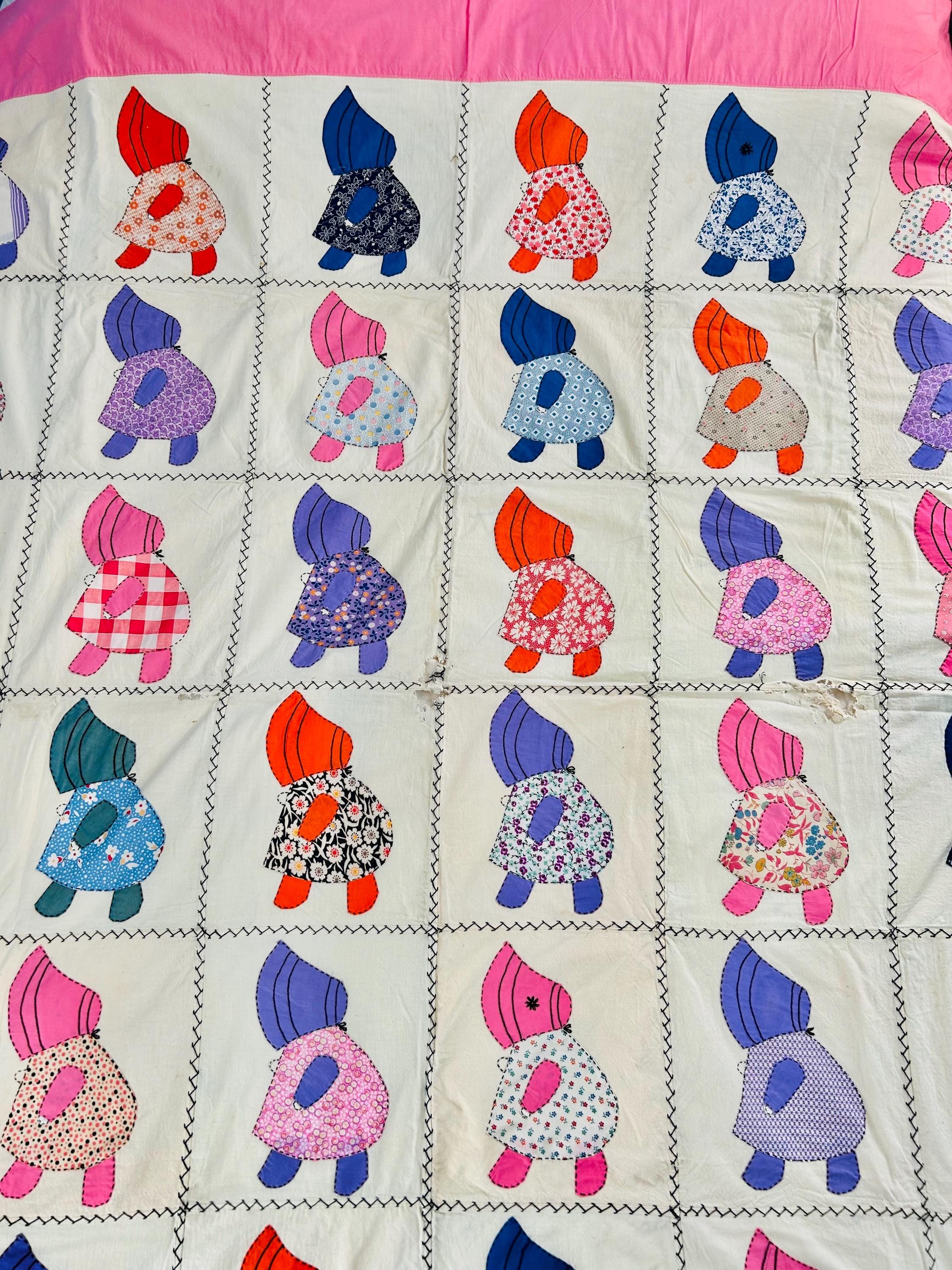 This delightful vintage Sunbonnet Sue Quilt Top/Summer Coverlet dates to the 1930s and showcases a charming grid of hand-appliquéd figures made from authentic feedsack fabrics. Each Sunbonnet Sue is a unique assortment of Depression-Era fabrics.