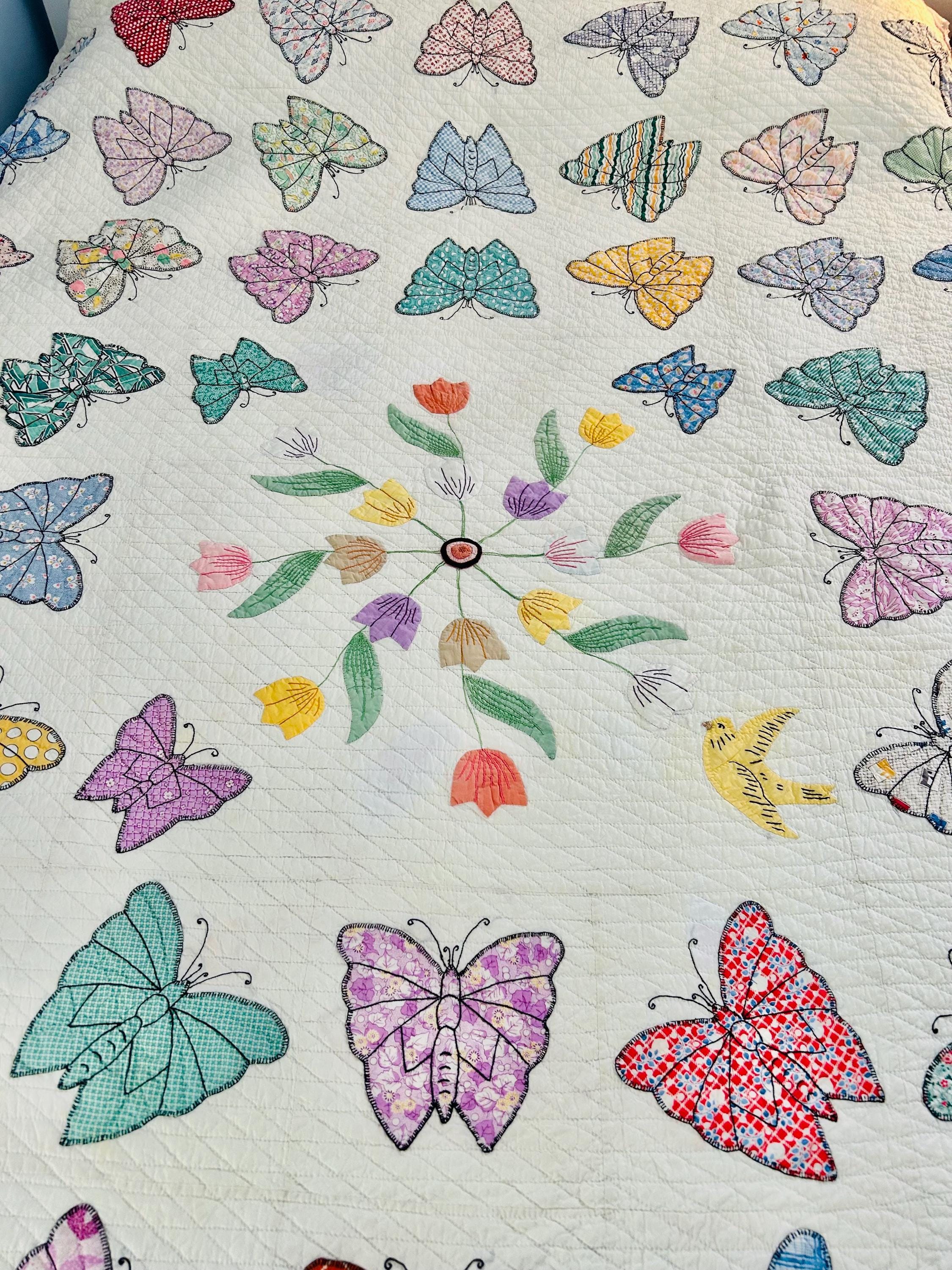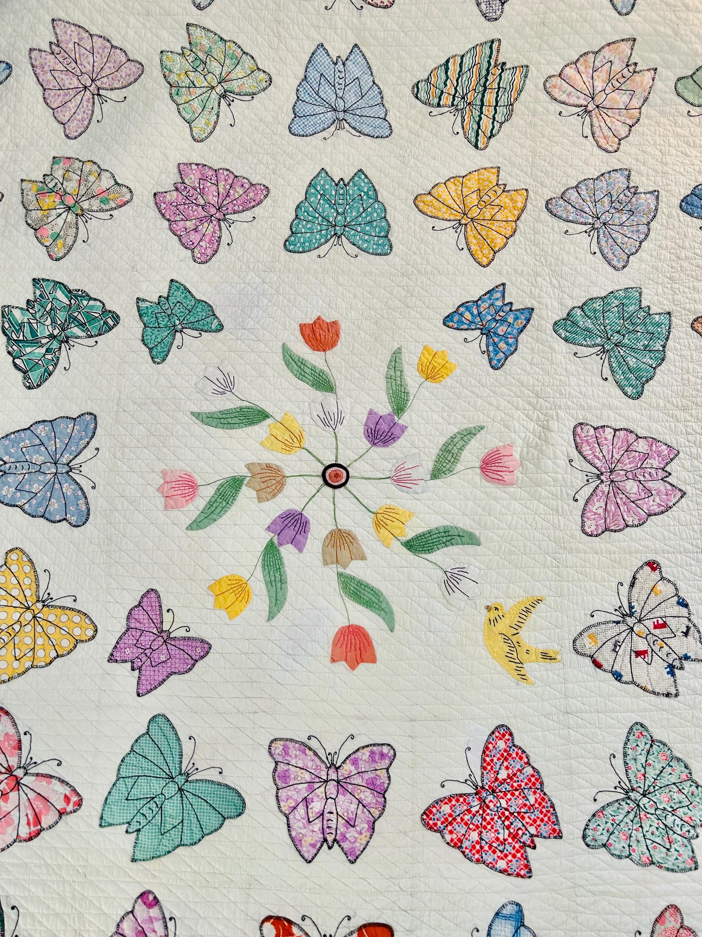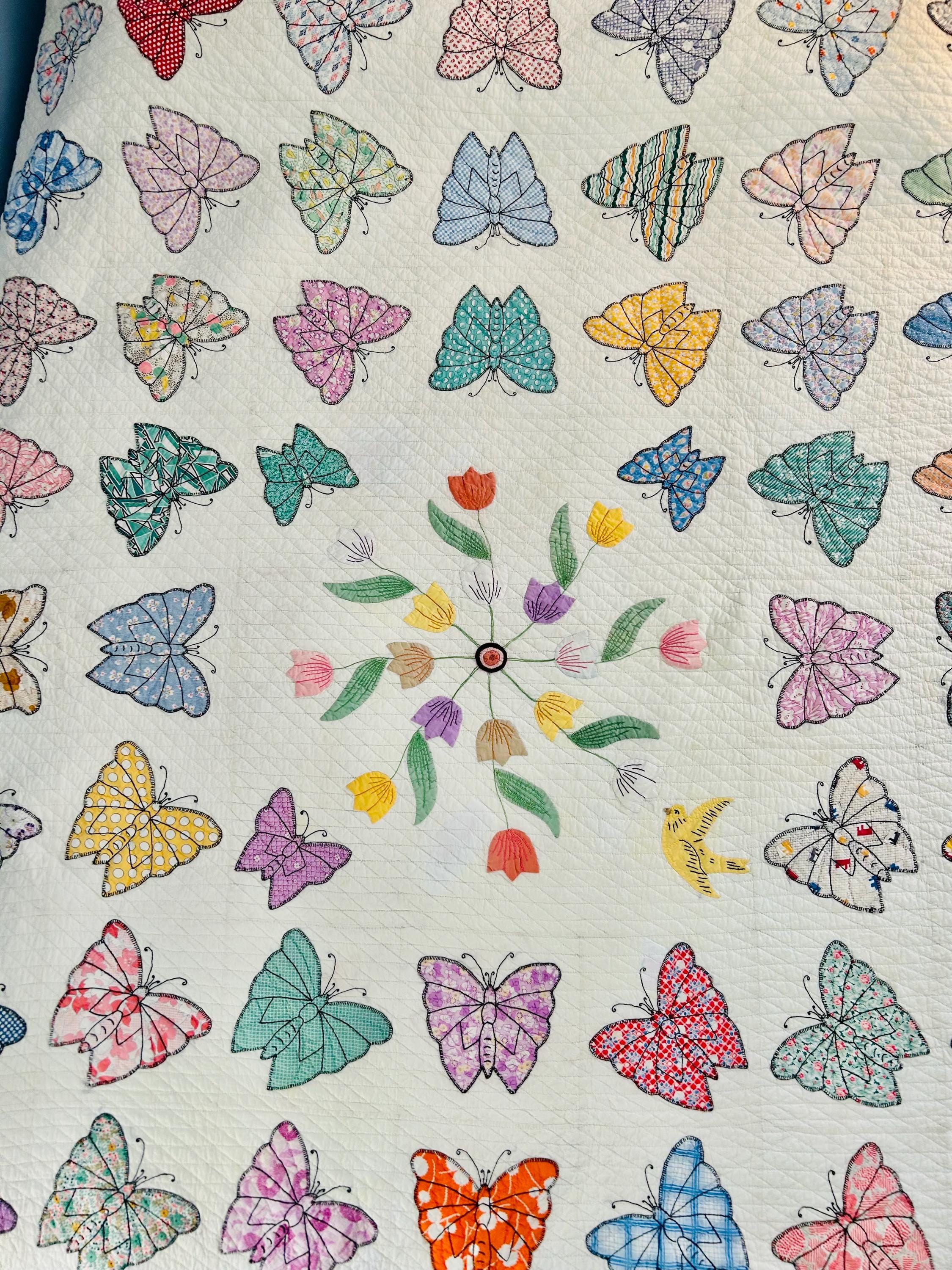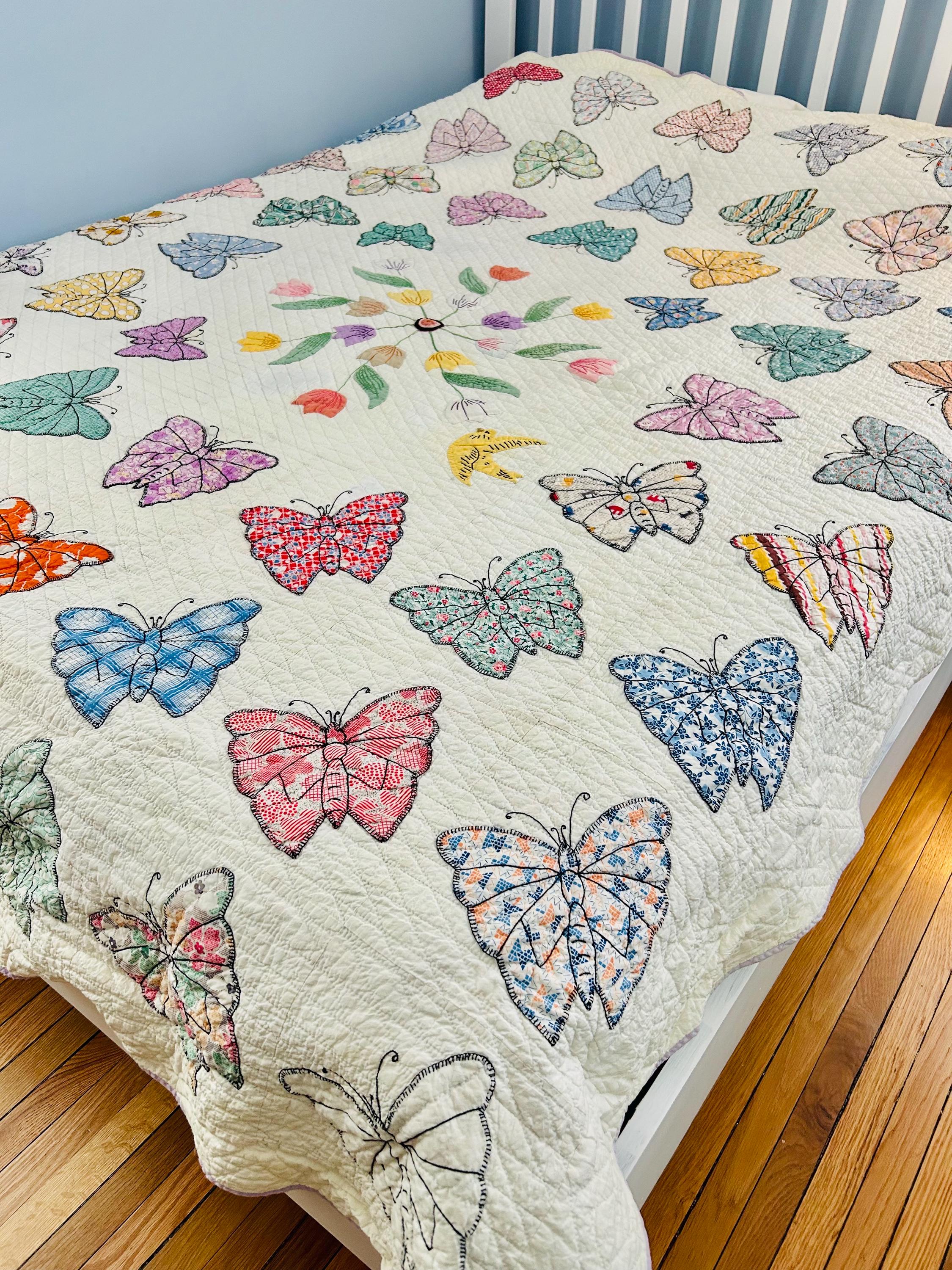 Details • Date: Circa 1930s • Category: Folk Art Quilt • Pattern: One-of-a-kind folk art design (birds & butterflies) • Materials: Vintage cotton fabrics • Construction: Hand appliquéd, hand embroidered, and hand quilted • Size: 70” x 87”