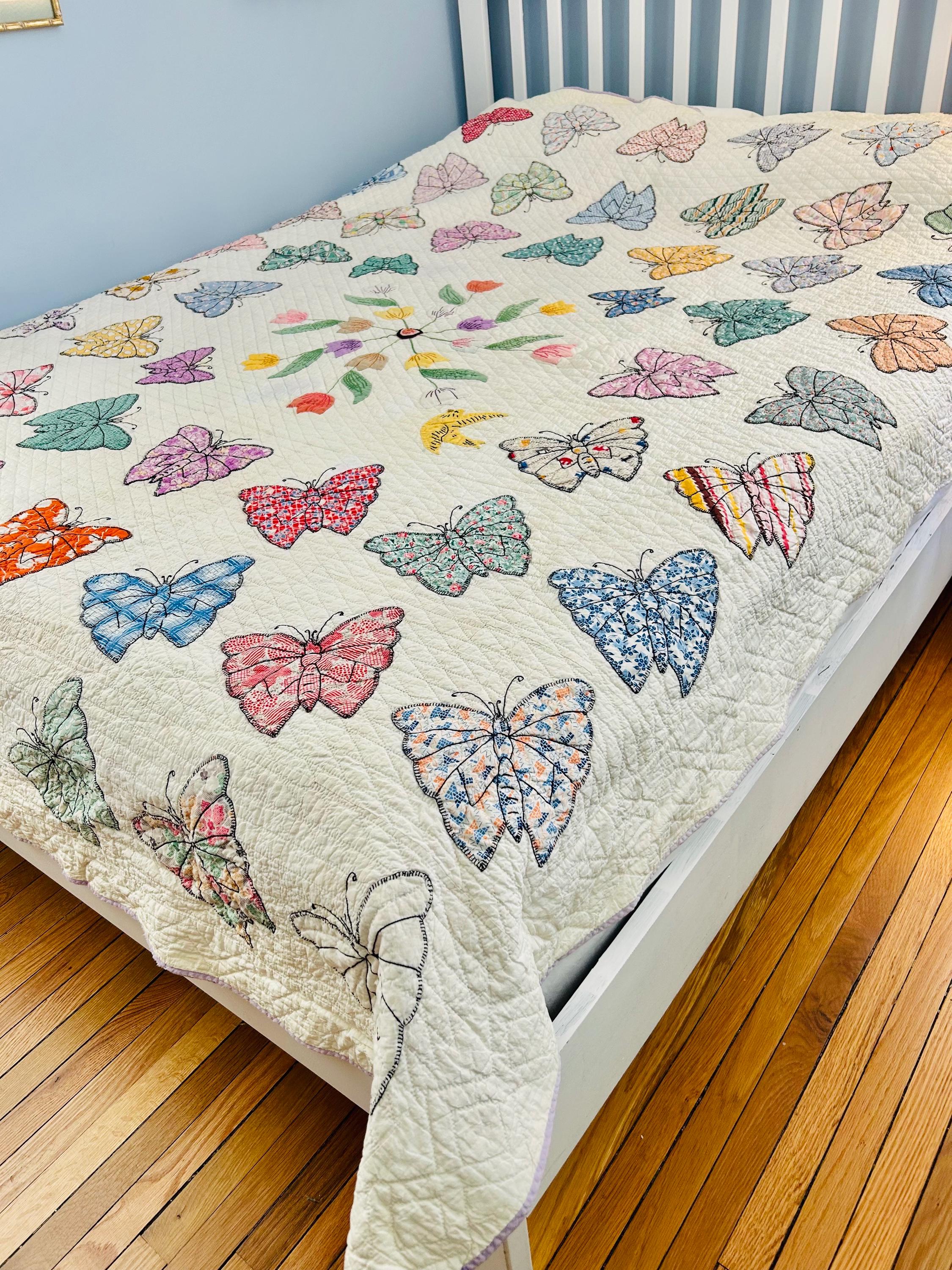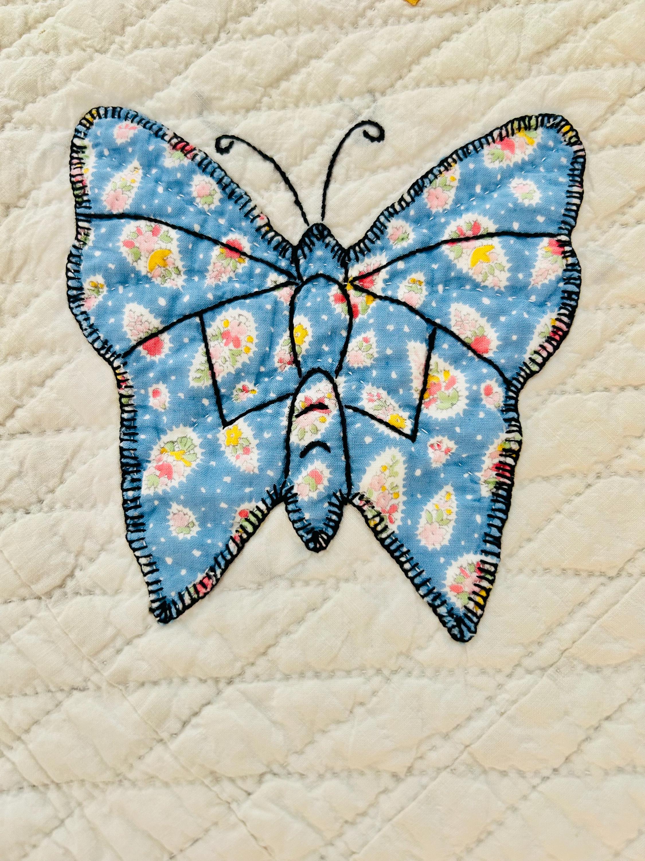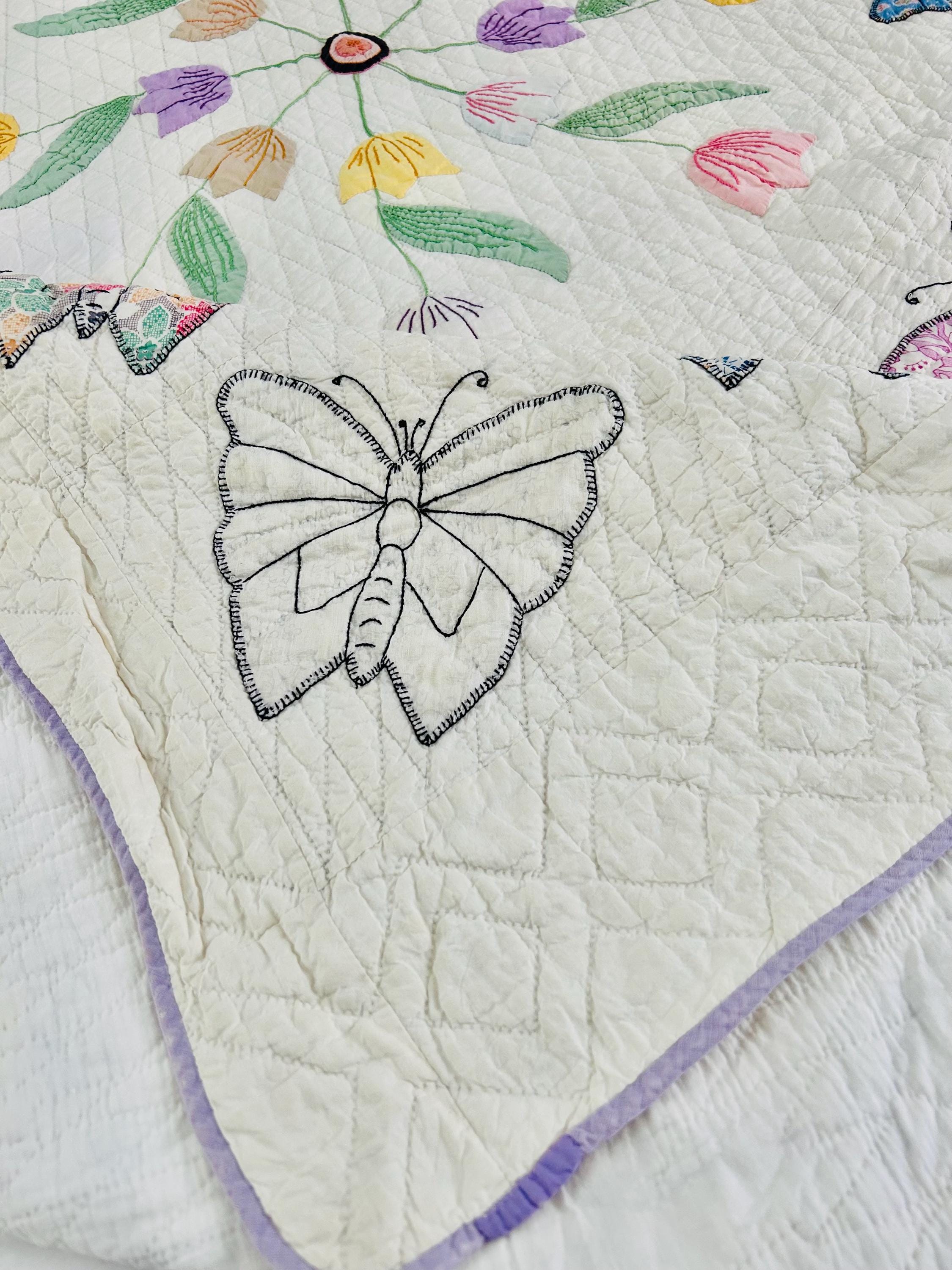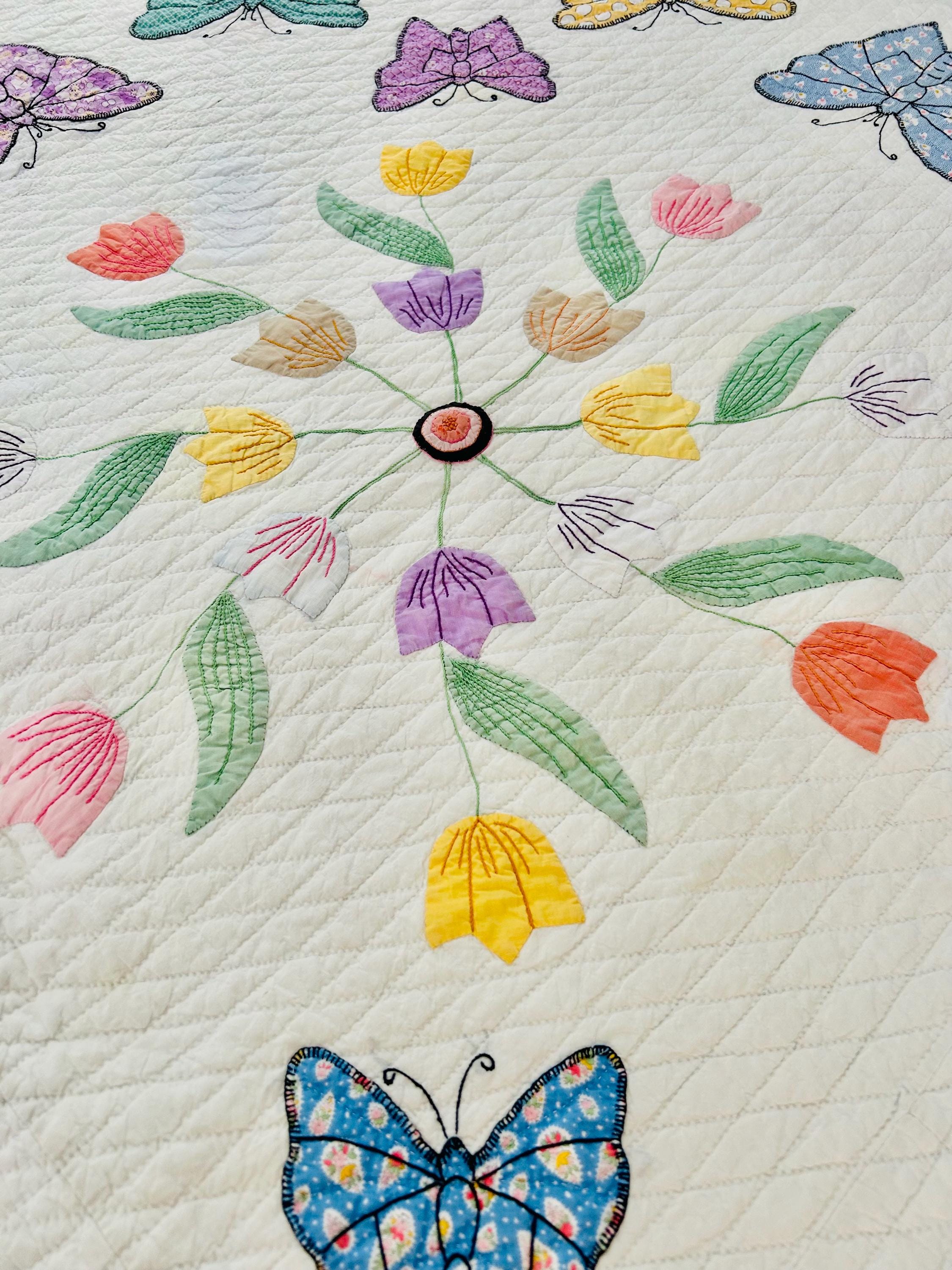Details • Date: Circa 1930s • Category: Folk Art Quilt • Pattern: One-of-a-kind folk art design (birds & butterflies) • Materials: Vintage cotton fabrics • Construction: Hand appliquéd, hand embroidered, and hand quilted • Size: 70” x 87”