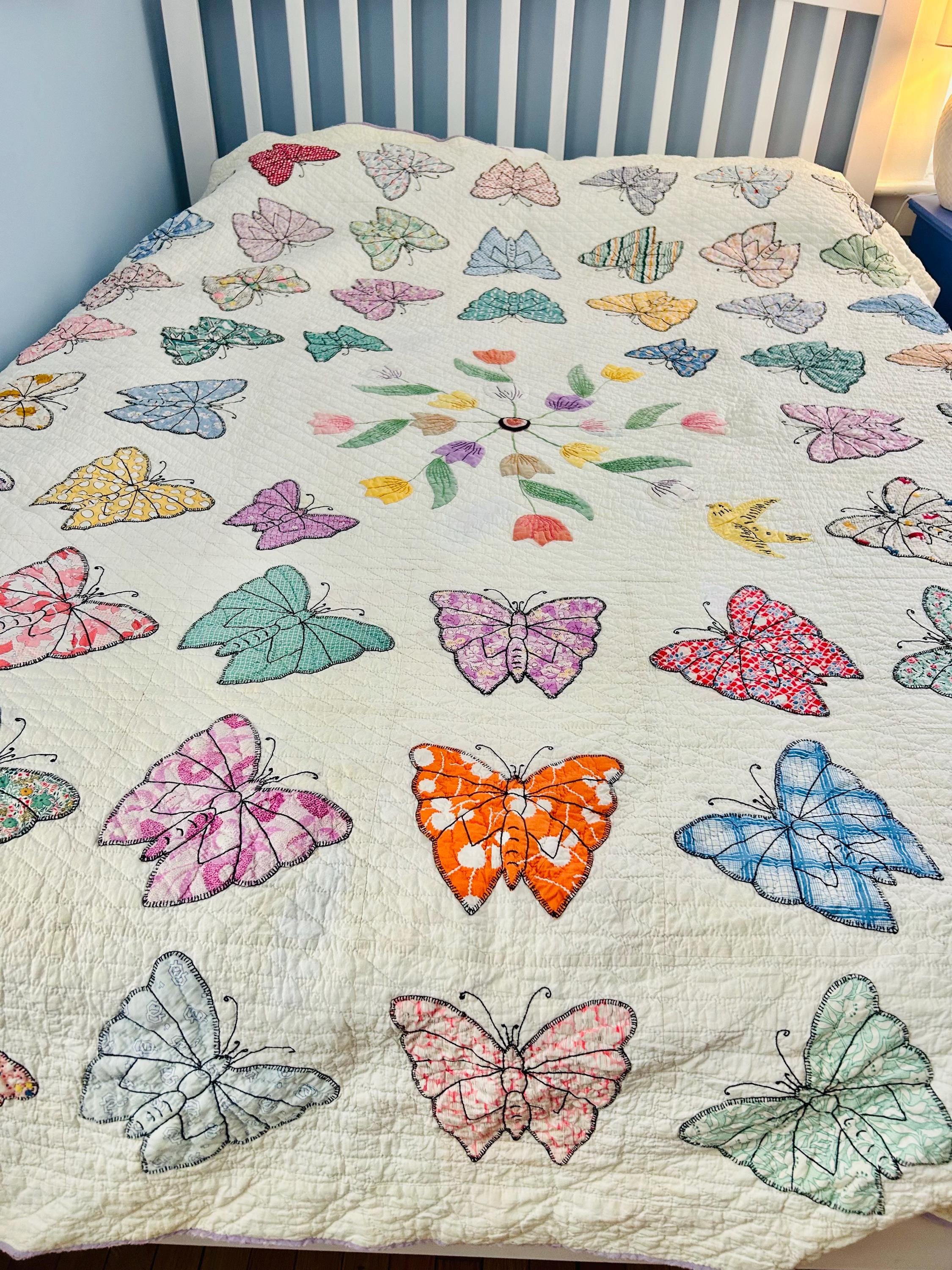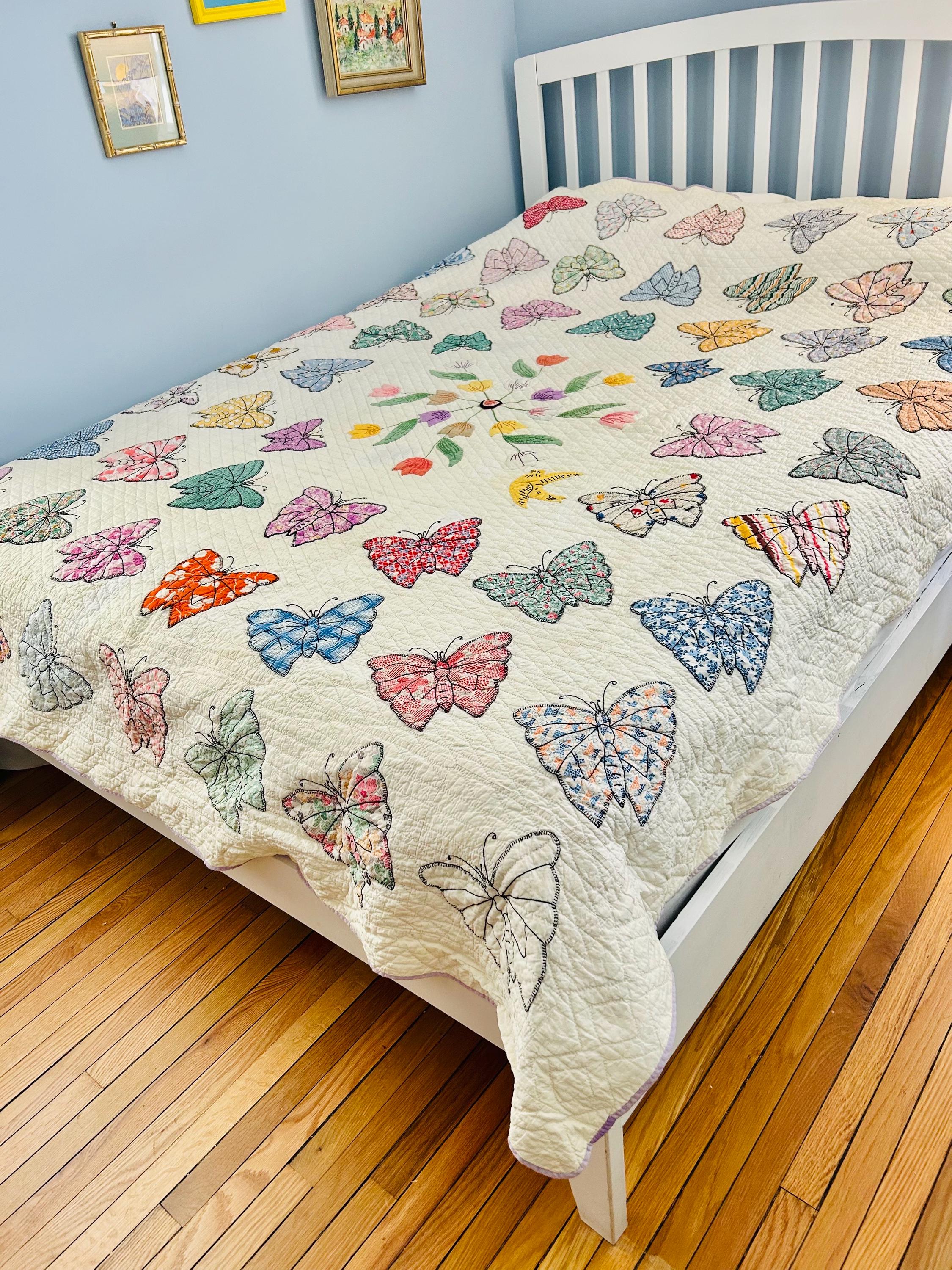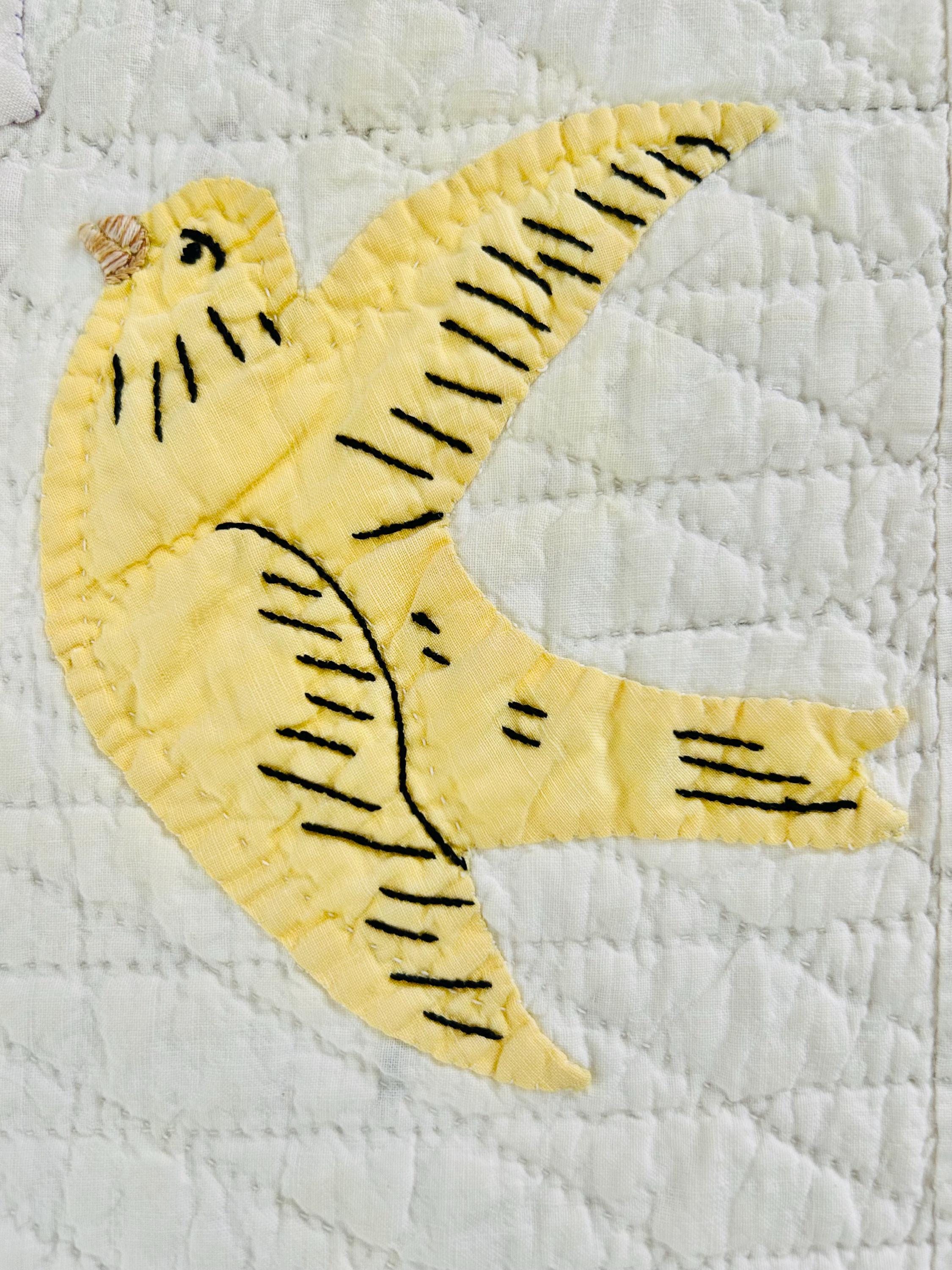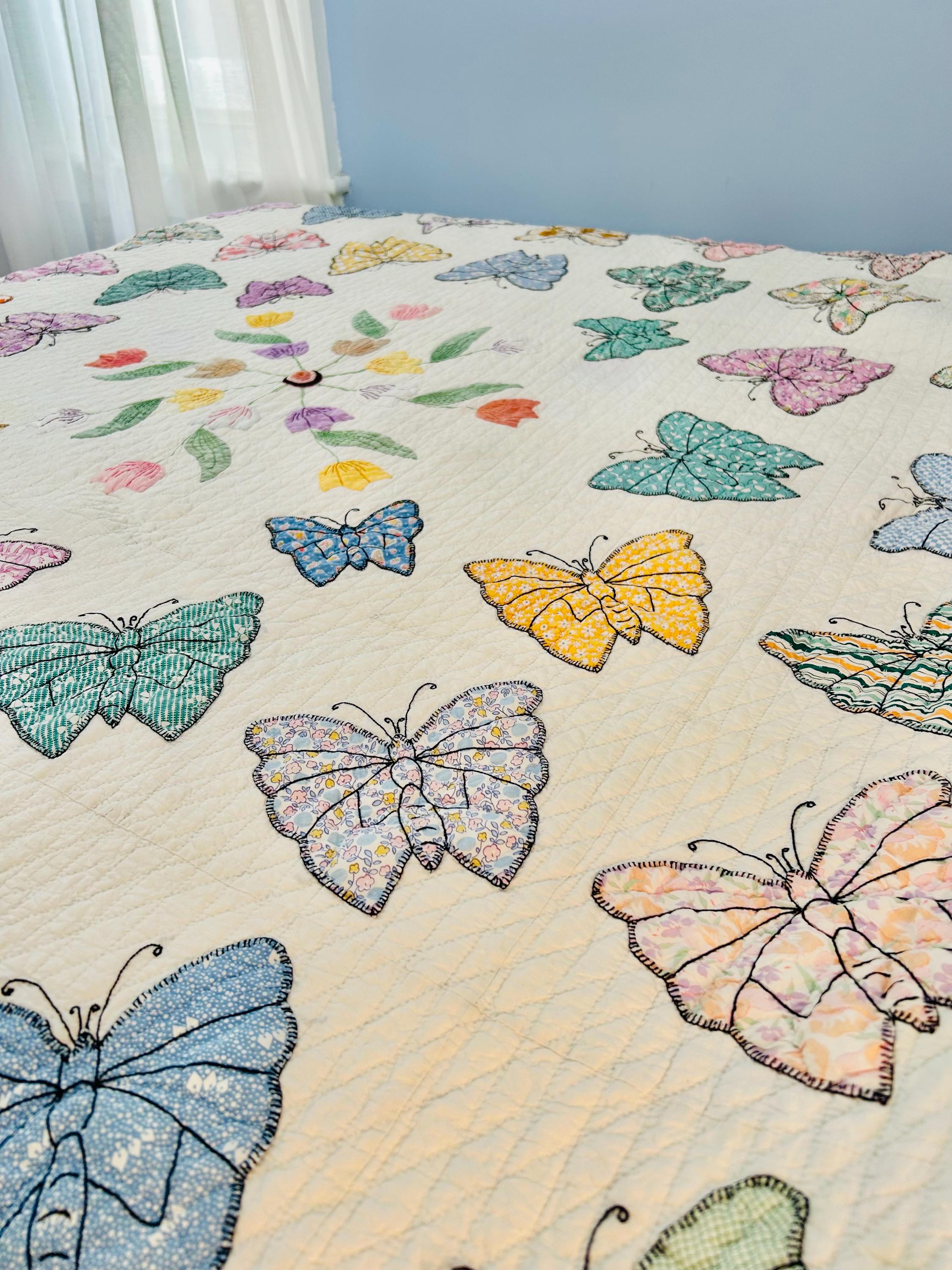 Details • Date: Circa 1930s • Category: Folk Art Quilt • Pattern: One-of-a-kind folk art design (birds & butterflies) • Materials: Vintage cotton fabrics • Construction: Hand appliquéd, hand embroidered, and hand quilted • Size: 70” x 87”