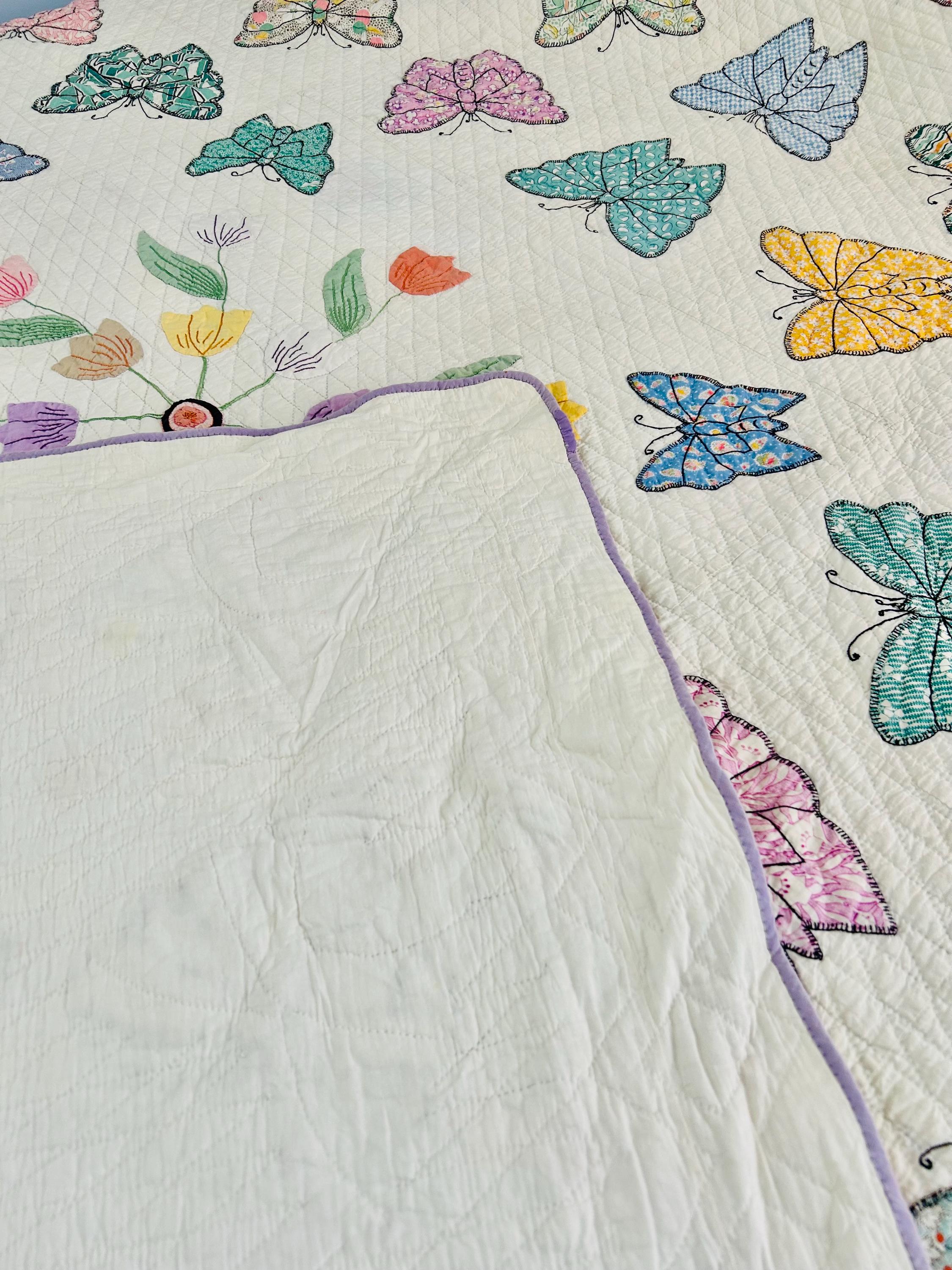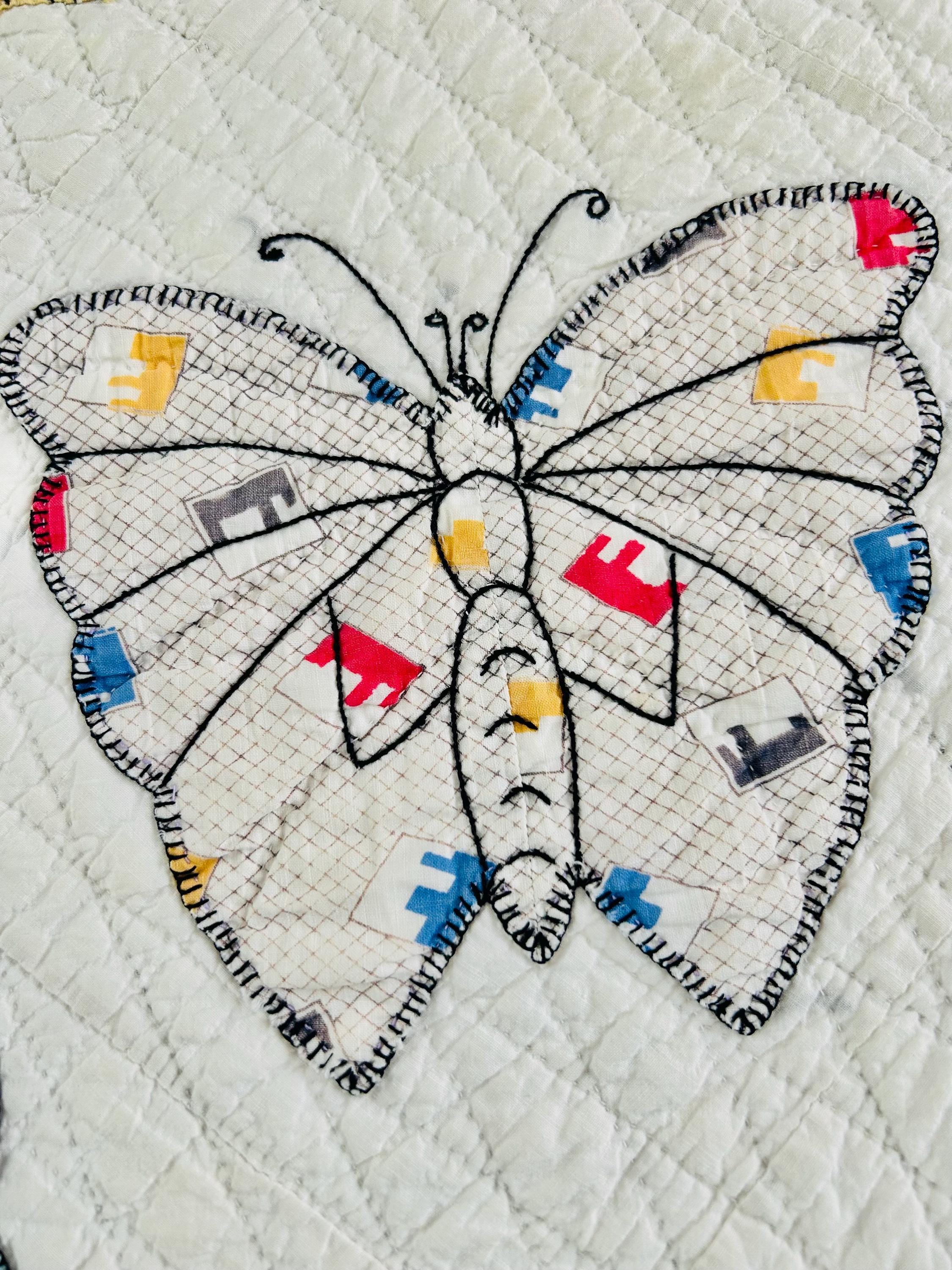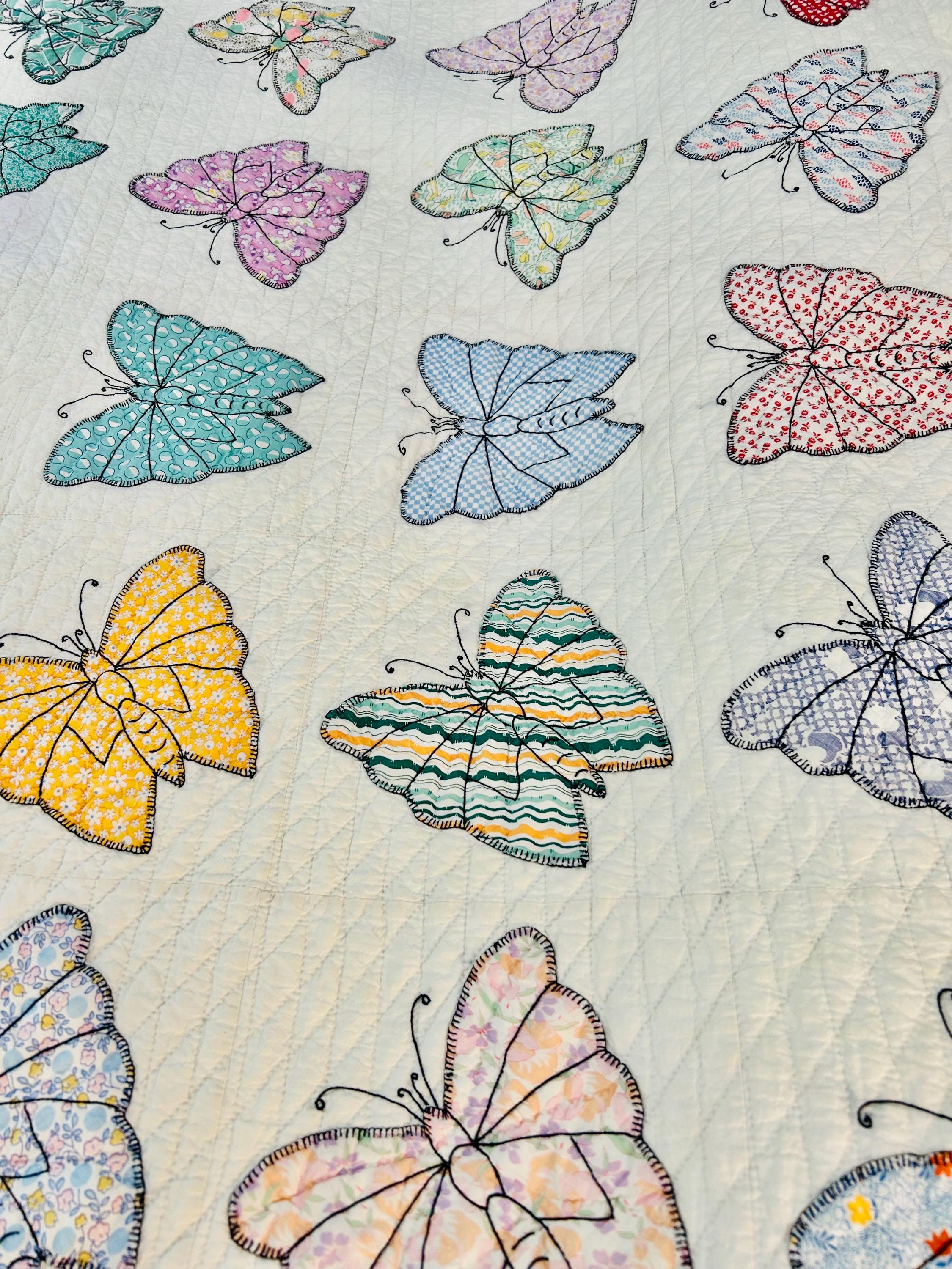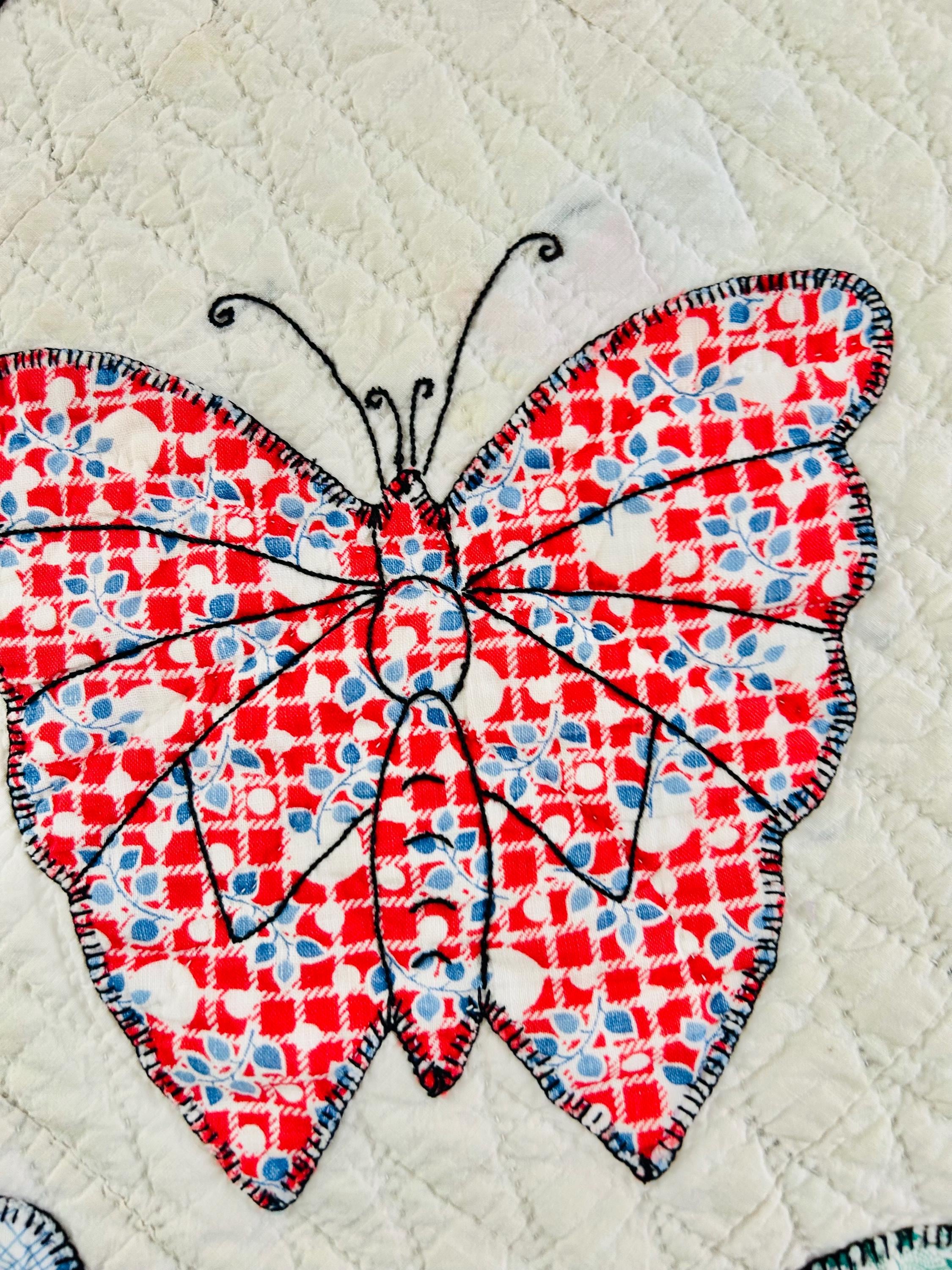 Details • Date: Circa 1930s • Category: Folk Art Quilt • Pattern: One-of-a-kind folk art design (birds & butterflies) • Materials: Vintage cotton fabrics • Construction: Hand appliquéd, hand embroidered, and hand quilted • Size: 70” x 87”