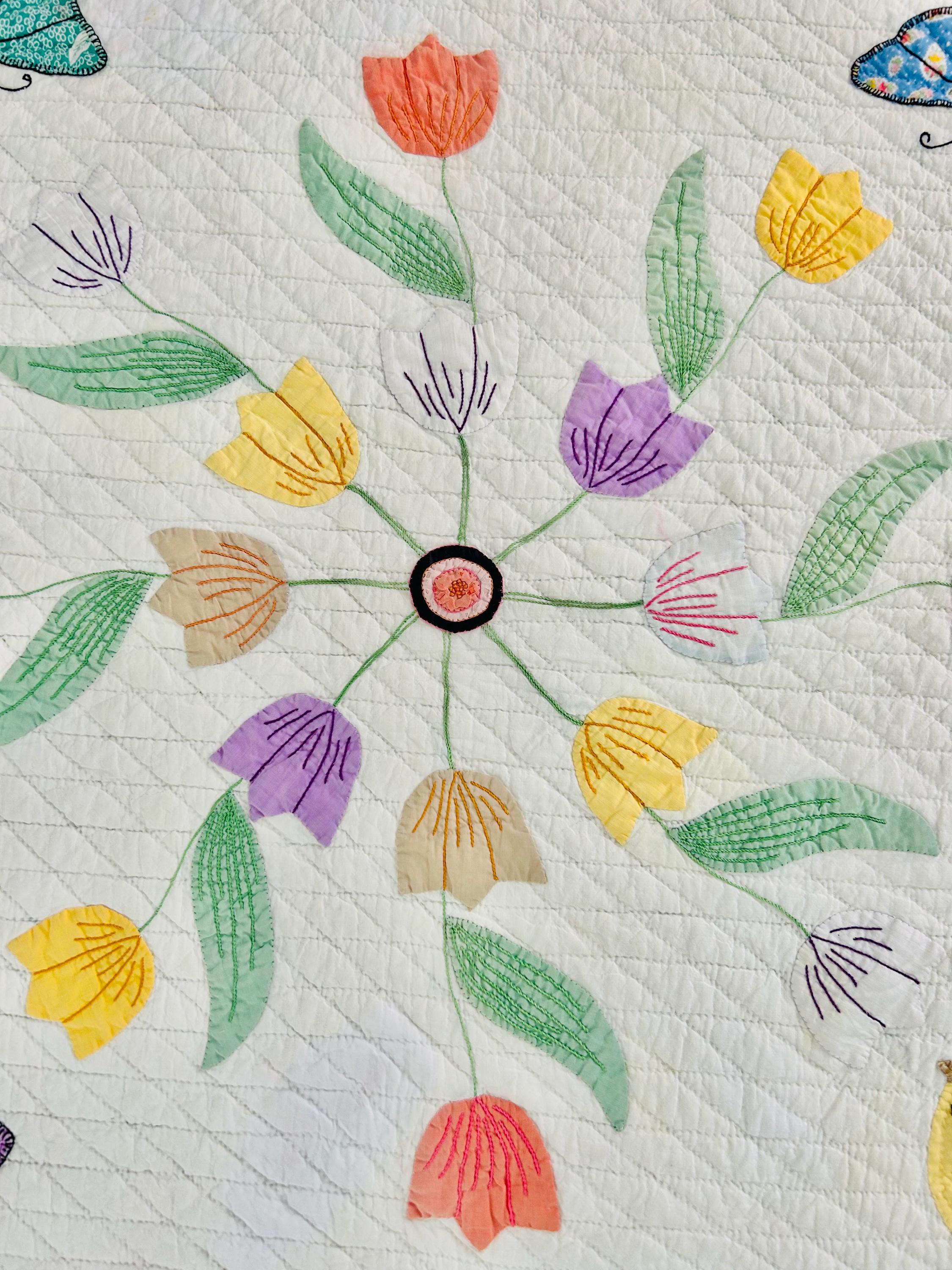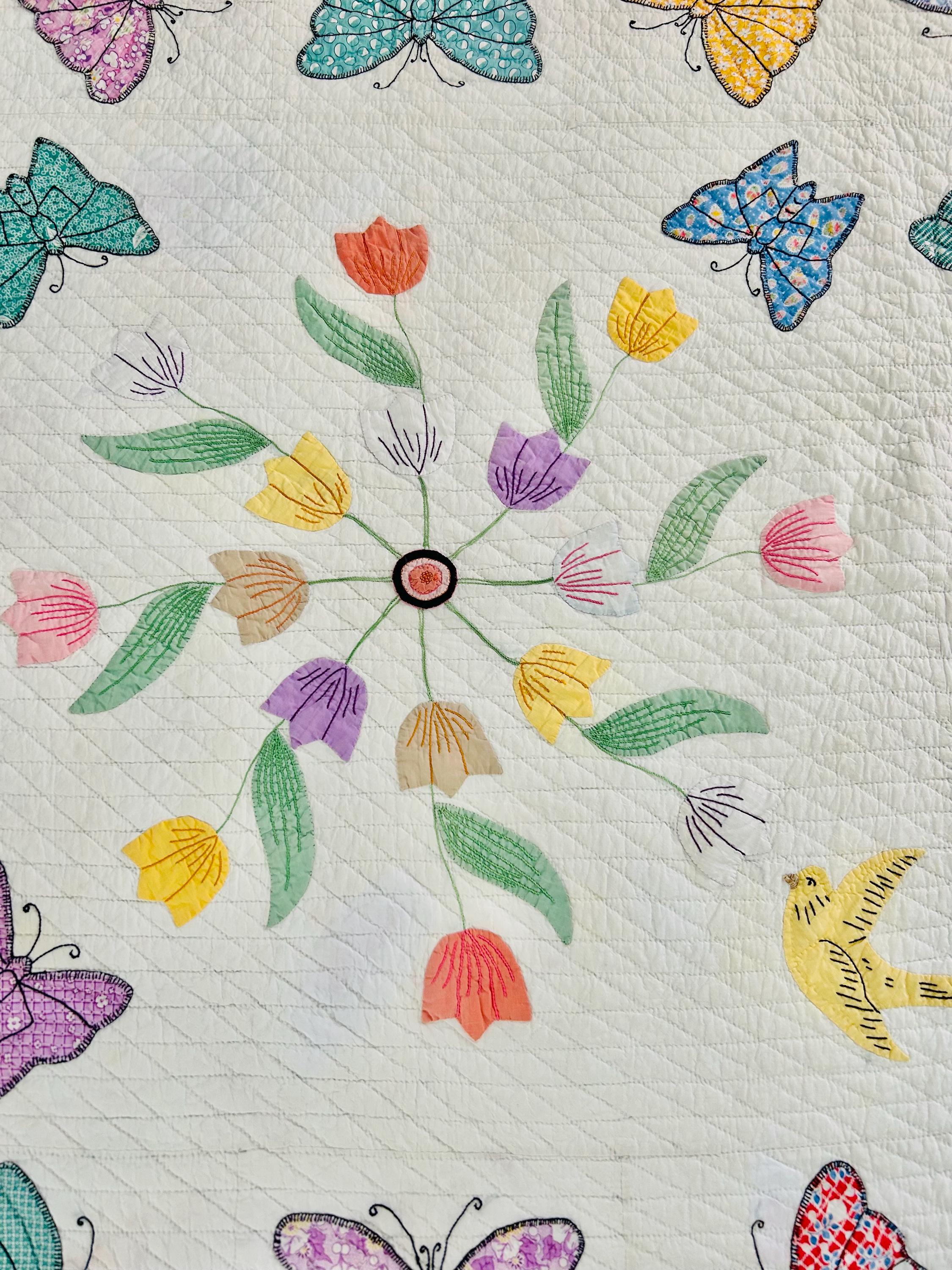 This exceptional Bird and Butterflies antique folk art quilt, dating to the 1930s, is a joyful expression of early 20th century quilt making. Rather than following a commercial pattern, the maker created a one-of-a-kind folk art composition, filled with butterflies, swirling tulips and a yellow bird, all meticulously hand-embroidered.