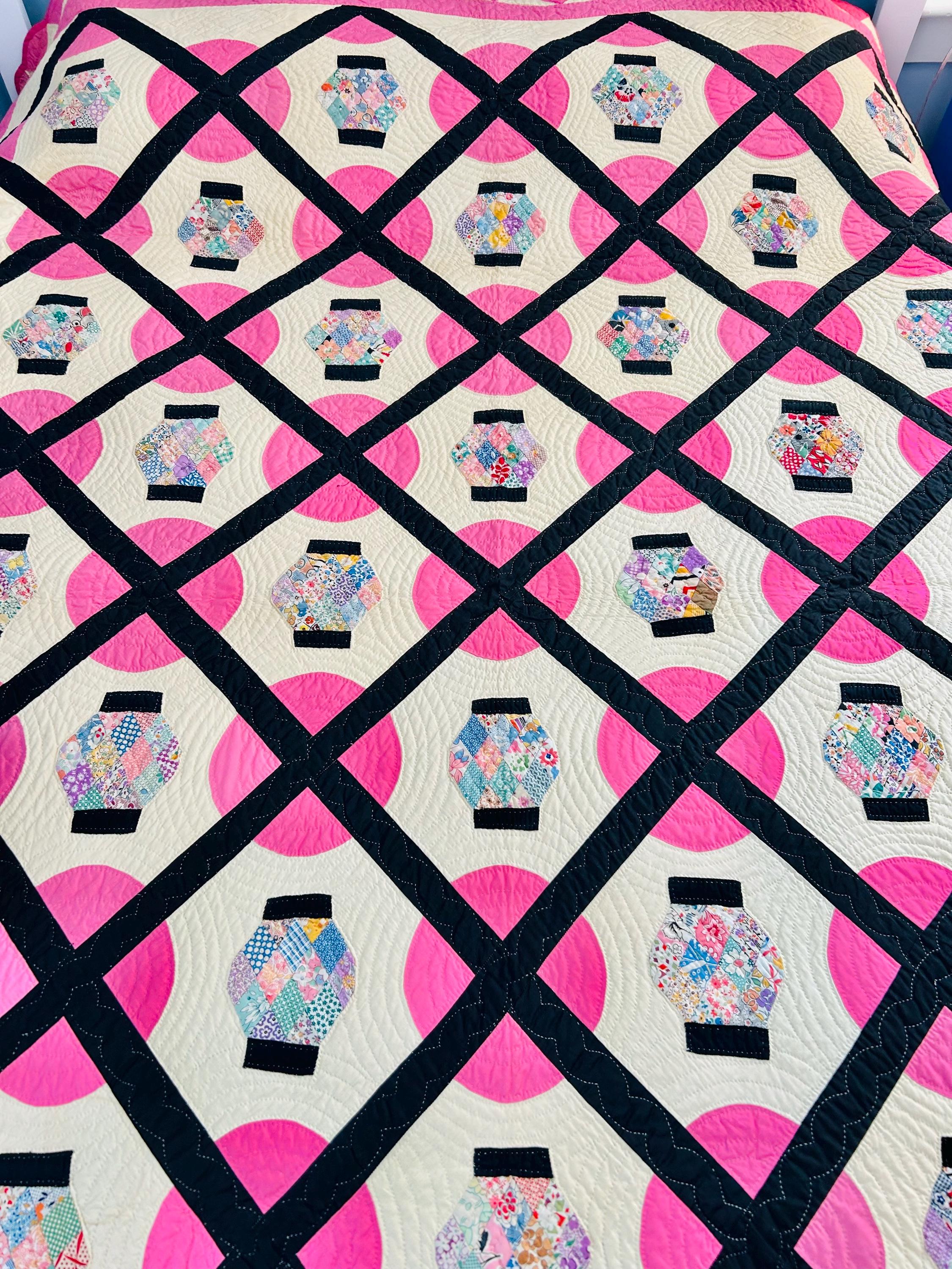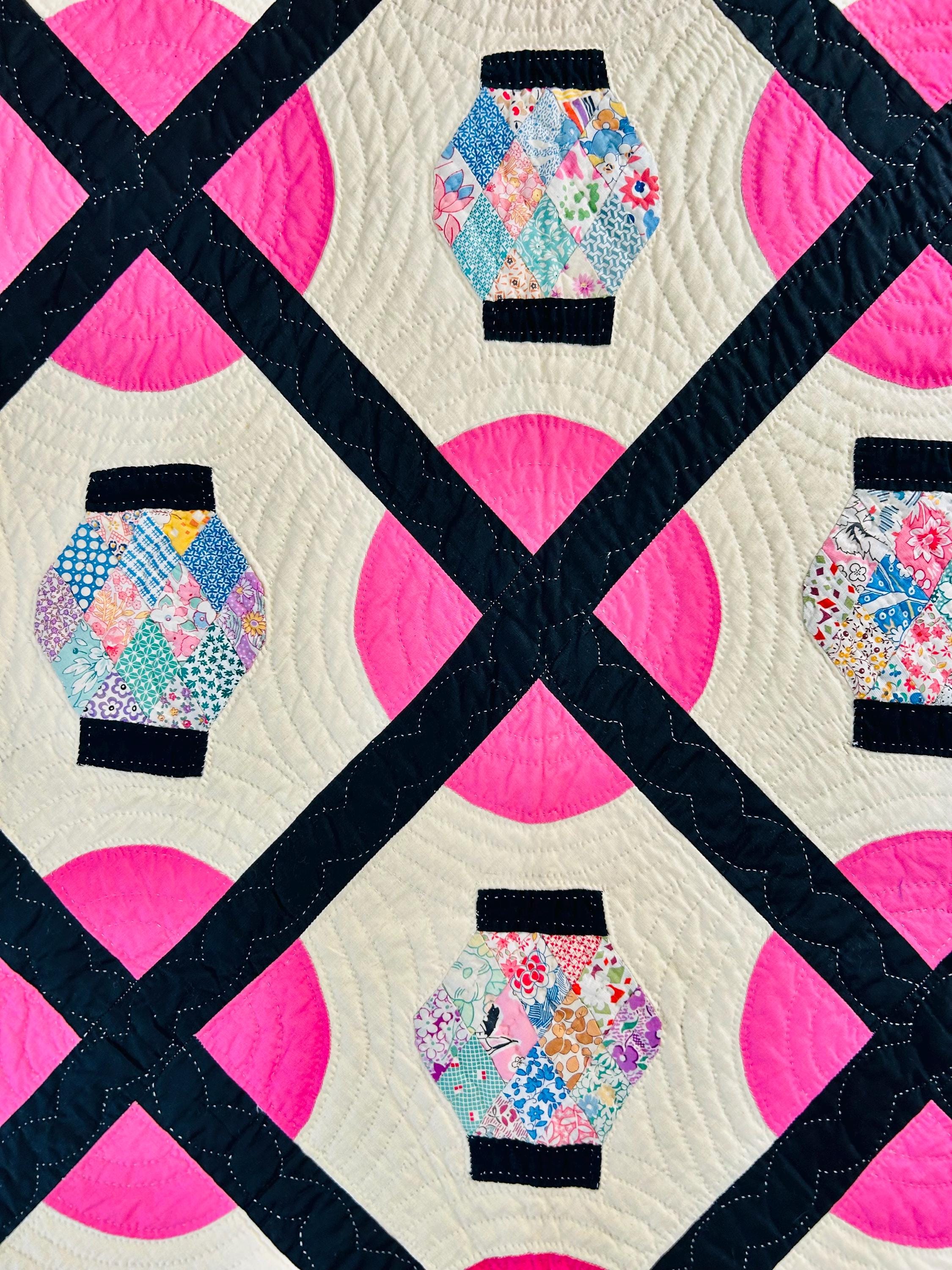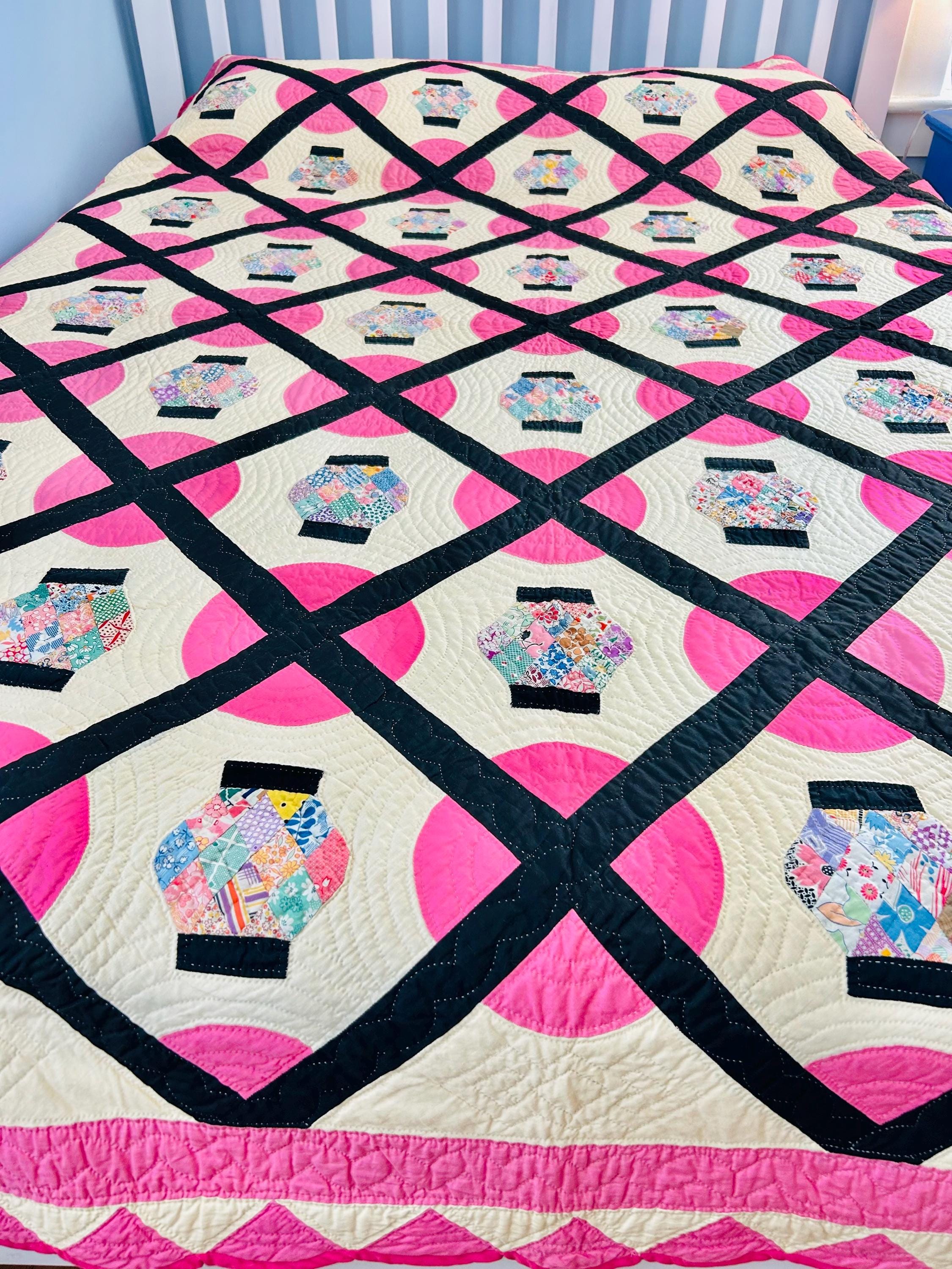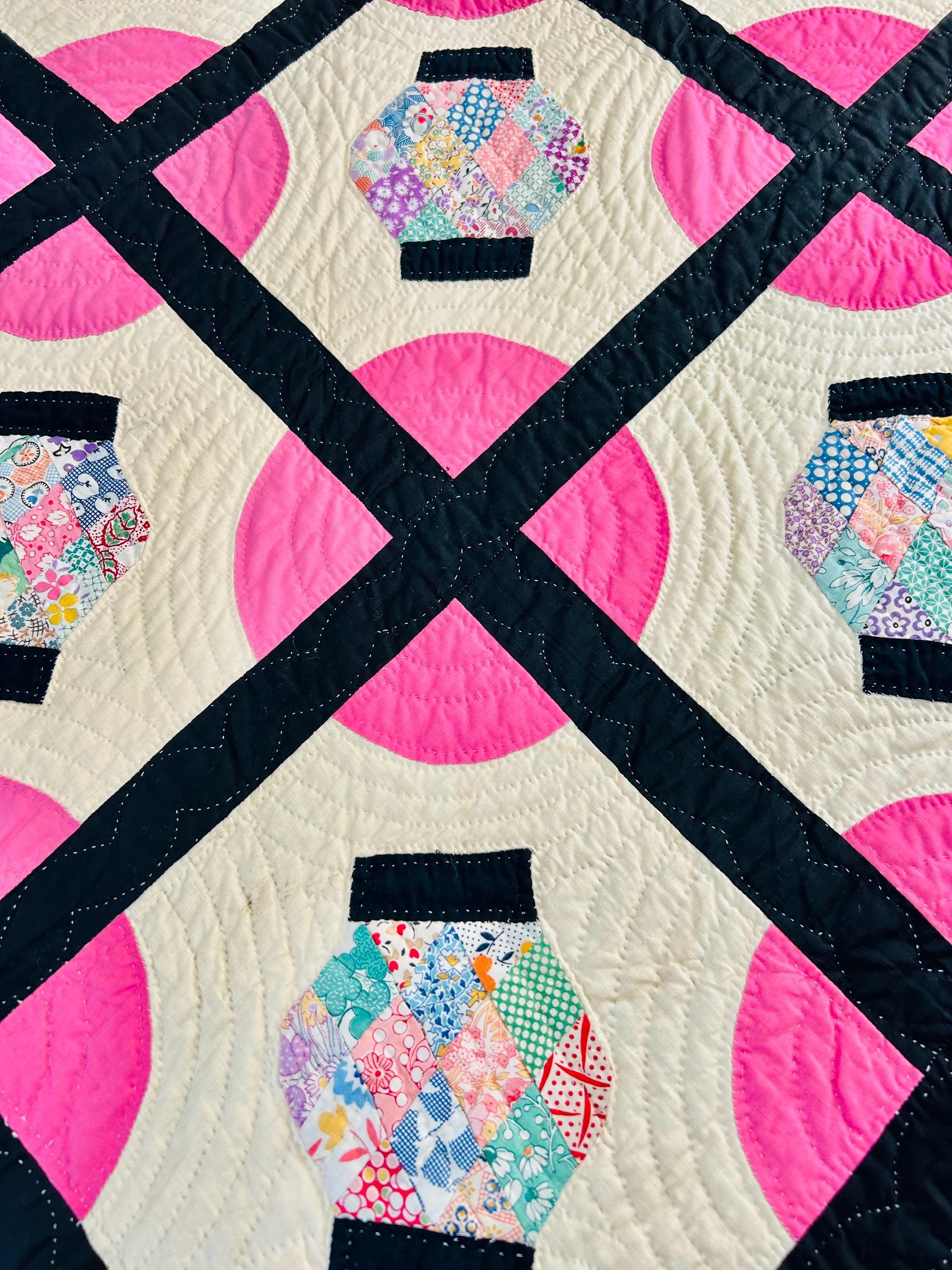 Details: • Era: Circa 1948–1955. • Pattern: Japanese Lantern • Fabrics: A collection of mid-century florals, geometrics, and solids. • Craftsmanship: Beautifully hand-quilted with consistent stitching. • Condition: Pristine. No holes, no "storage spots," and no odors. It has been stored flat and protected for decades. The binding is hand-finished and intact. Dimensions: 72" x 90"
