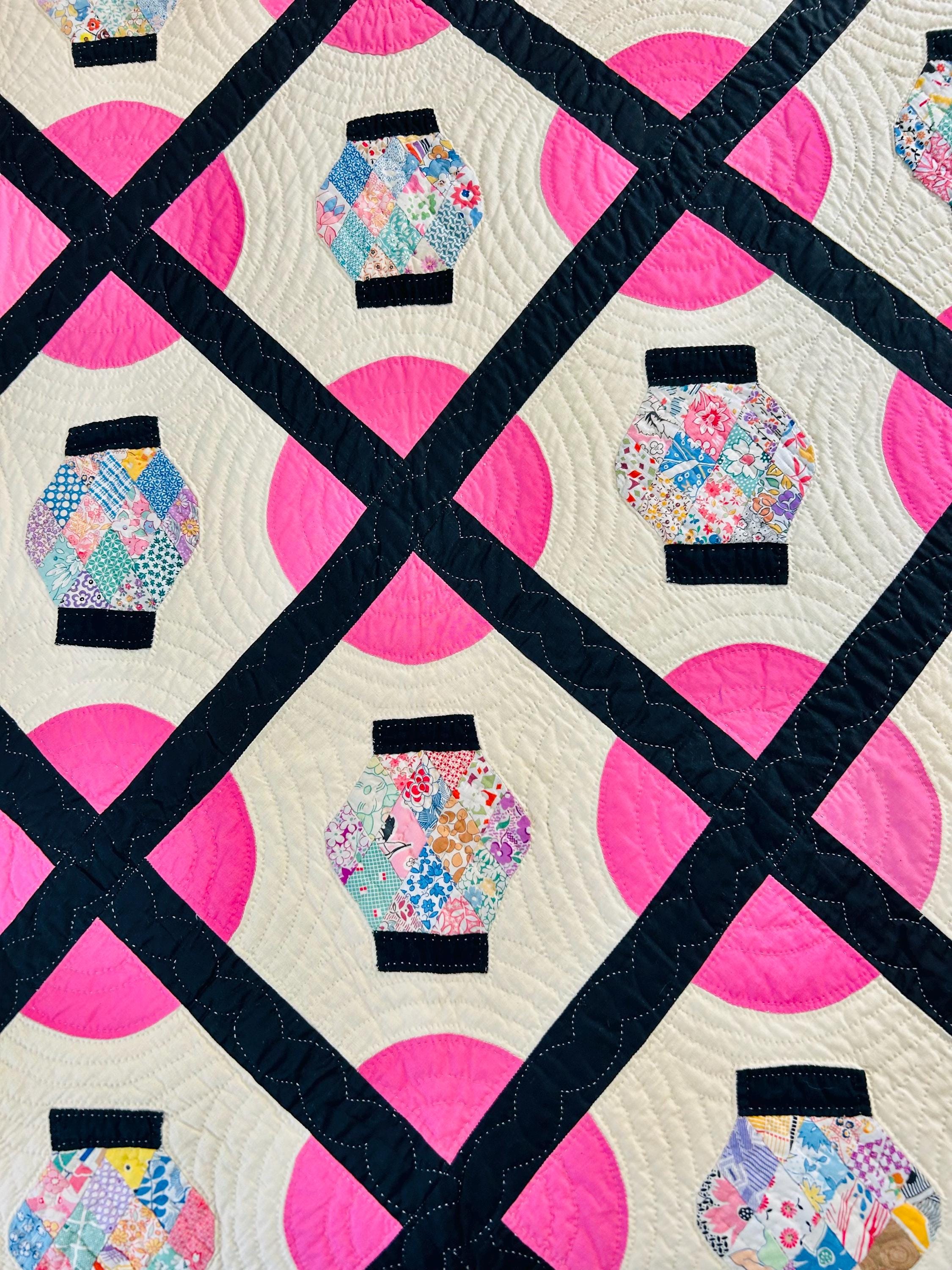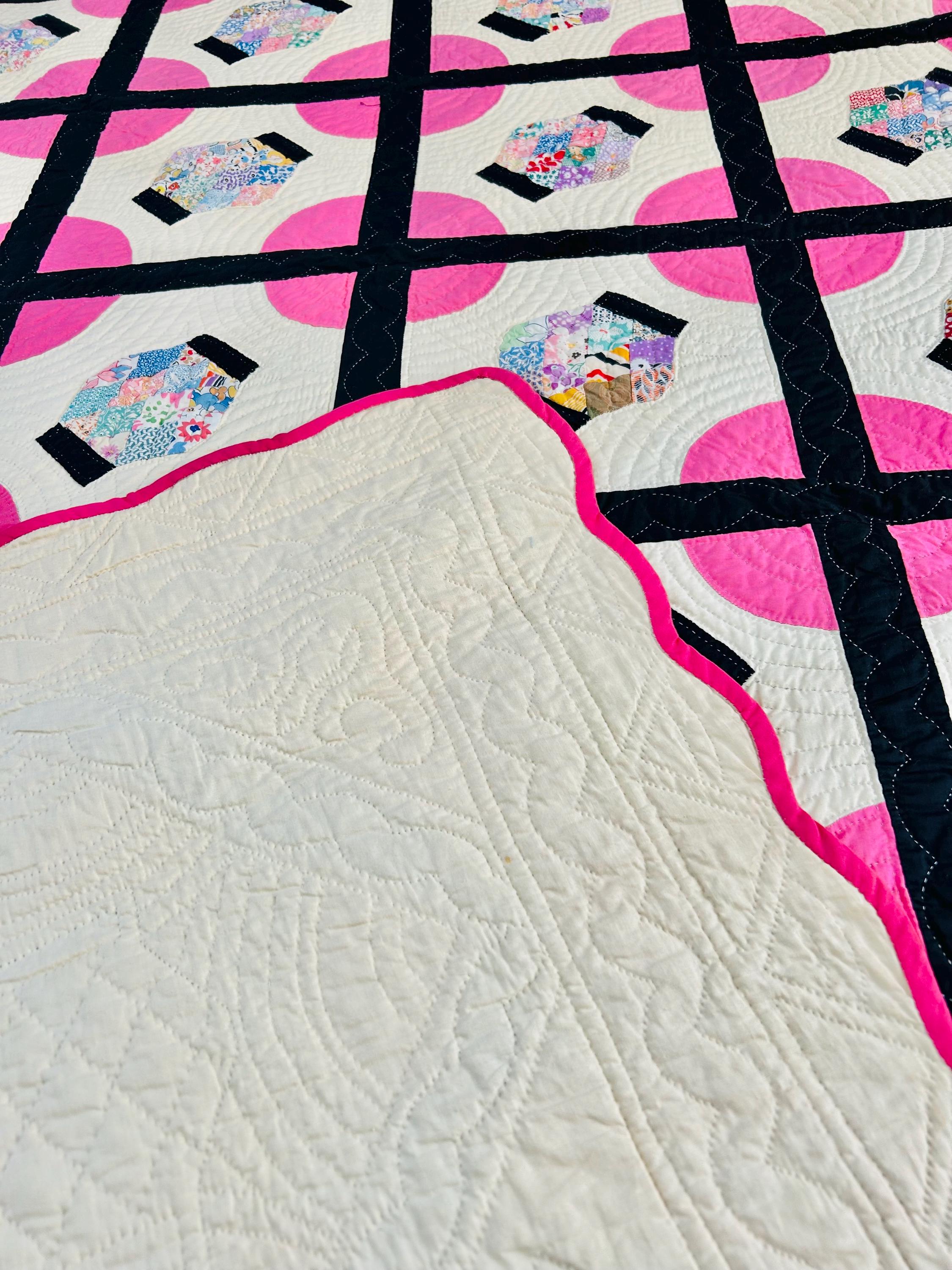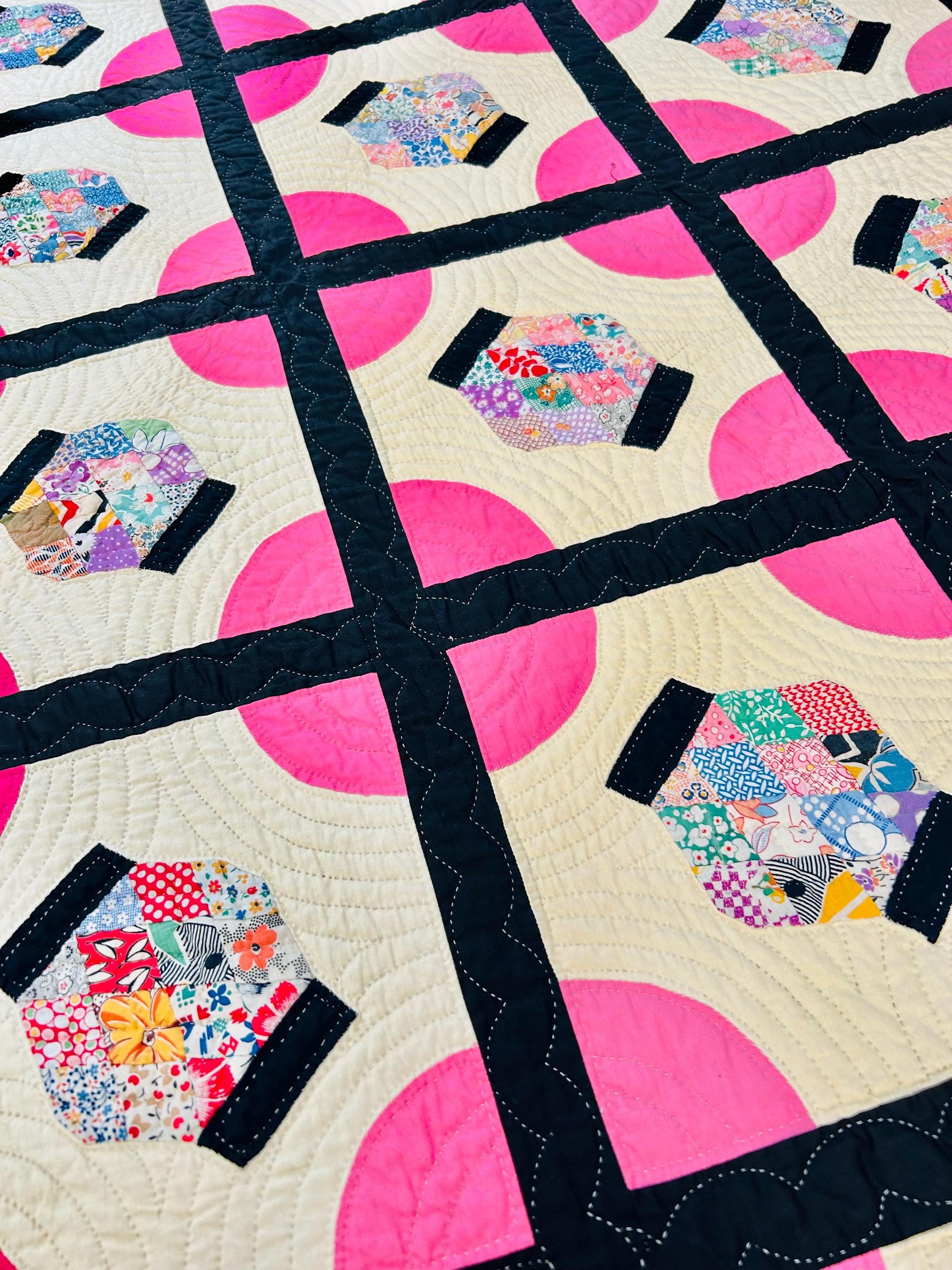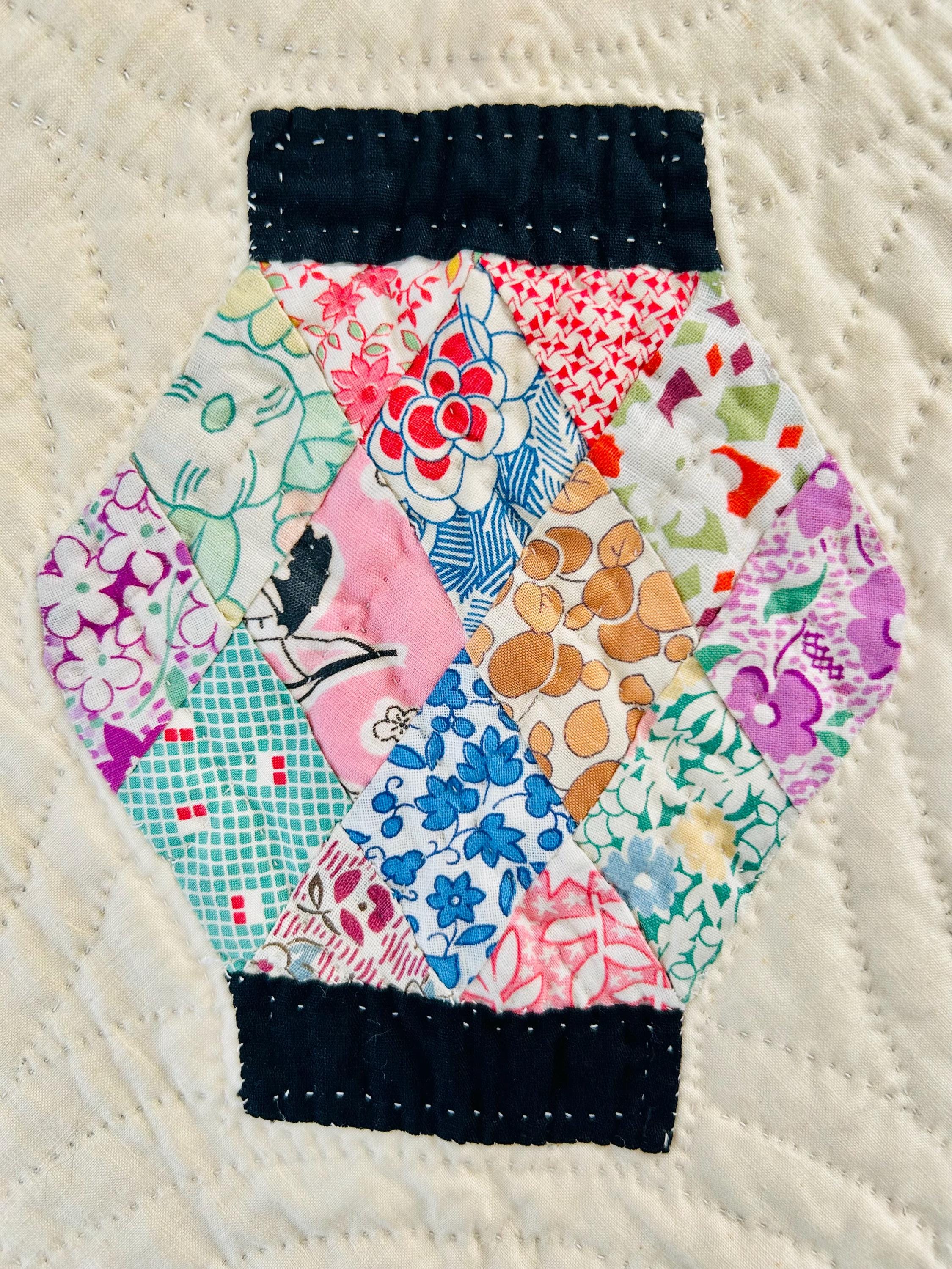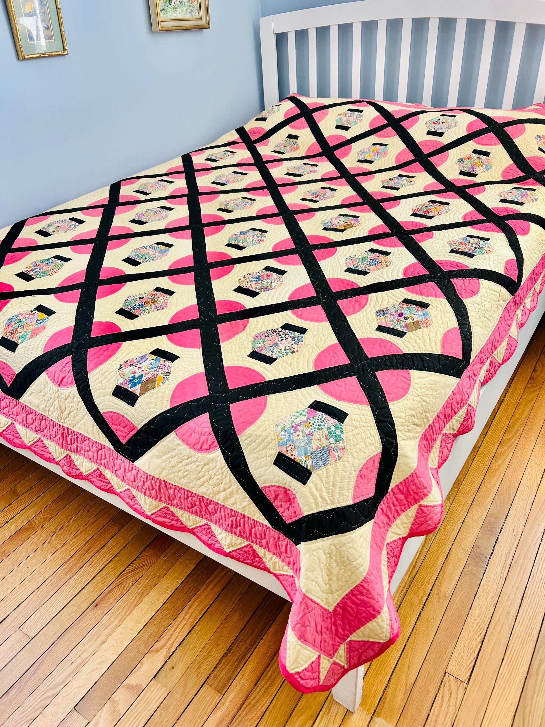 Details: • Era: Circa 1948–1955. • Pattern: Japanese Lantern • Fabrics: A collection of mid-century florals, geometrics, and solids. • Craftsmanship: Beautifully hand-quilted with consistent stitching. • Condition: Pristine. No holes, no "storage spots," and no odors. It has been stored flat and protected for decades. The binding is hand-finished and intact. Dimensions: 72" x 90"