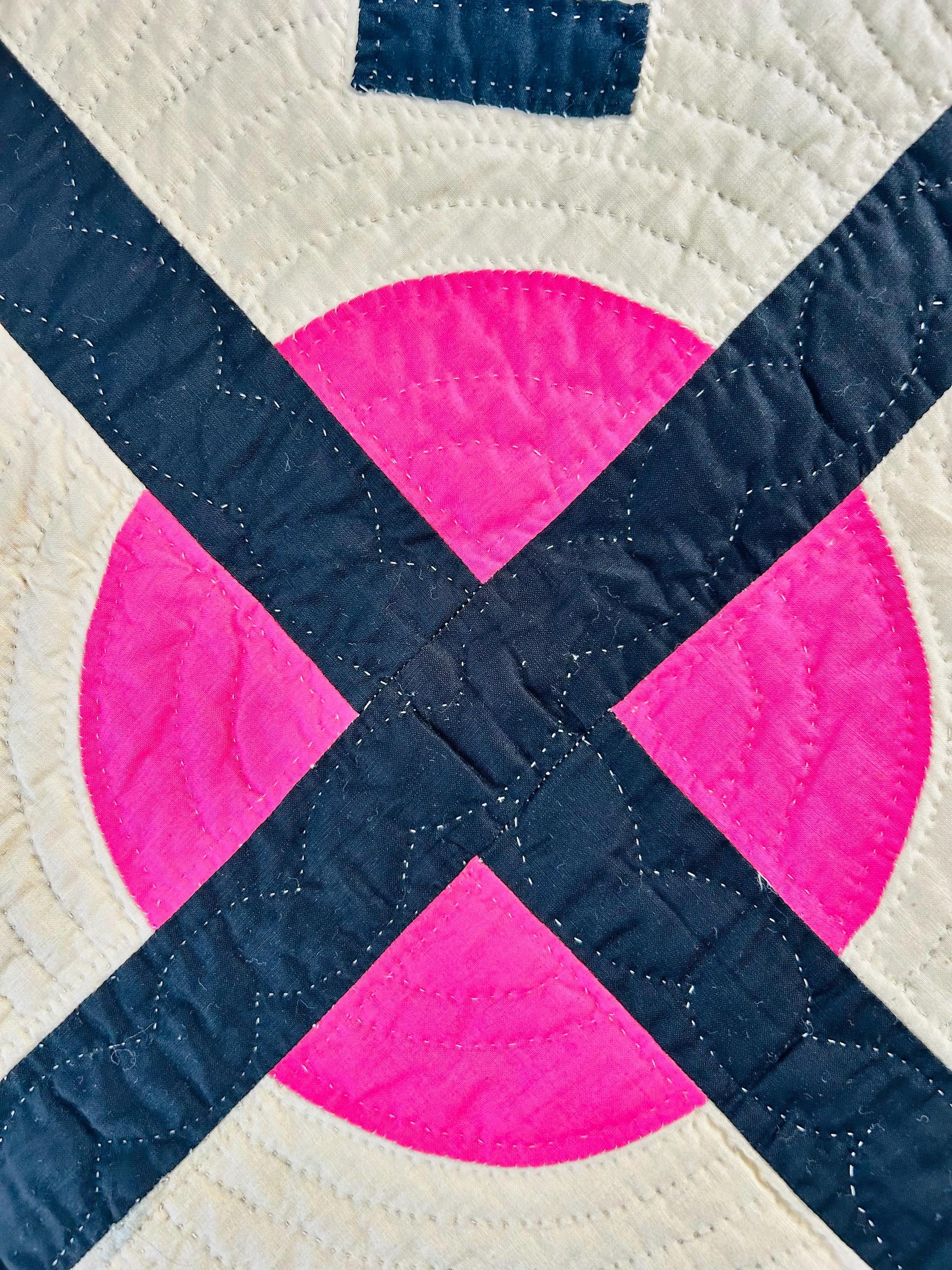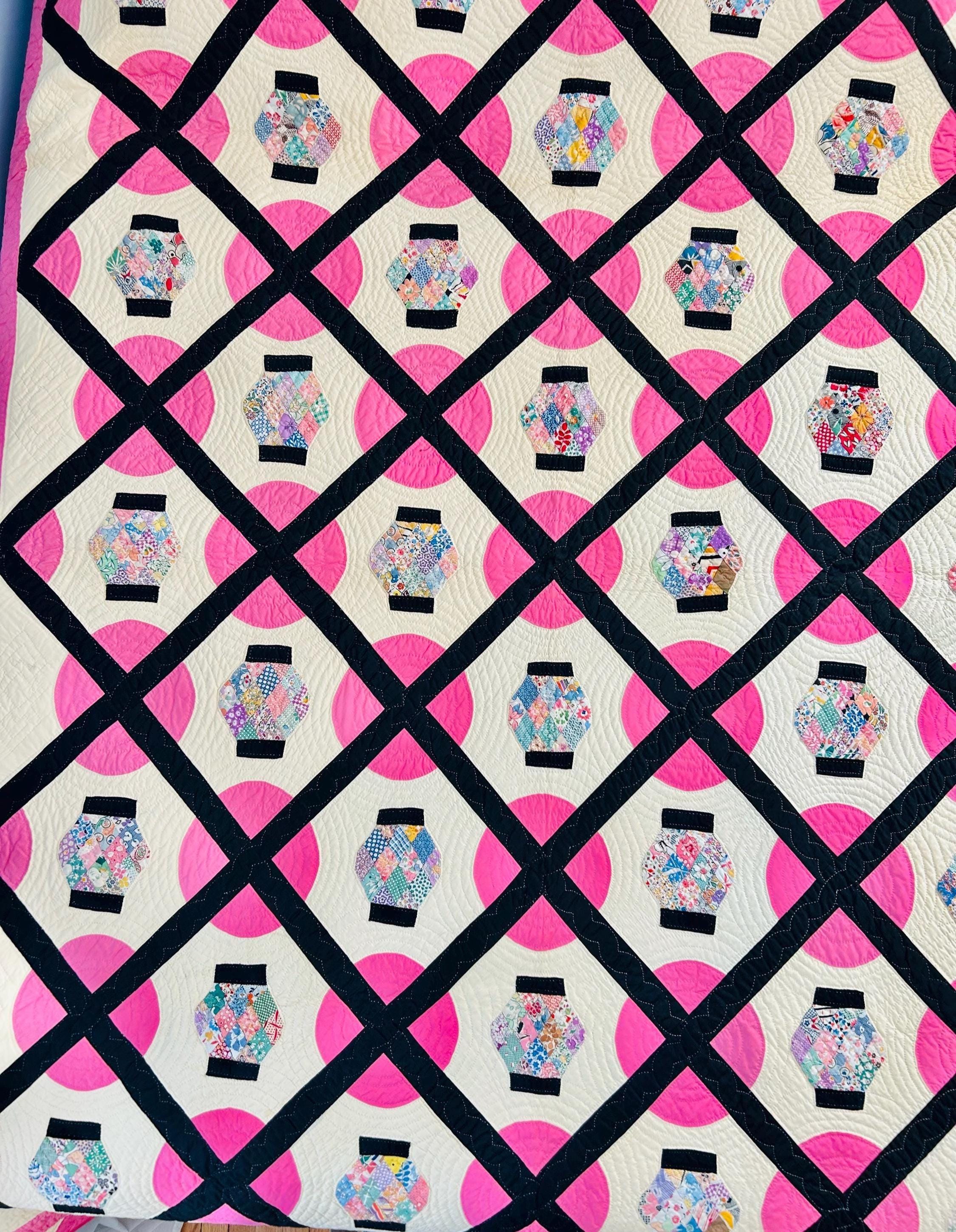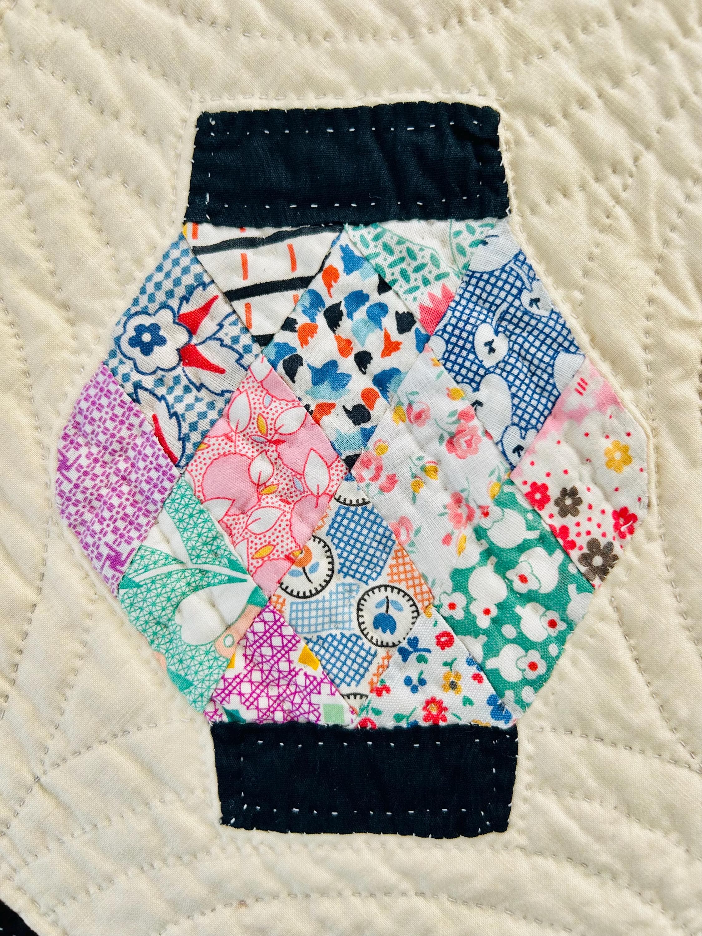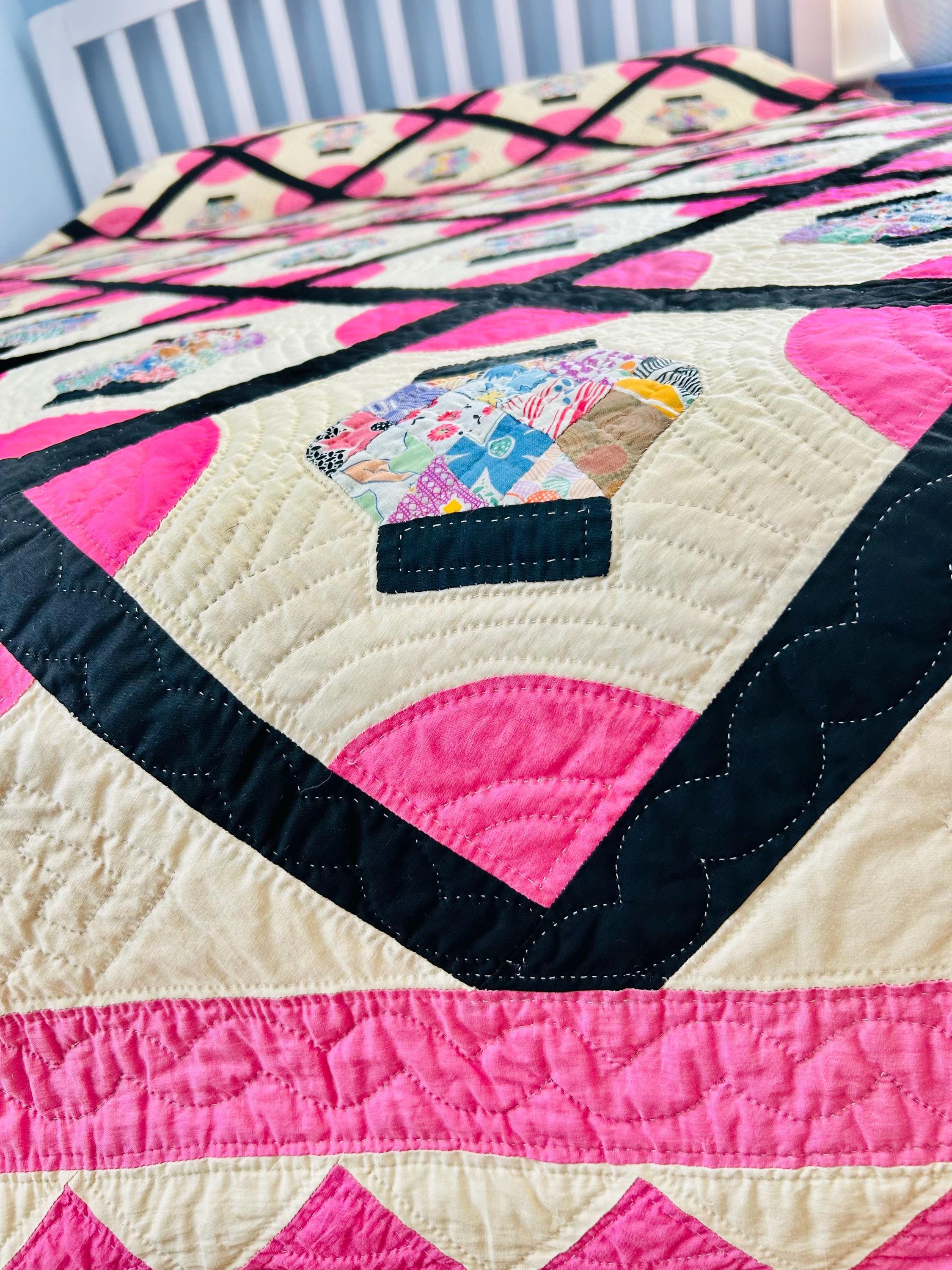 Details: • Era: Circa 1948–1955. • Pattern: Japanese Lantern • Fabrics: A collection of mid-century florals, geometrics, and solids. • Craftsmanship: Beautifully hand-quilted with consistent stitching. • Condition: Pristine. No holes, no "storage spots," and no odors. It has been stored flat and protected for decades. The binding is hand-finished and intact. Dimensions: 72" x 90"