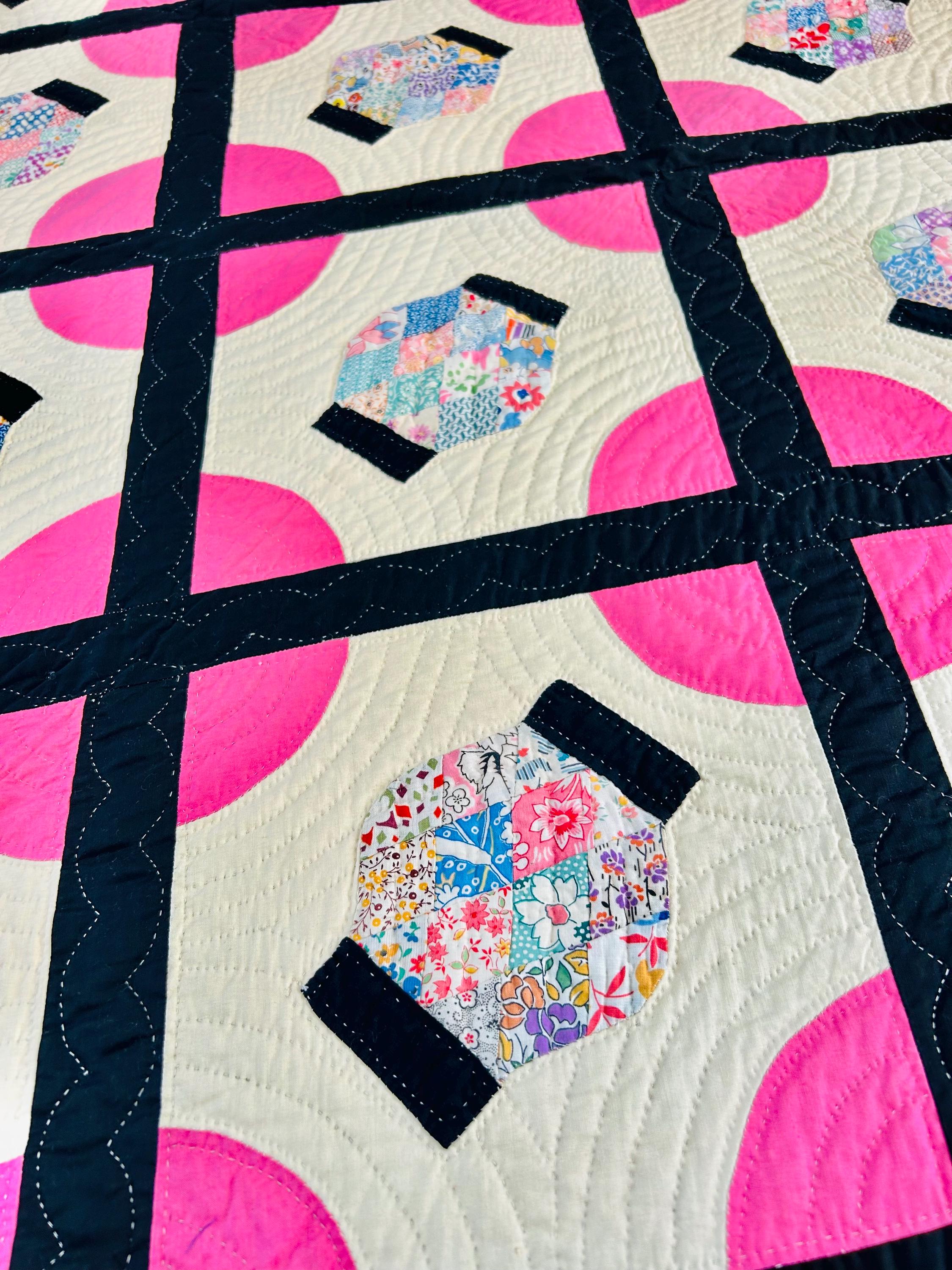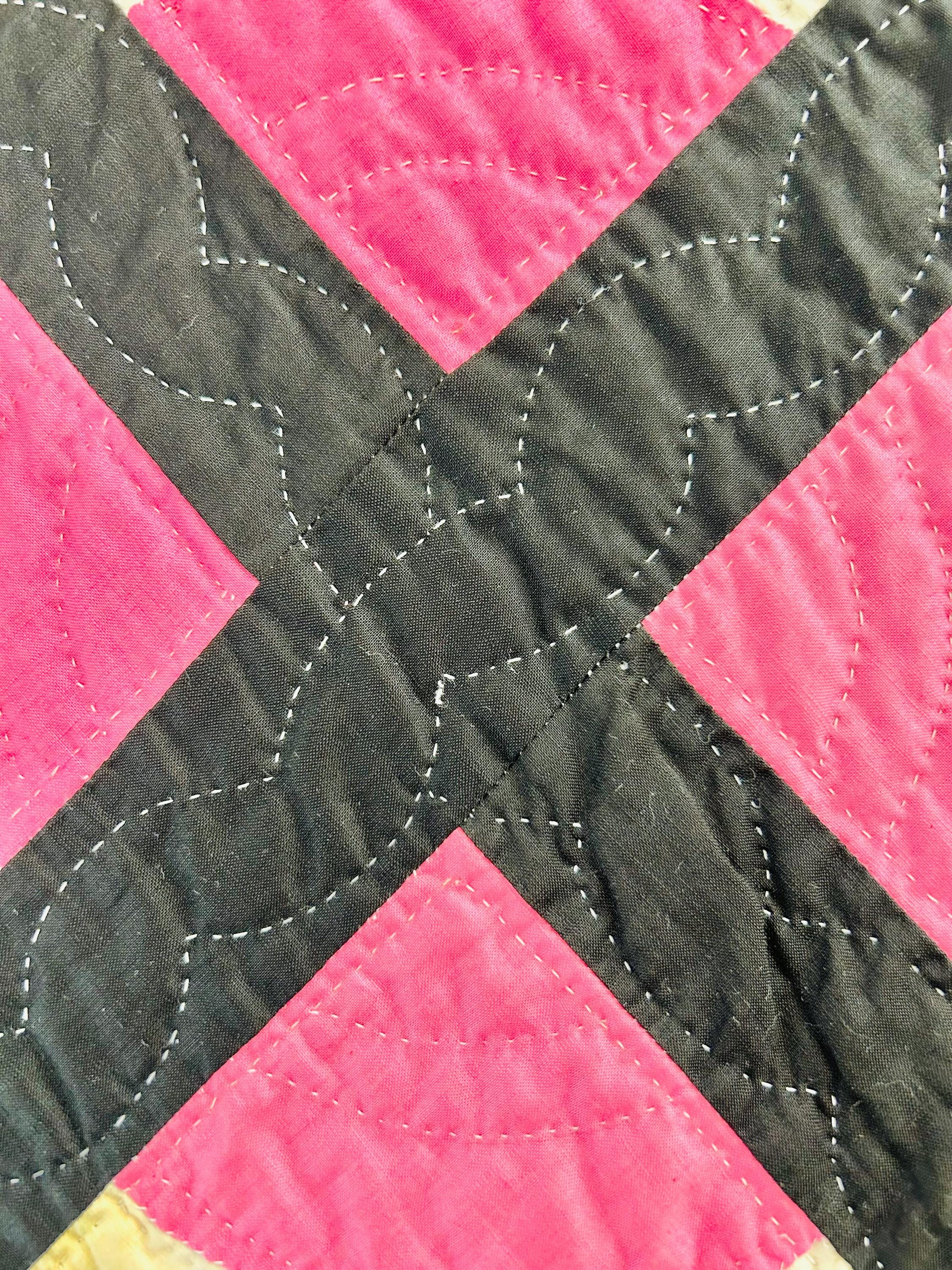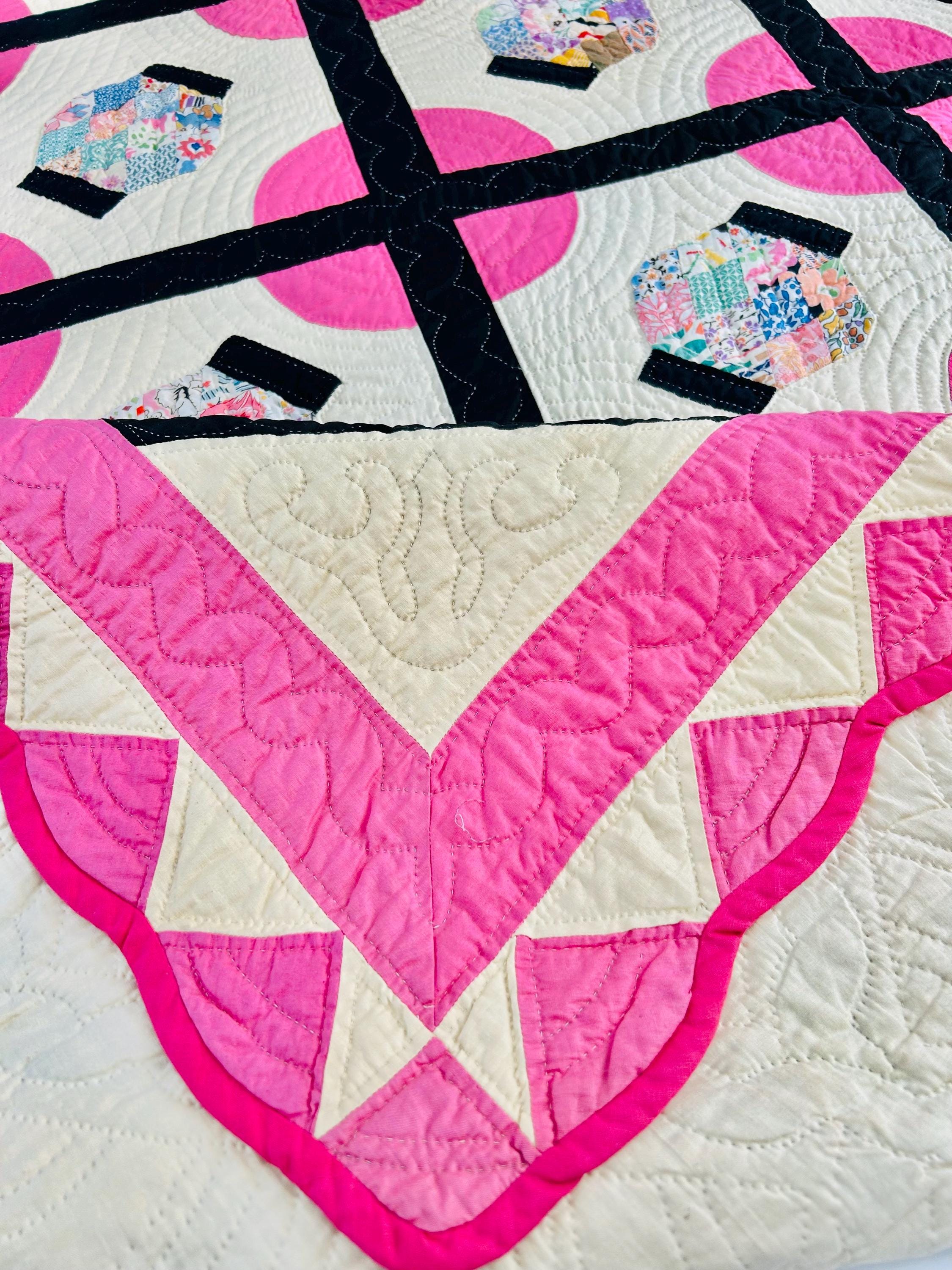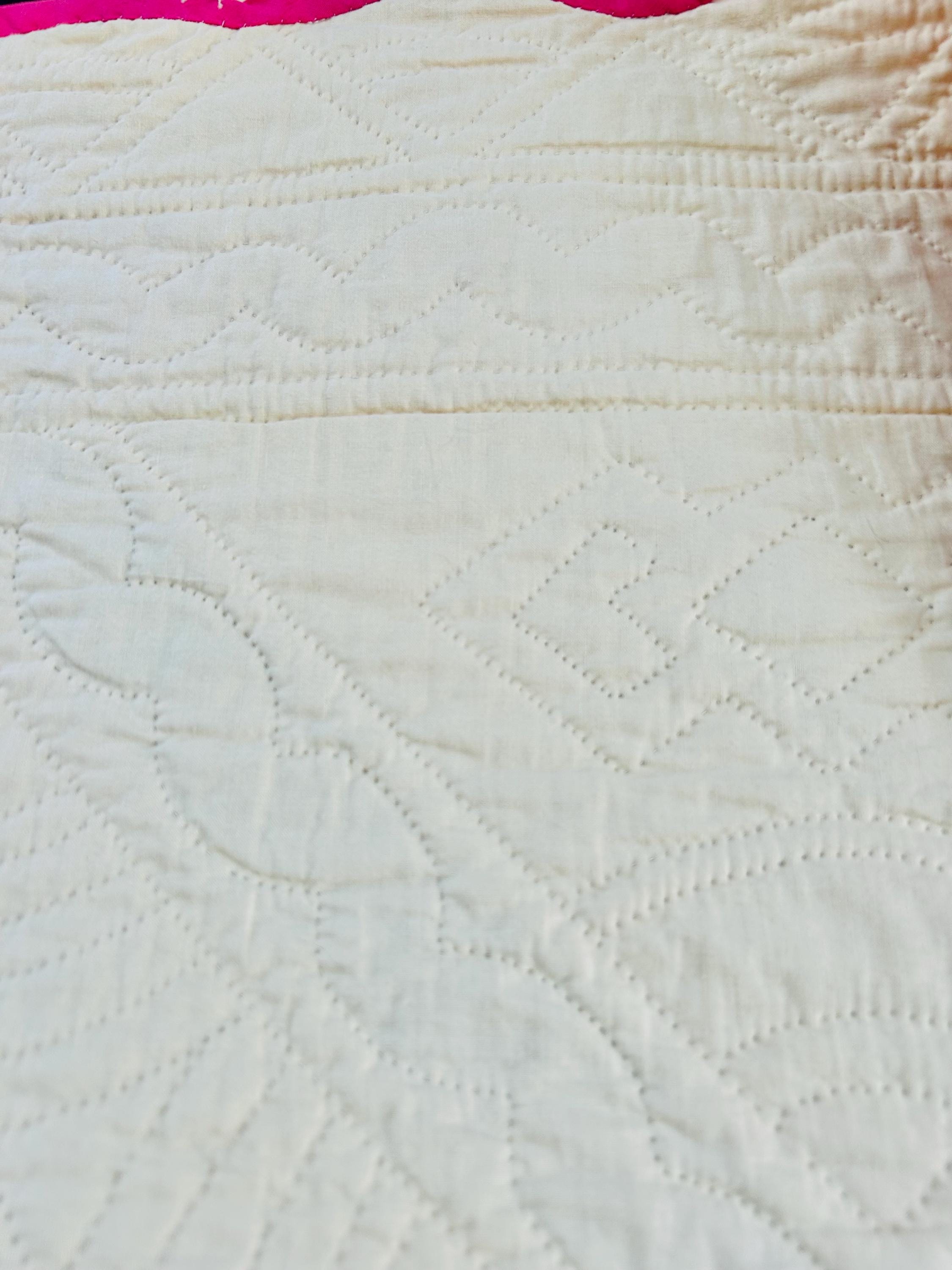 The back is a cream-white cotton back while the binding is pink cotton that has been machine stitched to the front and hand-stitched to the back. The batting is lightweight.