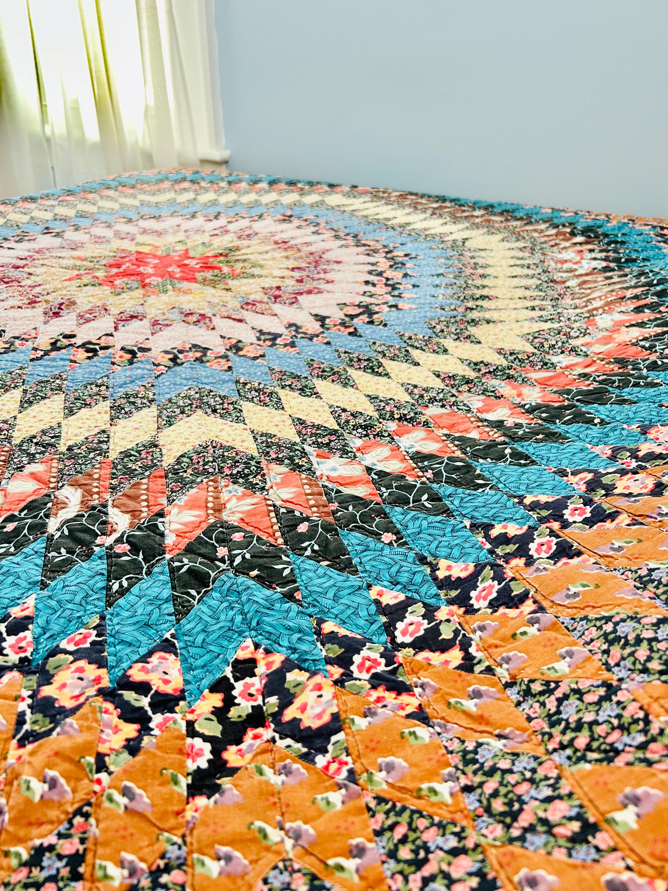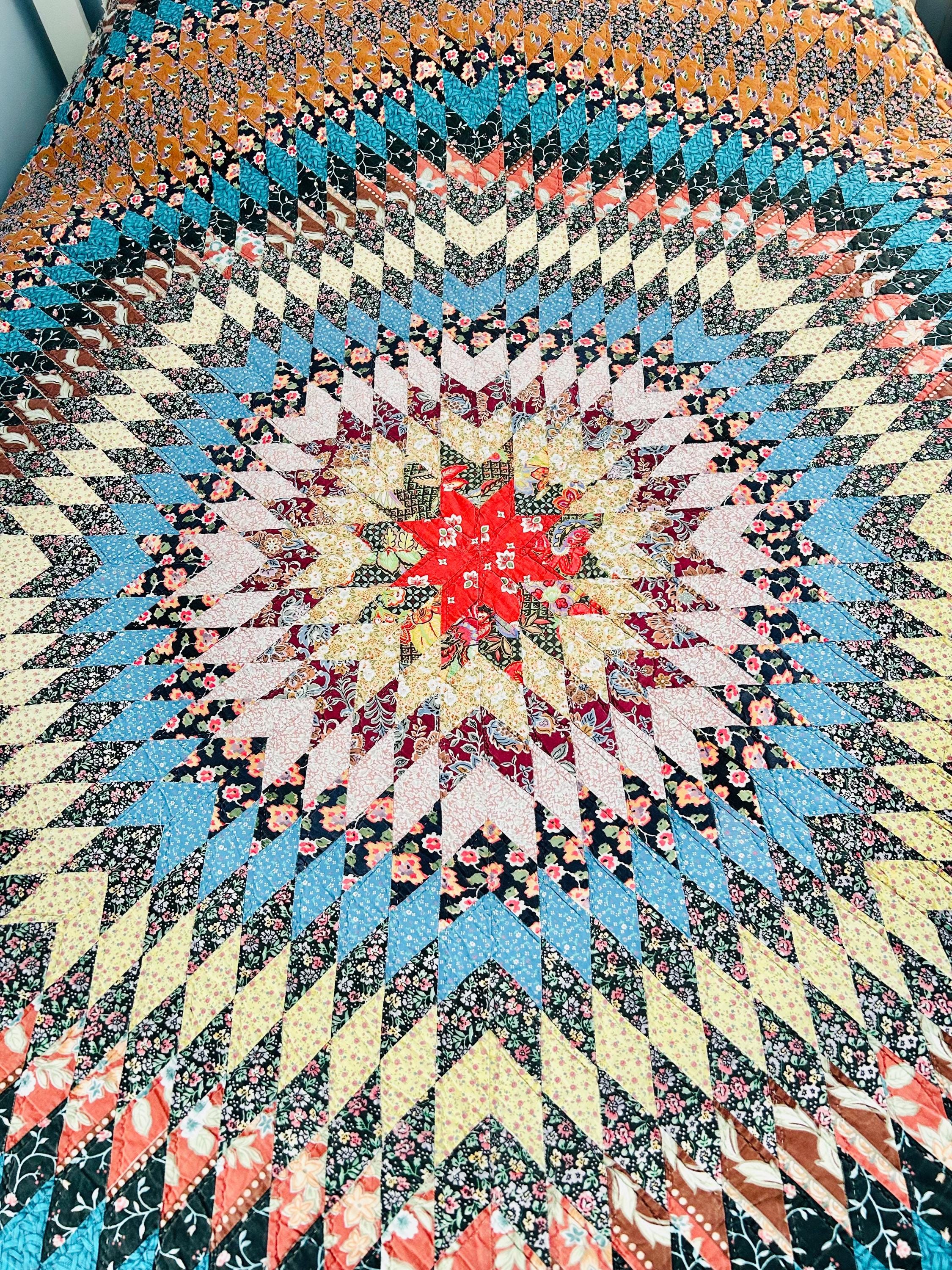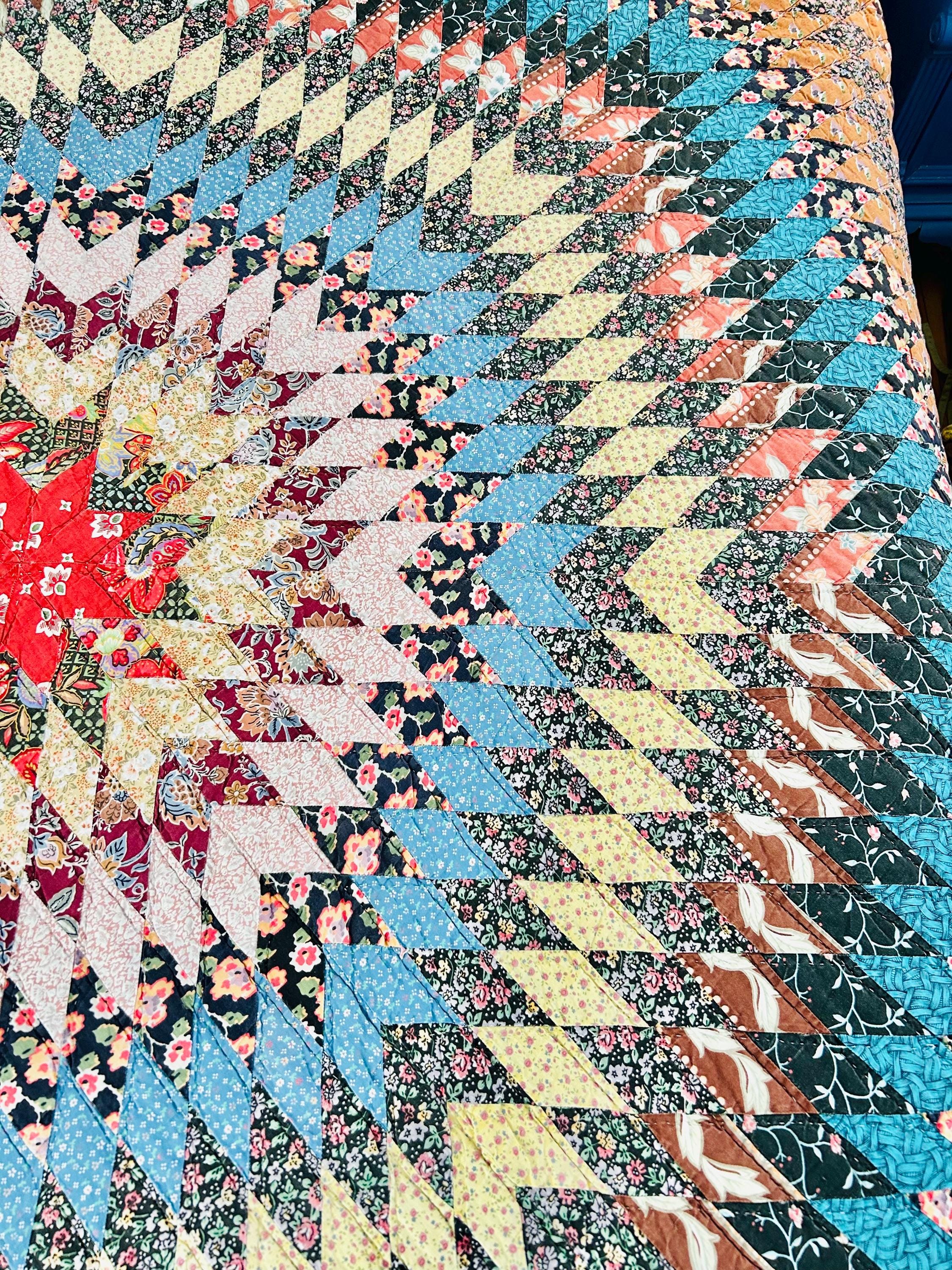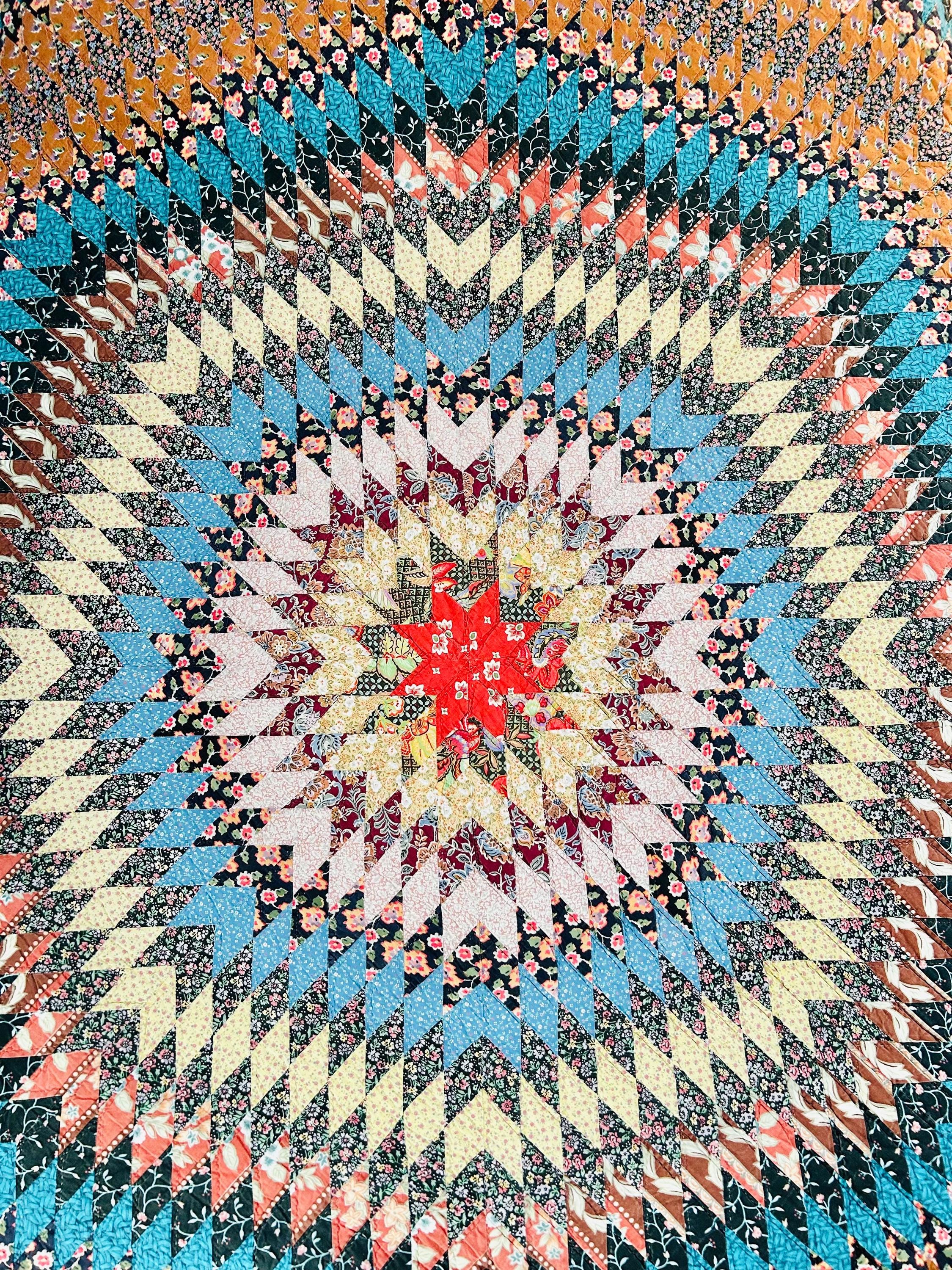 This stunning vintage Sunburst quilt, circa 1980s, features a central eight-pointed star that radiates into a kaleidoscope of diamonds all the way to its edges. It has been quilted in the outlines of the diamonds. The fabrics include: • Earth Tones: Rich terracotta, ochre, and warm tan. • Jewel Tones: Deep teal, forest green, and a vibrant poppy red center. • Victorian Revival Prints: Delicate calico florals and "cracked ice" patterns.