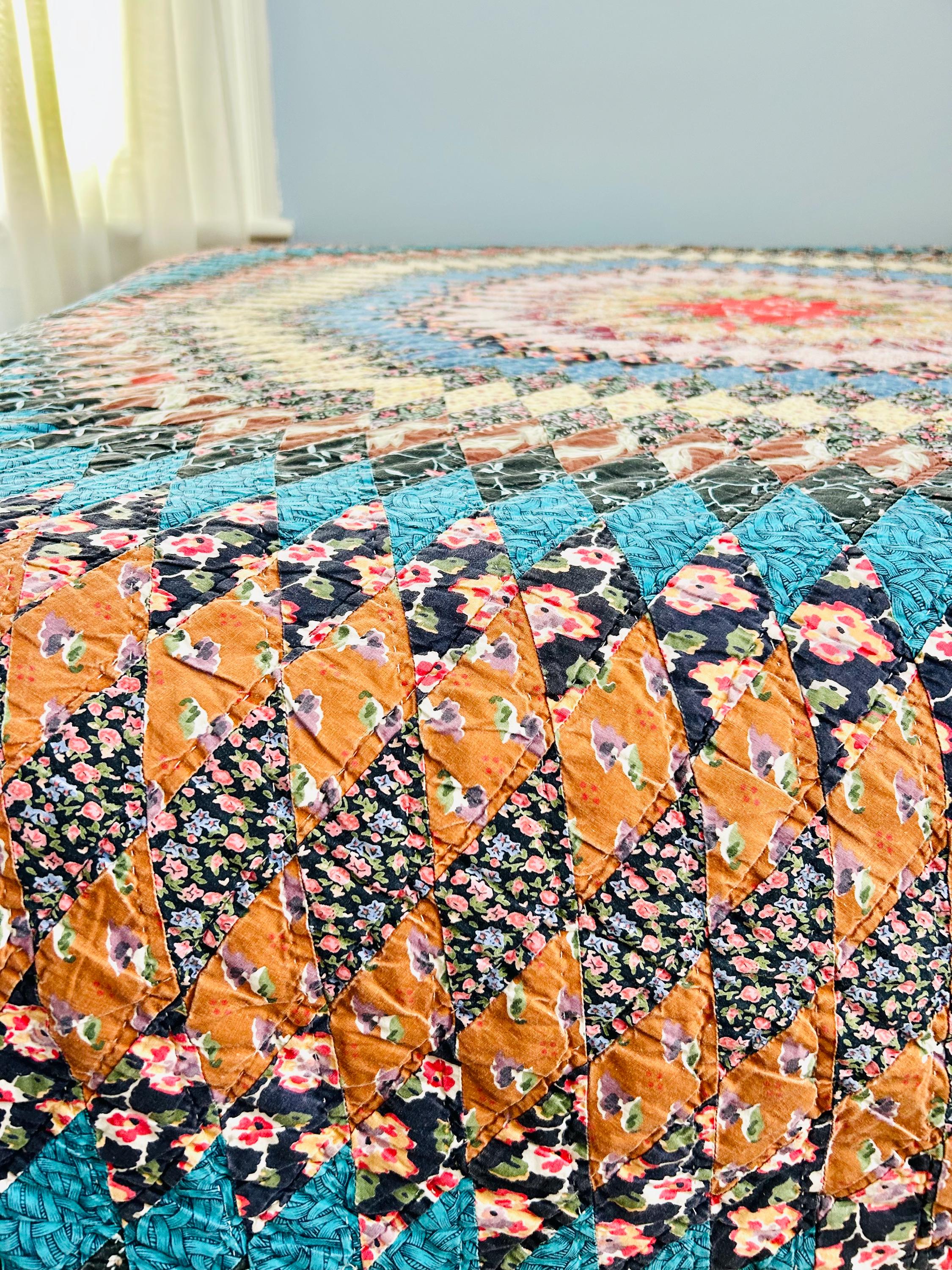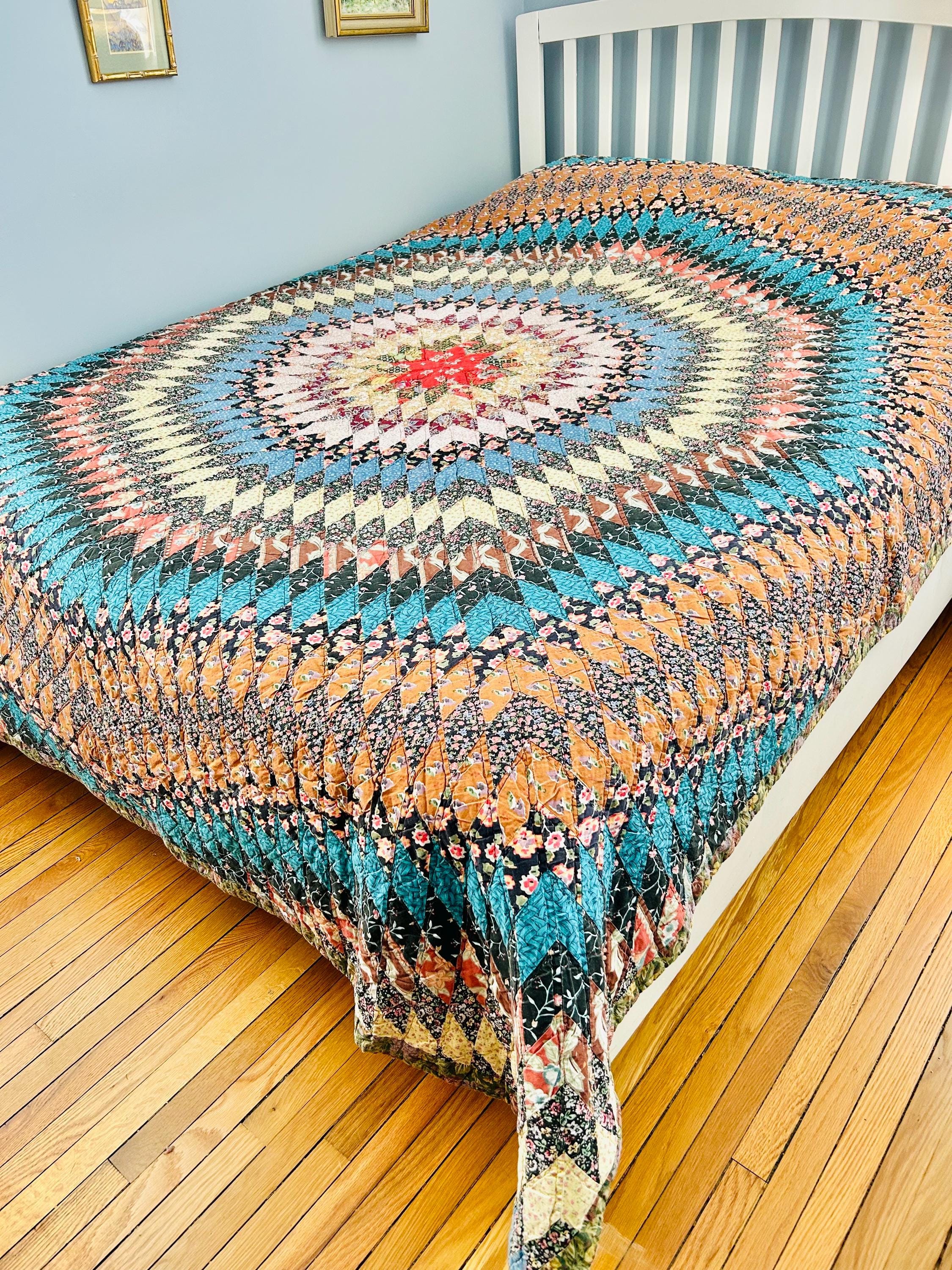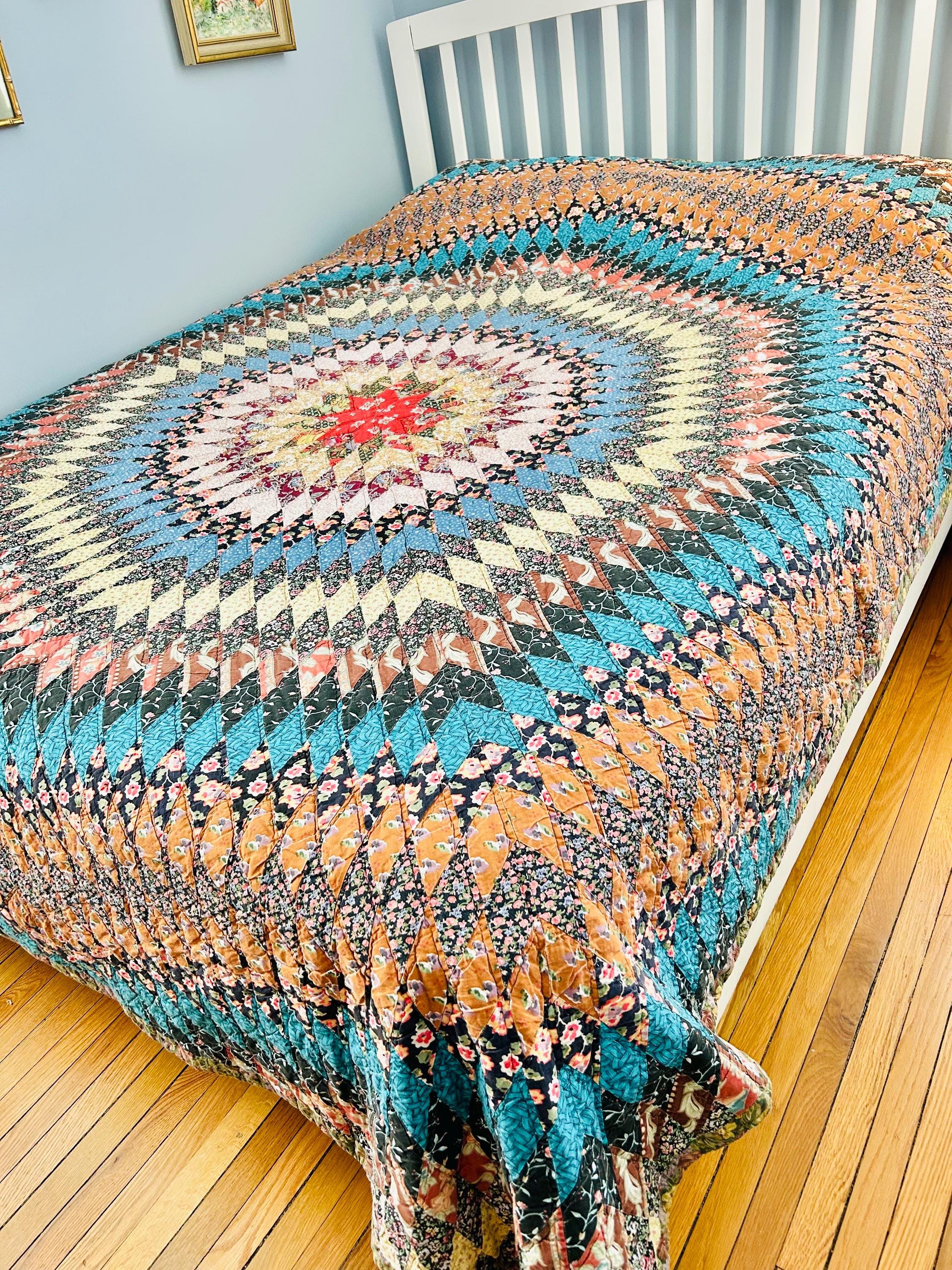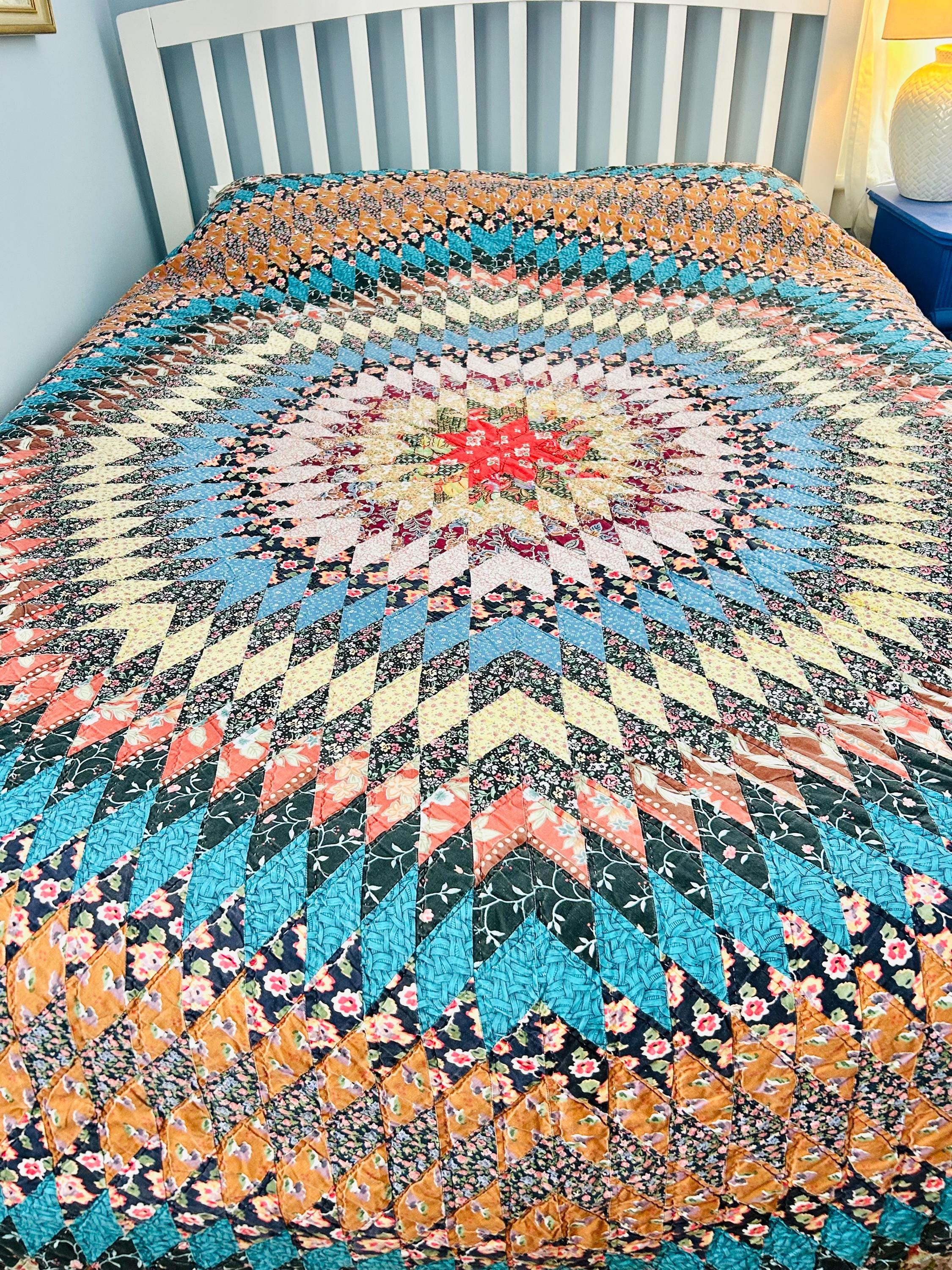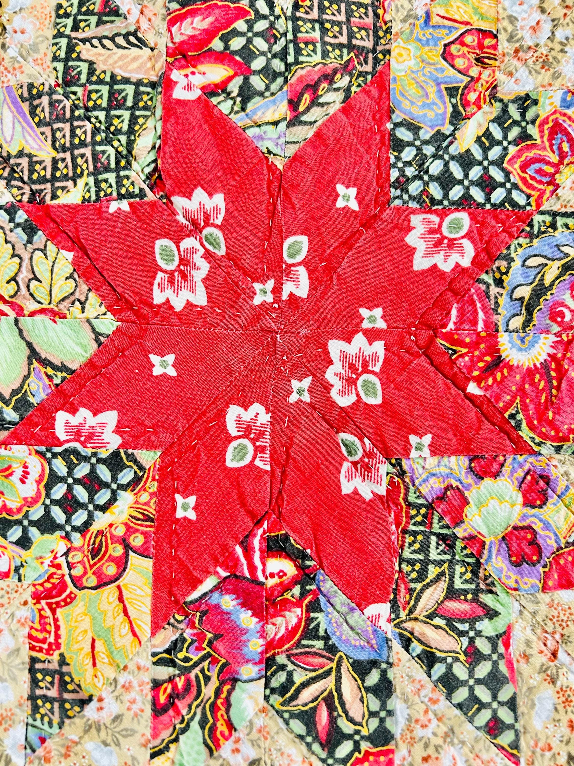 This stunning vintage Sunburst quilt, circa 1980s, features a central eight-pointed star that radiates into a kaleidoscope of diamonds all the way to its edges. It has been quilted in the outlines of the diamonds. The fabrics include: • Earth Tones: Rich terracotta, ochre, and warm tan. • Jewel Tones: Deep teal, forest green, and a vibrant poppy red center. • Victorian Revival Prints: Delicate calico florals and "cracked ice" patterns.