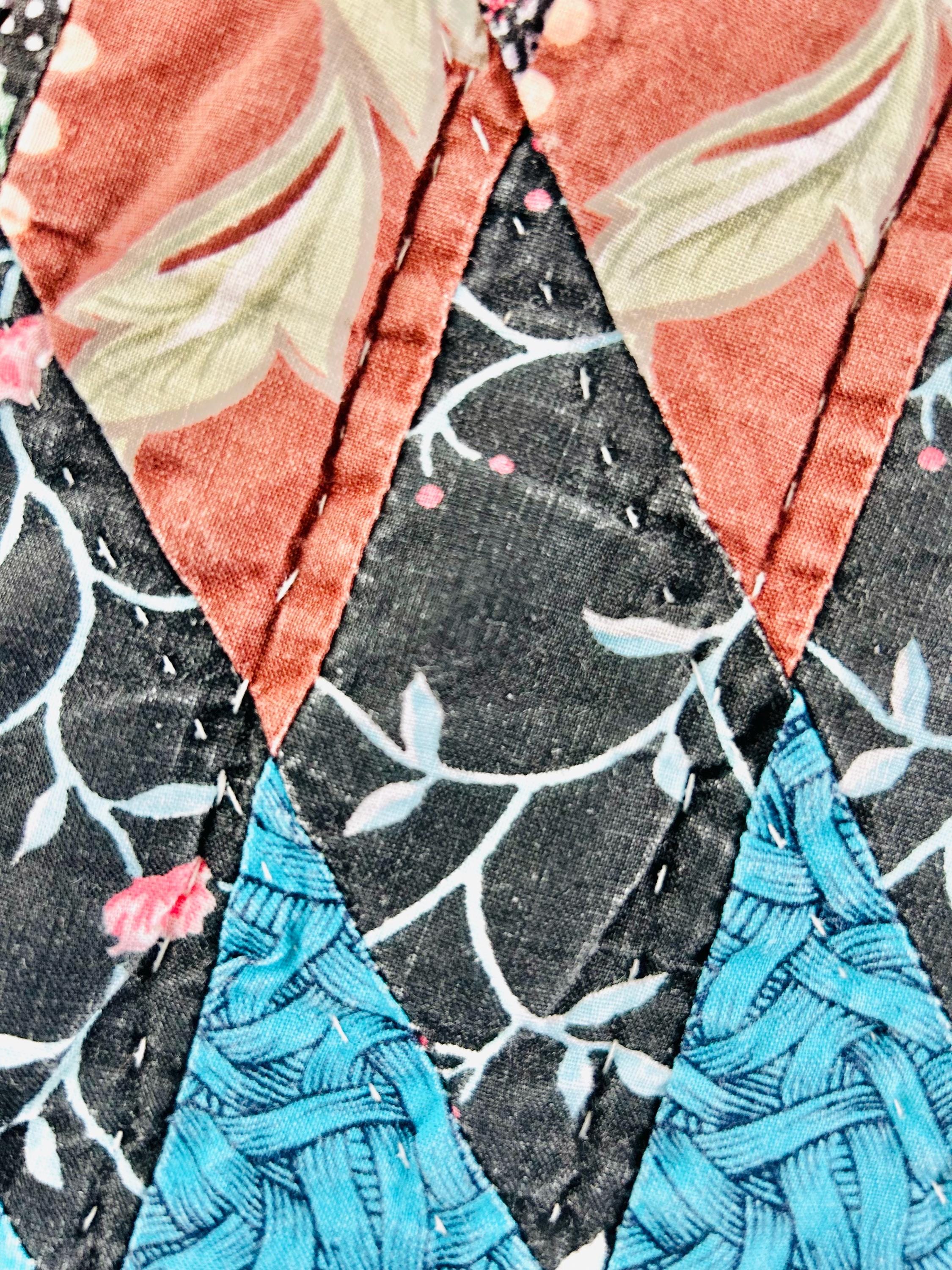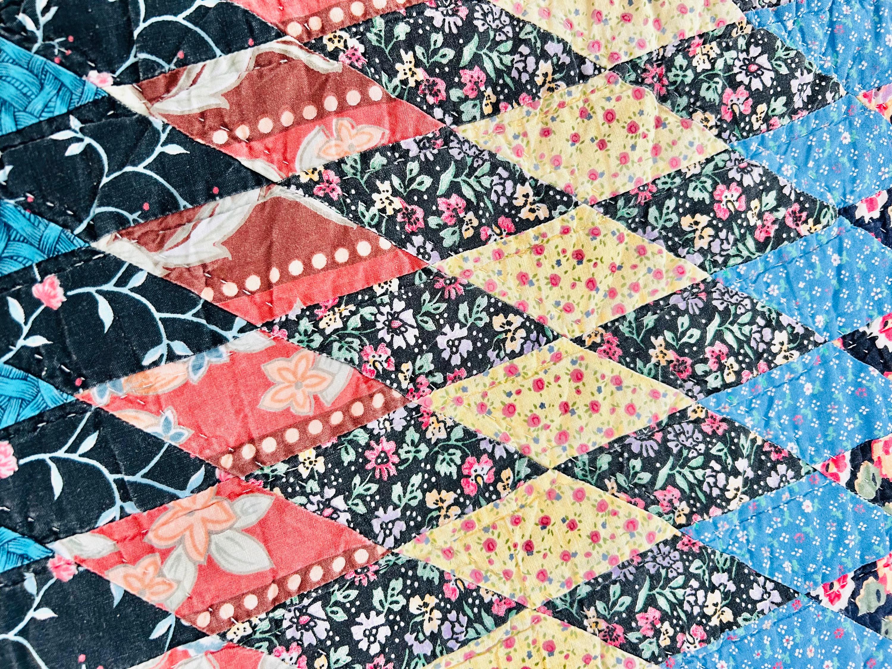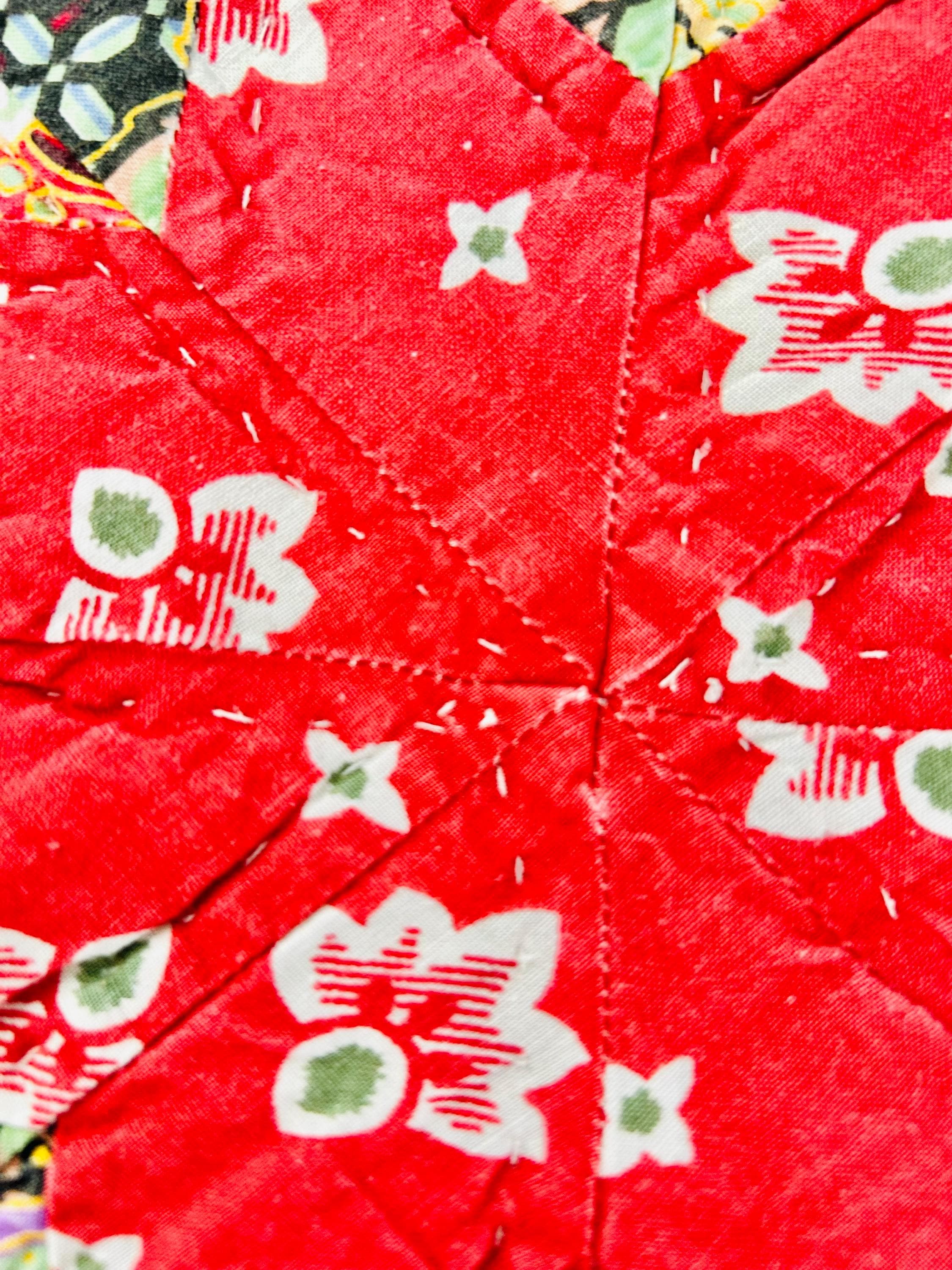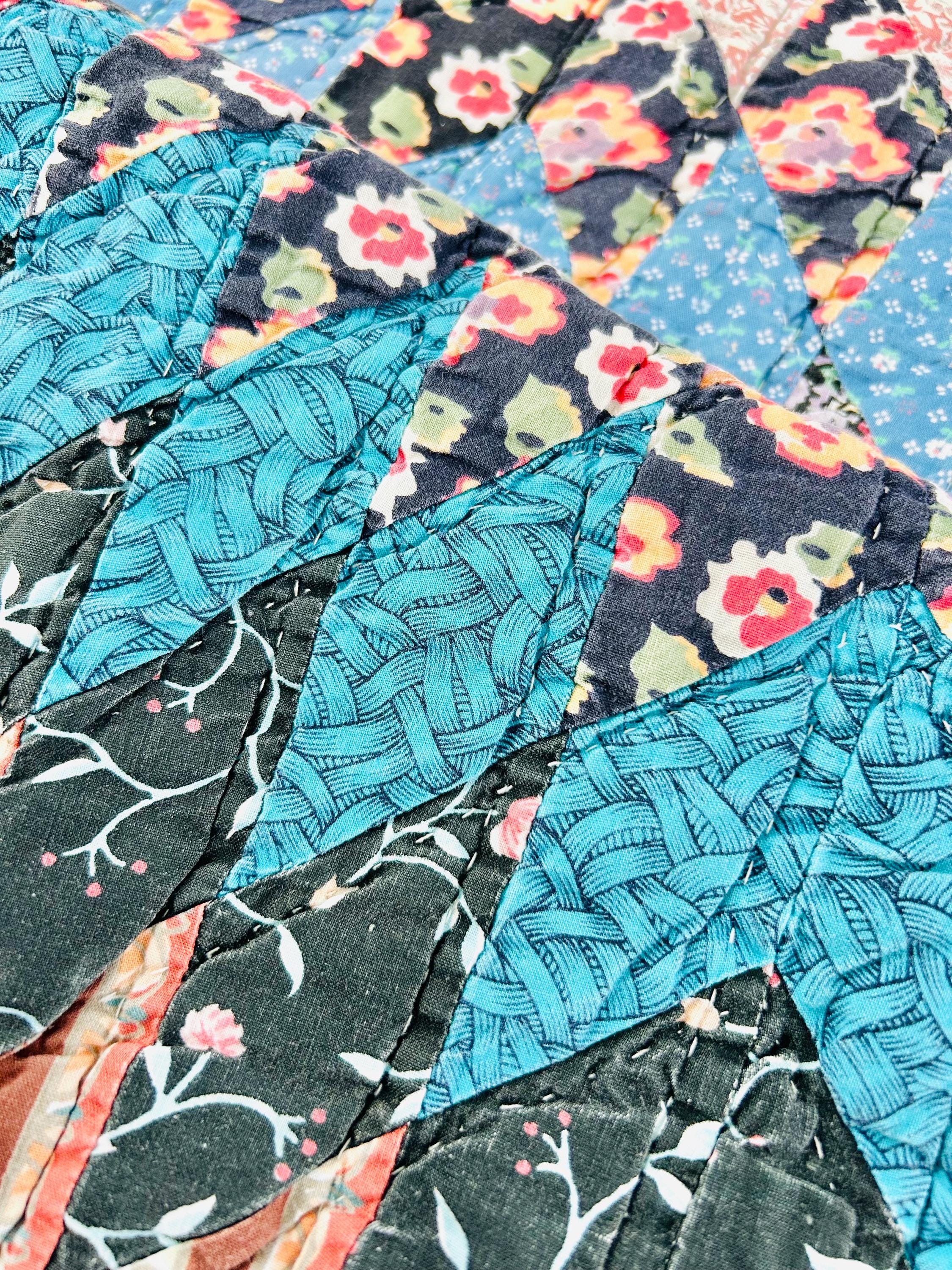 This stunning vintage Sunburst quilt, circa 1980s, features a central eight-pointed star that radiates into a kaleidoscope of diamonds all the way to its edges. It has been quilted in the outlines of the diamonds. The fabrics include: • Earth Tones: Rich terracotta, ochre, and warm tan. • Jewel Tones: Deep teal, forest green, and a vibrant poppy red center. • Victorian Revival Prints: Delicate calico florals and "cracked ice" patterns.