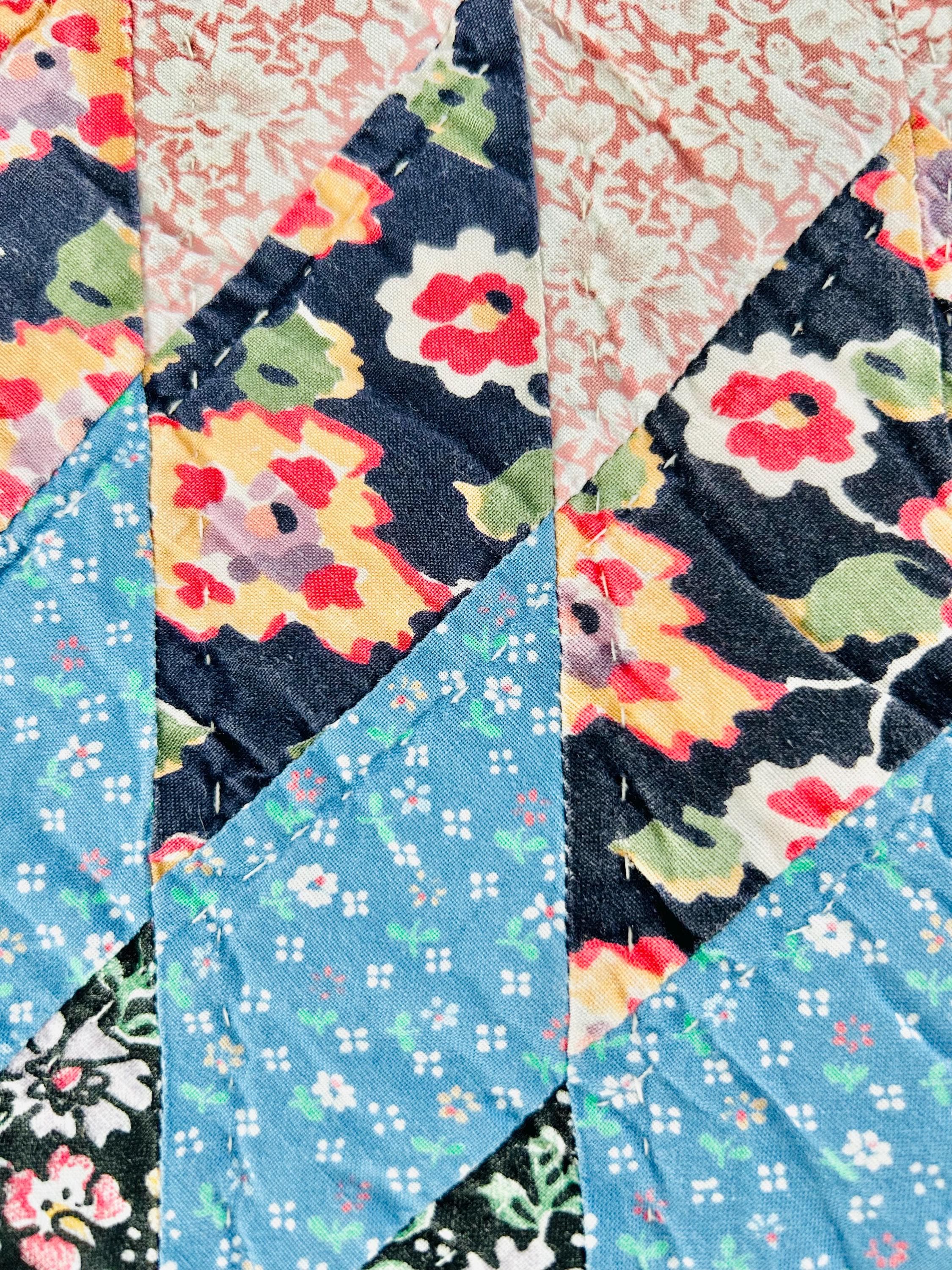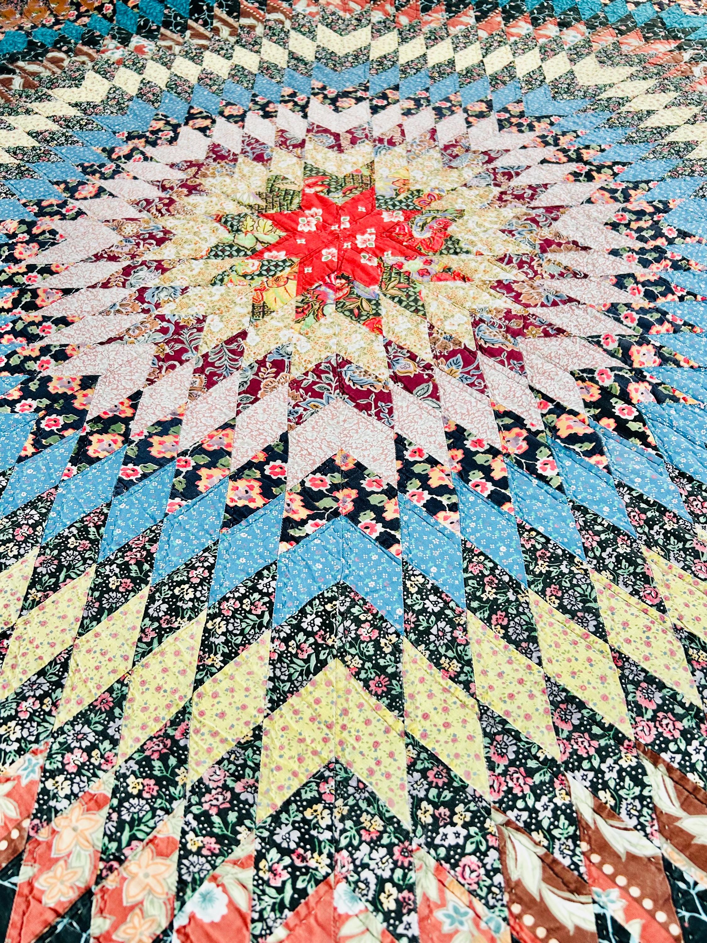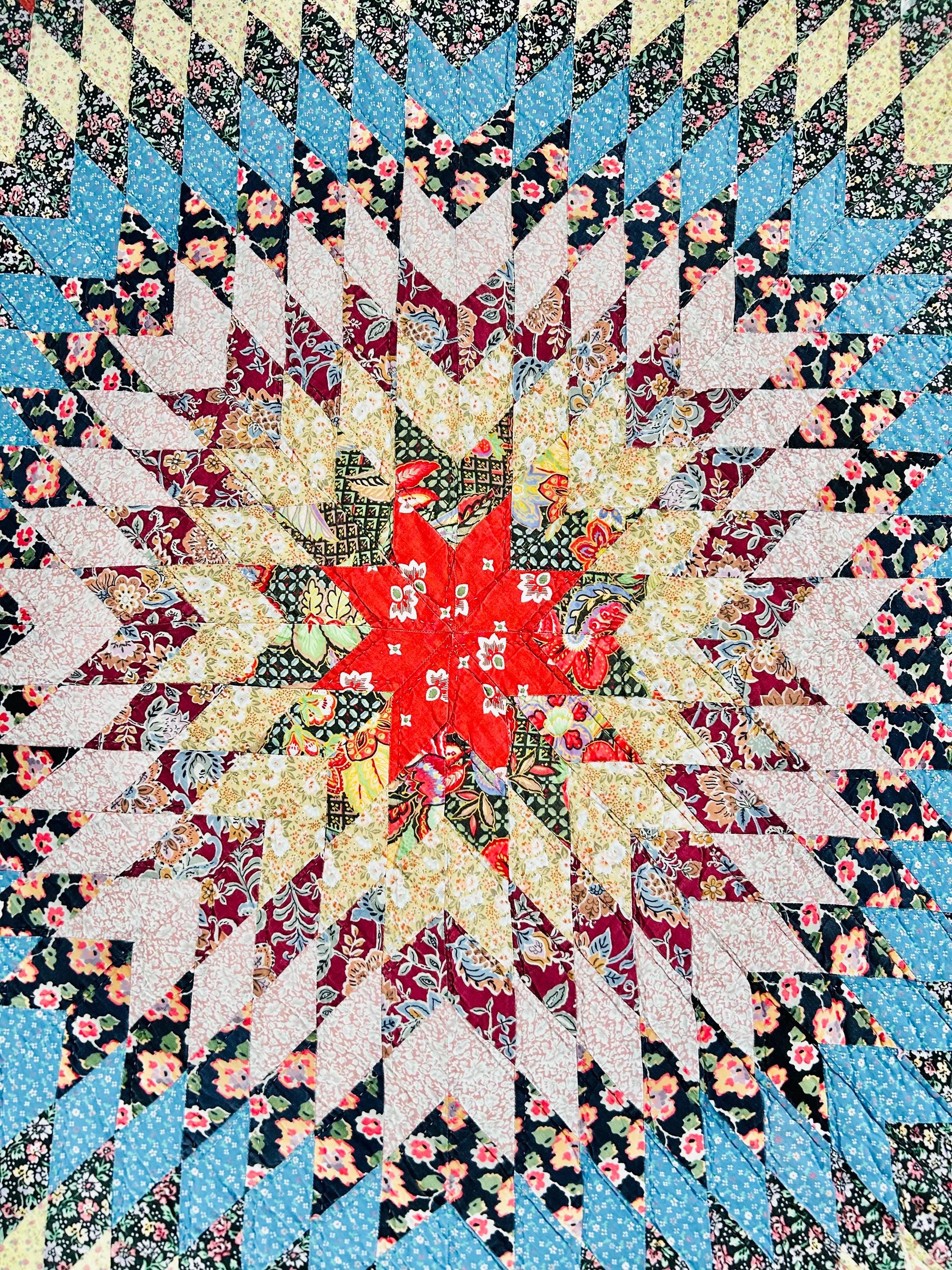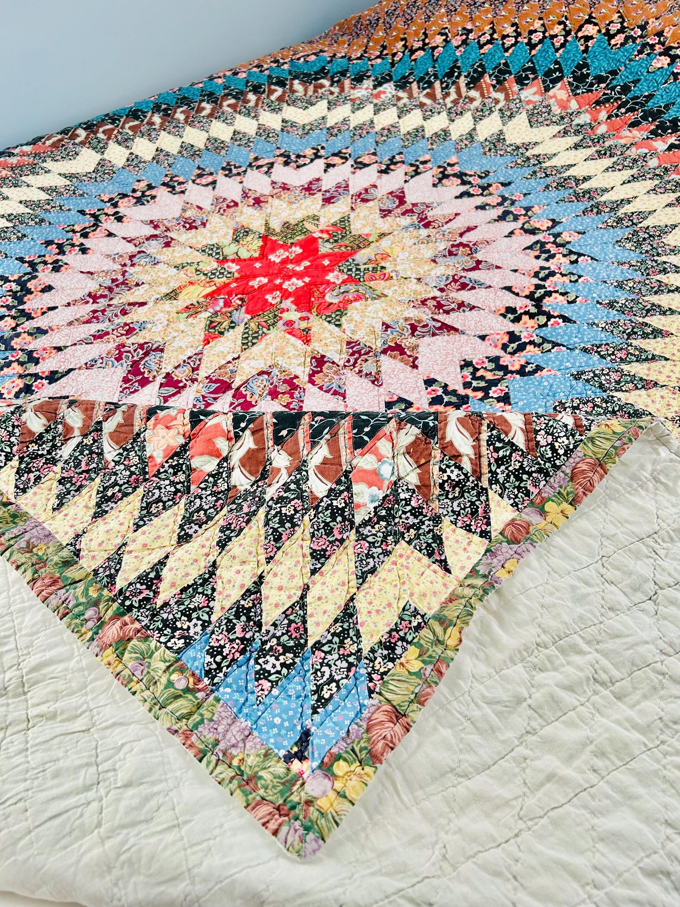 Details: • Construction: Hand-Pieced, Hand-Quilted: • Pattern: Sunburst. • Materials: Cotton fabrics with lightweight batting • Dimensions: Approximately 81” x 94” (Ideal for a Full or Queen size bed). • Age: Circa 1980s
