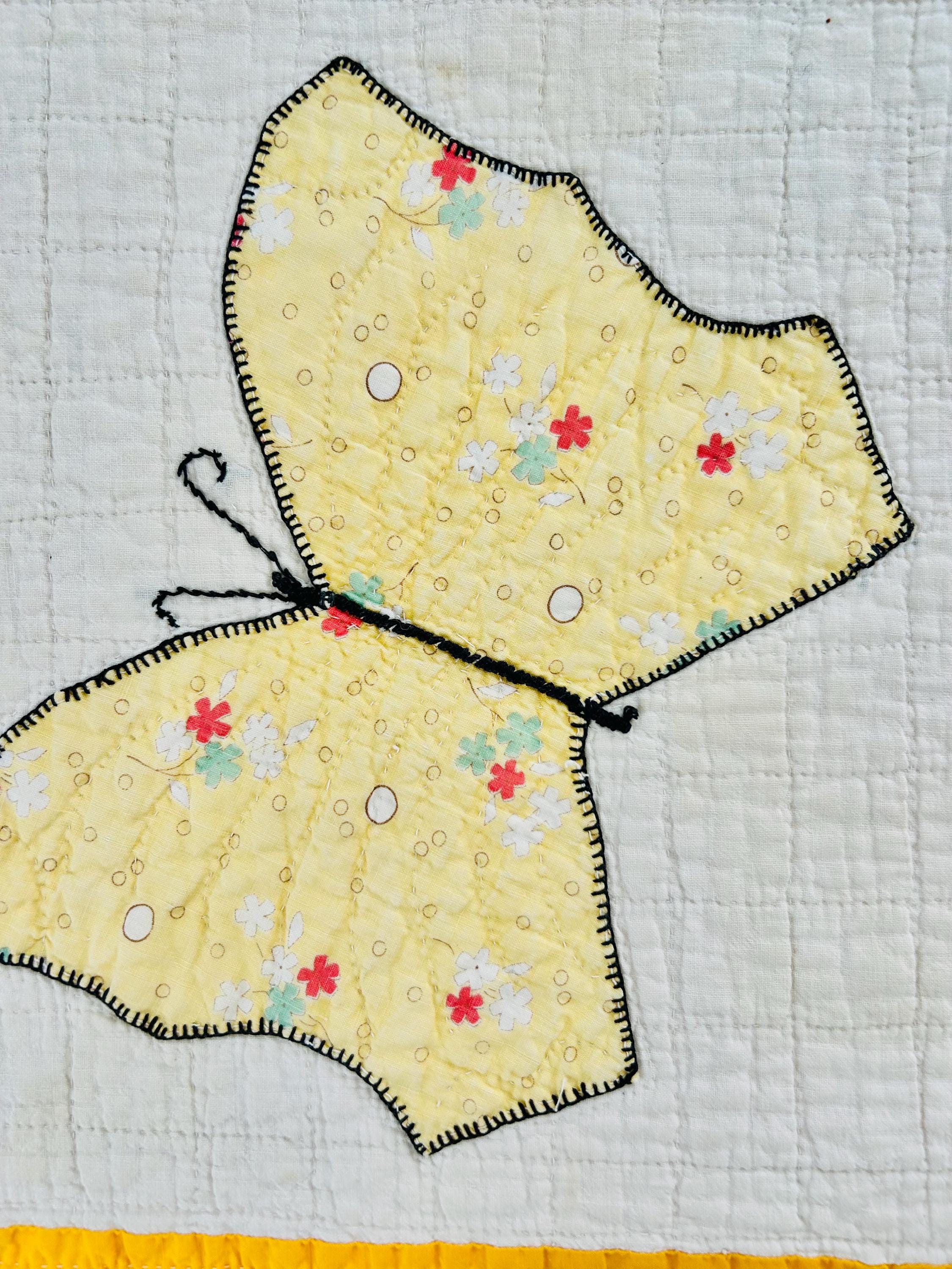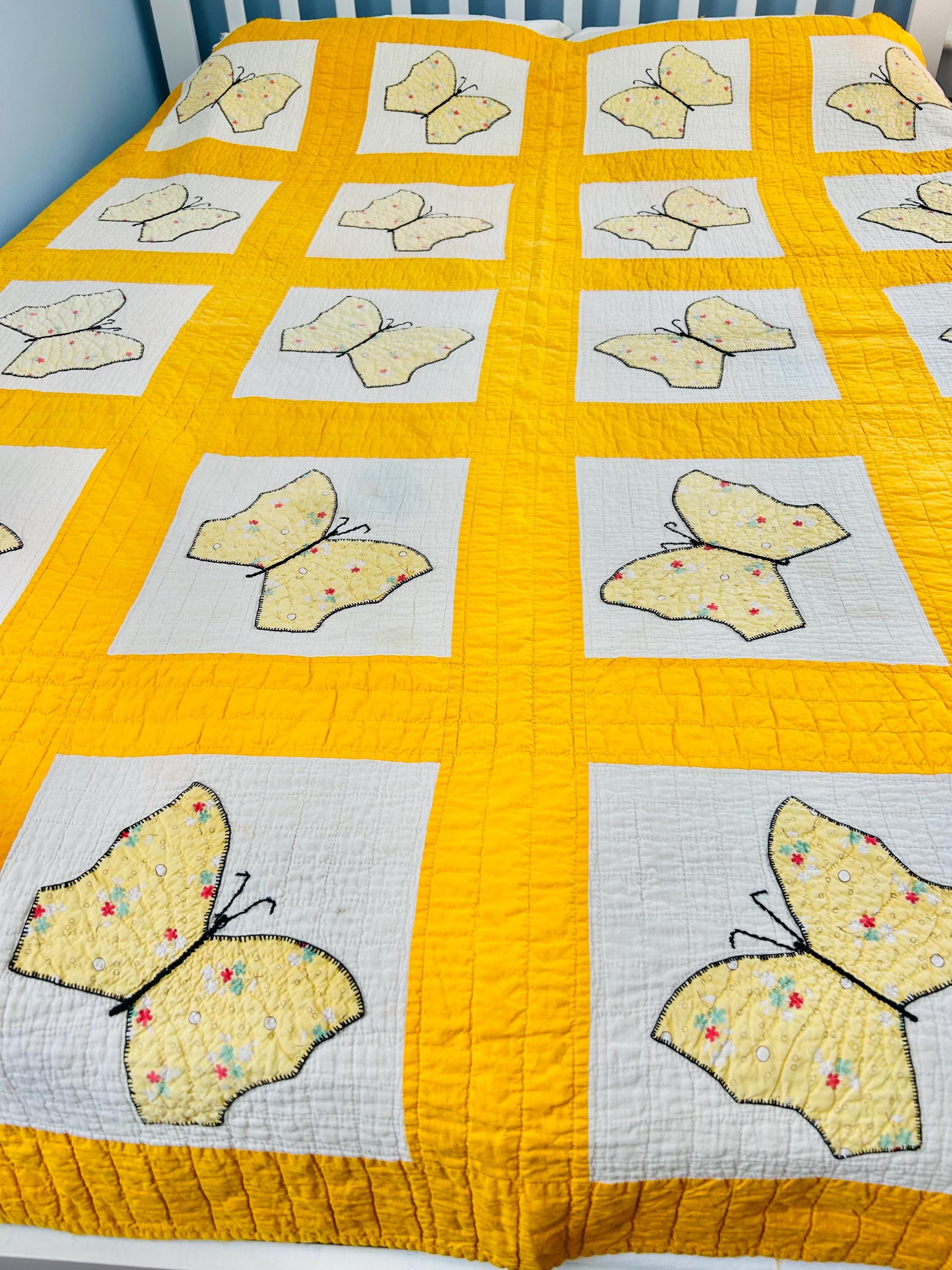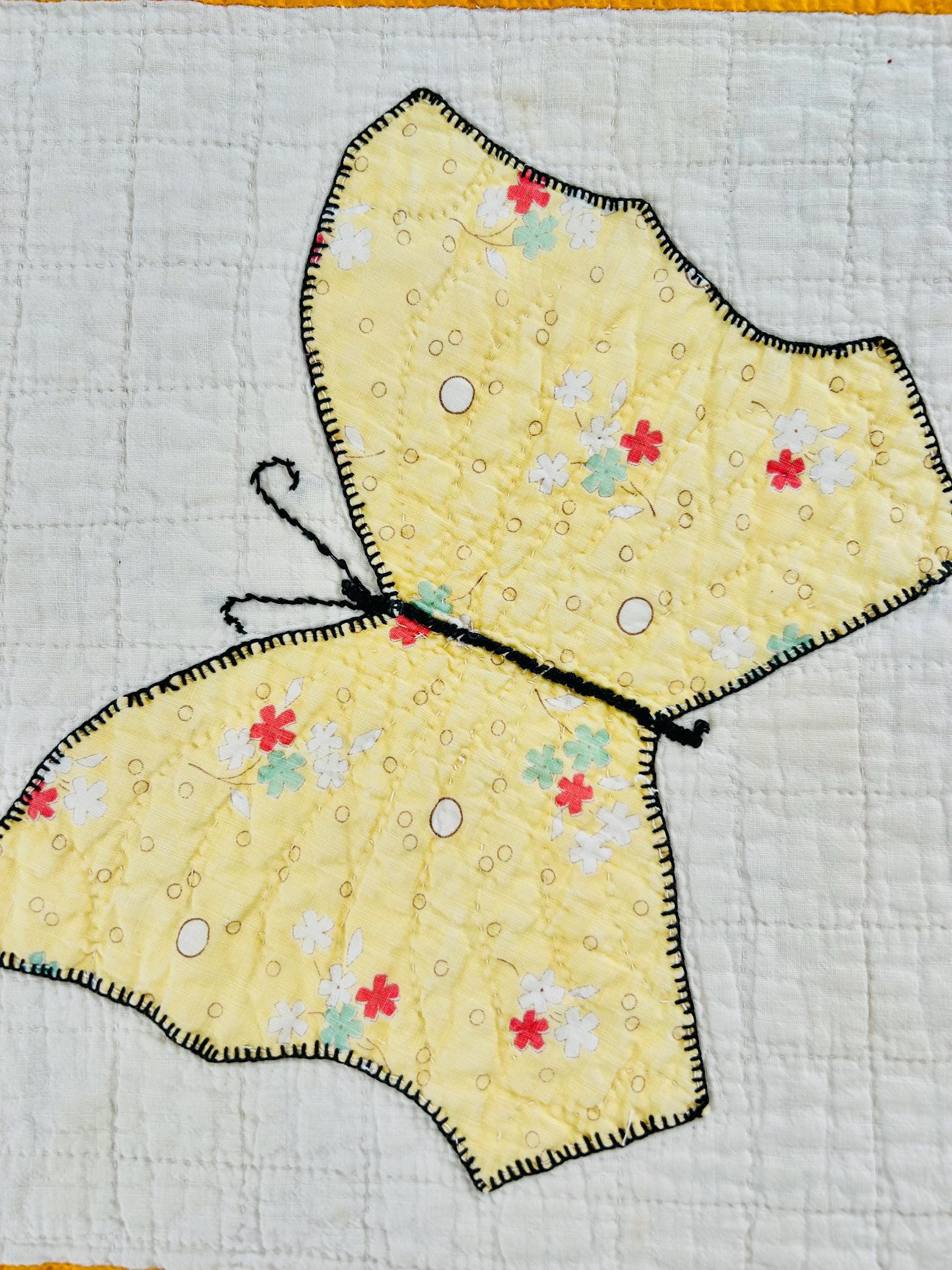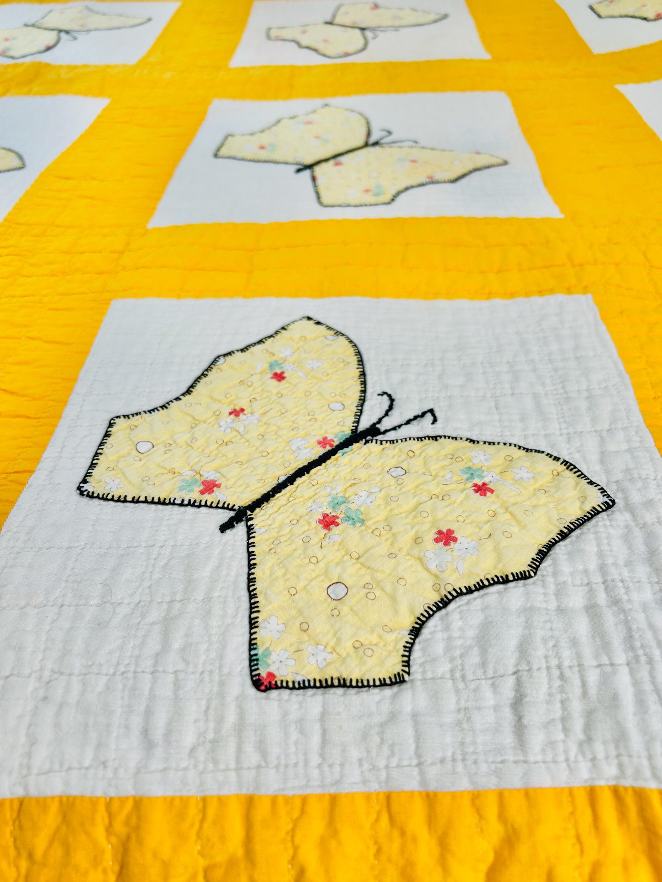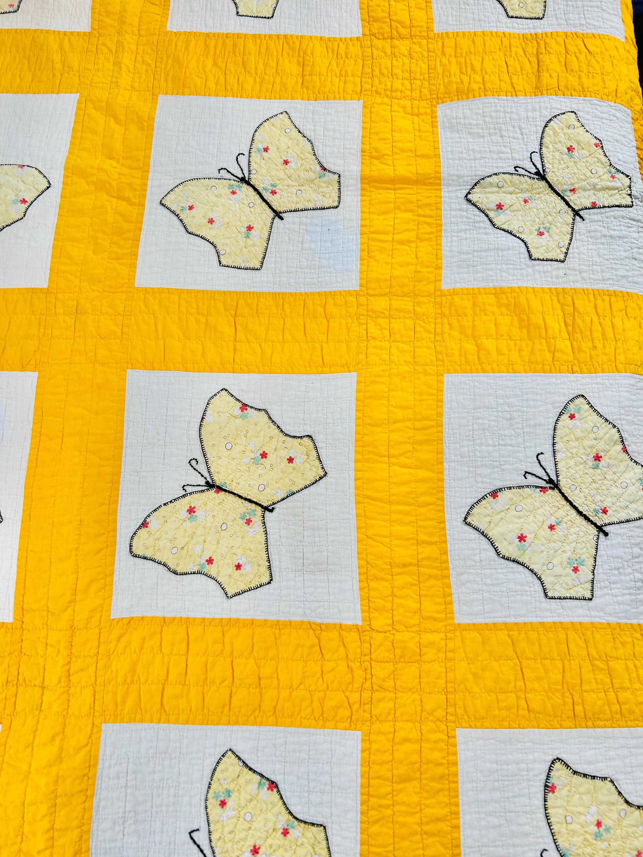 Details • Type: Vintage hand-appliquéd quilt • Era: 1930s–1940s • Size: 63” wide x 84” long • Pattern / Motif: Butterfly appliqué in a block grid layout • Top Fabric: Vintage cottons • Batting: Lightweight cotton • Backing: Bright white cotton • Construction: Hand appliquéd and hand quilted • Colors: Yellow, white, black, red, soft green