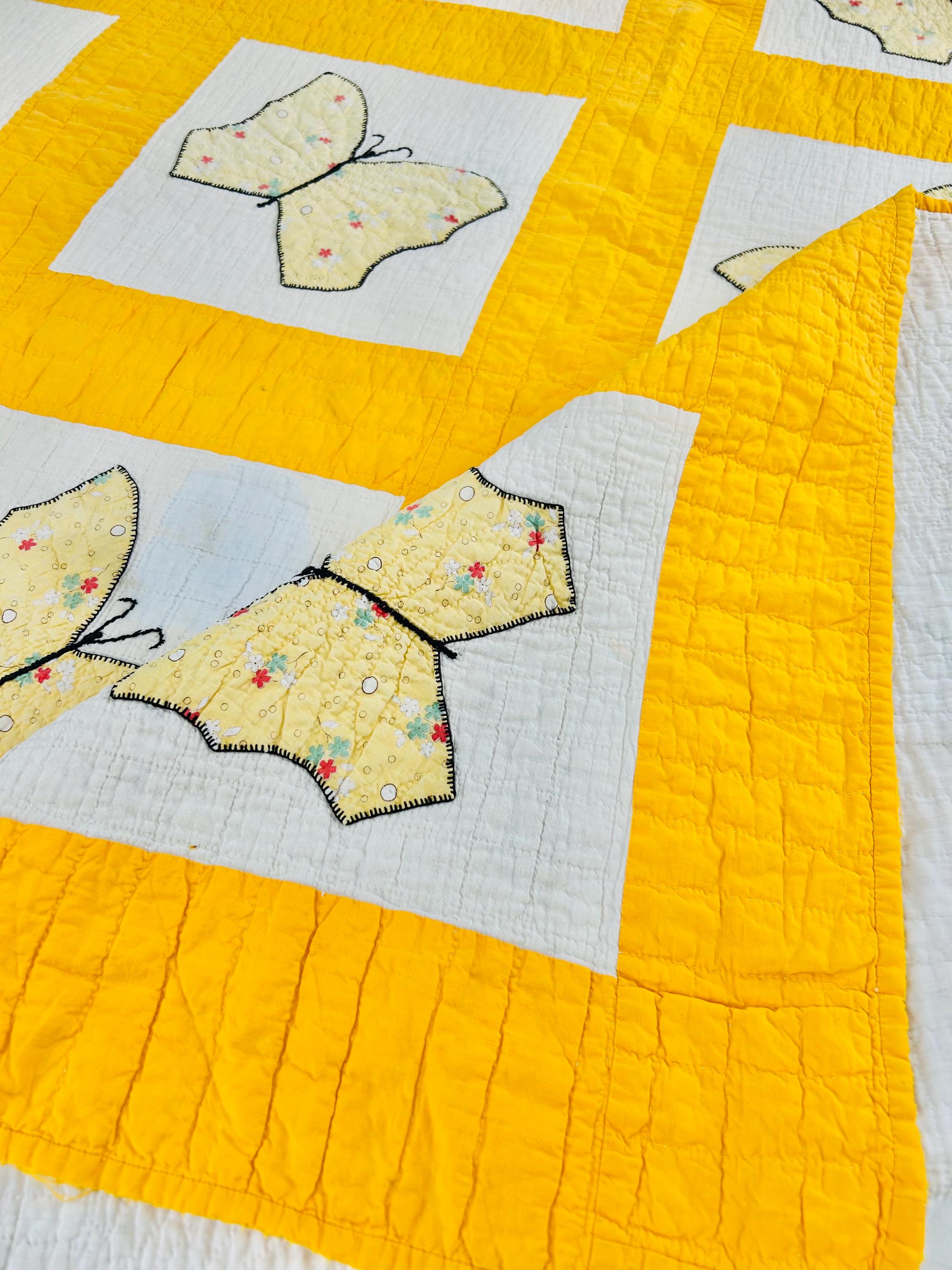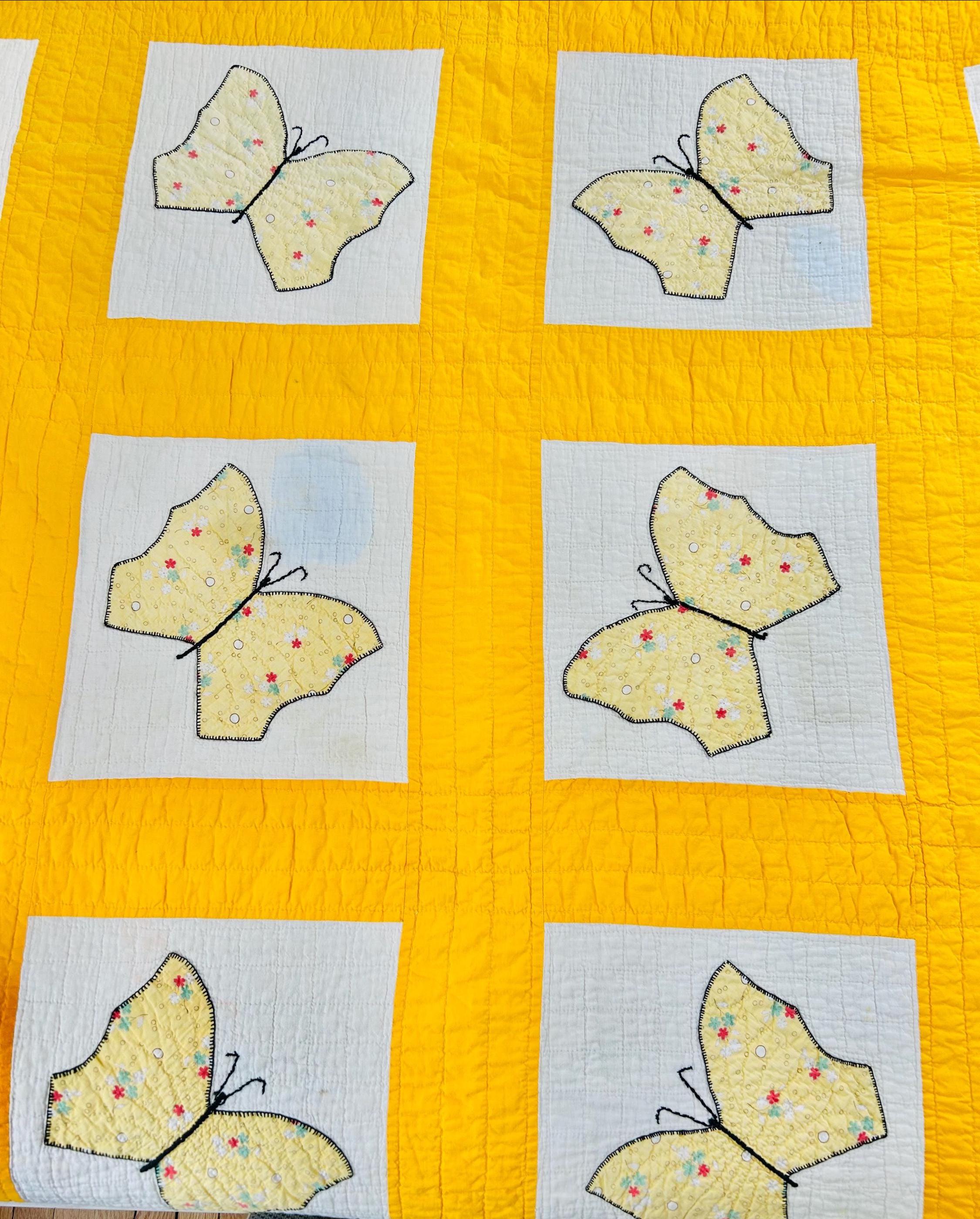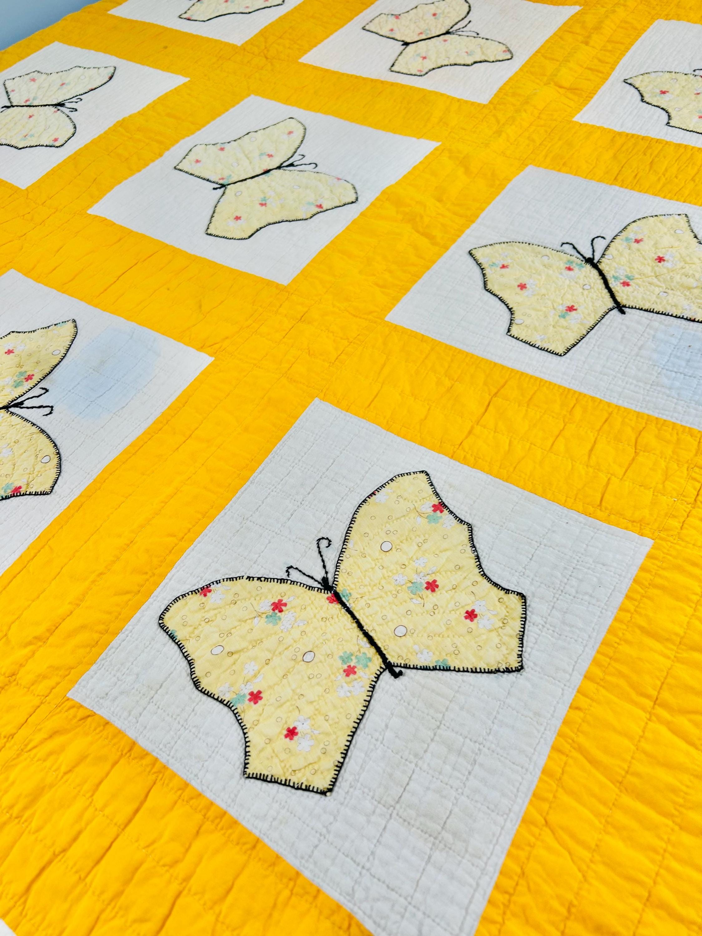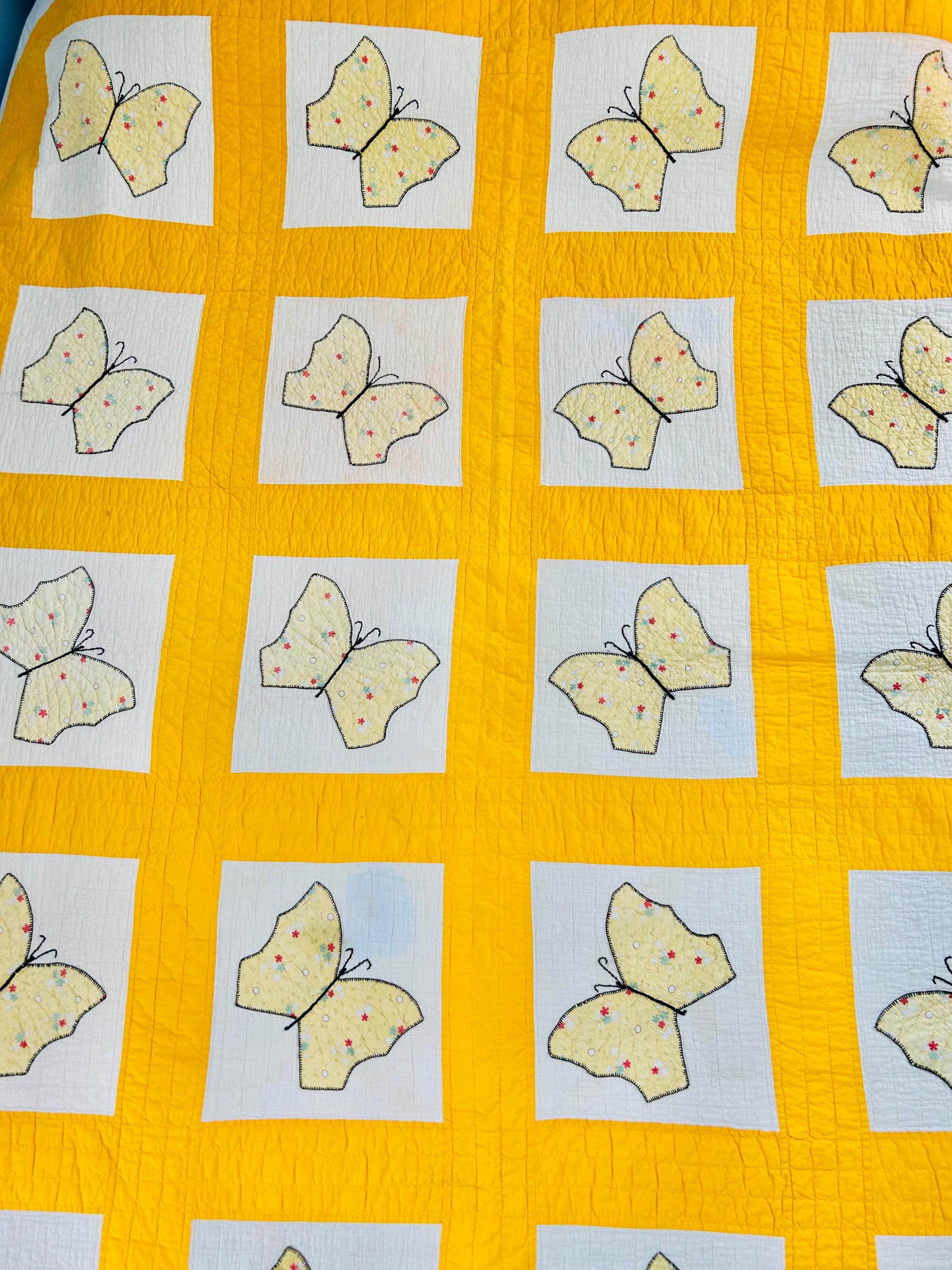 Details • Type: Vintage hand-appliquéd quilt • Era: 1930s–1940s • Size: 63” wide x 84” long • Pattern / Motif: Butterfly appliqué in a block grid layout • Top Fabric: Vintage cottons • Batting: Lightweight cotton • Backing: Bright white cotton • Construction: Hand appliquéd and hand quilted • Colors: Yellow, white, black, red, soft green