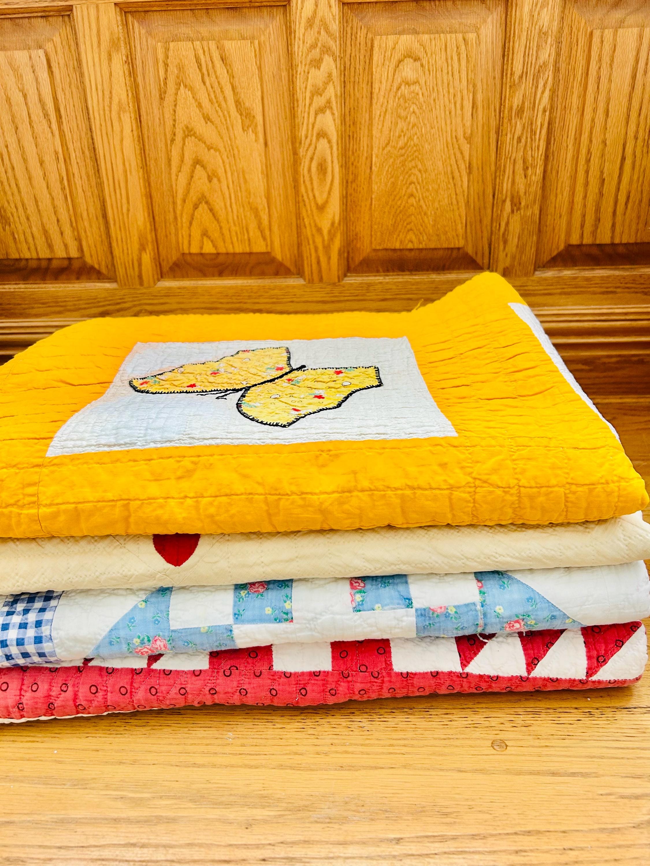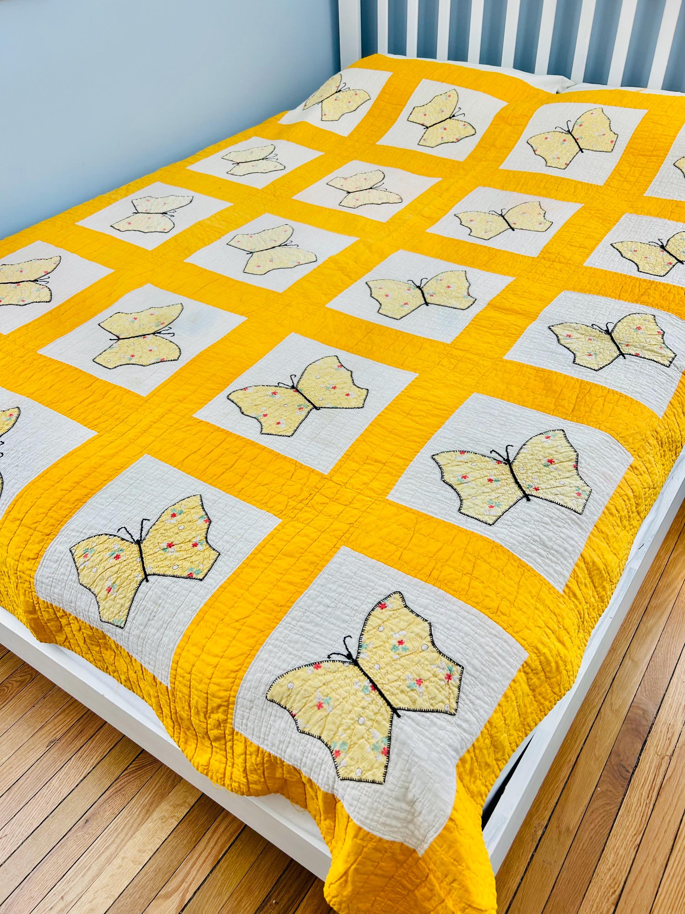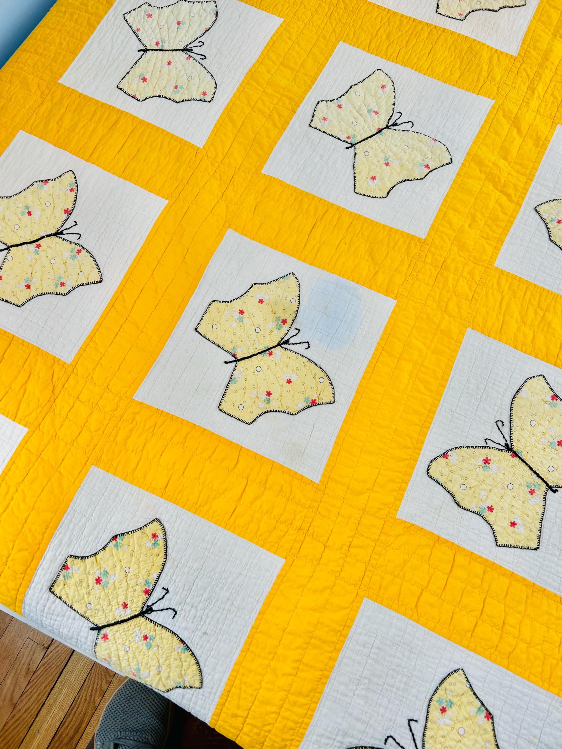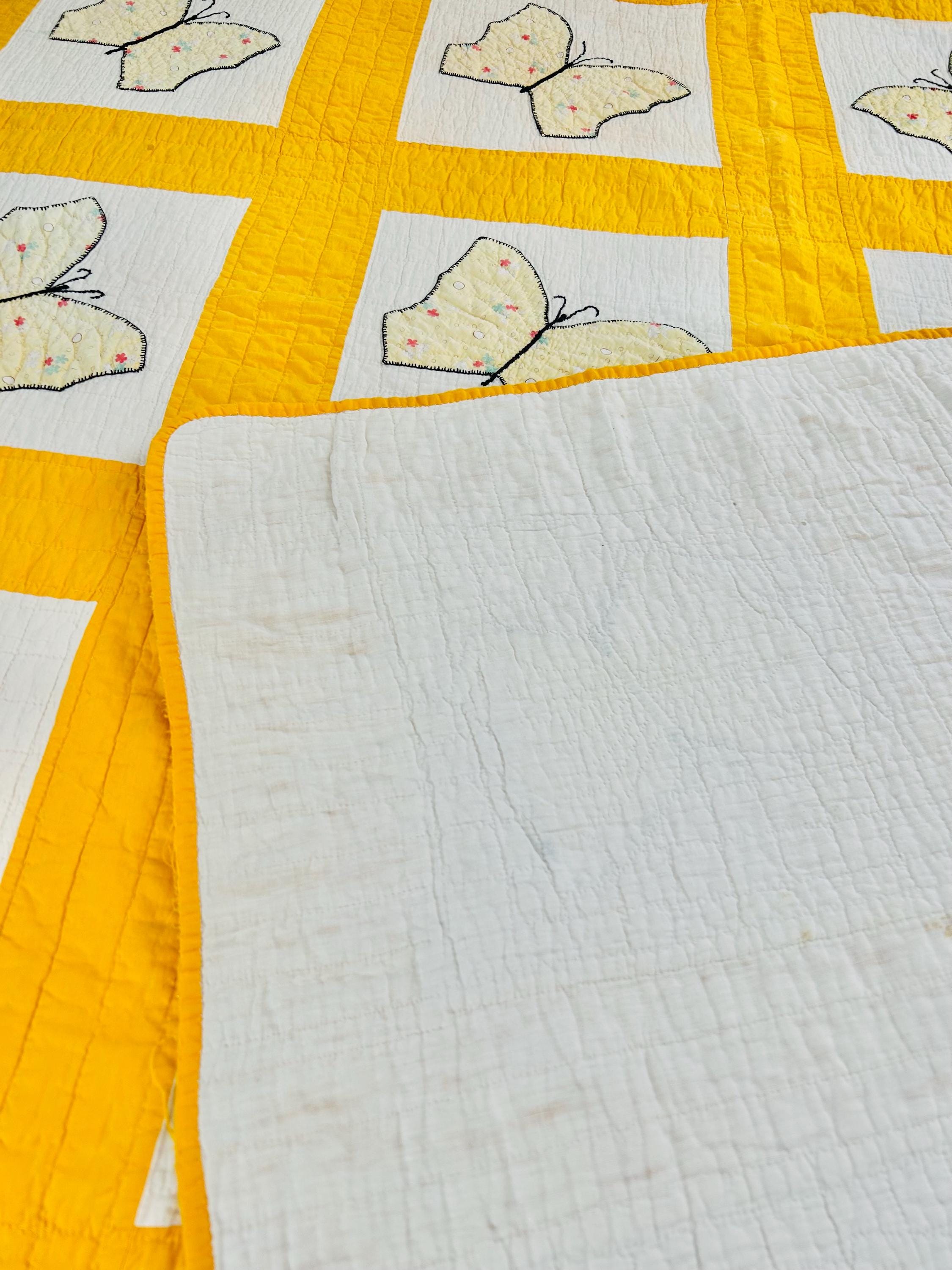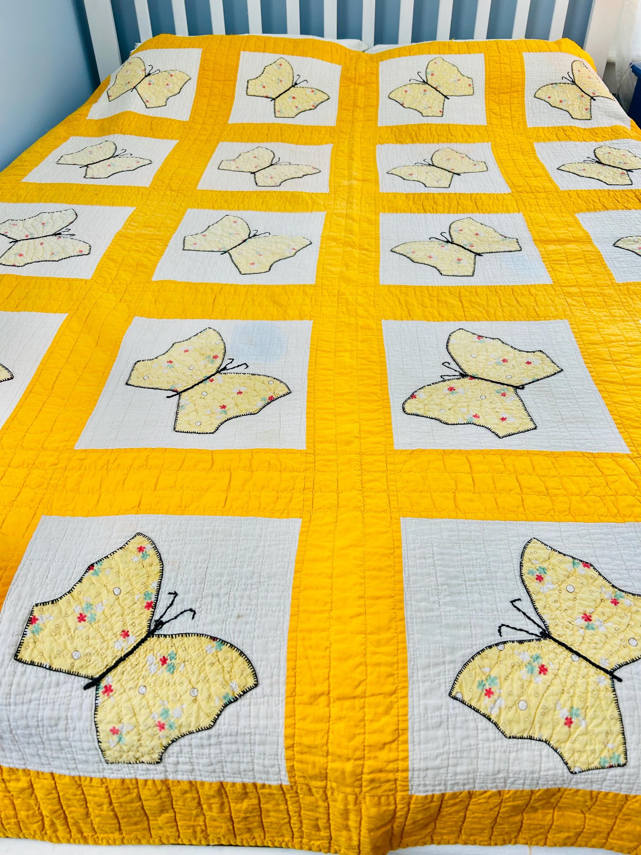 Details • Type: Vintage hand-appliquéd quilt • Era: 1930s–1940s • Size: 63” wide x 84” long • Pattern / Motif: Butterfly appliqué in a block grid layout • Top Fabric: Vintage cottons • Batting: Lightweight cotton • Backing: Bright white cotton • Construction: Hand appliquéd and hand quilted • Colors: Yellow, white, black, red, soft green