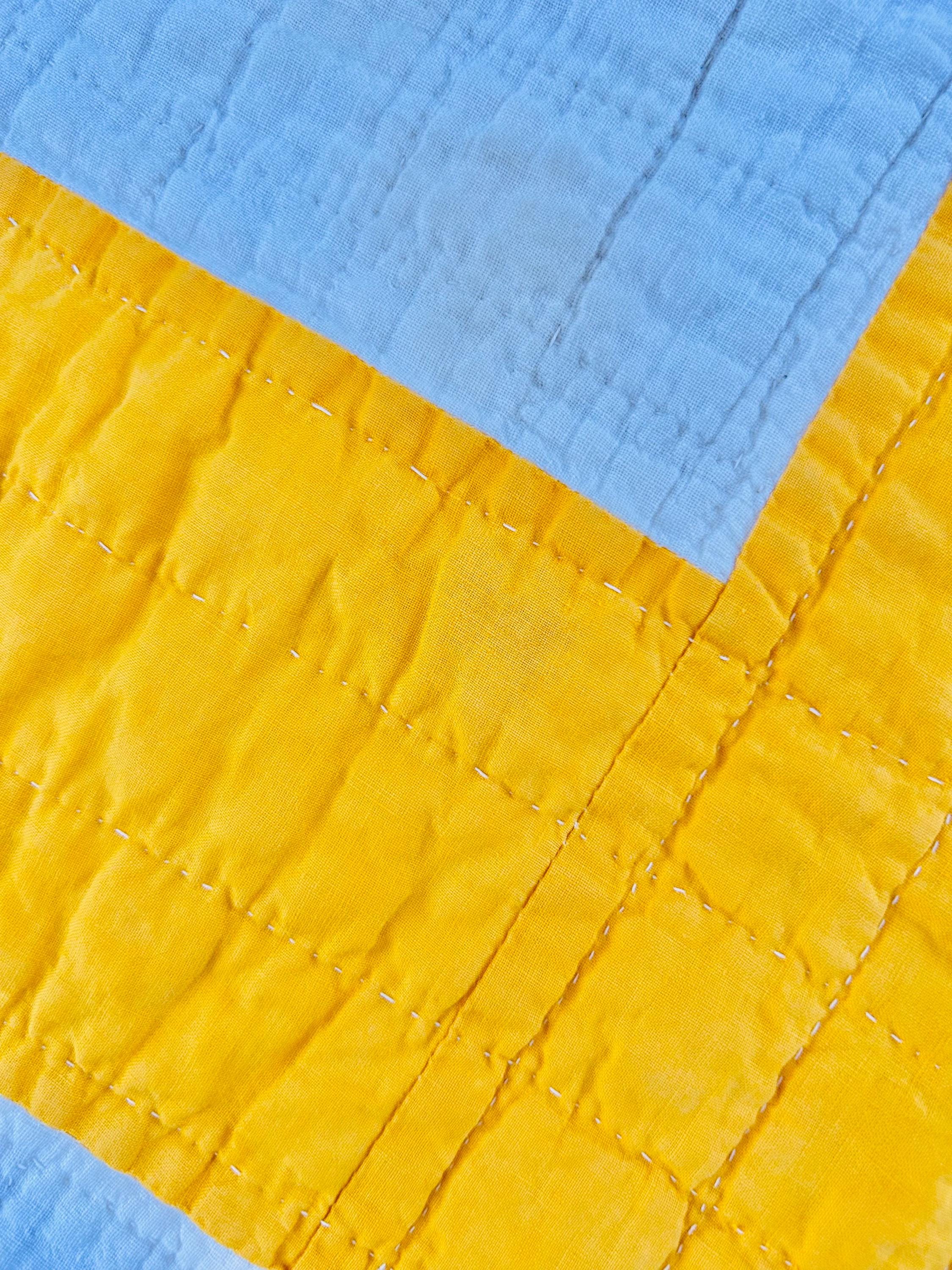 The back is bright white cotton while the cheddar fabric from the border is also used for the binding which has been machine stitched to the front and hand-stitched to the back. The cotton batting is lightweight.
