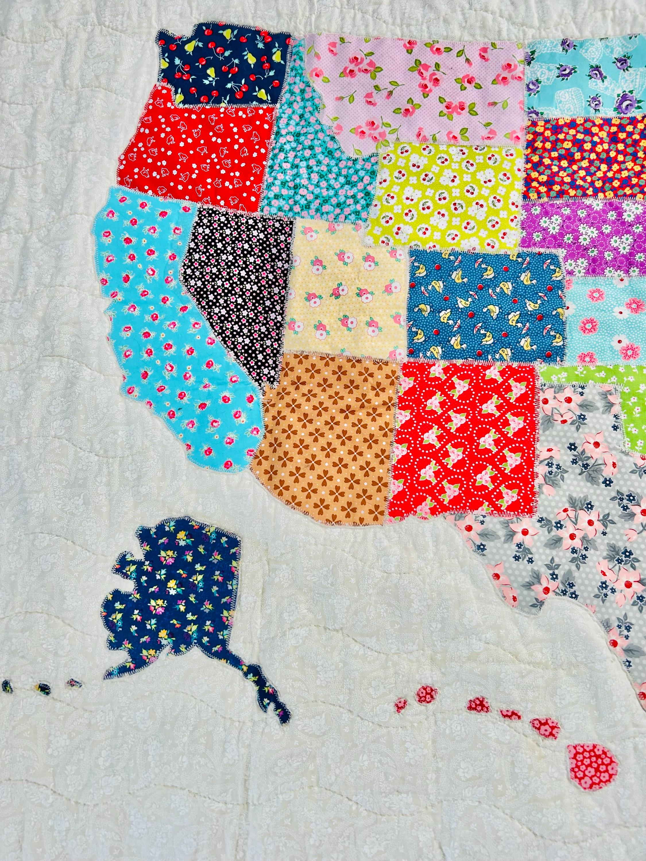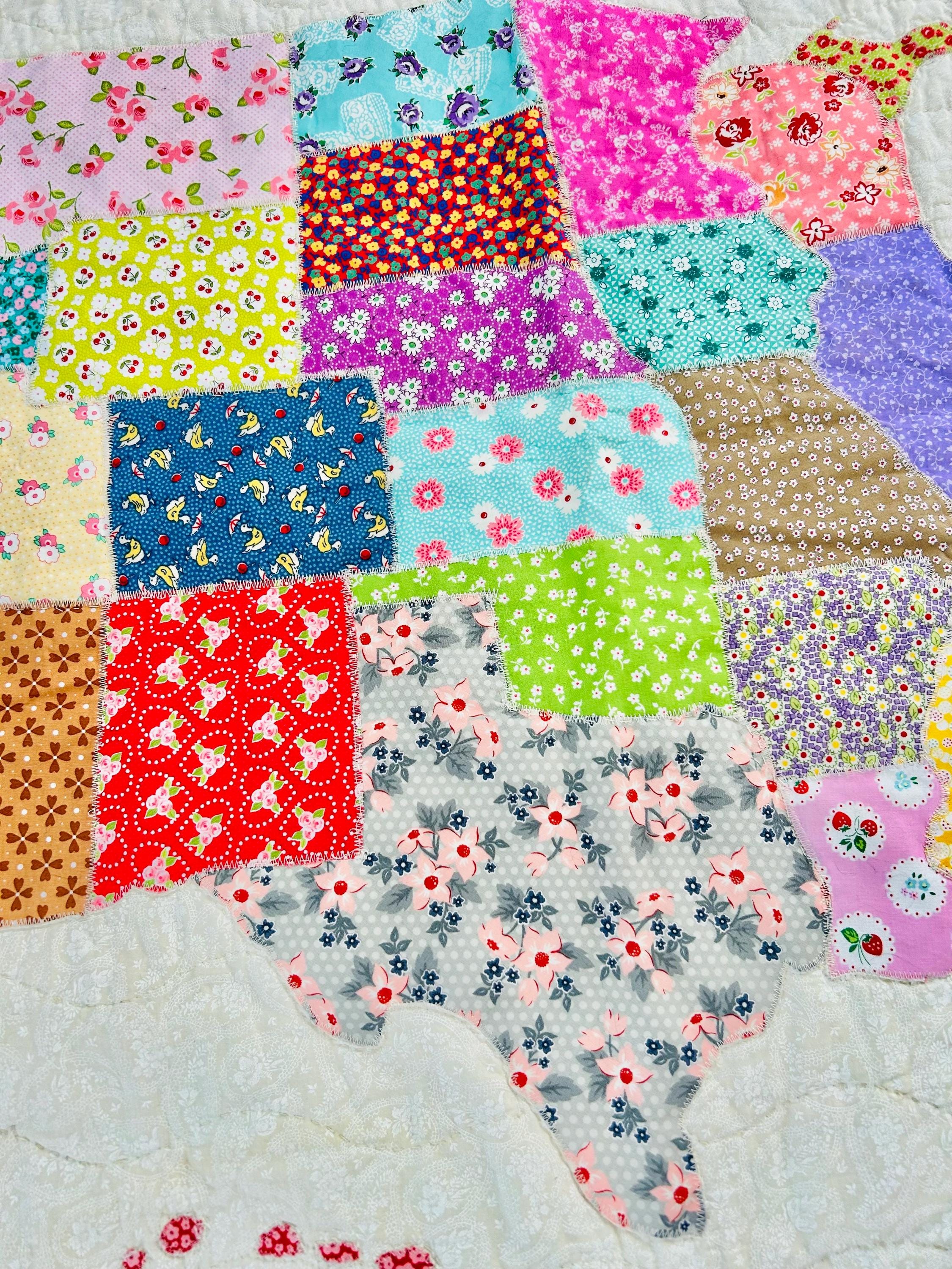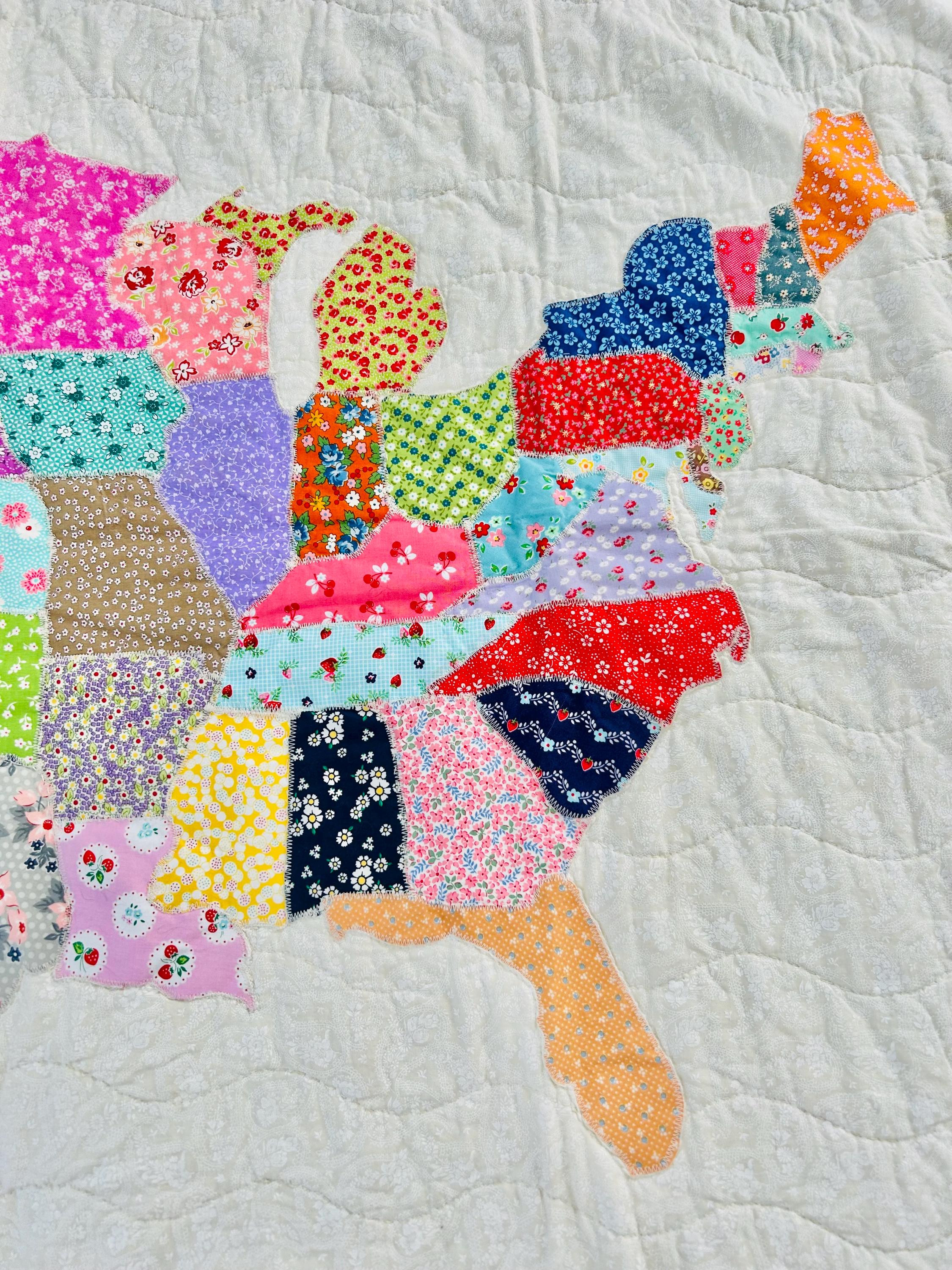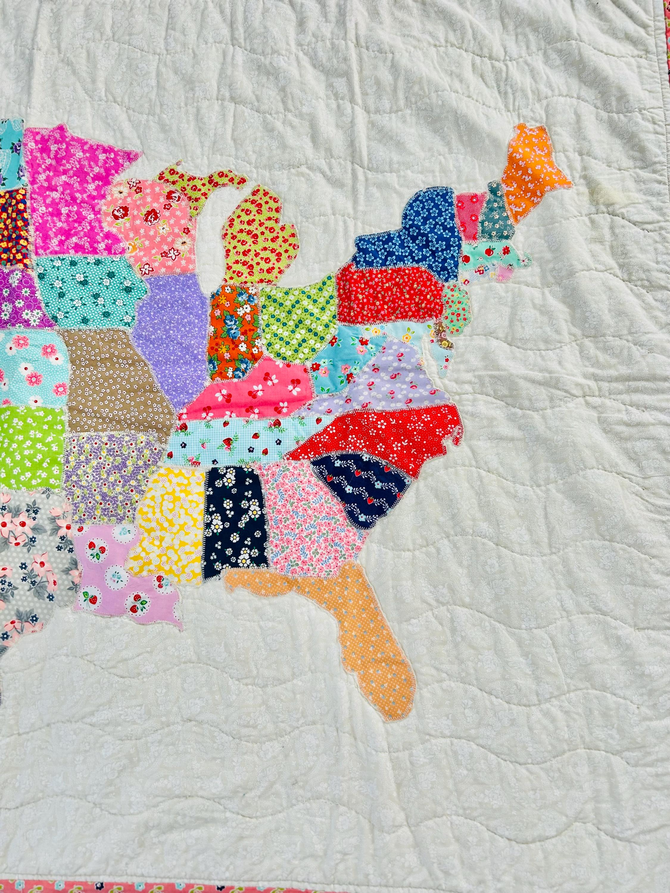It is hand-quilted in waves in the area outside the map, while each state's outline is machine-embroidered. The back is blue/teal and white floral cotton while the binding is a pink floral that has been machine-stitched to both sides. The batting is lightweight.