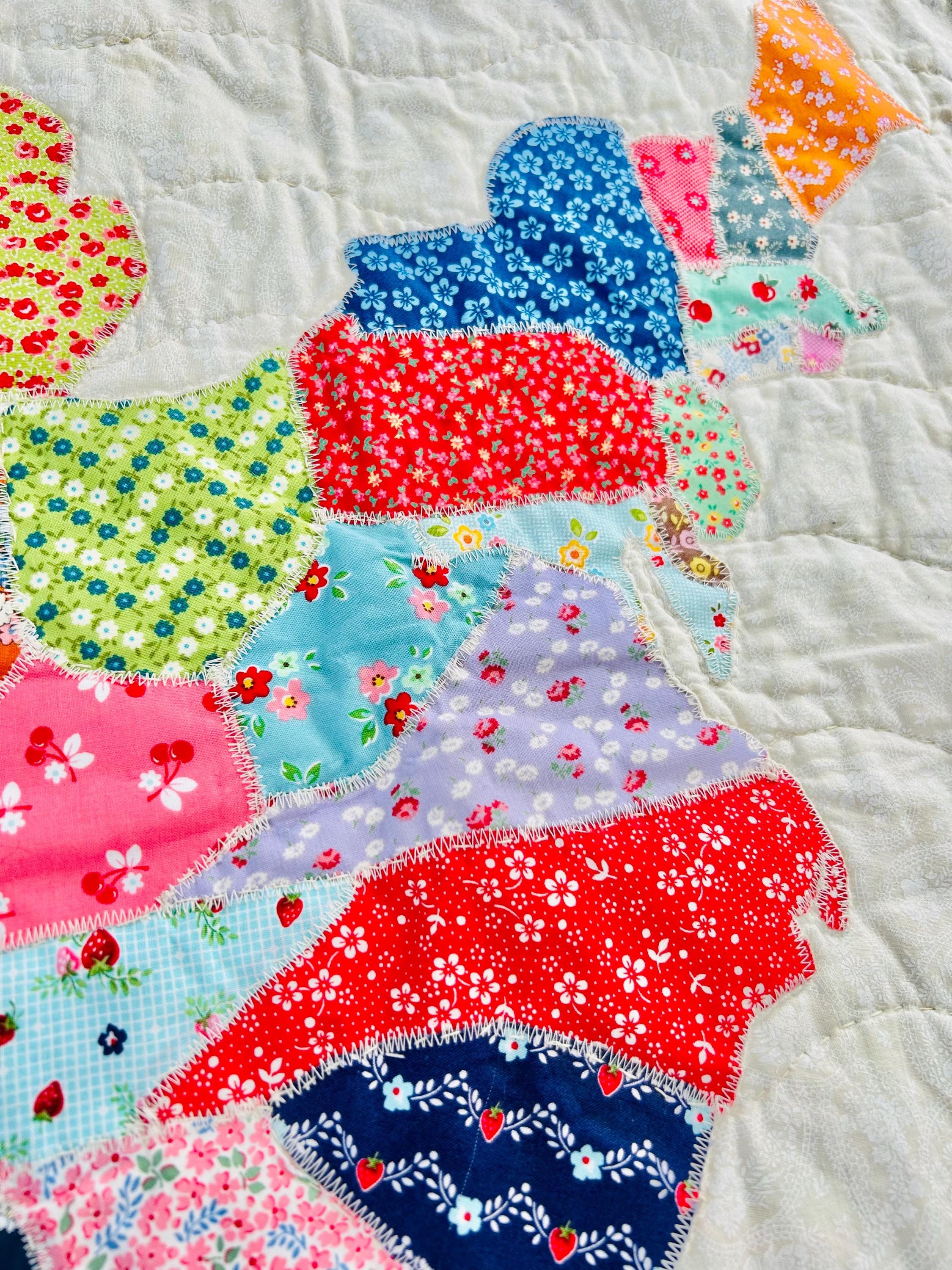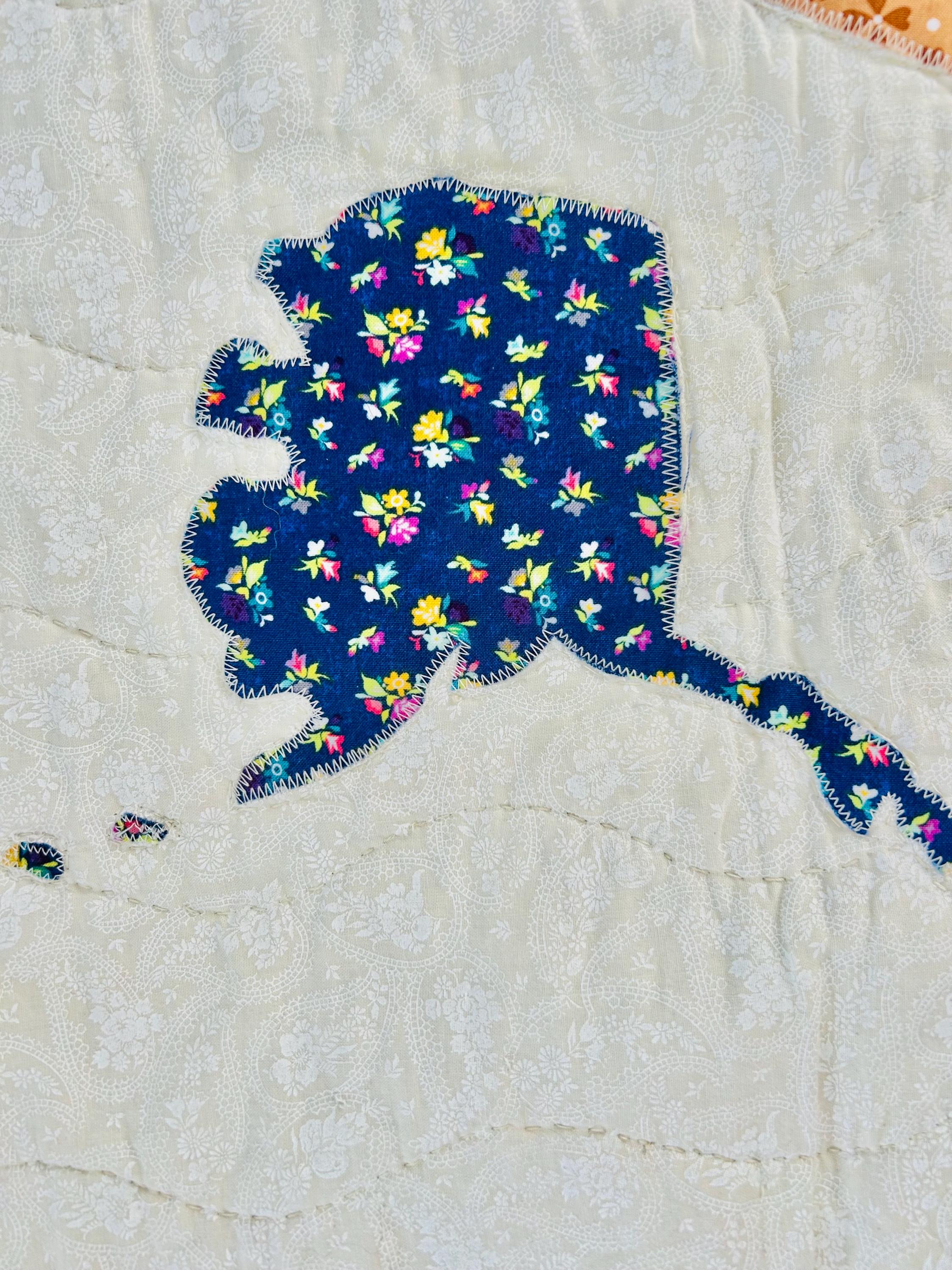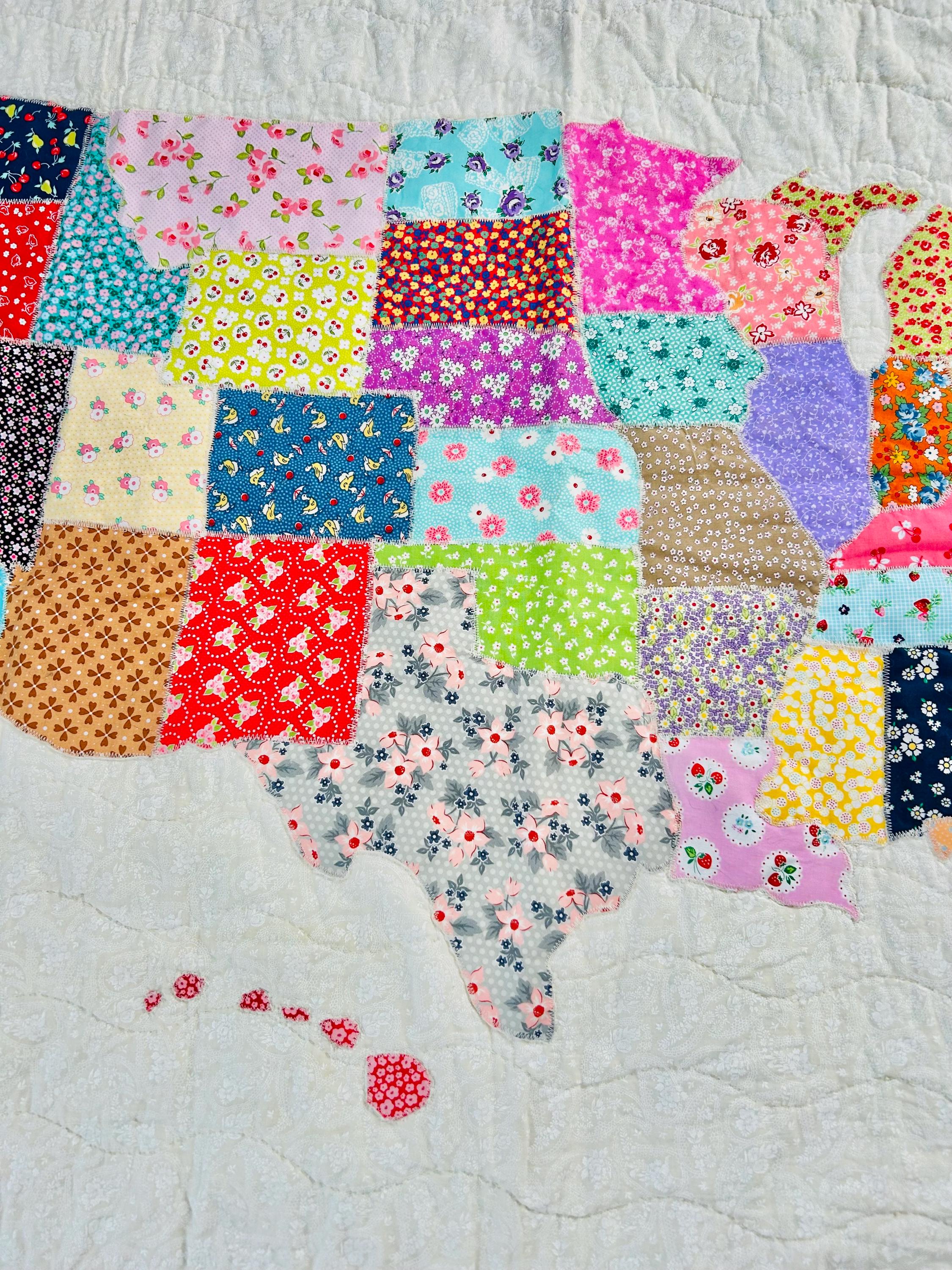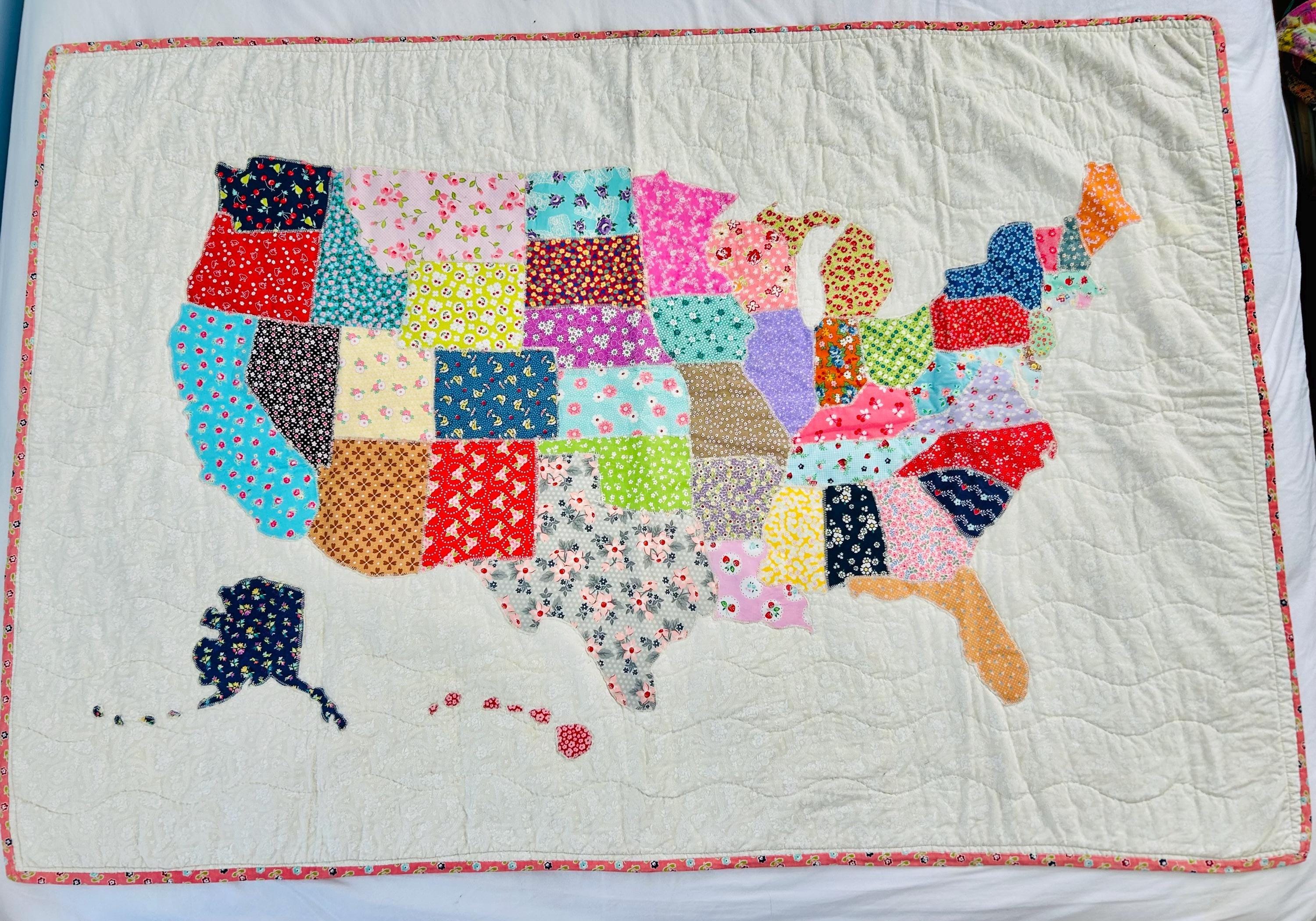 It is hand-quilted in waves in the area outside the map, while each state's outline is machine-embroidered. The back is blue/teal and white floral cotton while the binding is a pink floral that has been machine-stitched to both sides. The batting is lightweight.