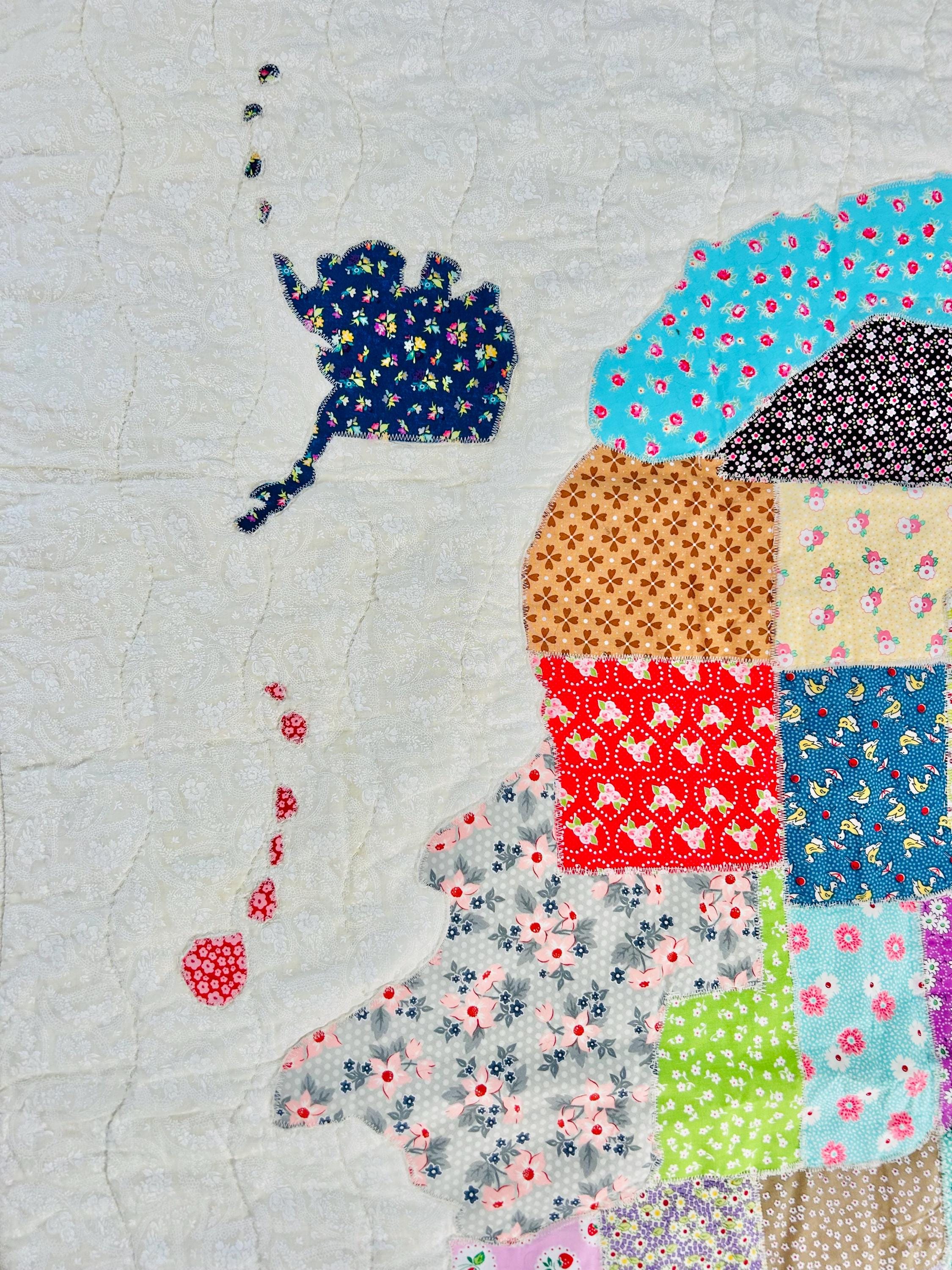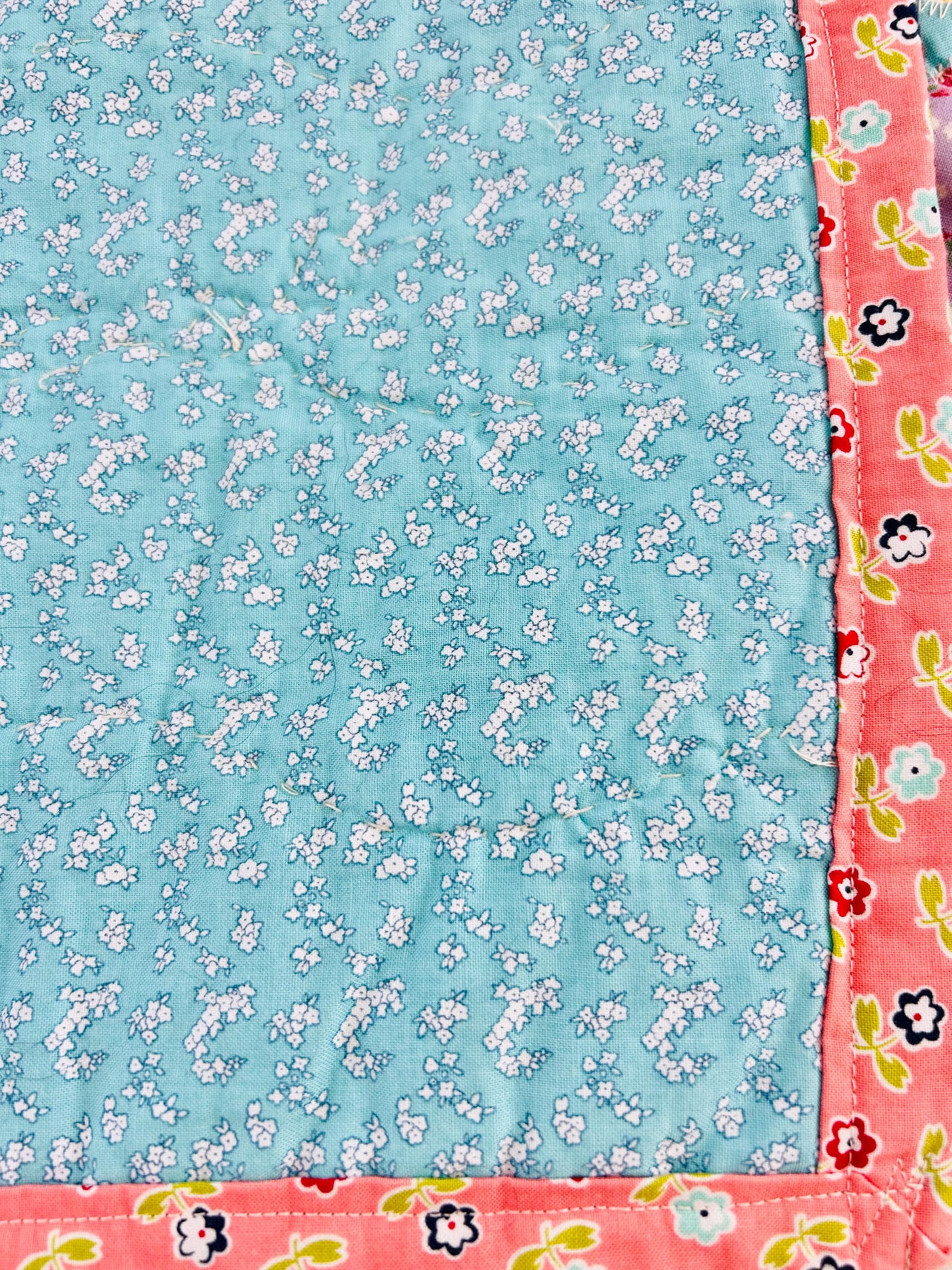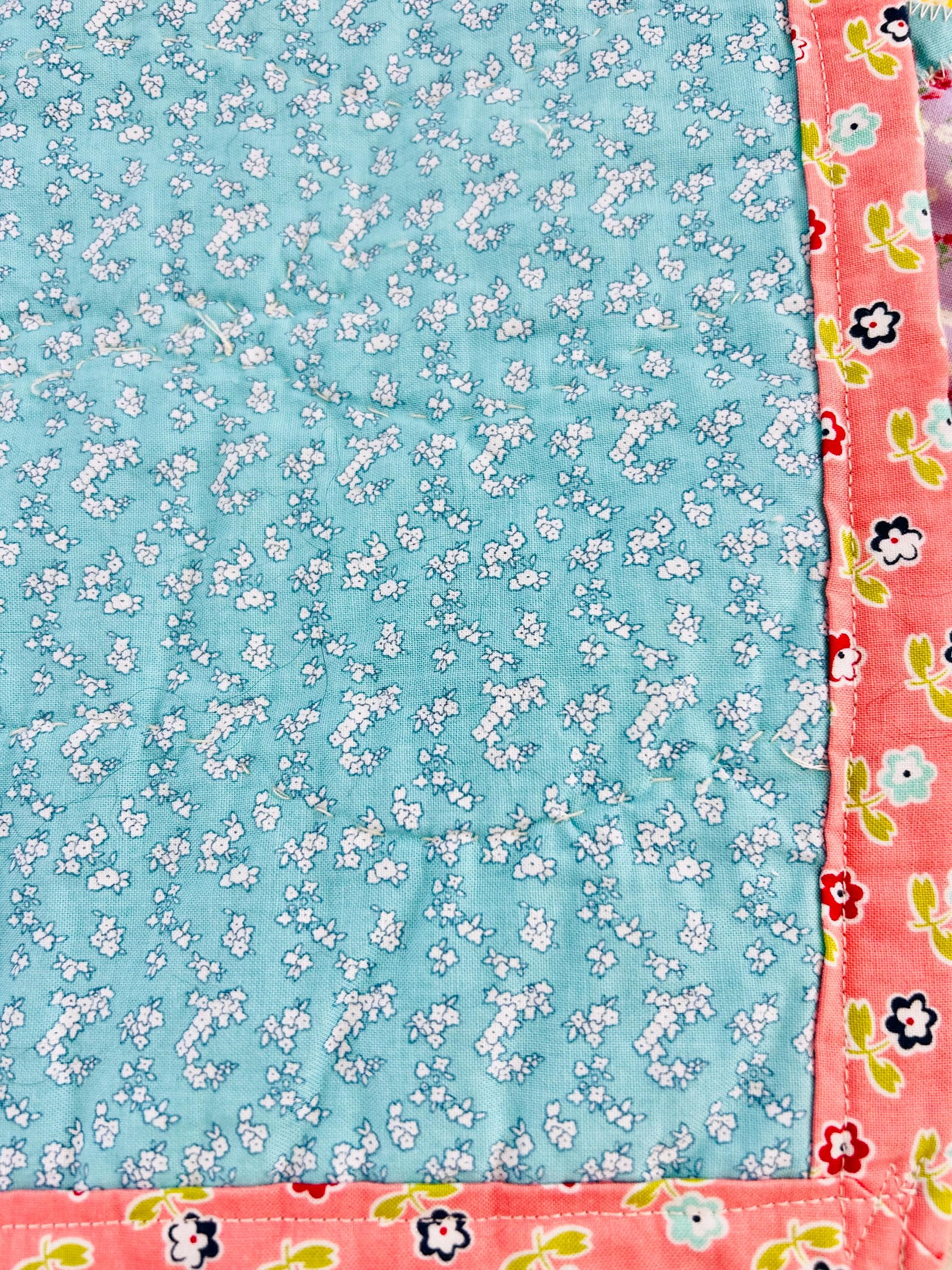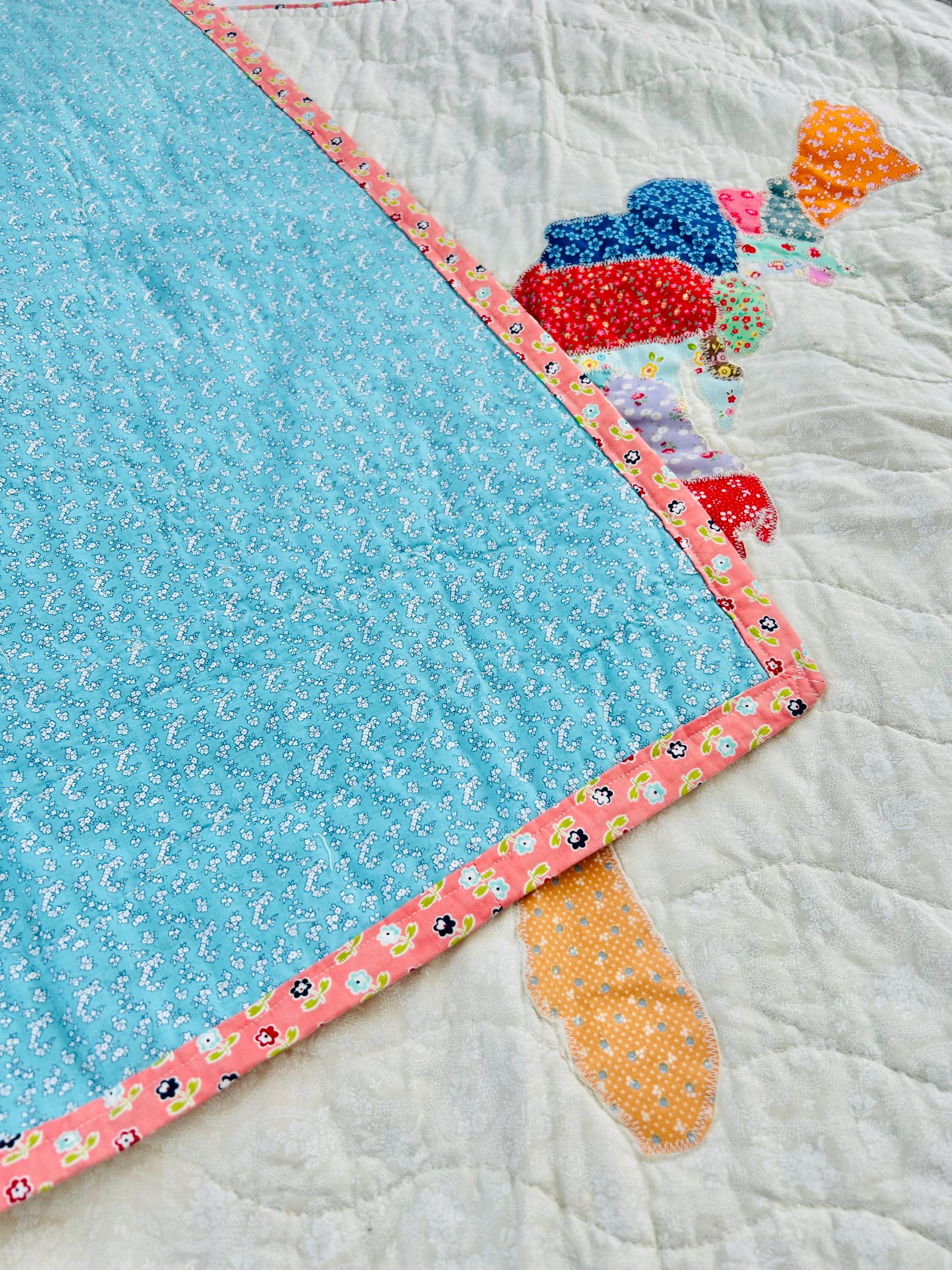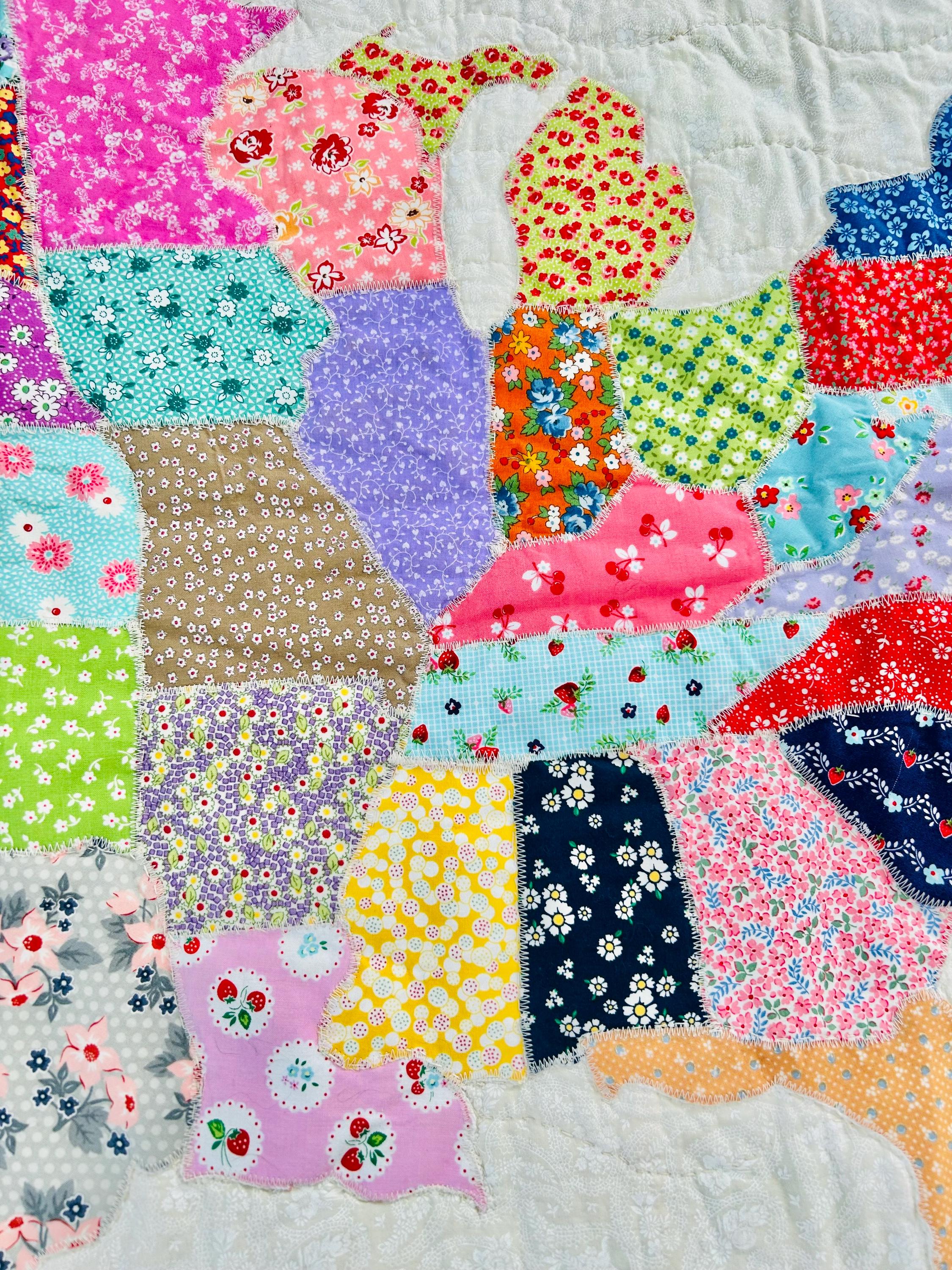 It is hand-quilted in waves in the area outside the map, while each state's outline is machine-embroidered. The back is blue/teal and white floral cotton while the binding is a pink floral that has been machine-stitched to both sides. The batting is lightweight.