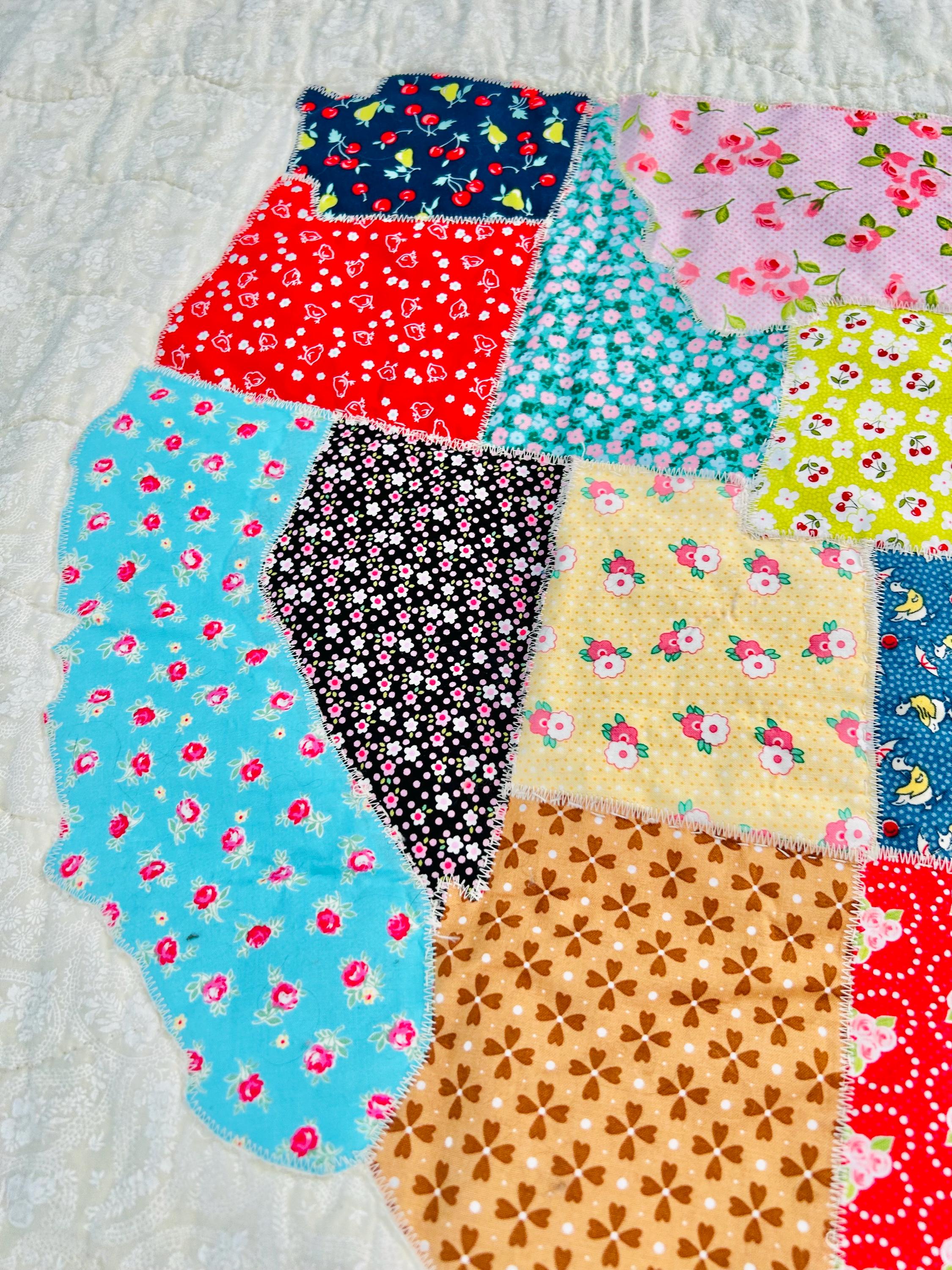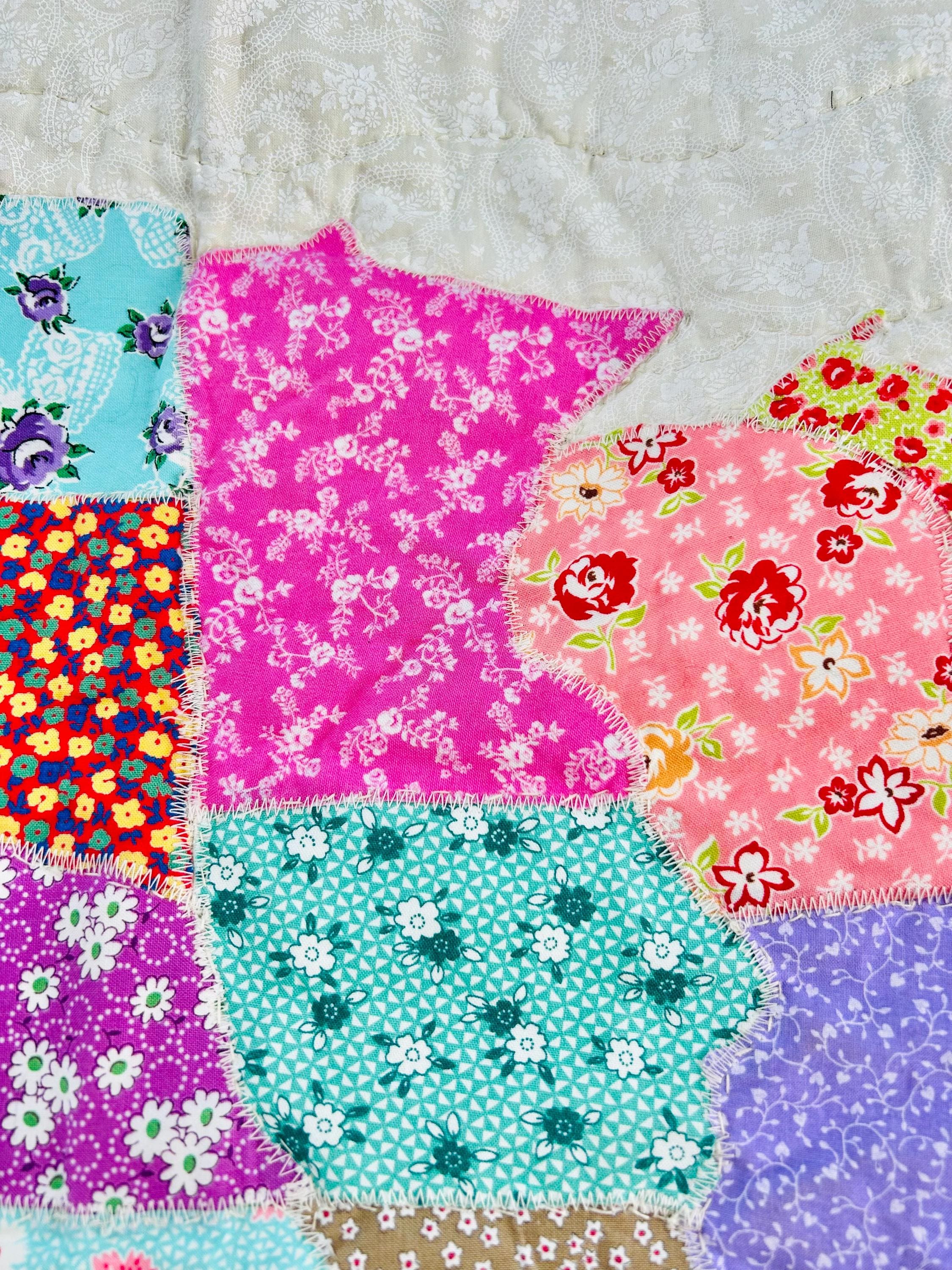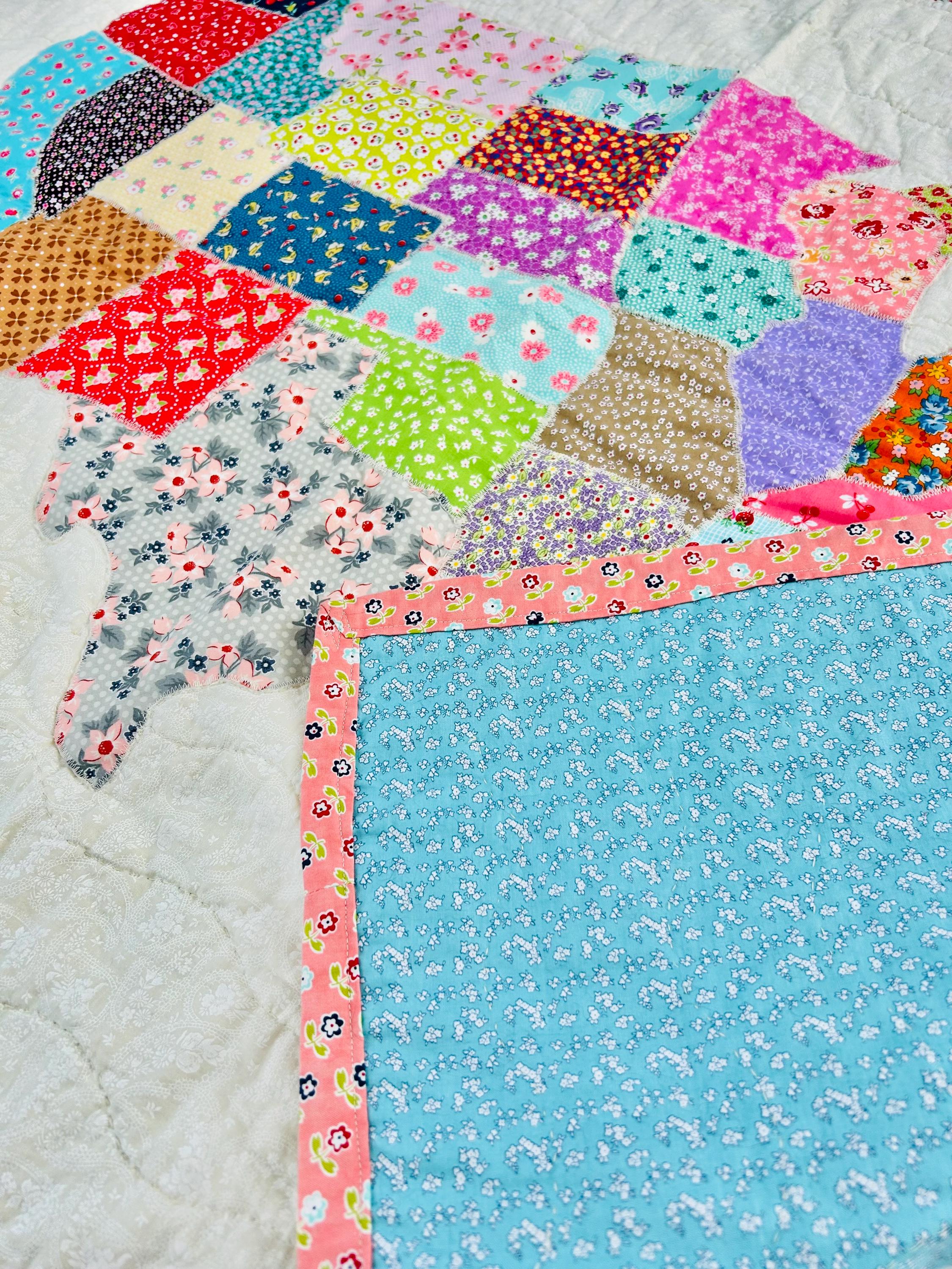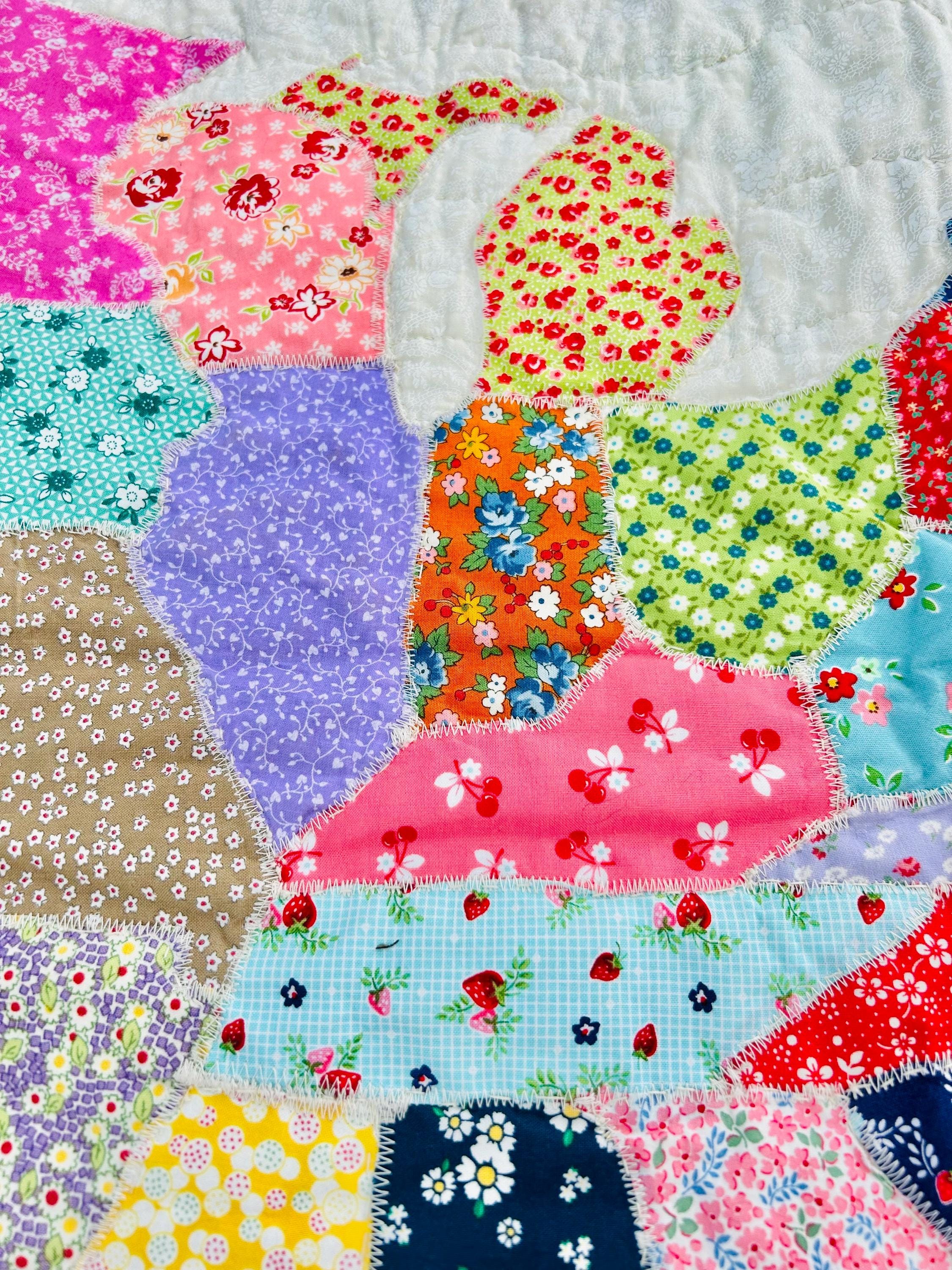 It is hand-quilted in waves in the area outside the map, while each state's outline is machine-embroidered. The back is blue/teal and white floral cotton while the binding is a pink floral that has been machine-stitched to both sides. The batting is lightweight.