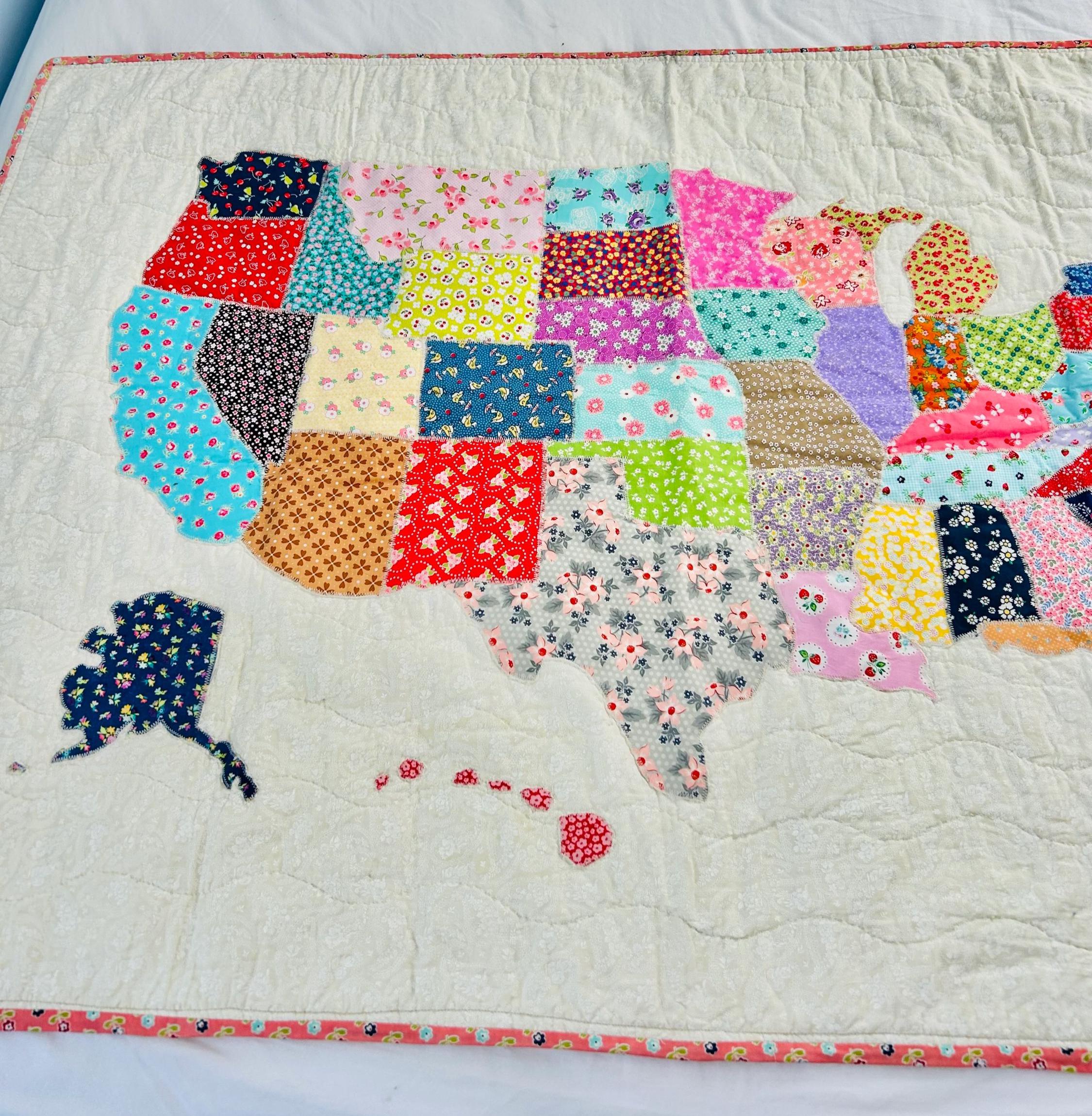 Details • Era: Vintage, circa 1990s • Pattern / Design: United States map quilt (appliquéd states) • Construction: Machine-appliquéd with zigzag stitching; hand-quilted • Materials: Cotton fabrics, lightweight batting • Colors: Multicolor patchwork on a light ground with floral binding • Backing: Solid light blue cotton with small floral print • Quilting: All-over meandering wave quilting • Size: 37.5" x 55" • Condition: Excellent vintage condition