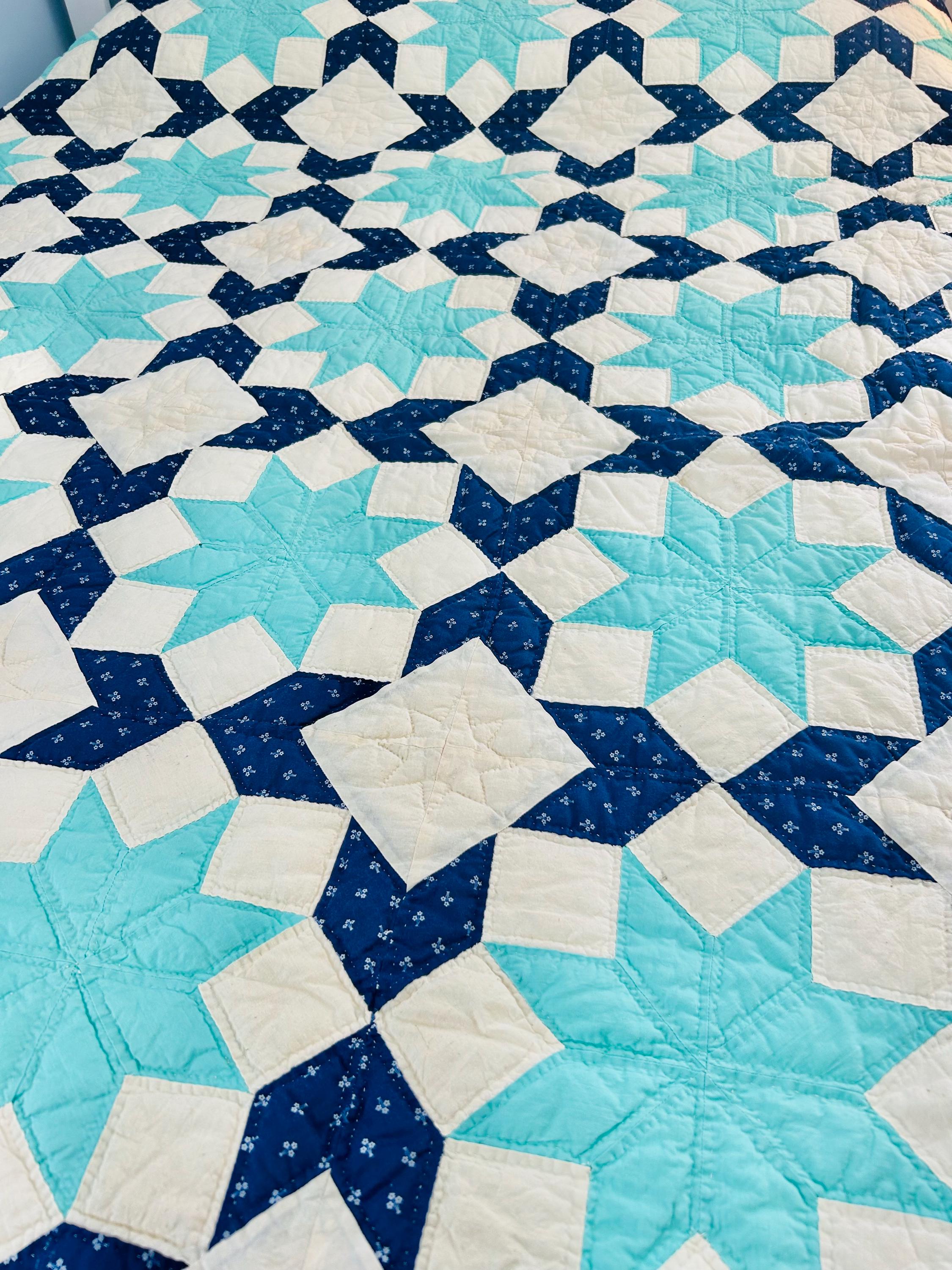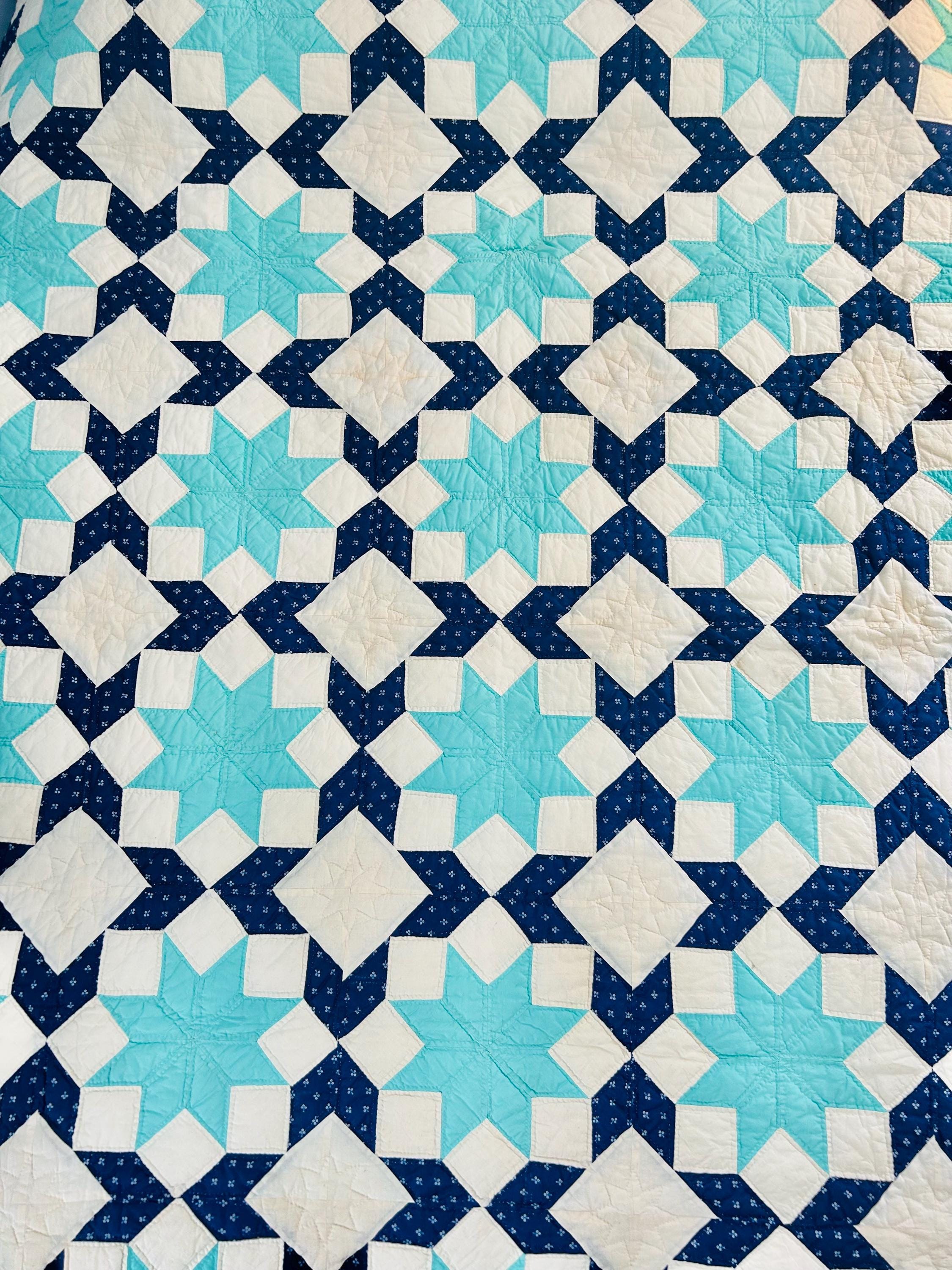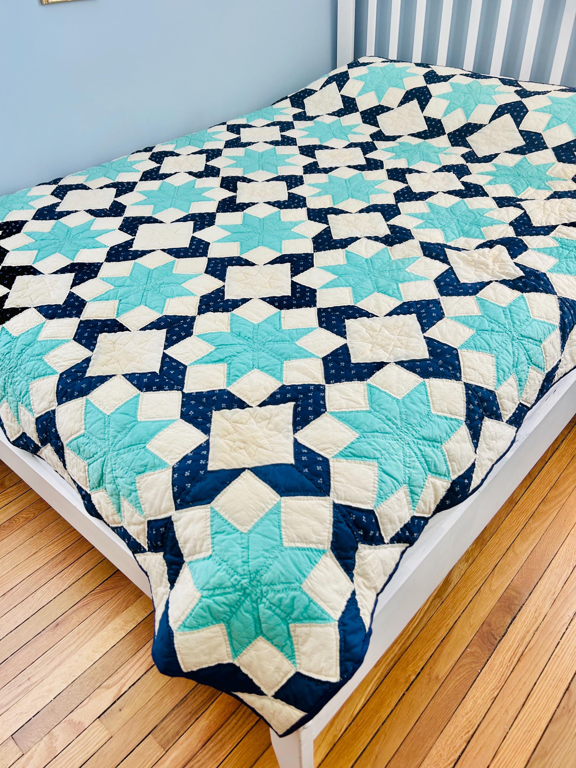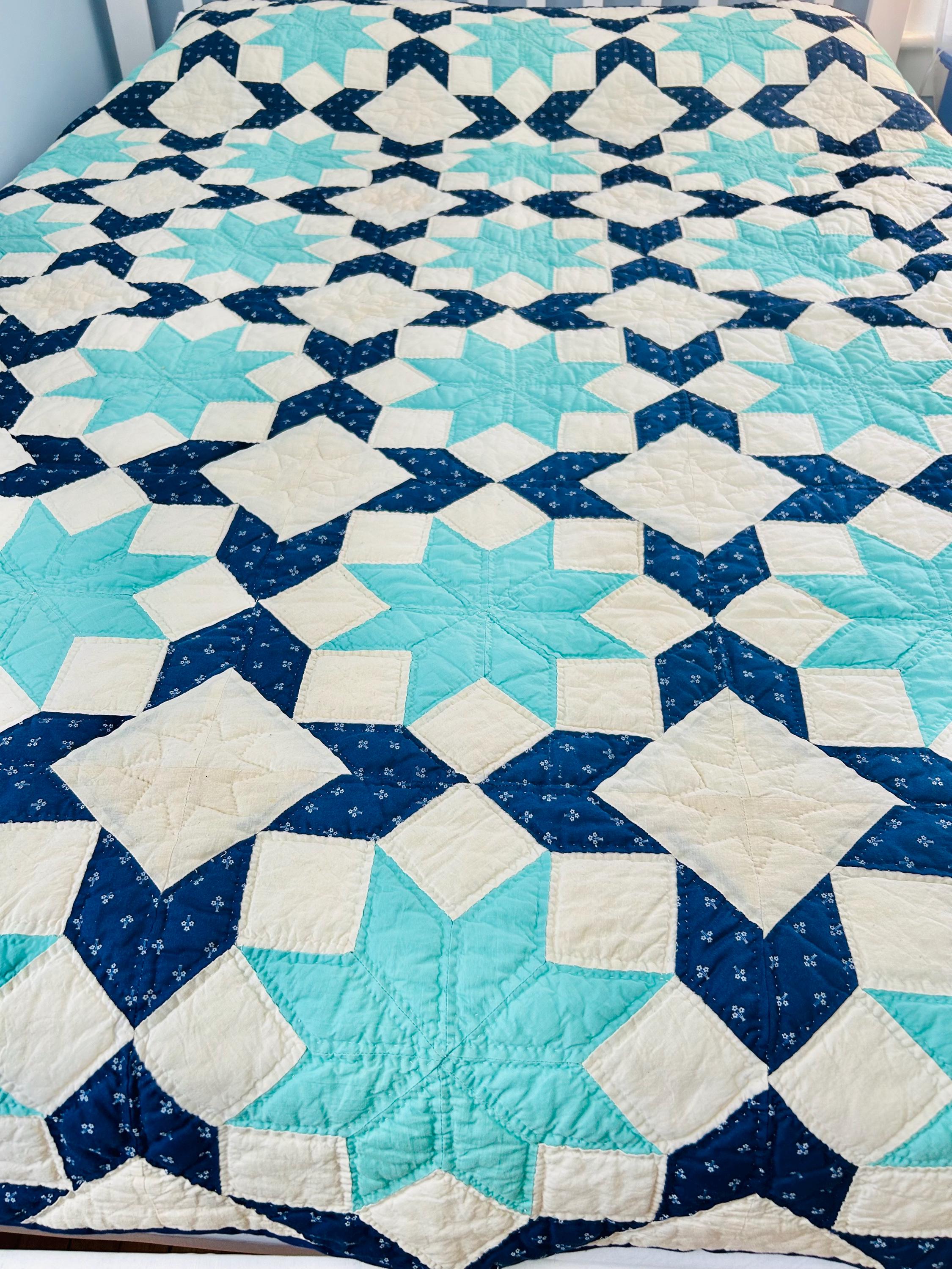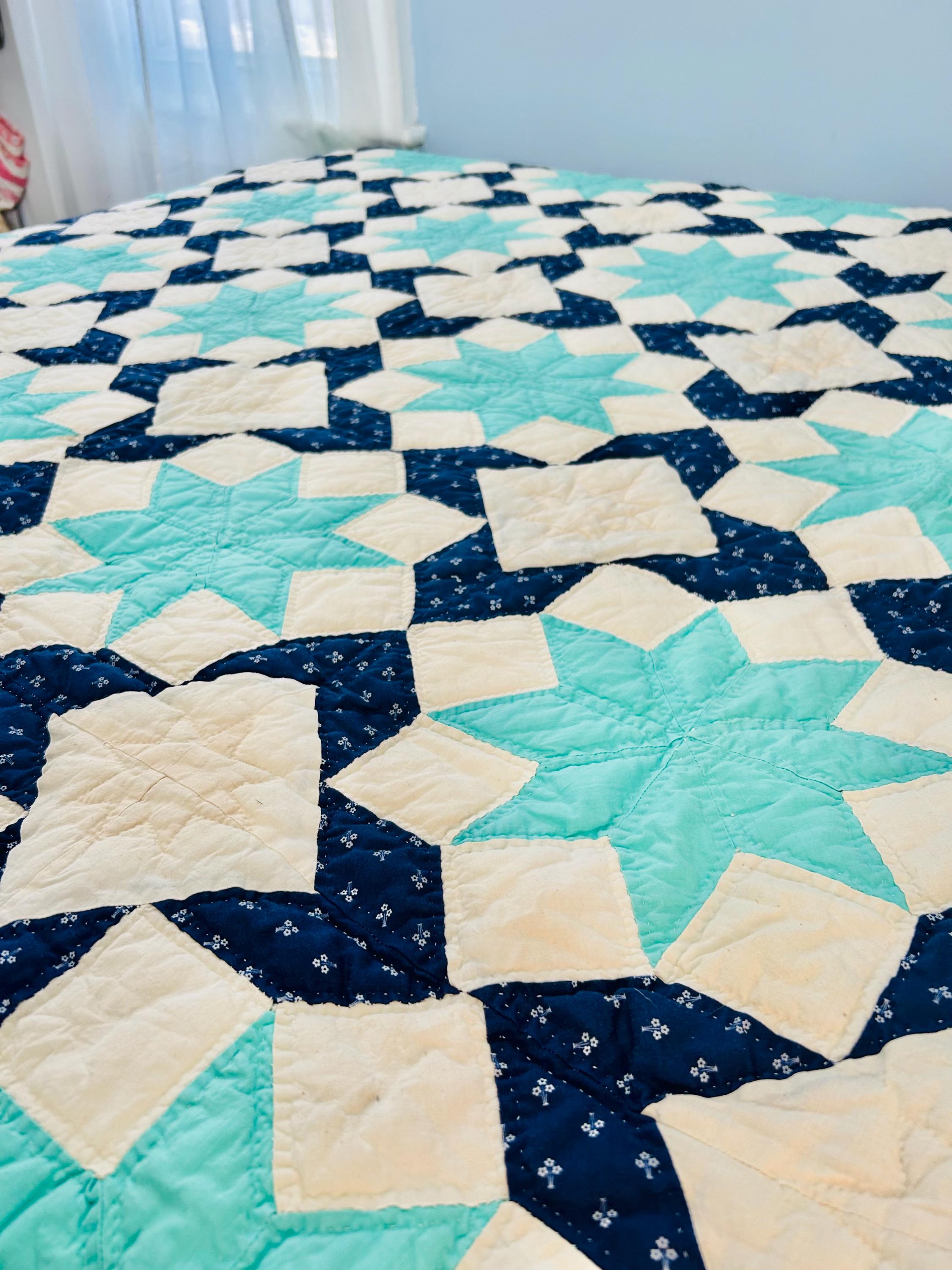 Details • Date: Circa 1935–1945 • Pattern: Eight-Pointed Star • Size: 70” x 84” • Construction: Hand-pieced and hand-quilted • Materials: Cotton fabrics; cotton batting • Colors: Aqua turquoise, navy blue, warm white • Binding: Hand-applied navy binding • Condition: Excellent vintage condition