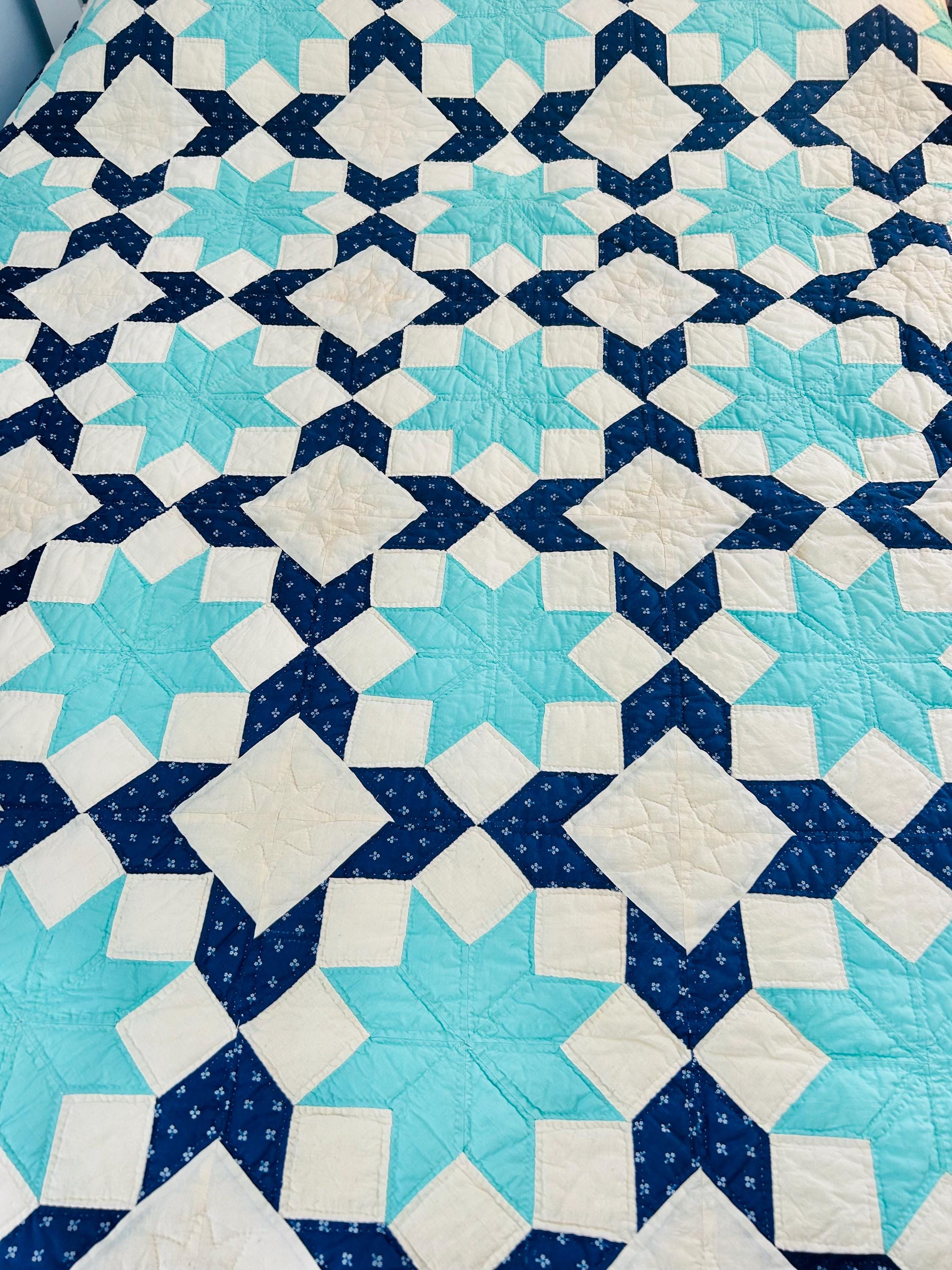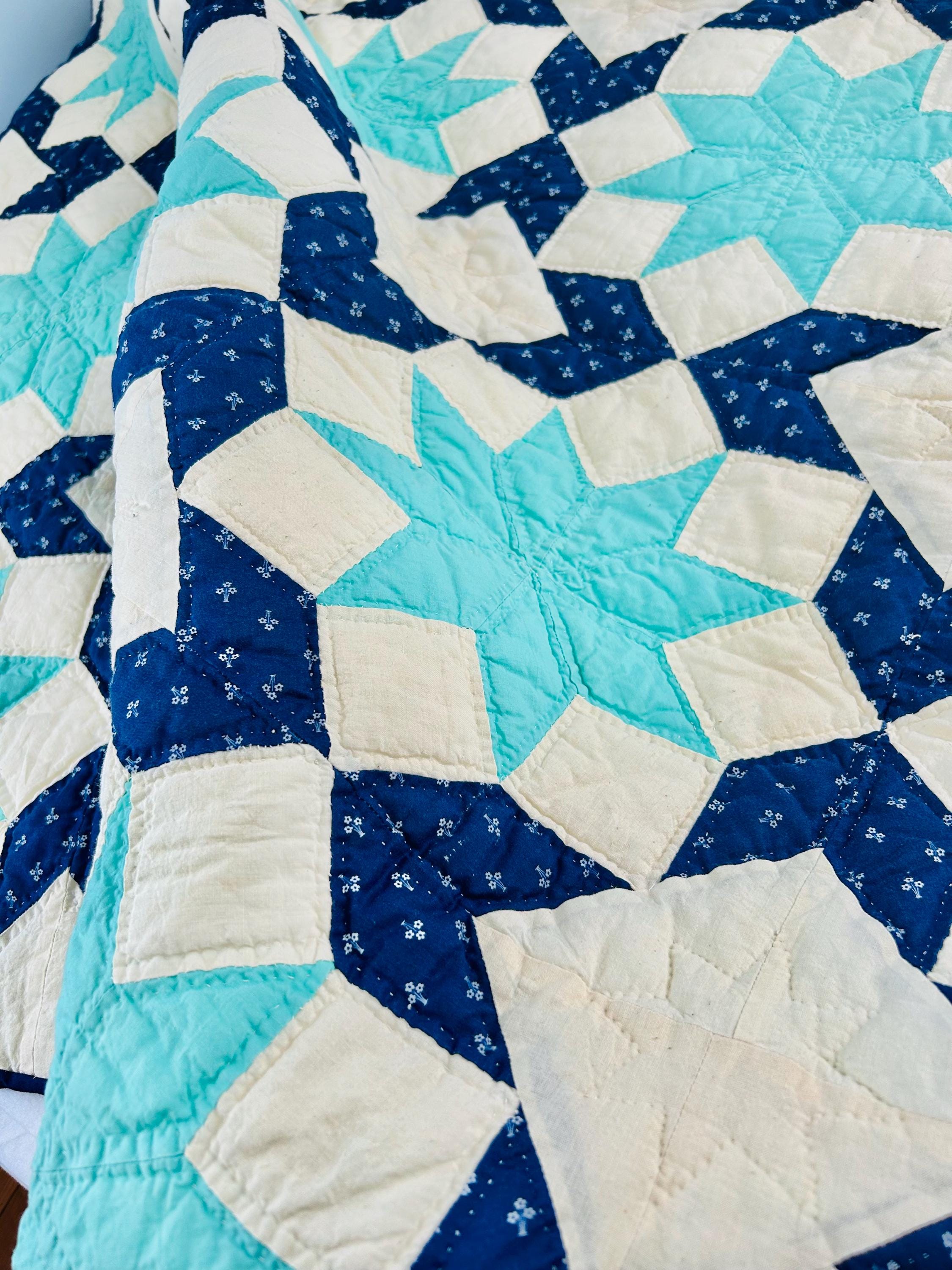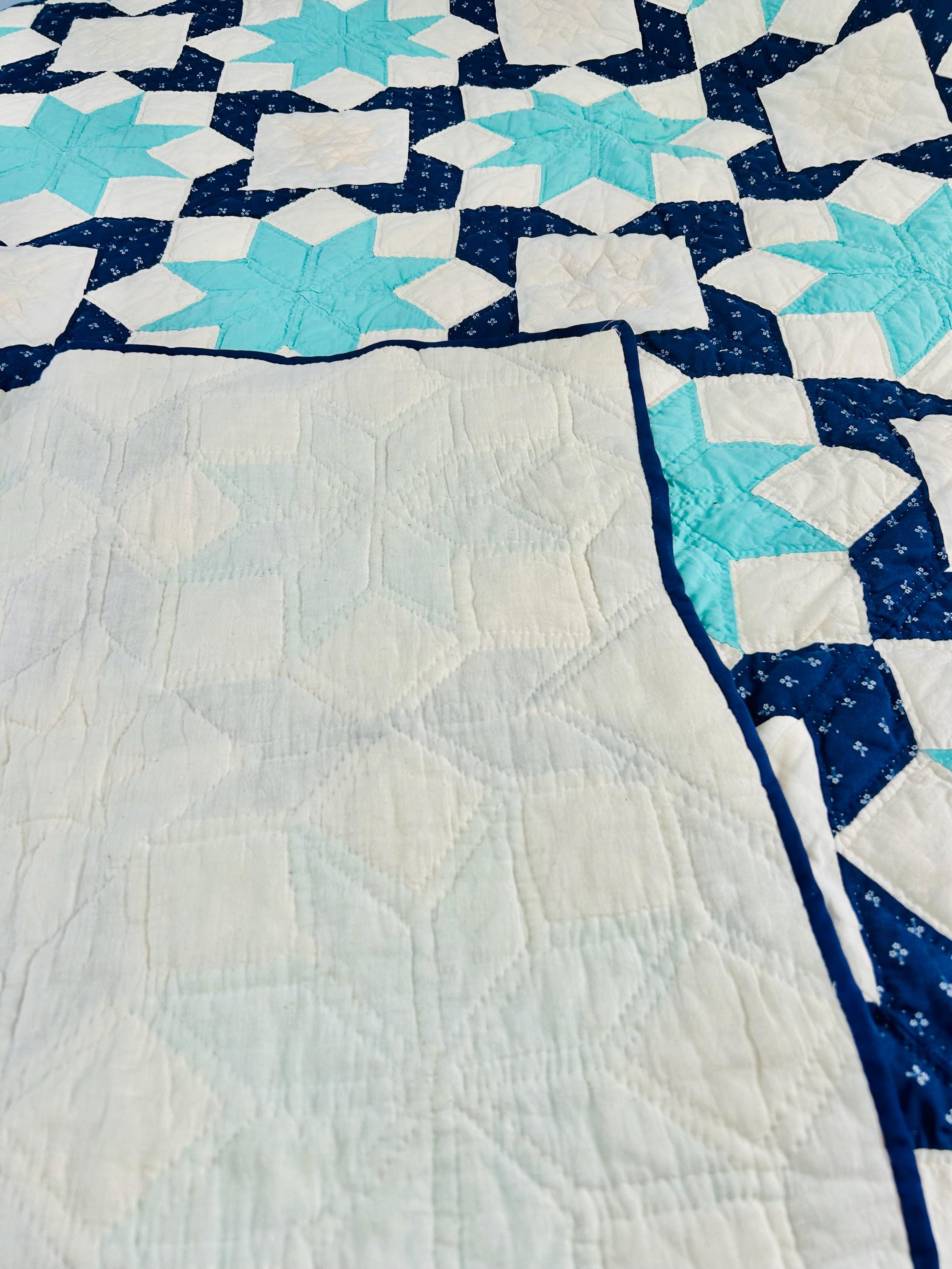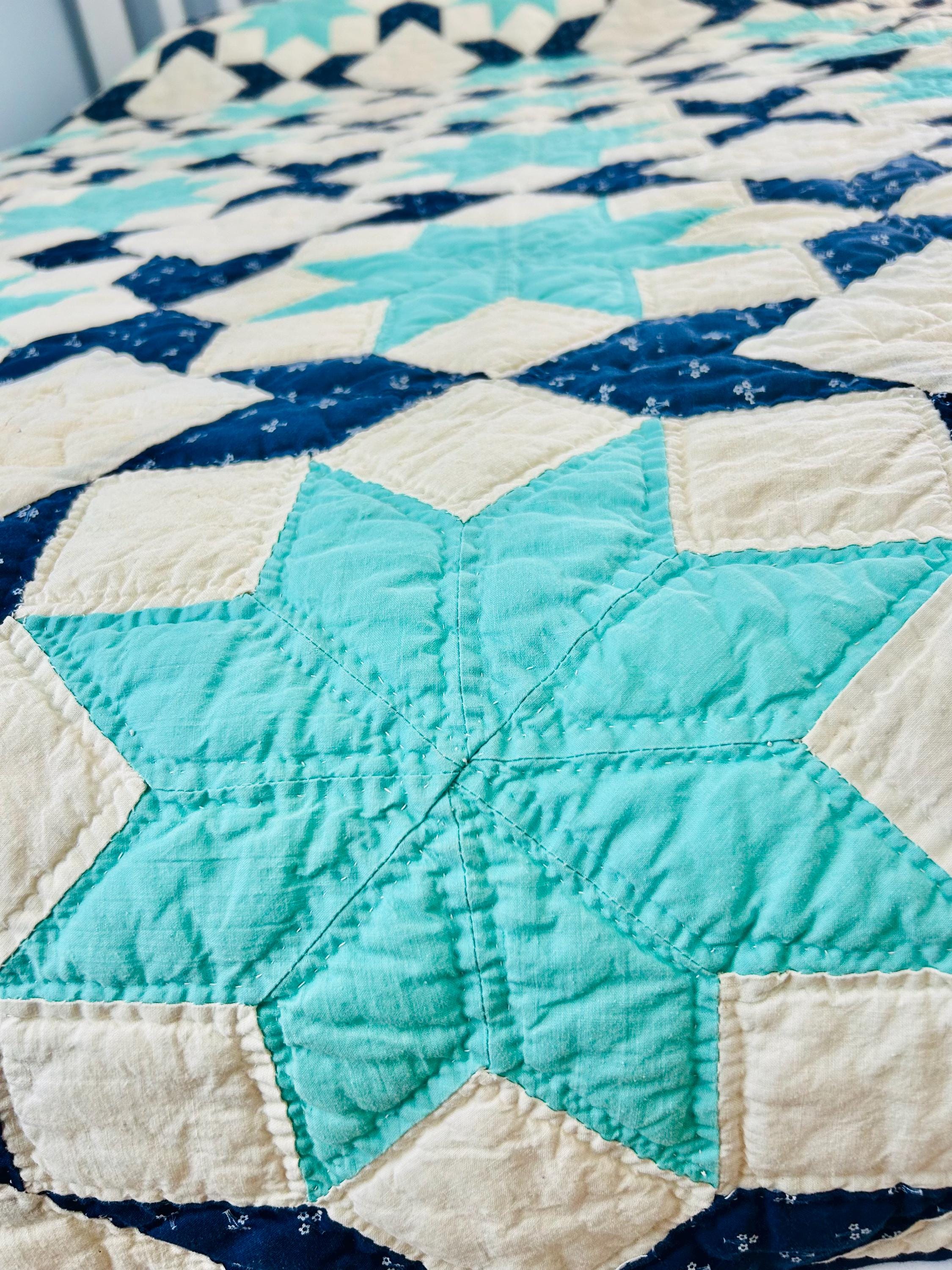 Details • Date: Circa 1935–1945 • Pattern: Eight-Pointed Star • Size: 70” x 84” • Construction: Hand-pieced and hand-quilted • Materials: Cotton fabrics; cotton batting • Colors: Aqua turquoise, navy blue, warm white • Binding: Hand-applied navy binding • Condition: Excellent vintage condition
