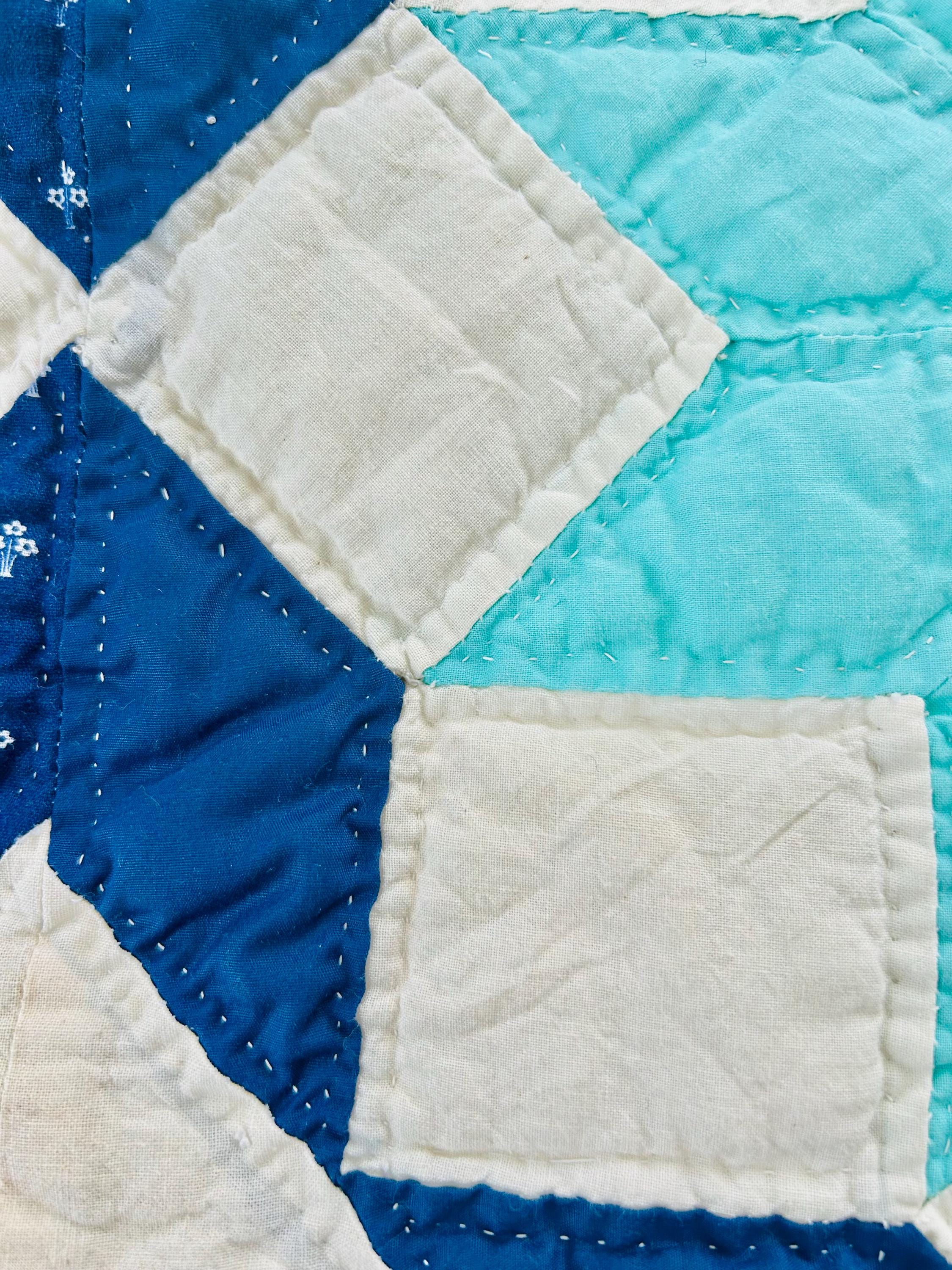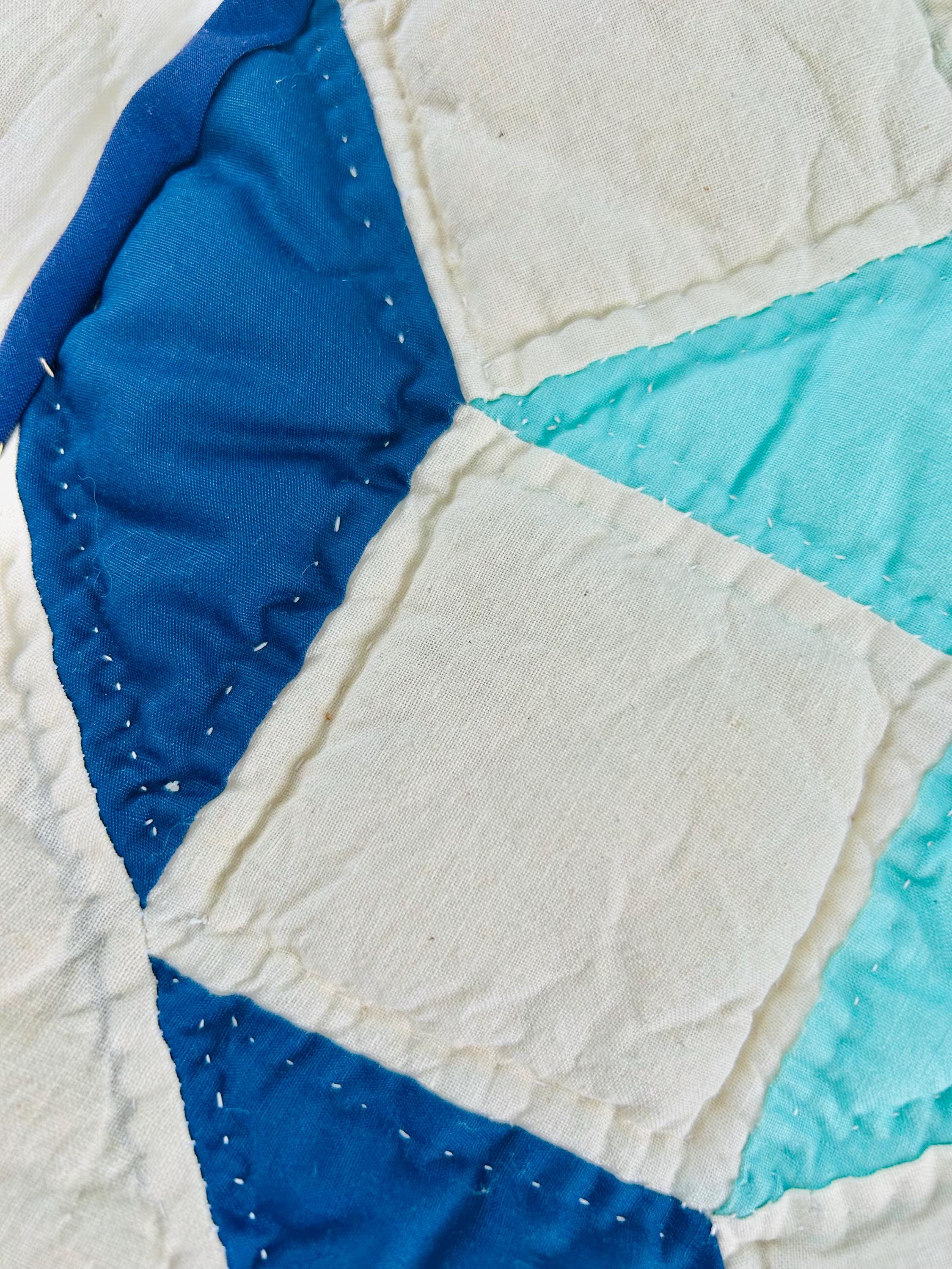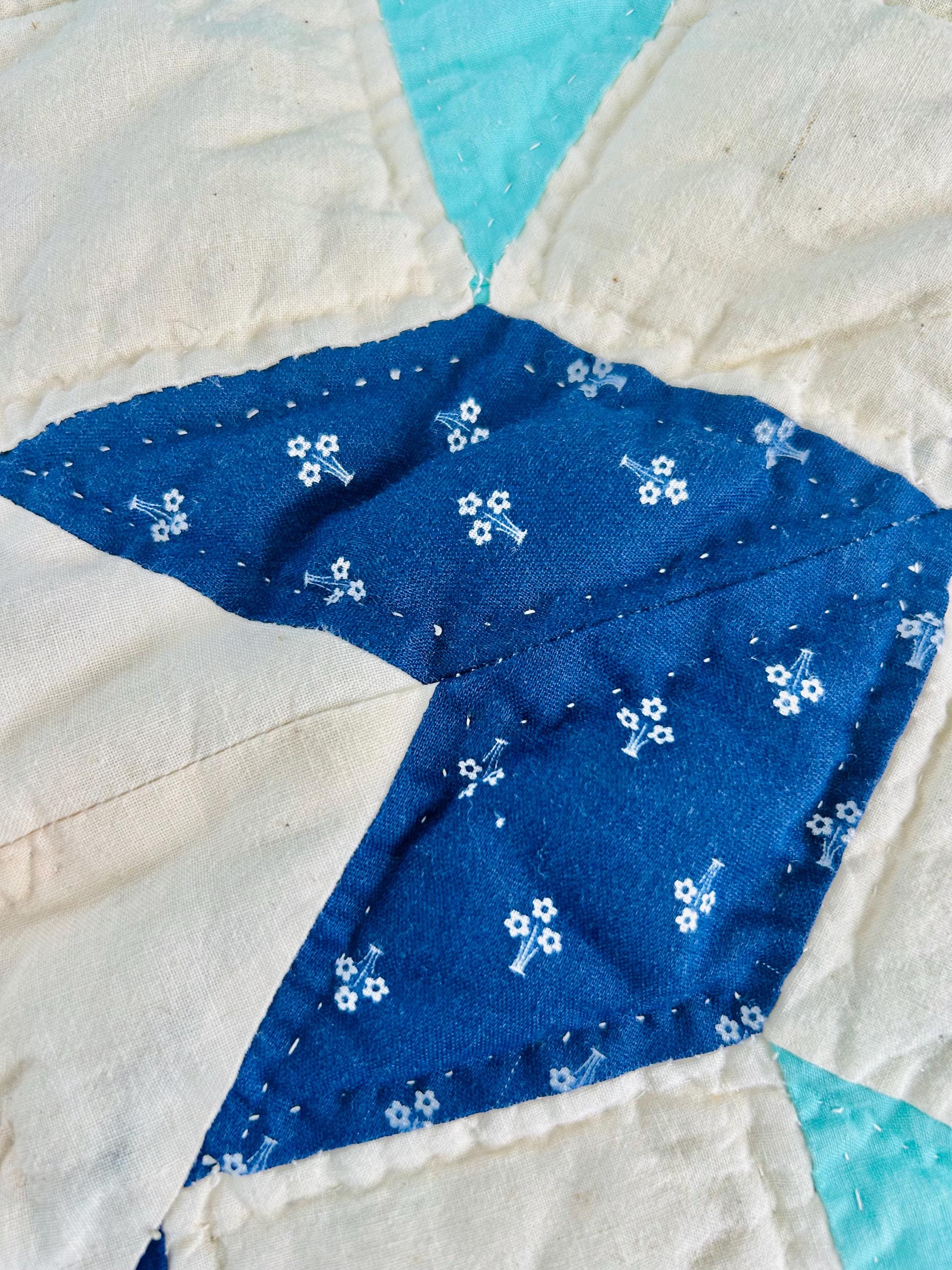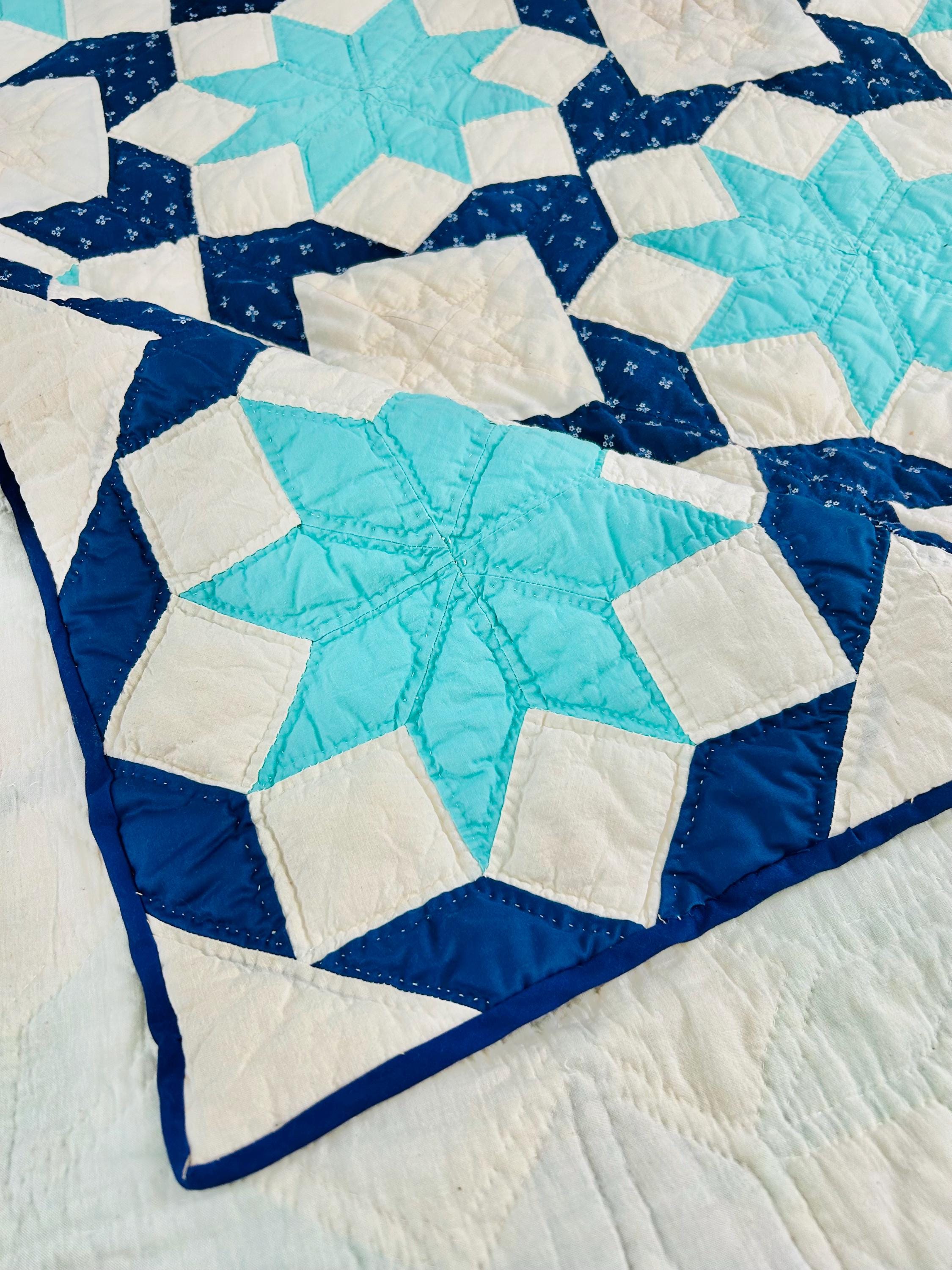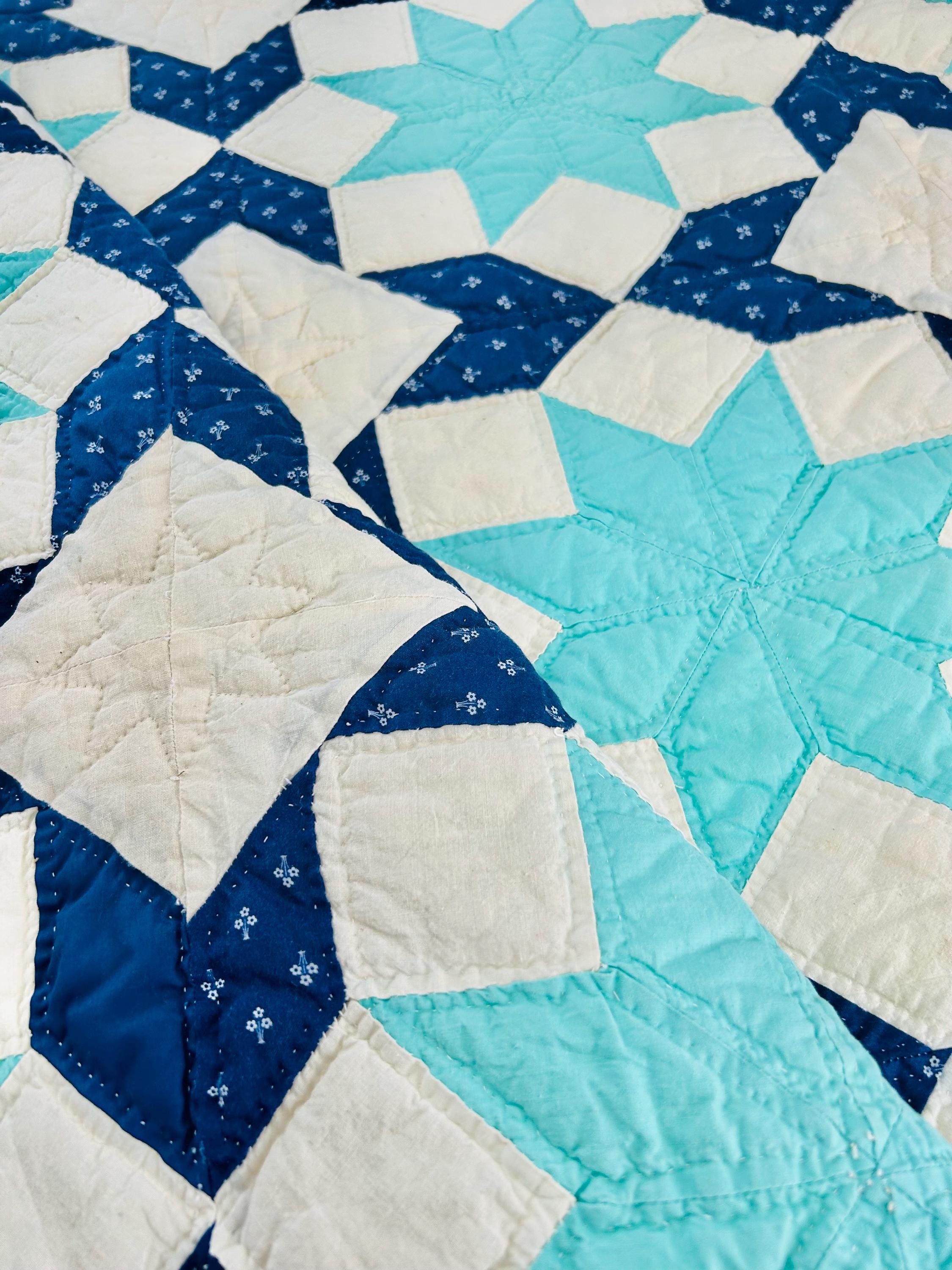 Details • Date: Circa 1935–1945 • Pattern: Eight-Pointed Star • Size: 70” x 84” • Construction: Hand-pieced and hand-quilted • Materials: Cotton fabrics; cotton batting • Colors: Aqua turquoise, navy blue, warm white • Binding: Hand-applied navy binding • Condition: Excellent vintage condition