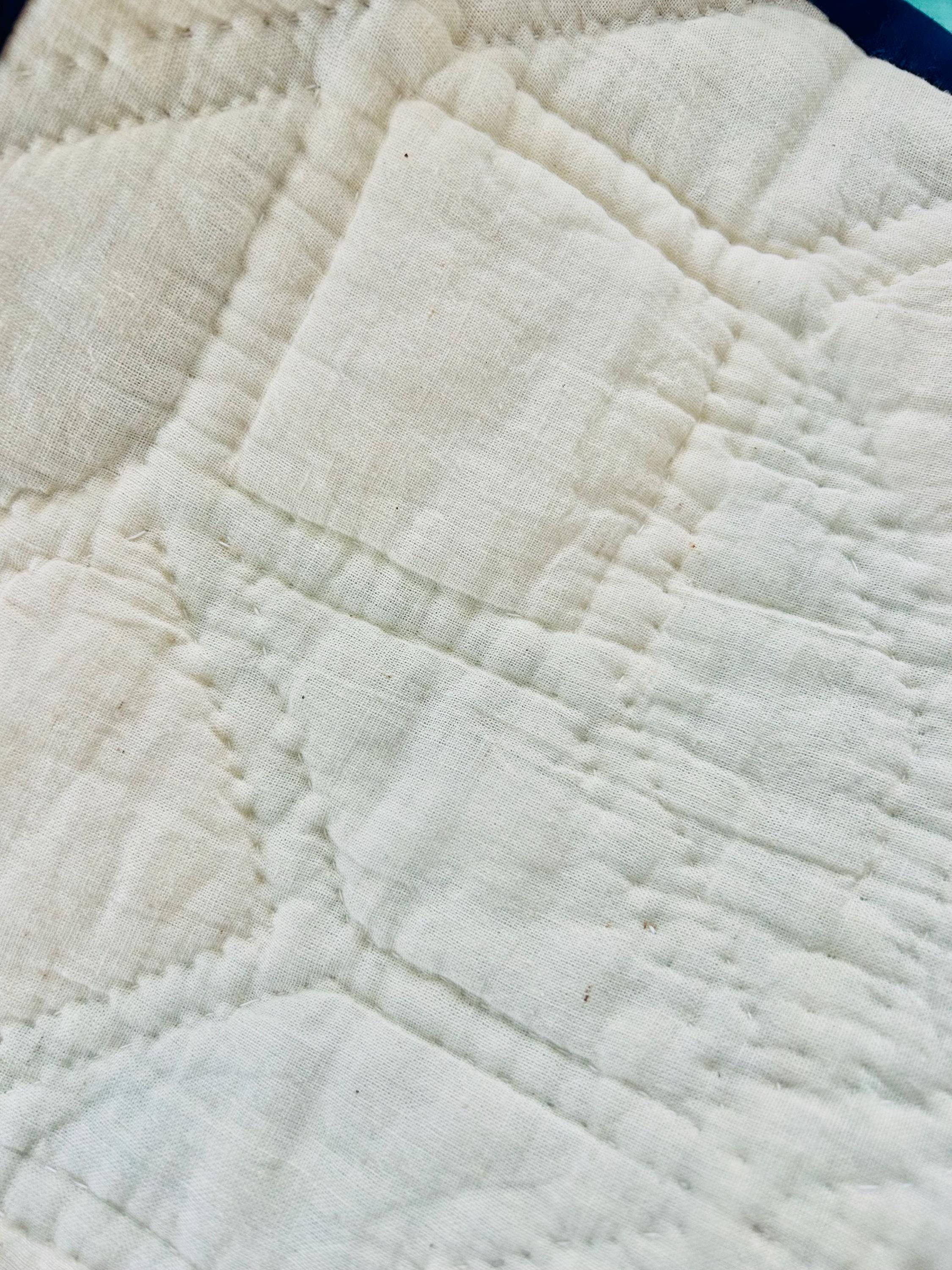 Hand-pieced and hand-quilted, the quilting is in outlines of the patchwork and in tiny stars within the white blocks. The back is white-cream cotton-muslin while the binding is navy blue cotton that has been hand-stitched to both sides. The cotton batting is lightweight.