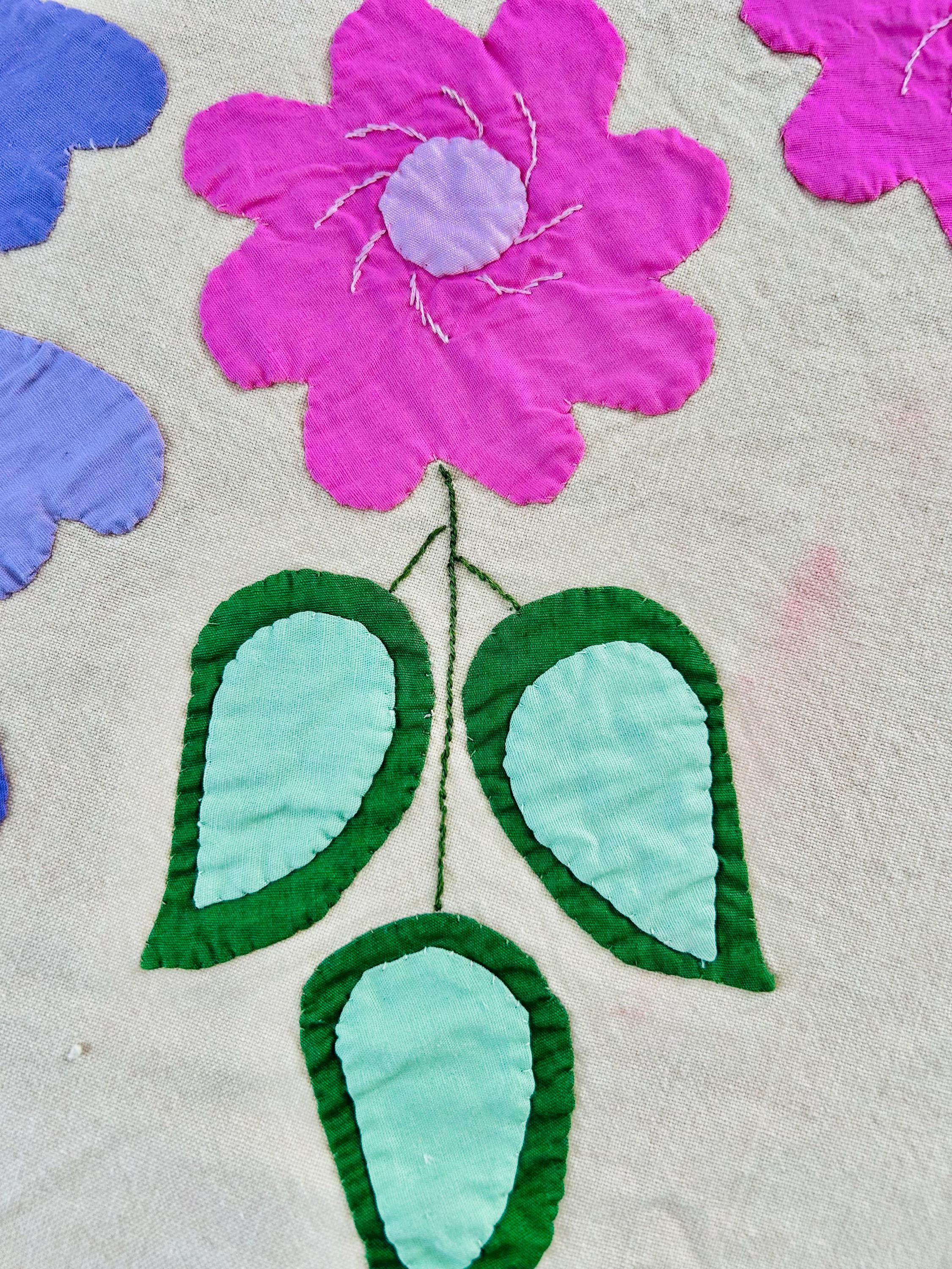 Entirely hand-appliquéd, the design features a bold central floral medallion with radiating stems, leaves, and blossoms. The top and bottom edges have been hemmed and the two sides are selvedge edges of the woven cotton so it could be (and may have been) used as a summer coverlet.