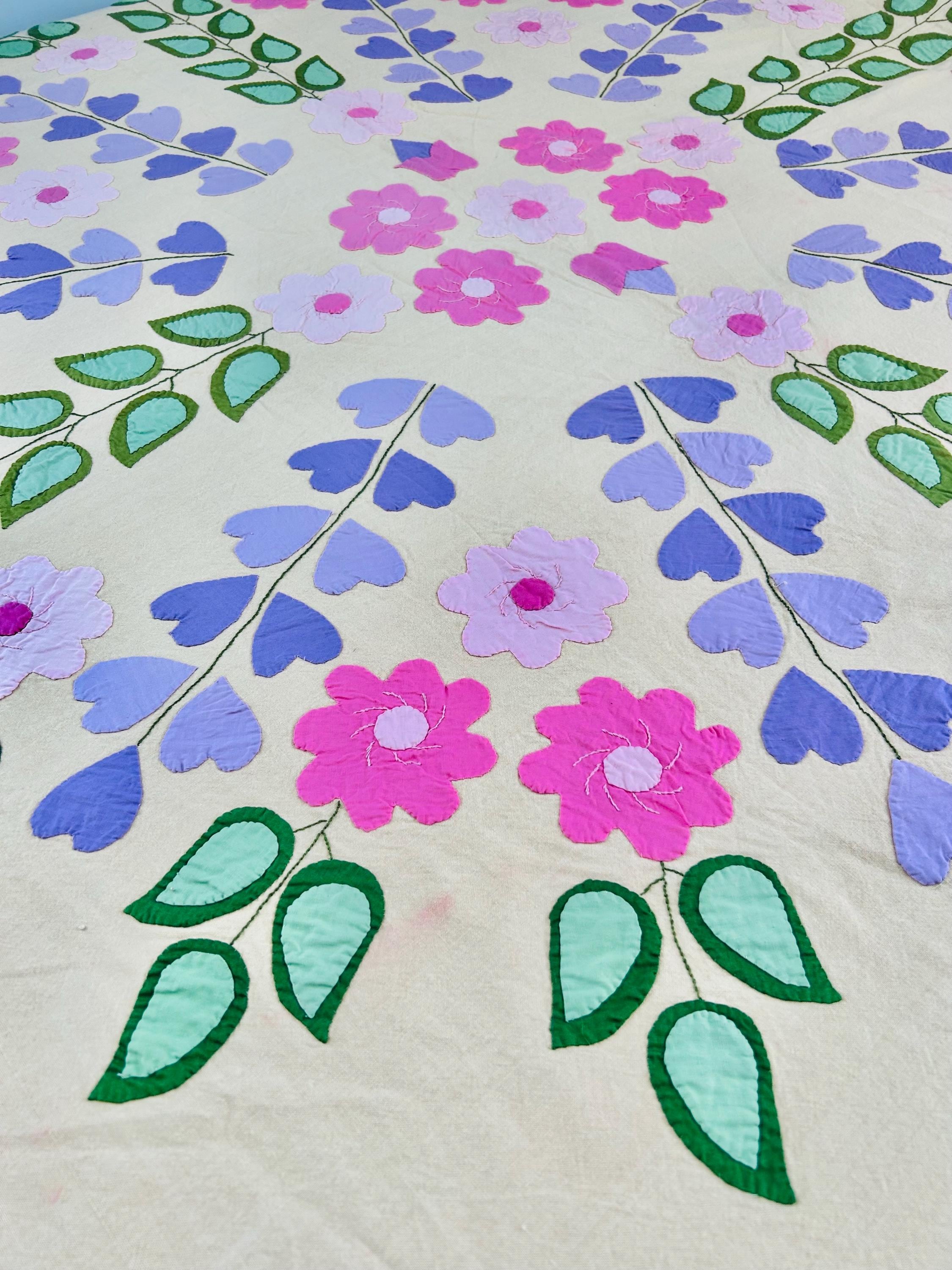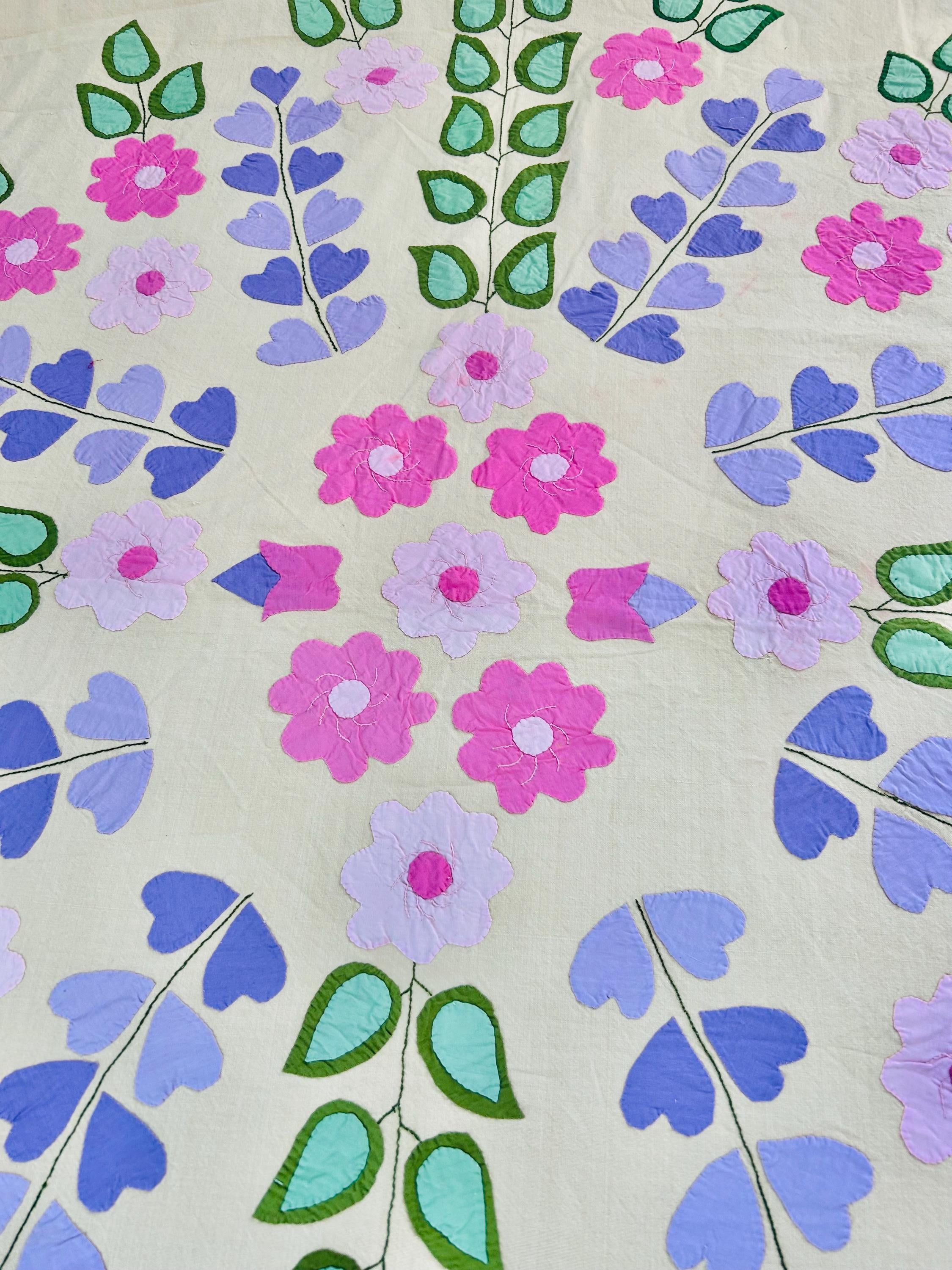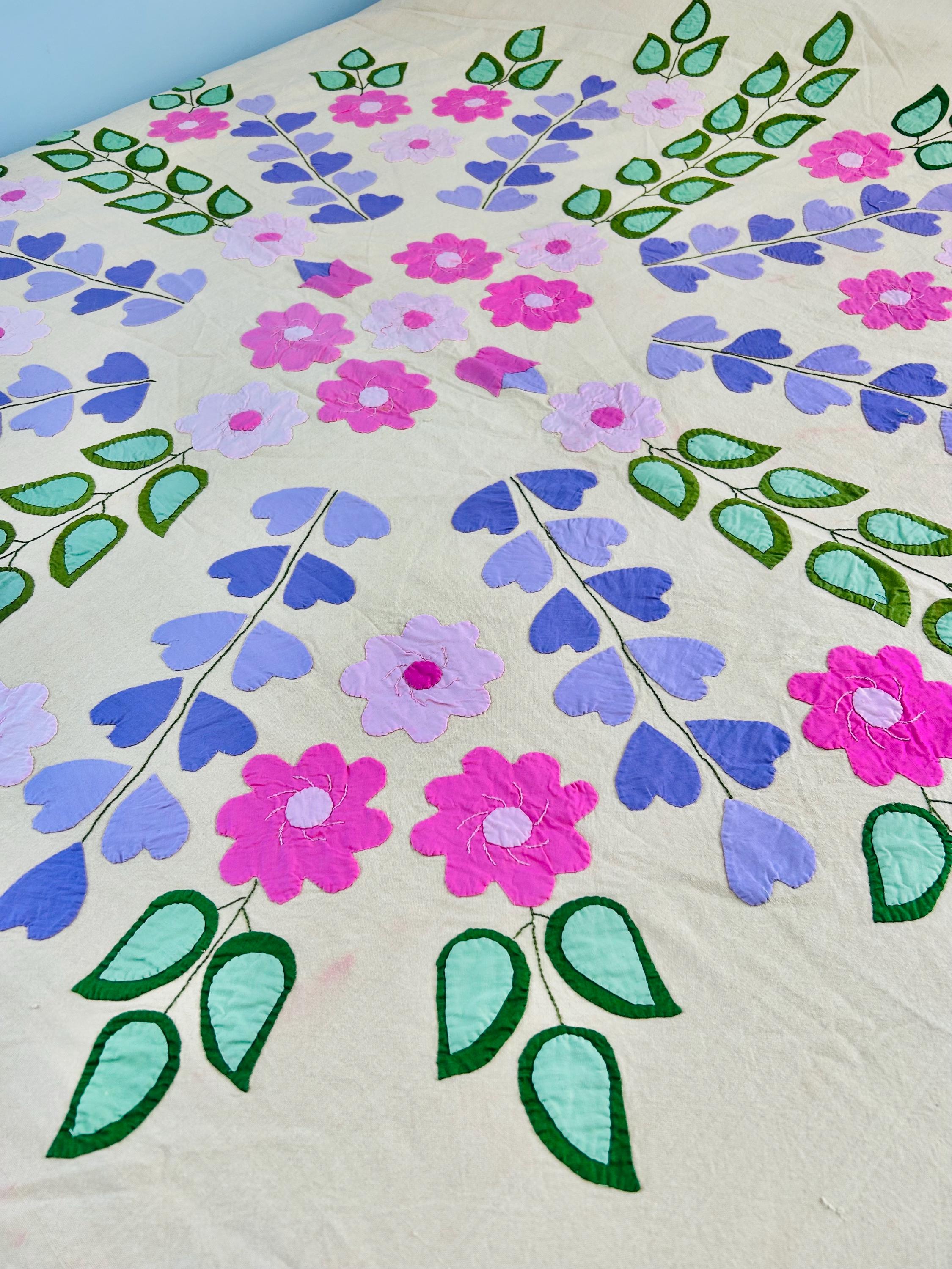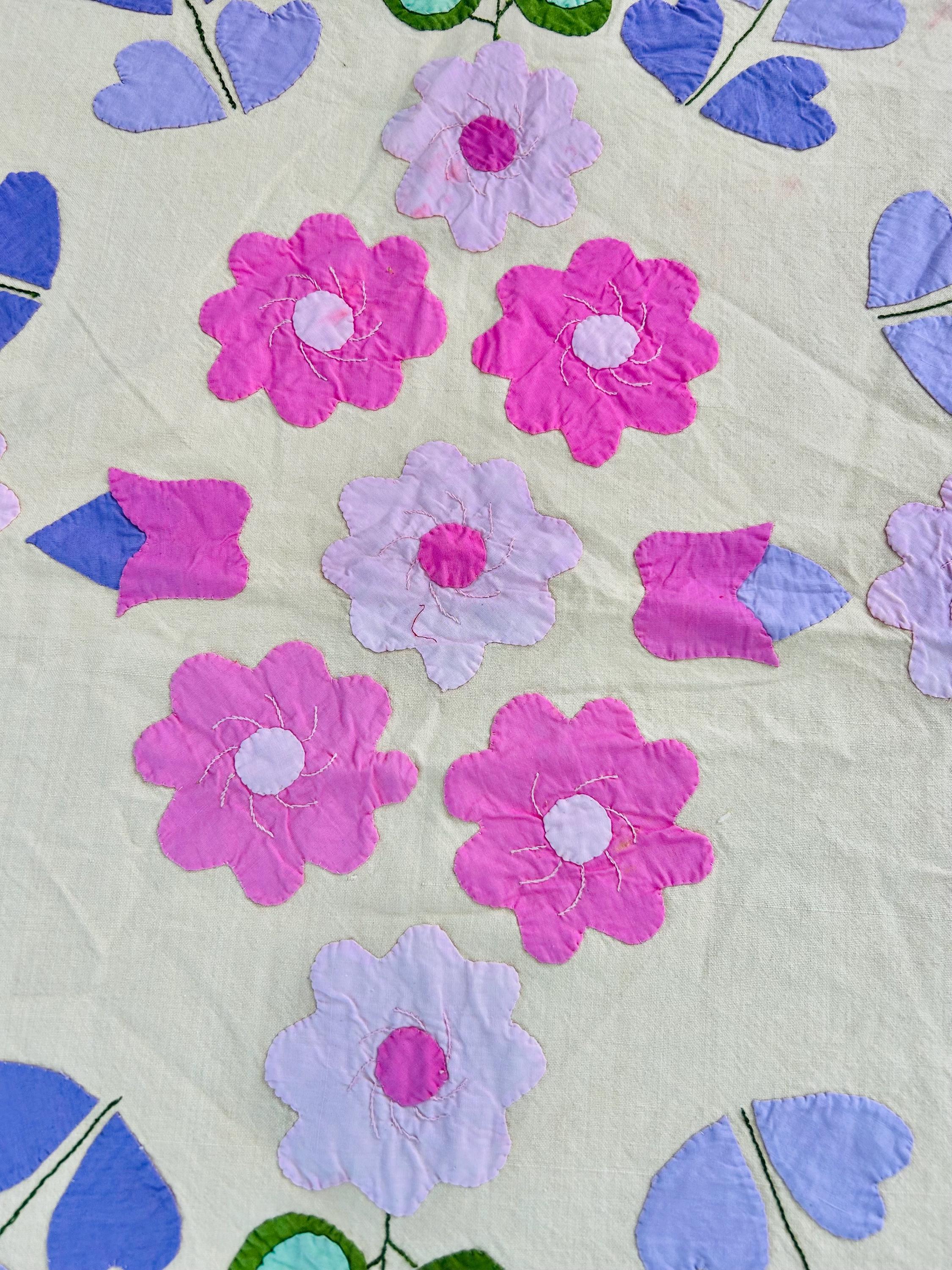 Details • Era: Circa 1930s–early 1940s • Type: Quilt top only/summer coverlet (unquilted, no batting, no back) • Size: 81” x 95” • Materials: Cotton fabrics; hand-appliquéd • Technique: Hand appliquéd with embroidered stems and details • Colors: Pink, lavender, blue, green, turquoise on natural cotton ground