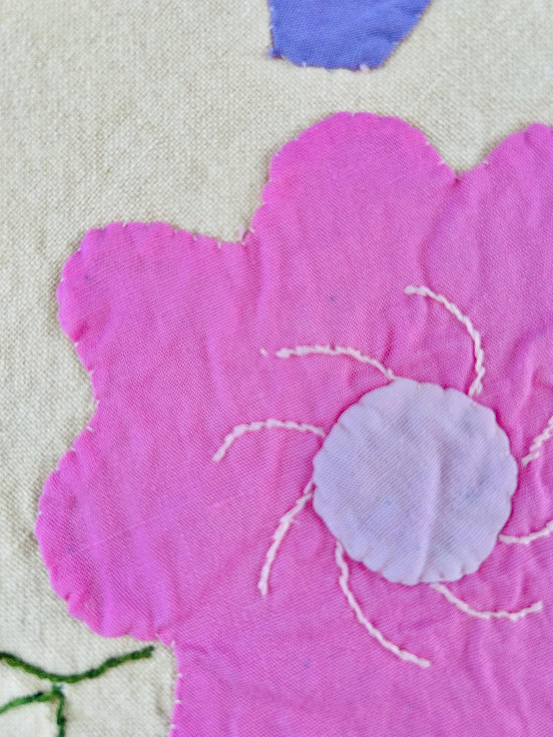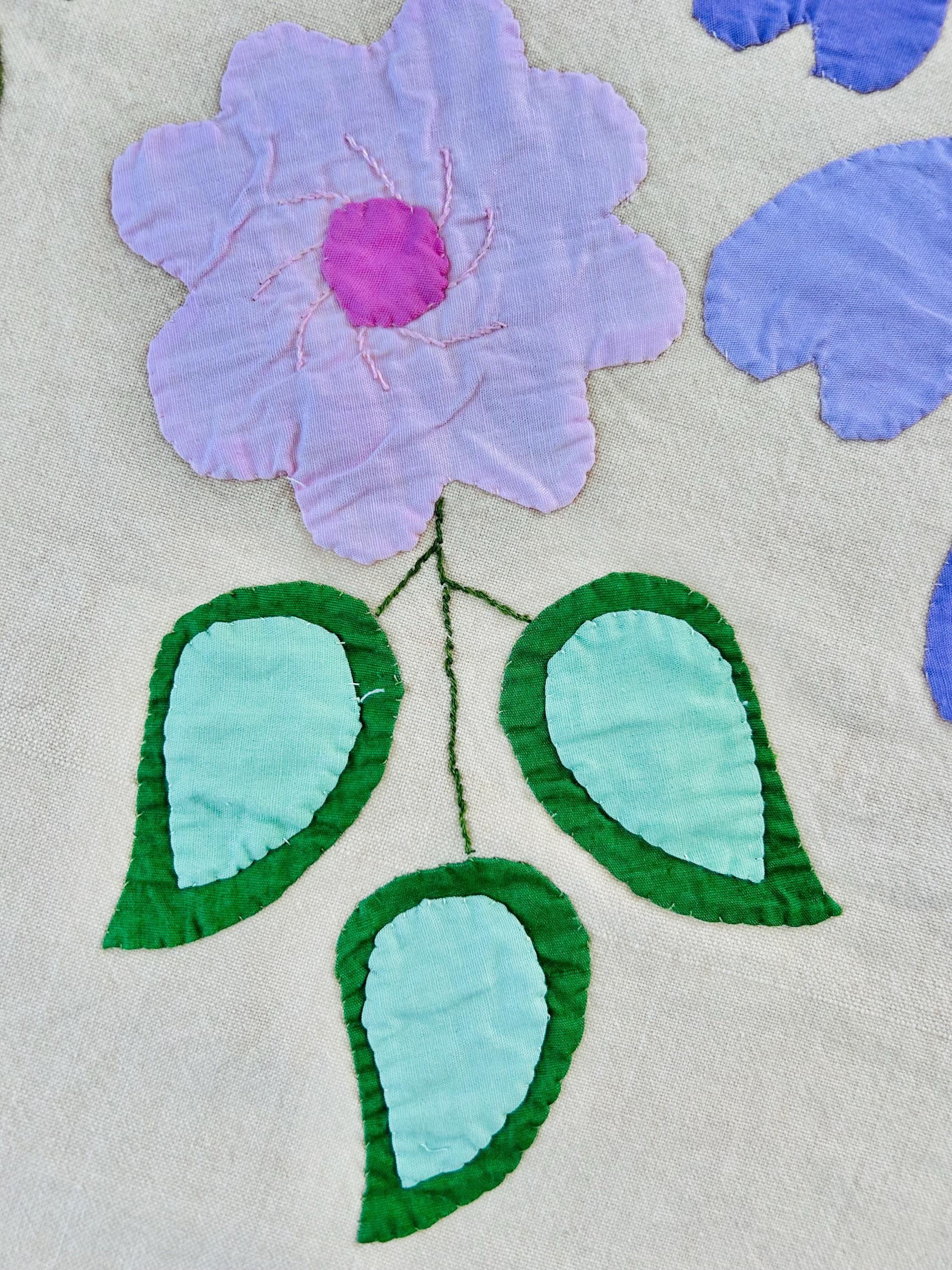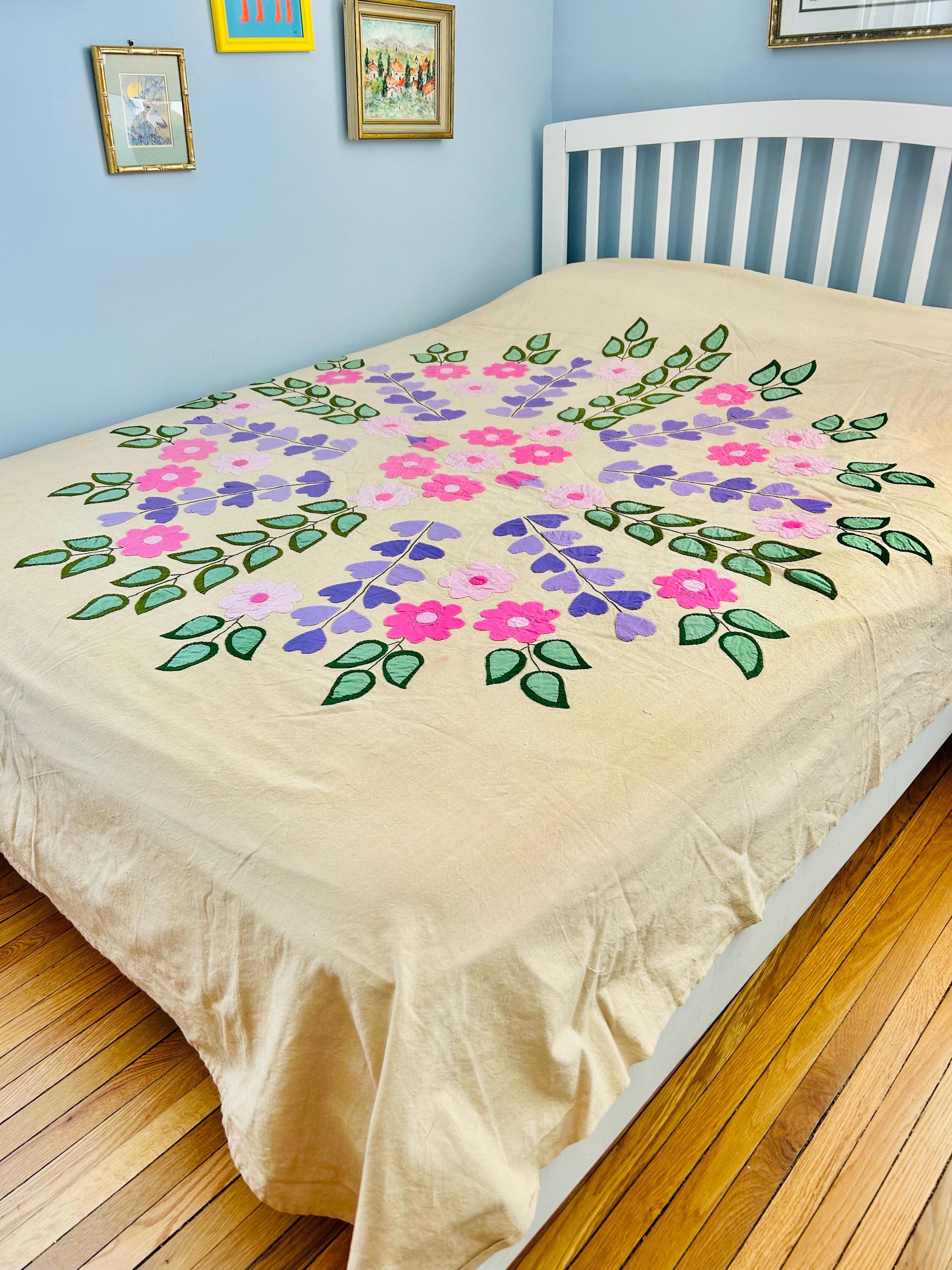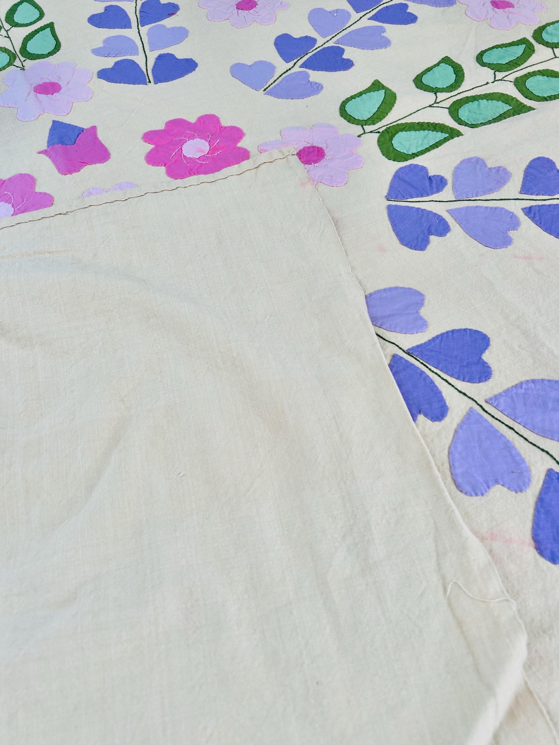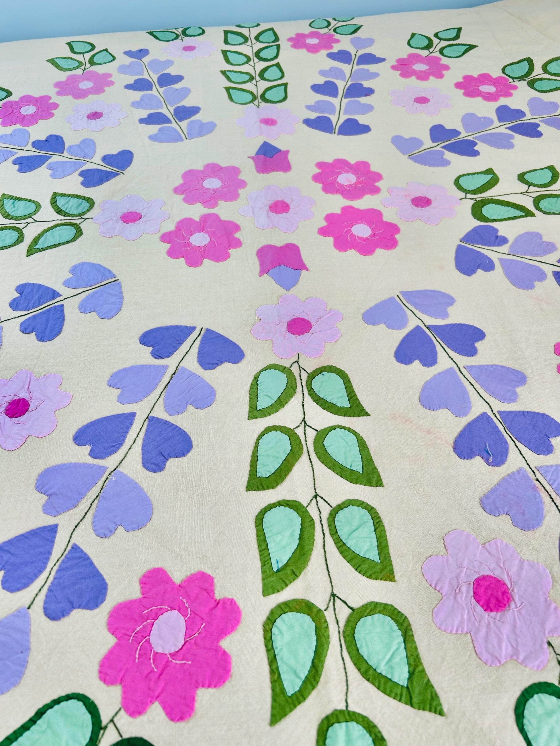 Details • Era: Circa 1930s–early 1940s • Type: Quilt top only/summer coverlet (unquilted, no batting, no back) • Size: 81” x 95” • Materials: Cotton fabrics; hand-appliquéd • Technique: Hand appliquéd with embroidered stems and details • Colors: Pink, lavender, blue, green, turquoise on natural cotton ground