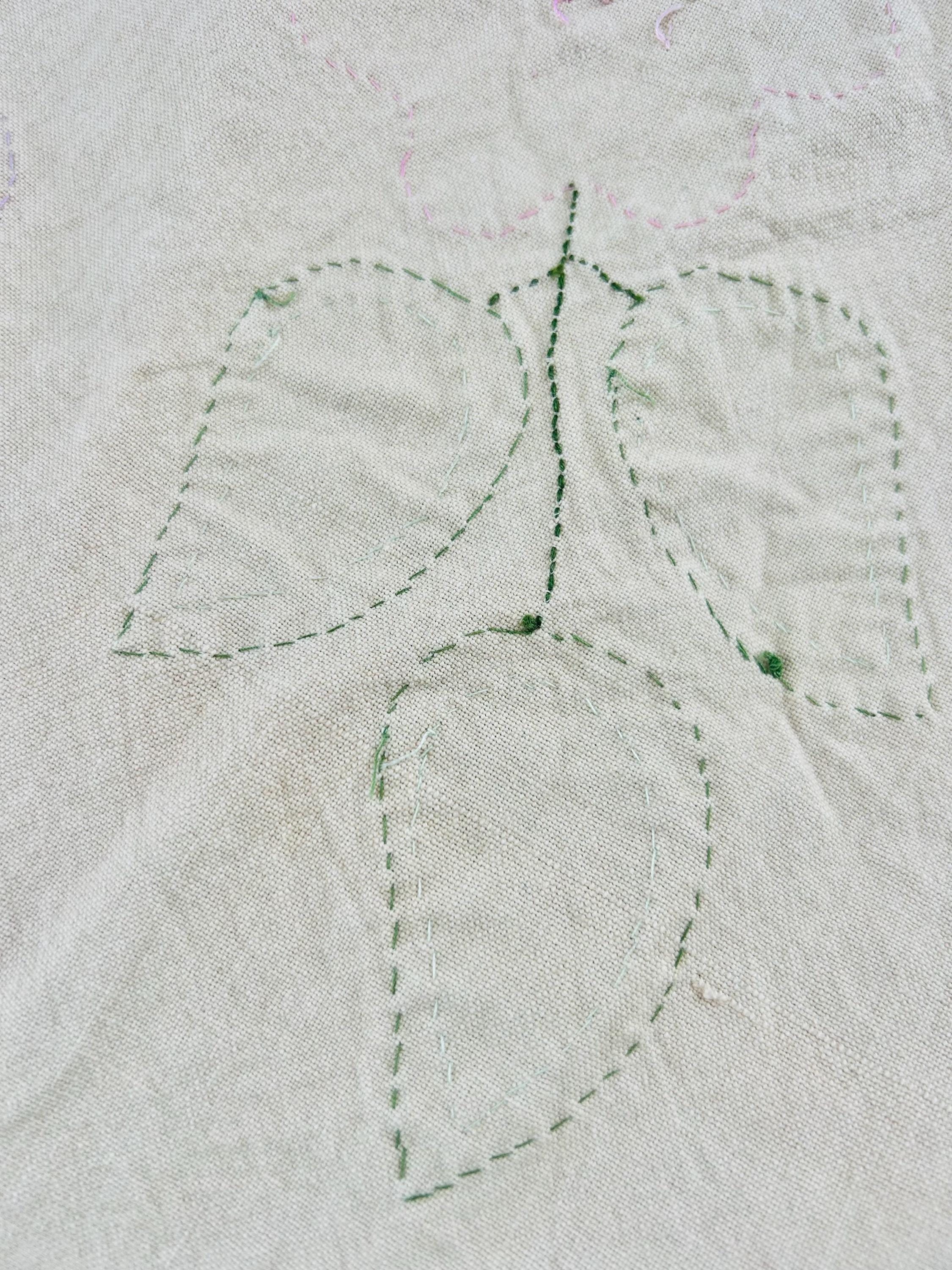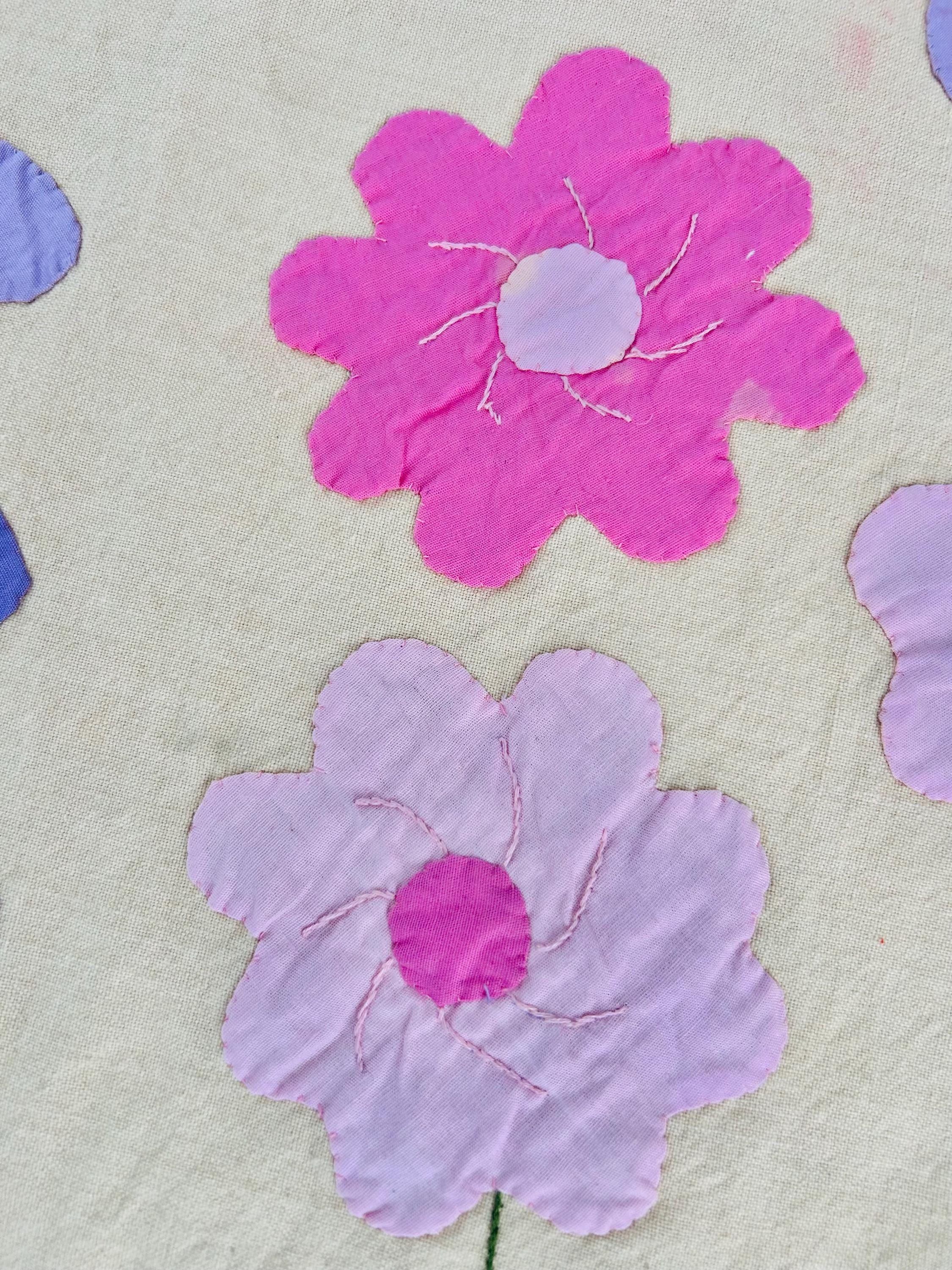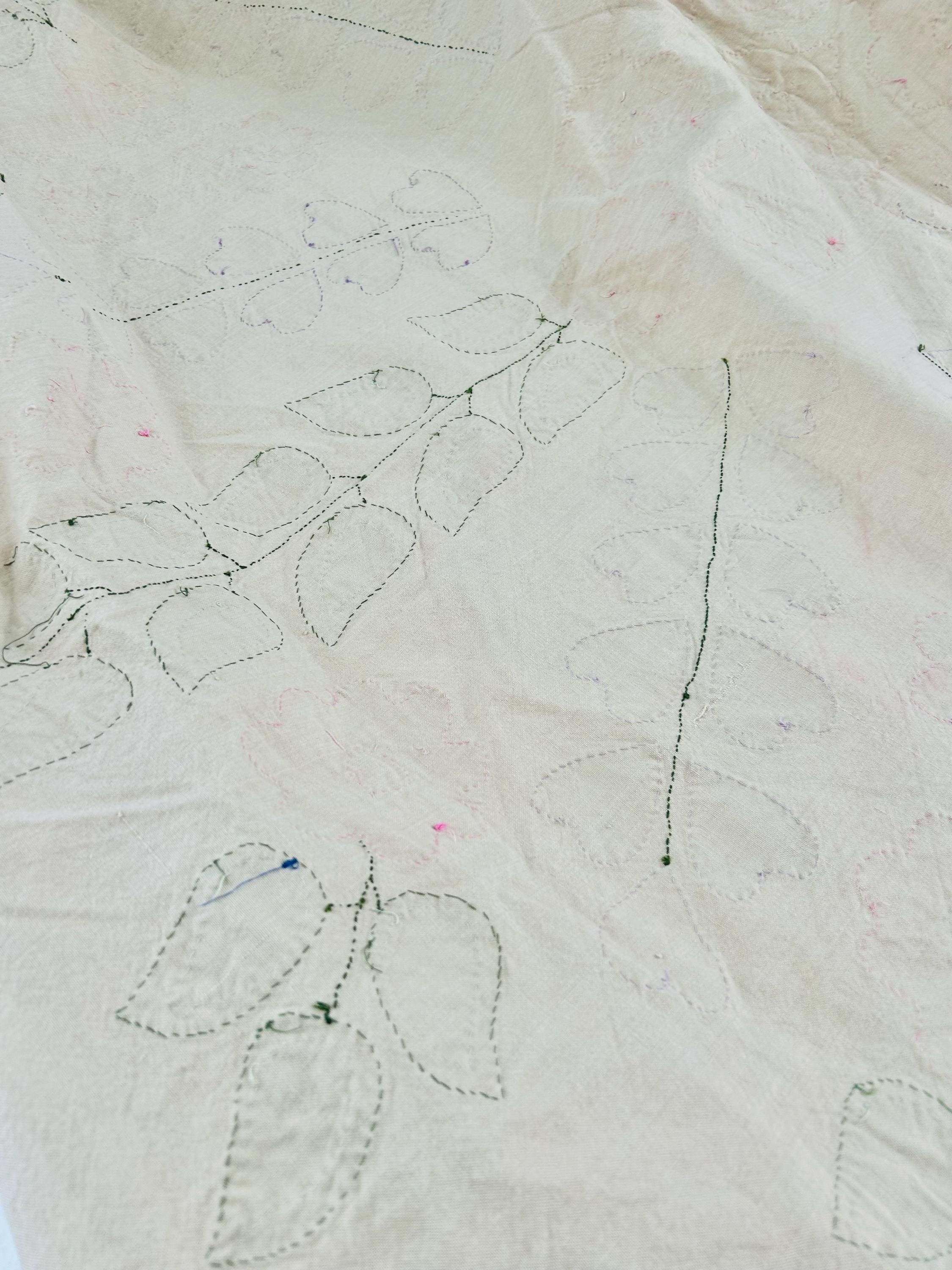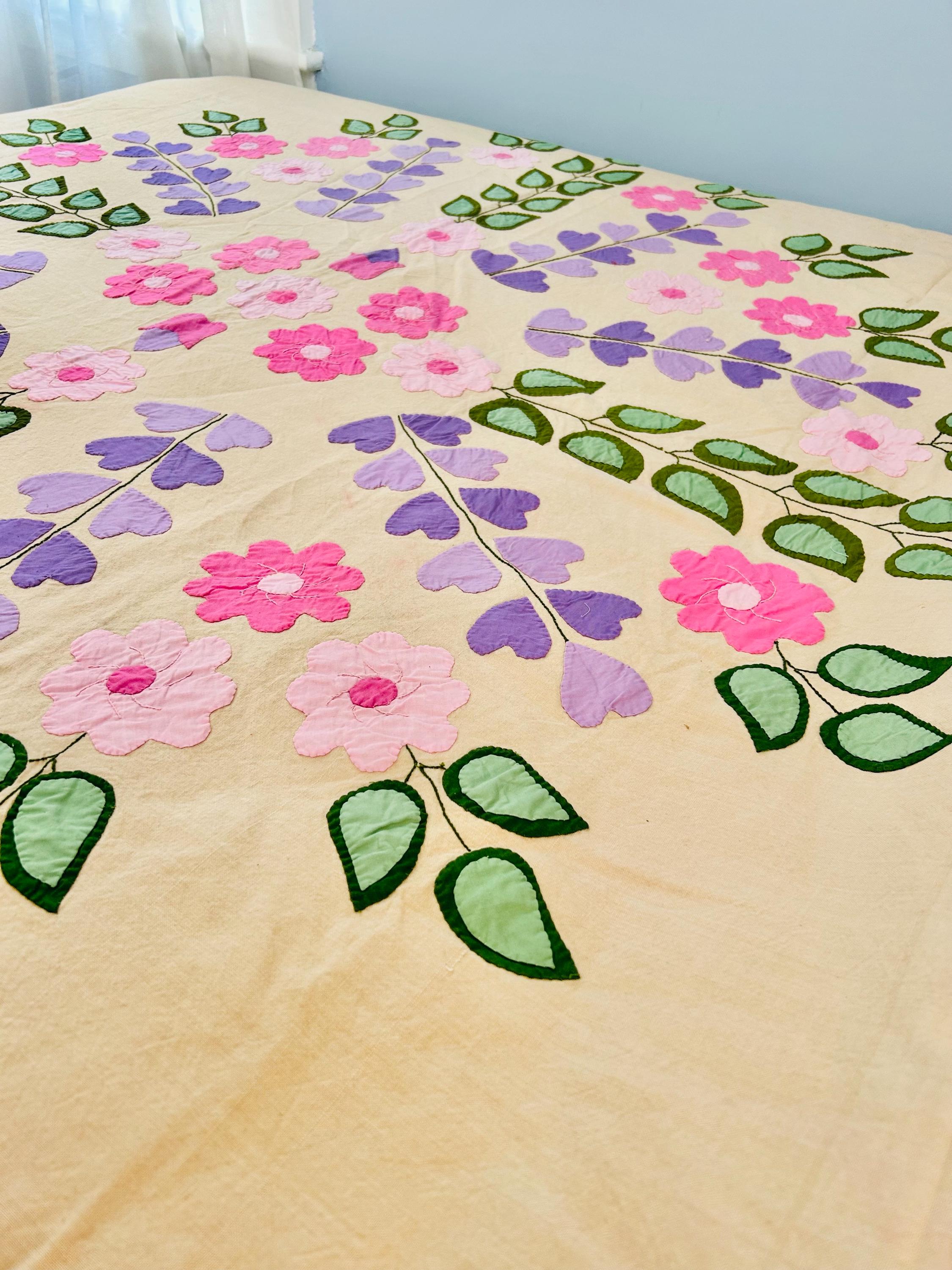 Details • Era: Circa 1930s–early 1940s • Type: Quilt top only/summer coverlet (unquilted, no batting, no back) • Size: 81” x 95” • Materials: Cotton fabrics; hand-appliquéd • Technique: Hand appliquéd with embroidered stems and details • Colors: Pink, lavender, blue, green, turquoise on natural cotton ground