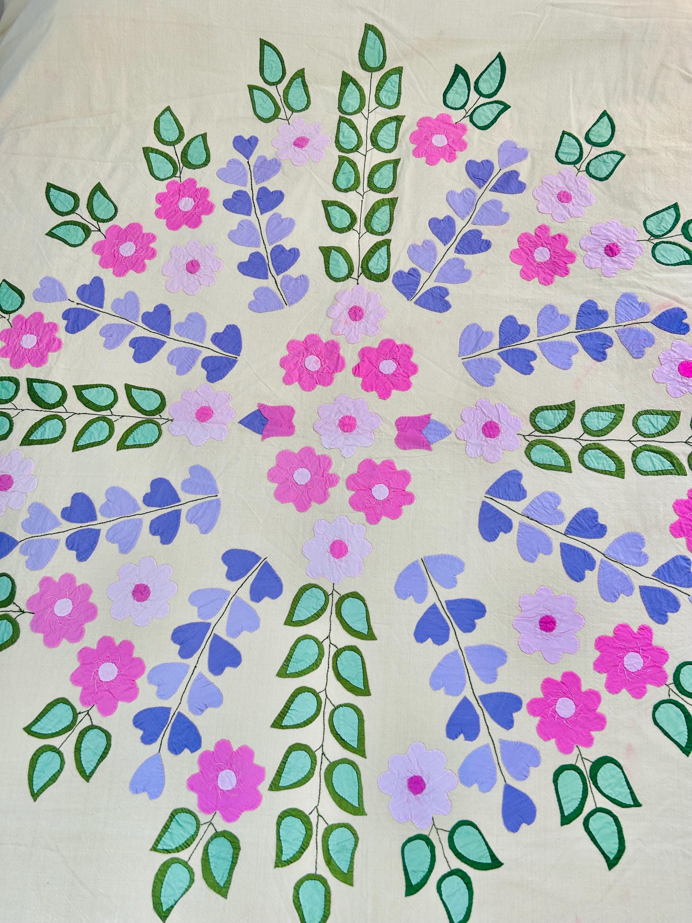 This is a vibrant 1930s–early 1940s Vintage Flower Medallion quilt top/summer coverlet and a wonderful example of Depression-era floral appliqué, which in this case is in a palette of hot pink, lavender, periwinkle blue, turquoise, and rich green on a soft natural cotton ground.