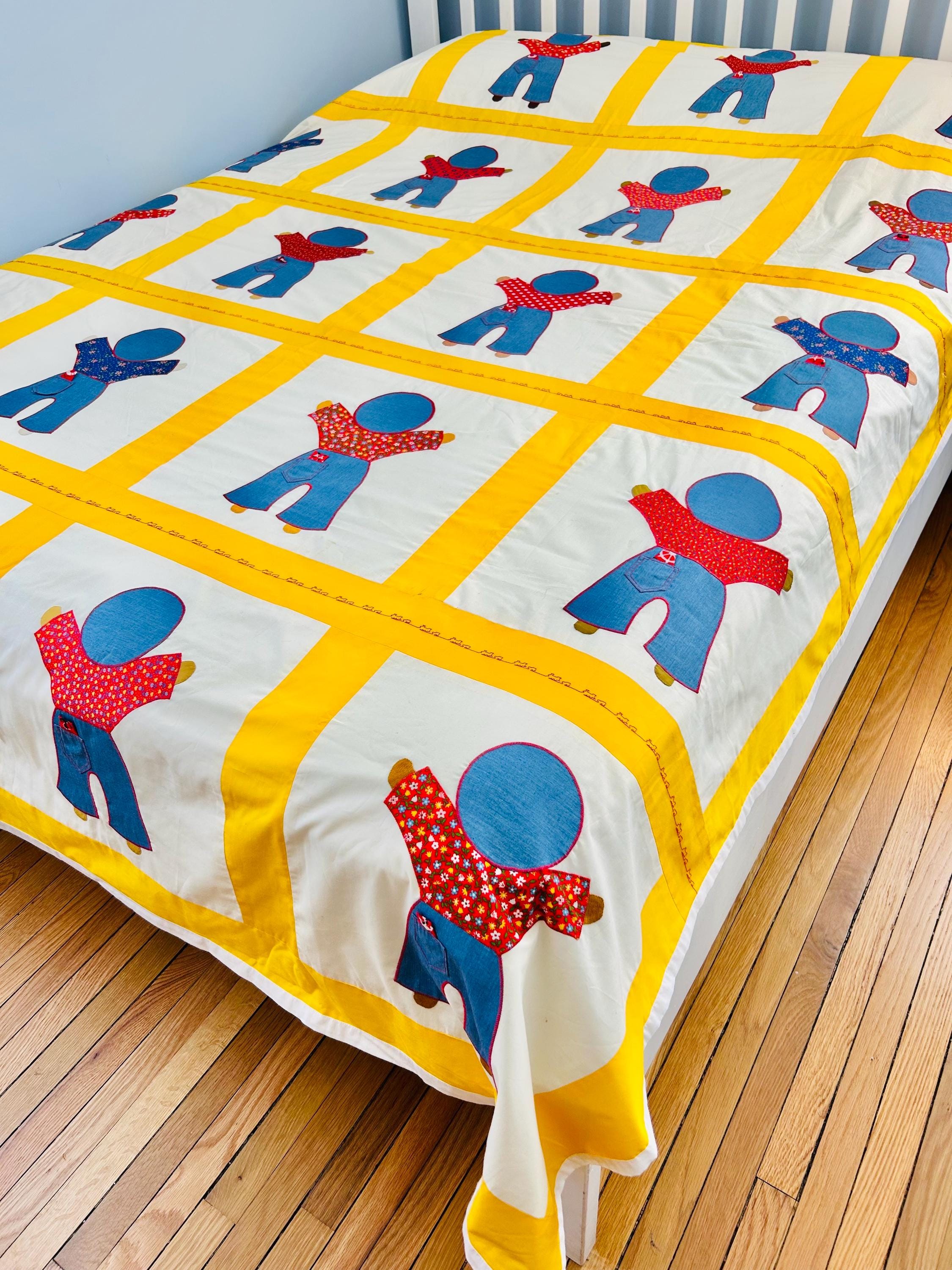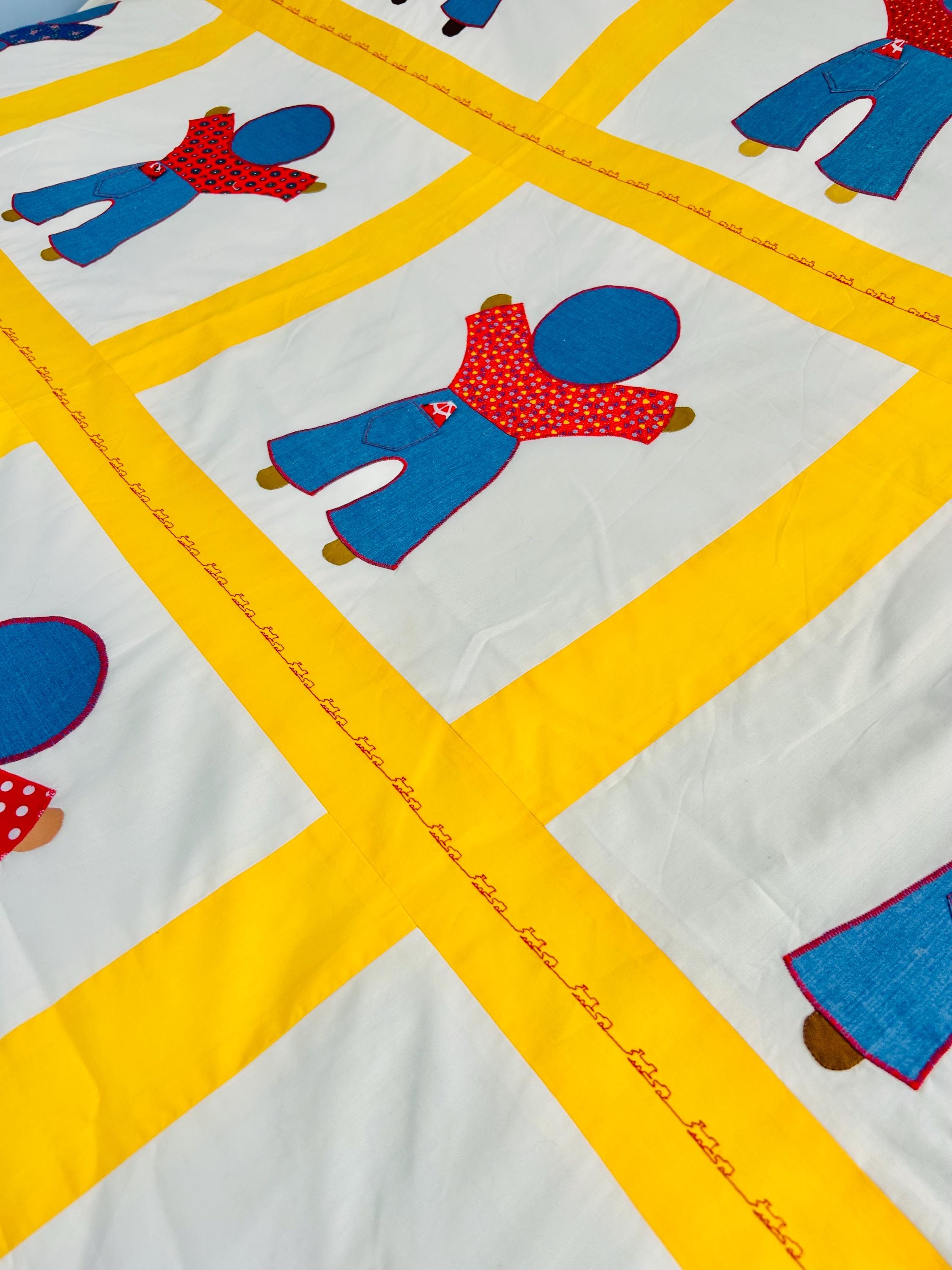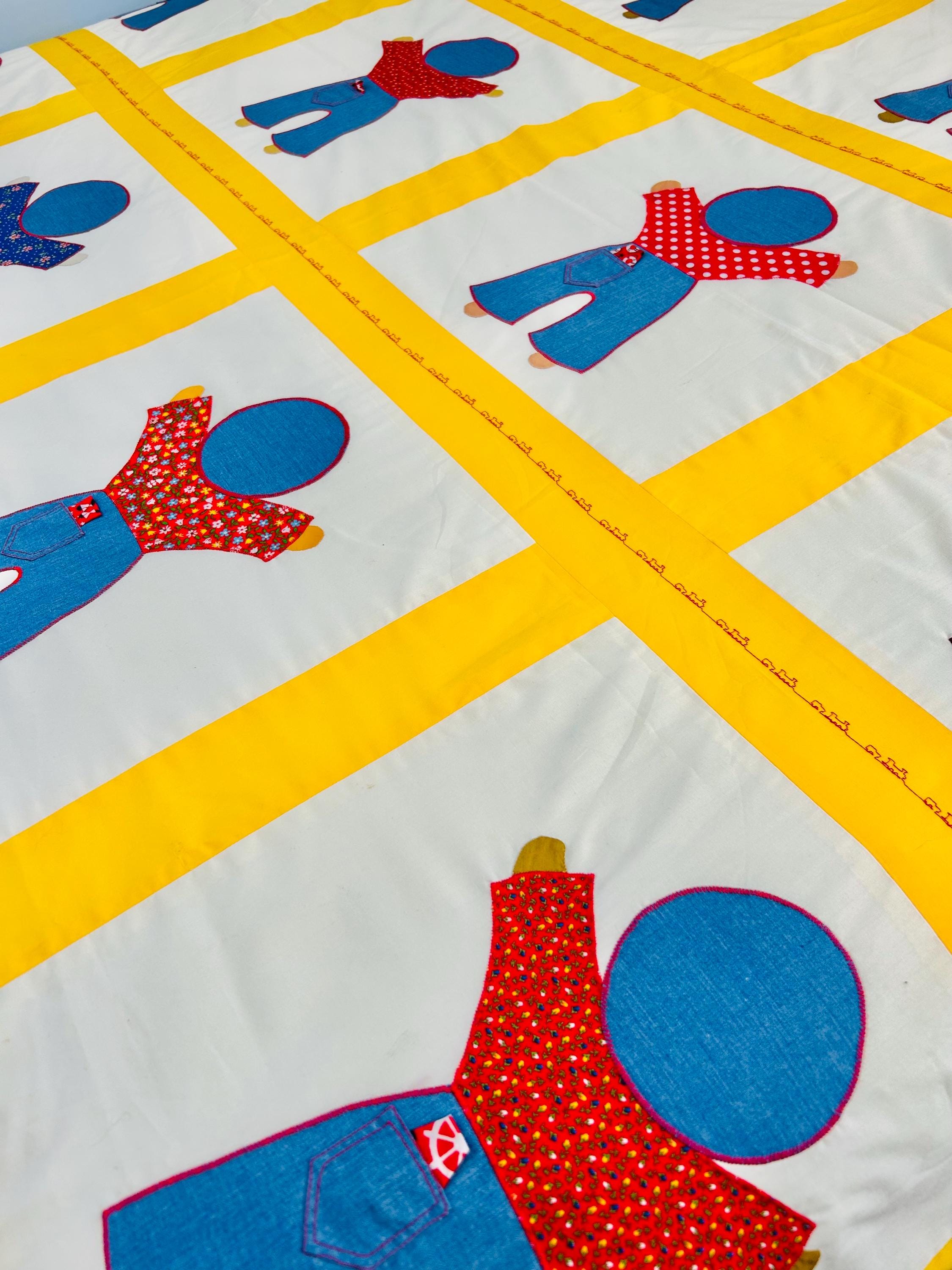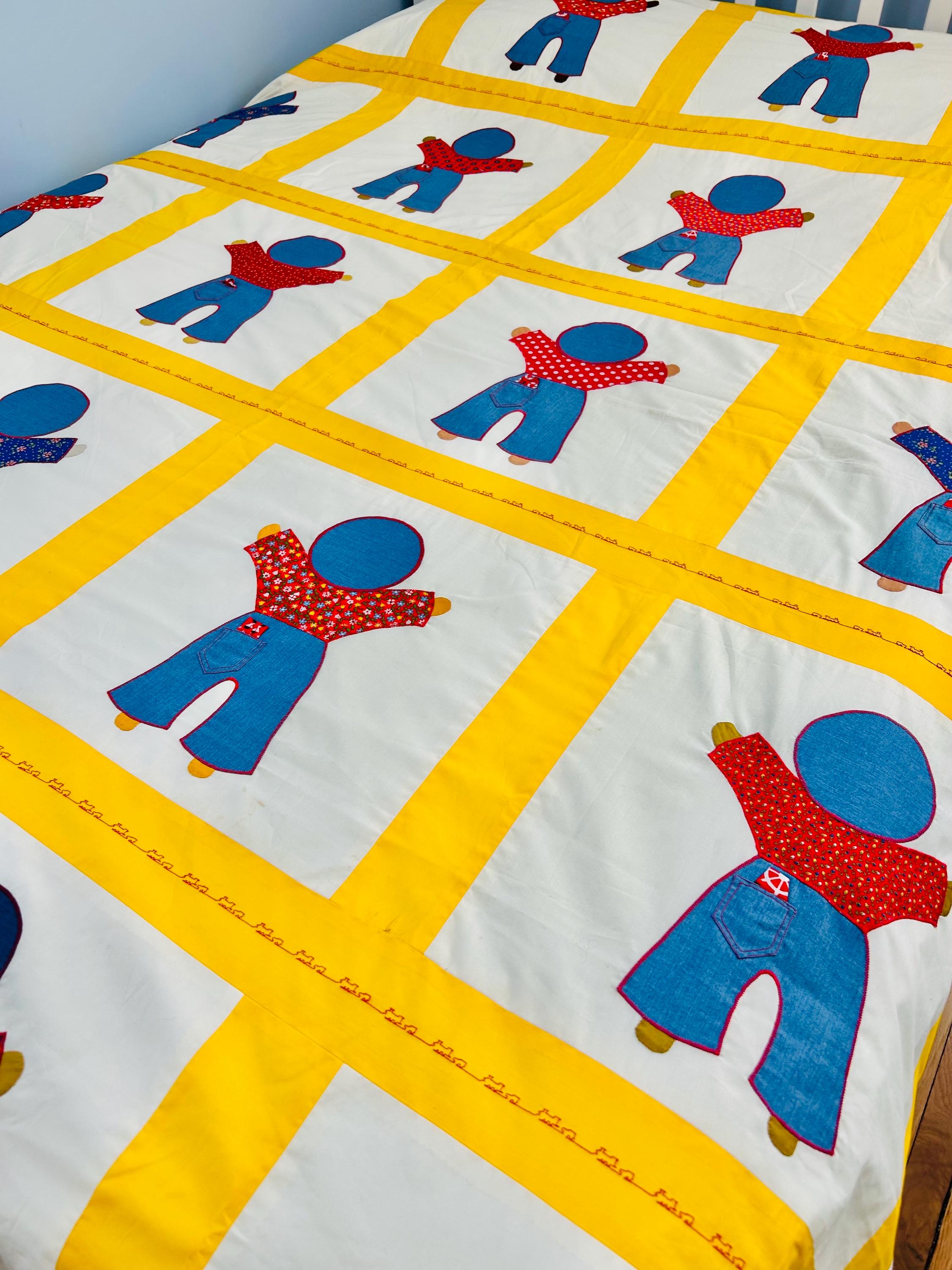 A joyful and graphic mid-century Overall Sam summer coverlet, featuring cheerful Overall Sam figures dressed in denim blue overalls with different patterned shirts, framed by bright yellow sashing. Each figure is individually appliquéd and has details like pockets and handkerchiefs and other tiny accents. The horizontal sashing has also been embroidered in red with a very tiny train and car motif. See photos.