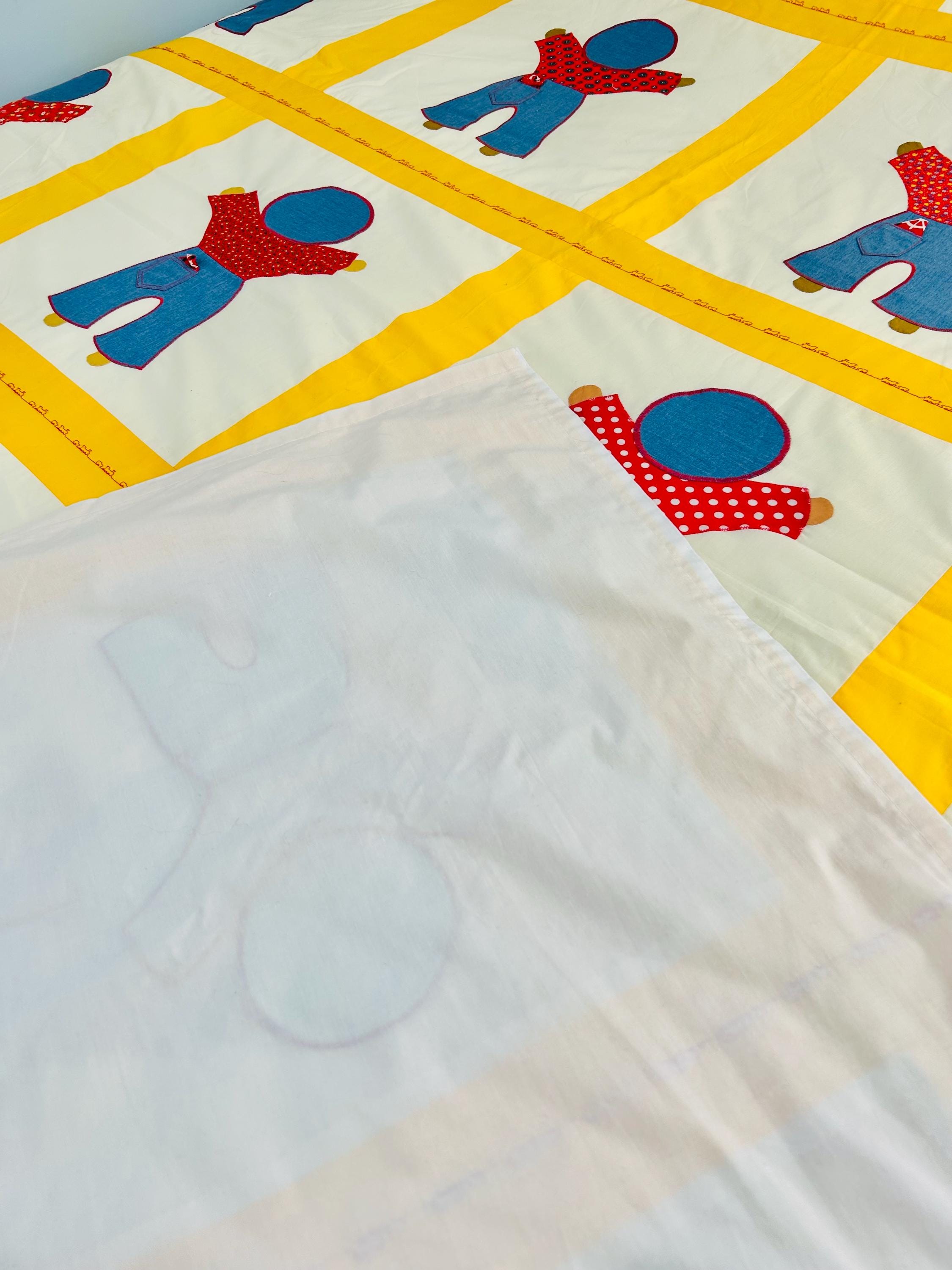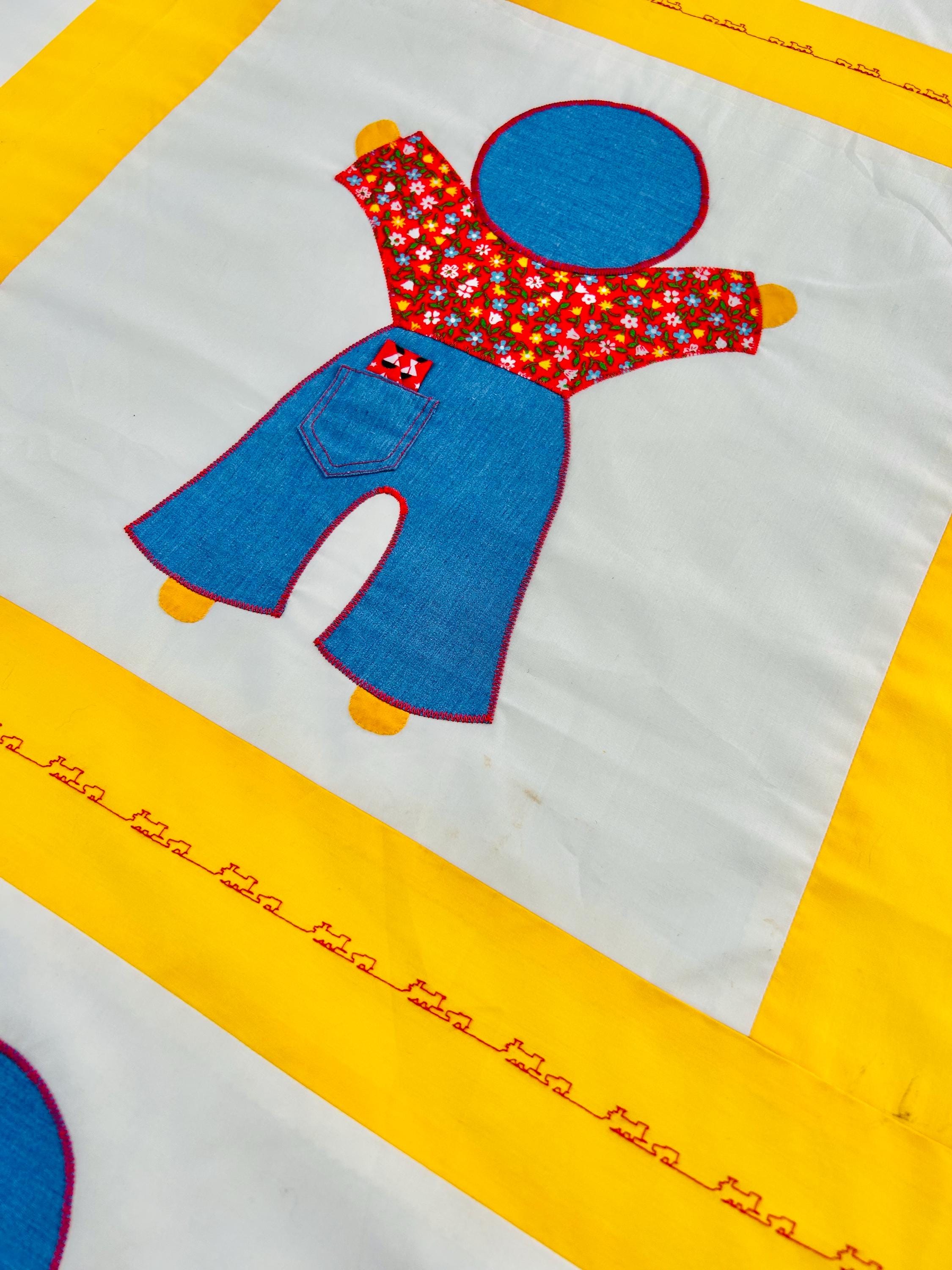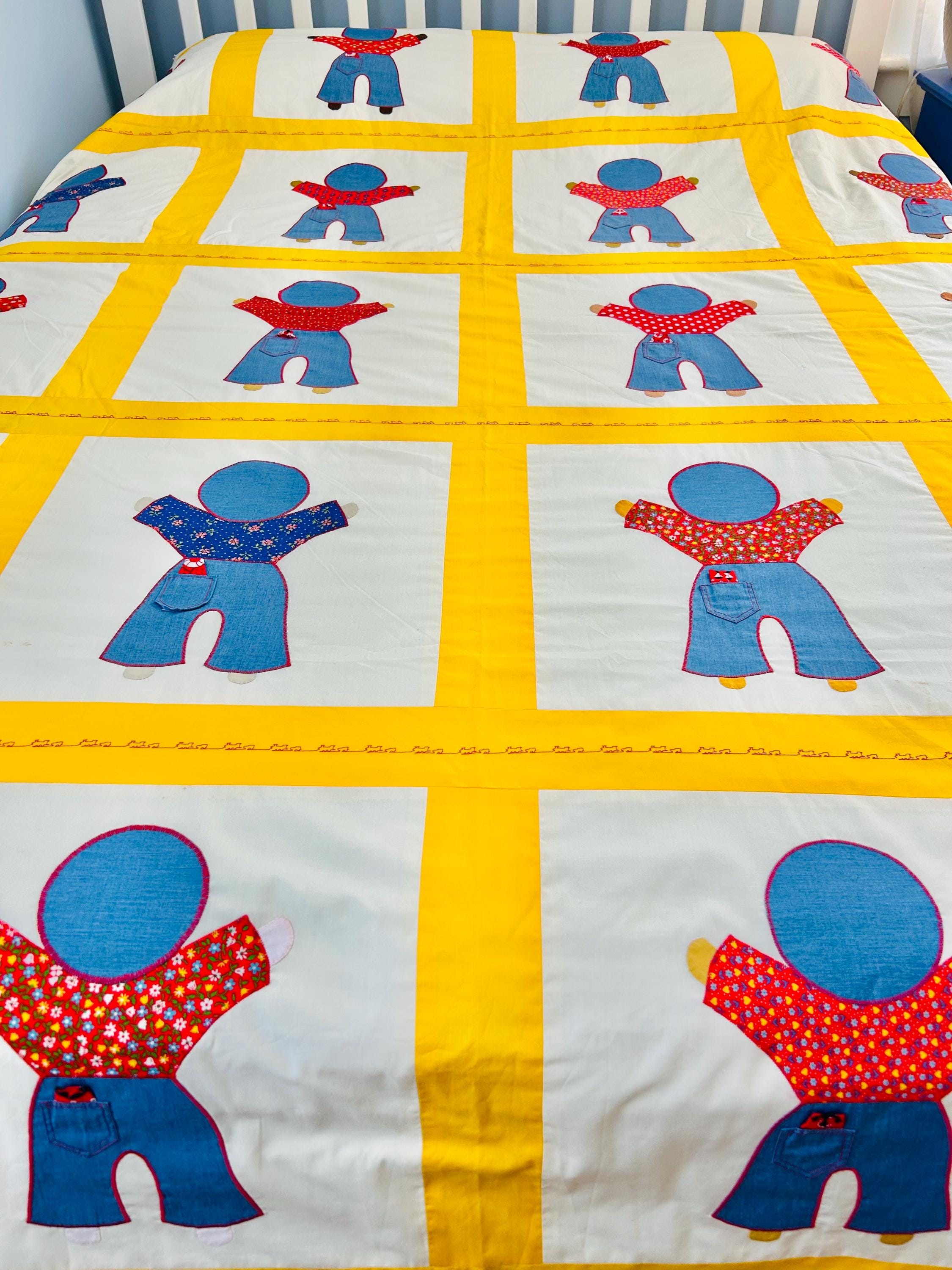 A joyful and graphic mid-century Overall Sam summer coverlet, featuring cheerful Overall Sam figures dressed in denim blue overalls with different patterned shirts, framed by bright yellow sashing. Each figure is individually appliquéd and has details like pockets and handkerchiefs and other tiny accents. The horizontal sashing has also been embroidered in red with a very tiny train and car motif. See photos.