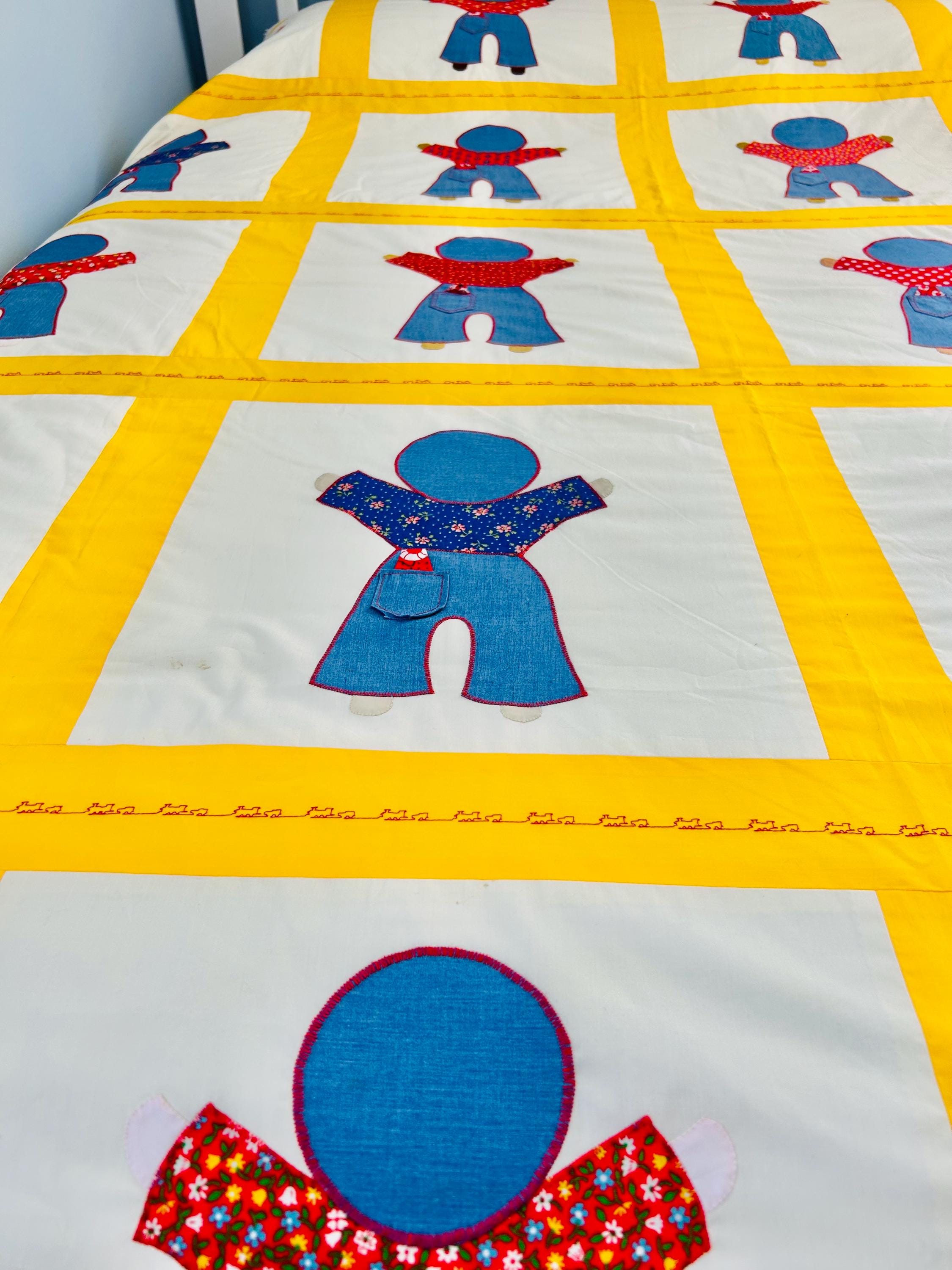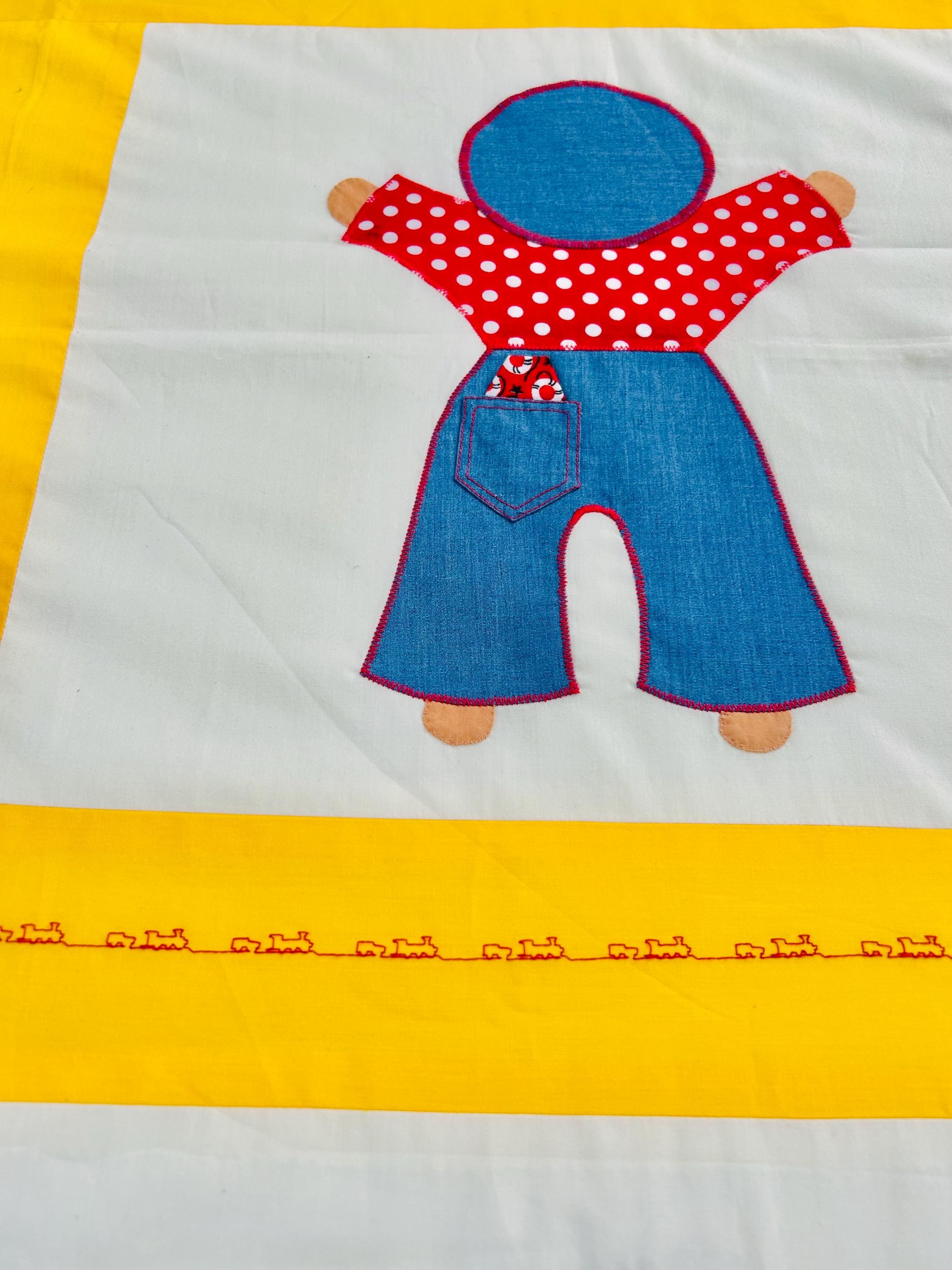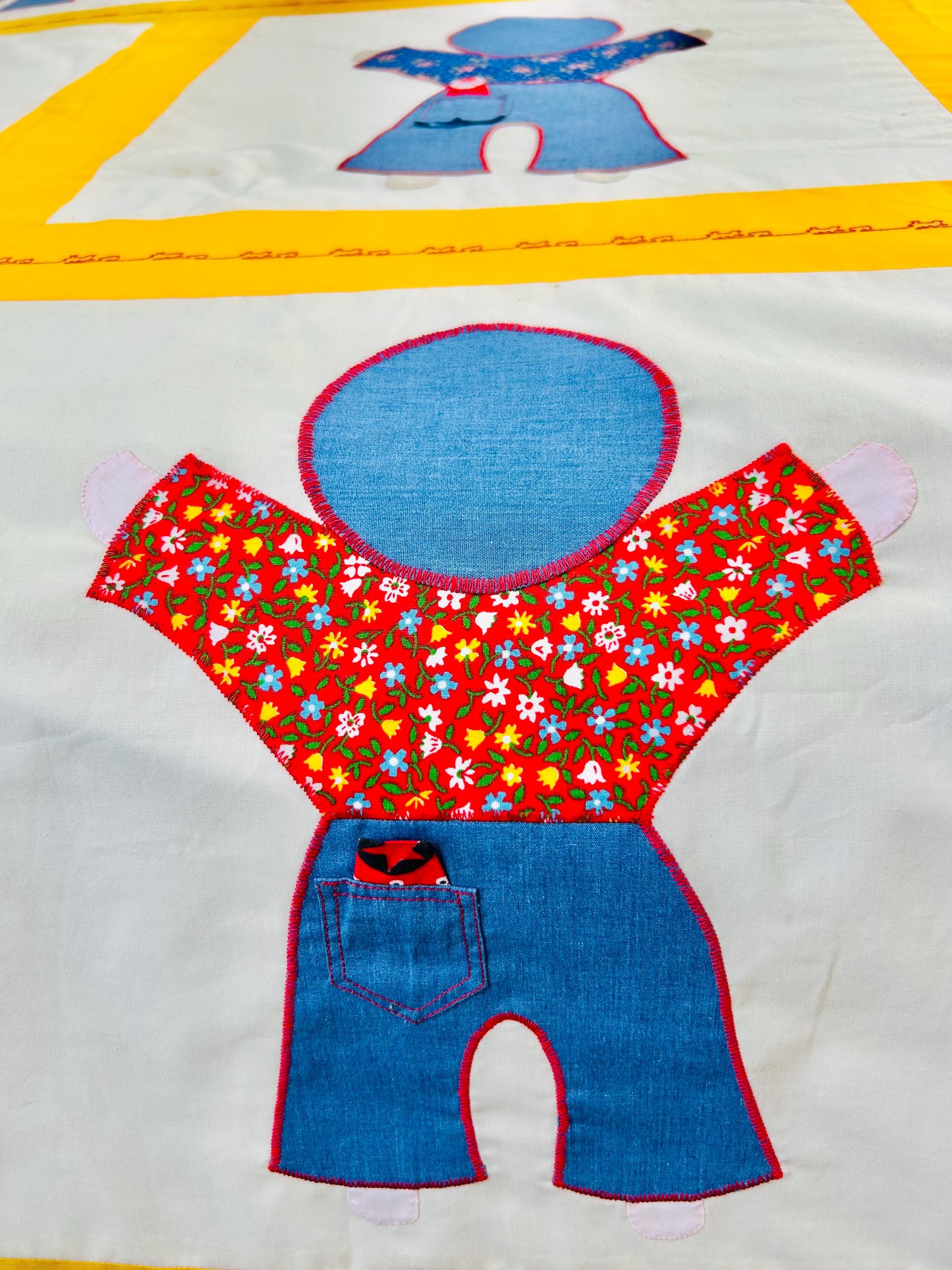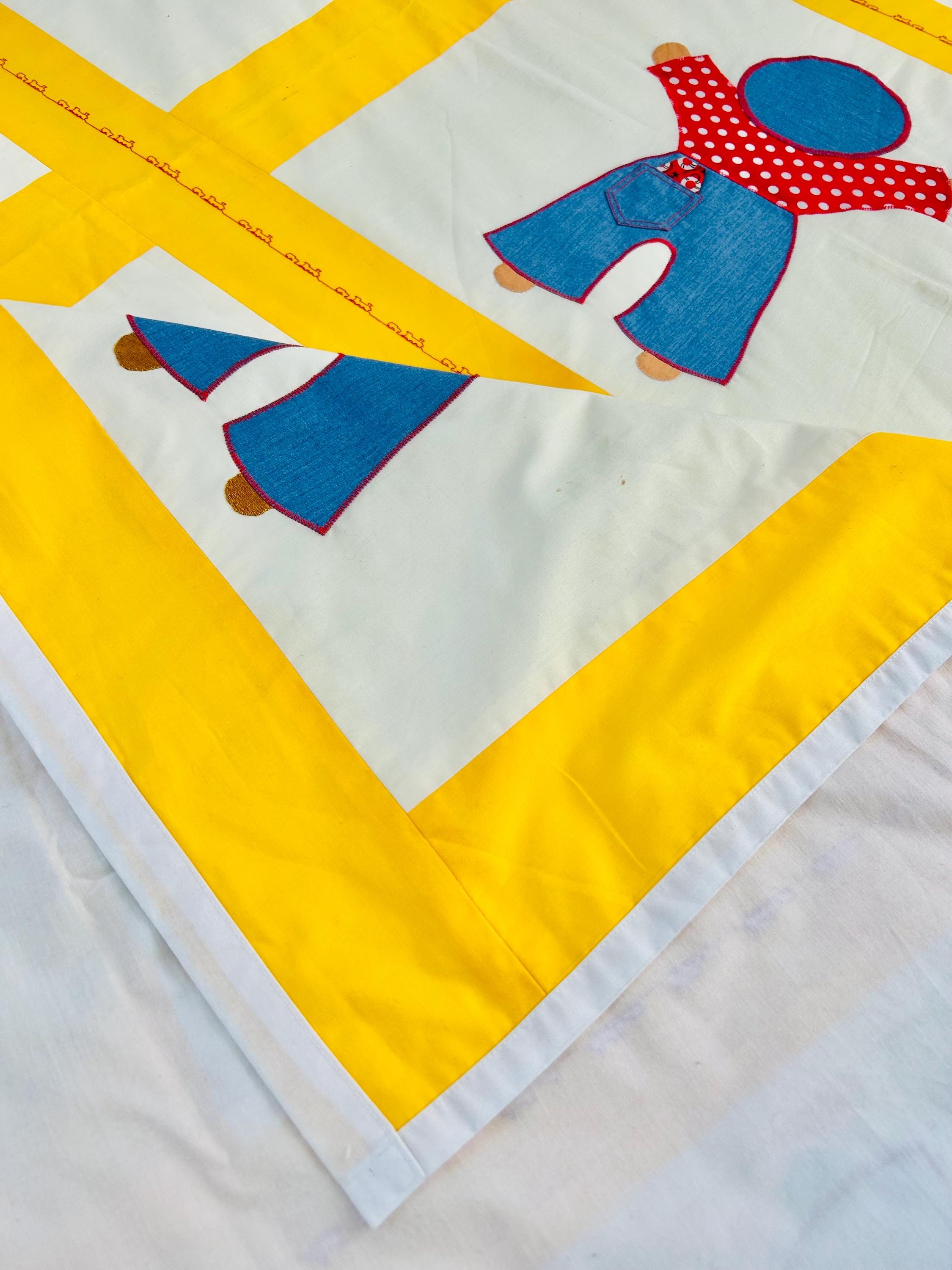 A joyful and graphic mid-century Overall Sam summer coverlet, featuring cheerful Overall Sam figures dressed in denim blue overalls with different patterned shirts, framed by bright yellow sashing. Each figure is individually appliquéd and has details like pockets and handkerchiefs and other tiny accents. The horizontal sashing has also been embroidered in red with a very tiny train and car motif. See photos.
