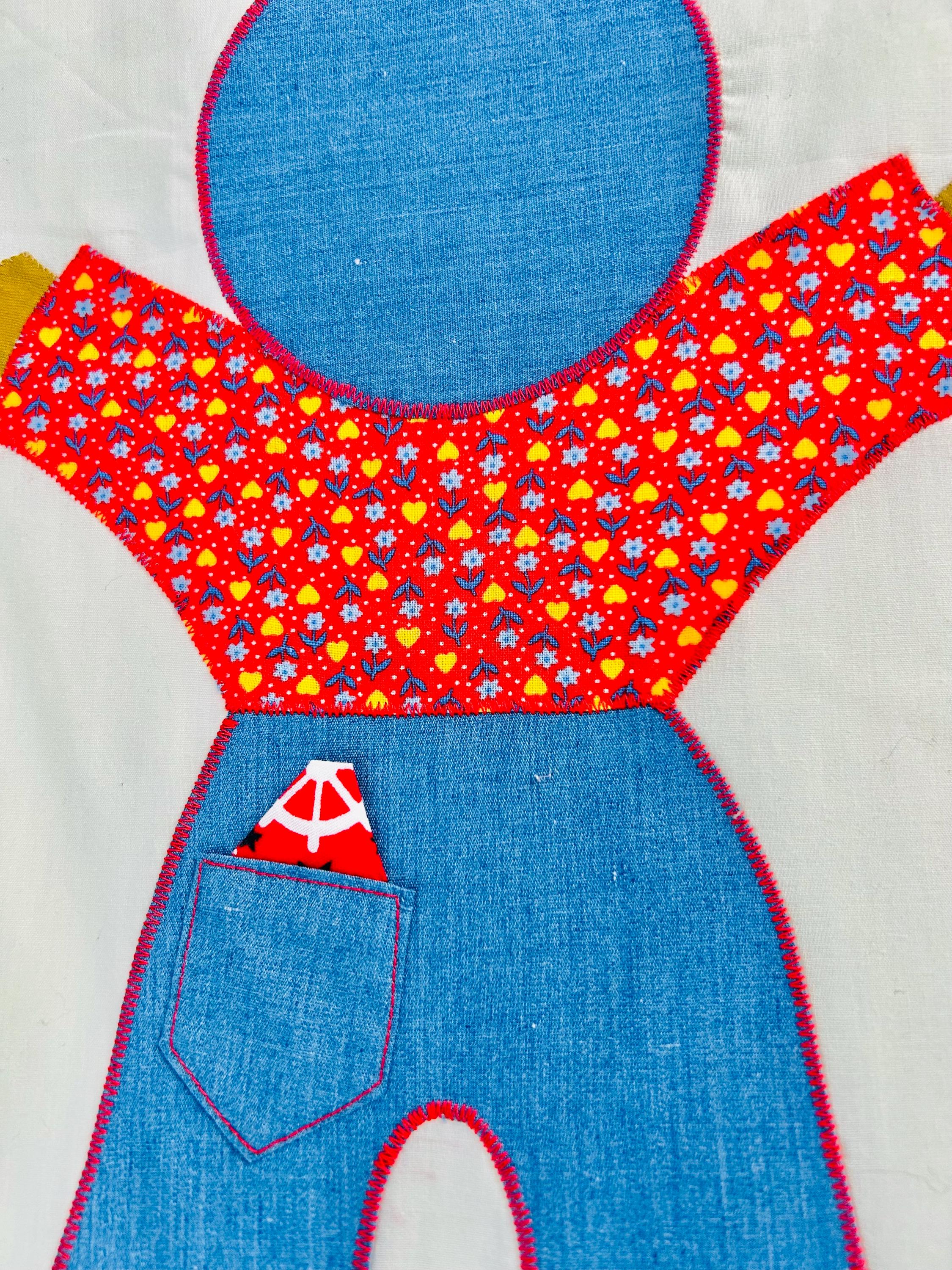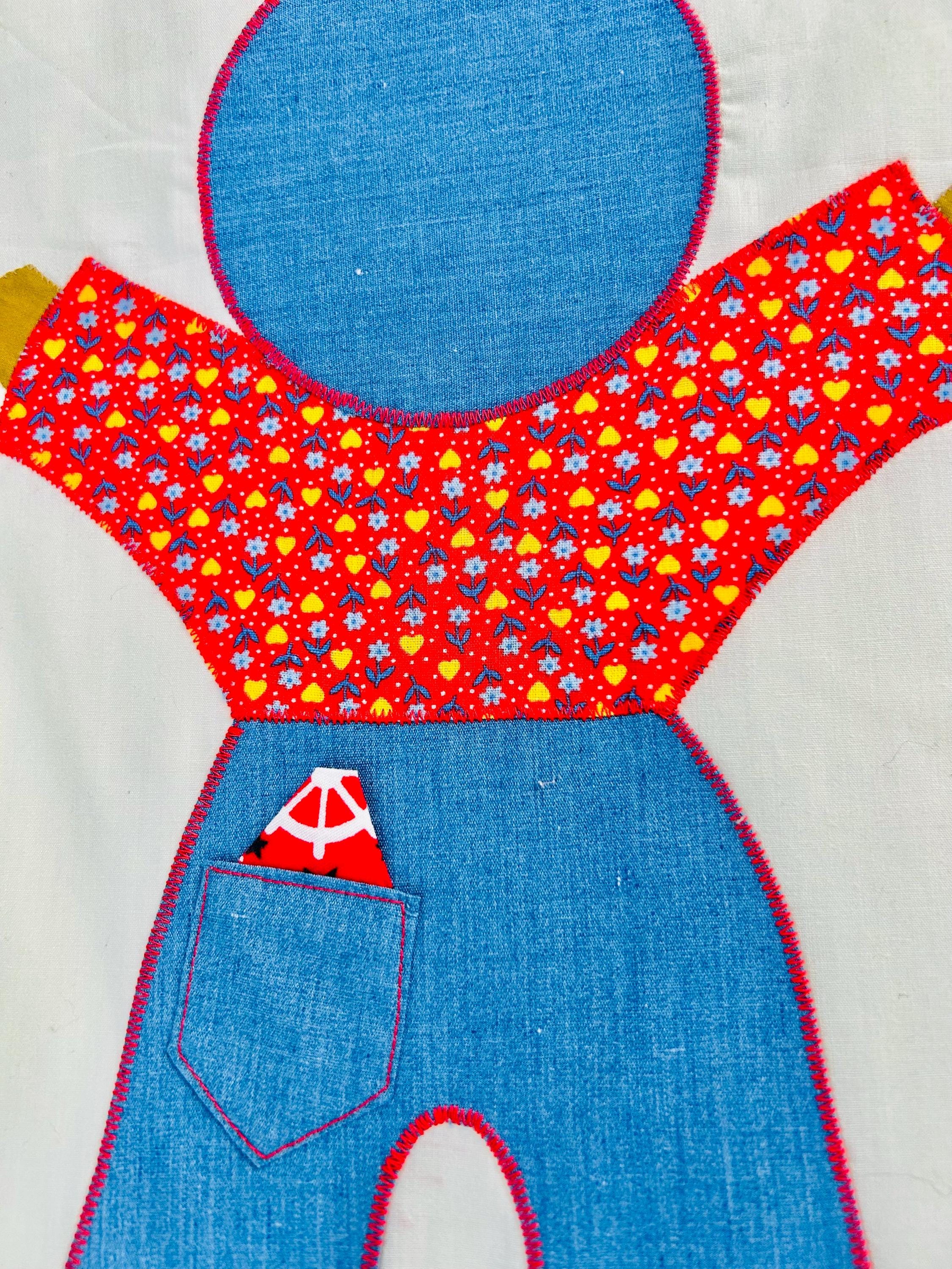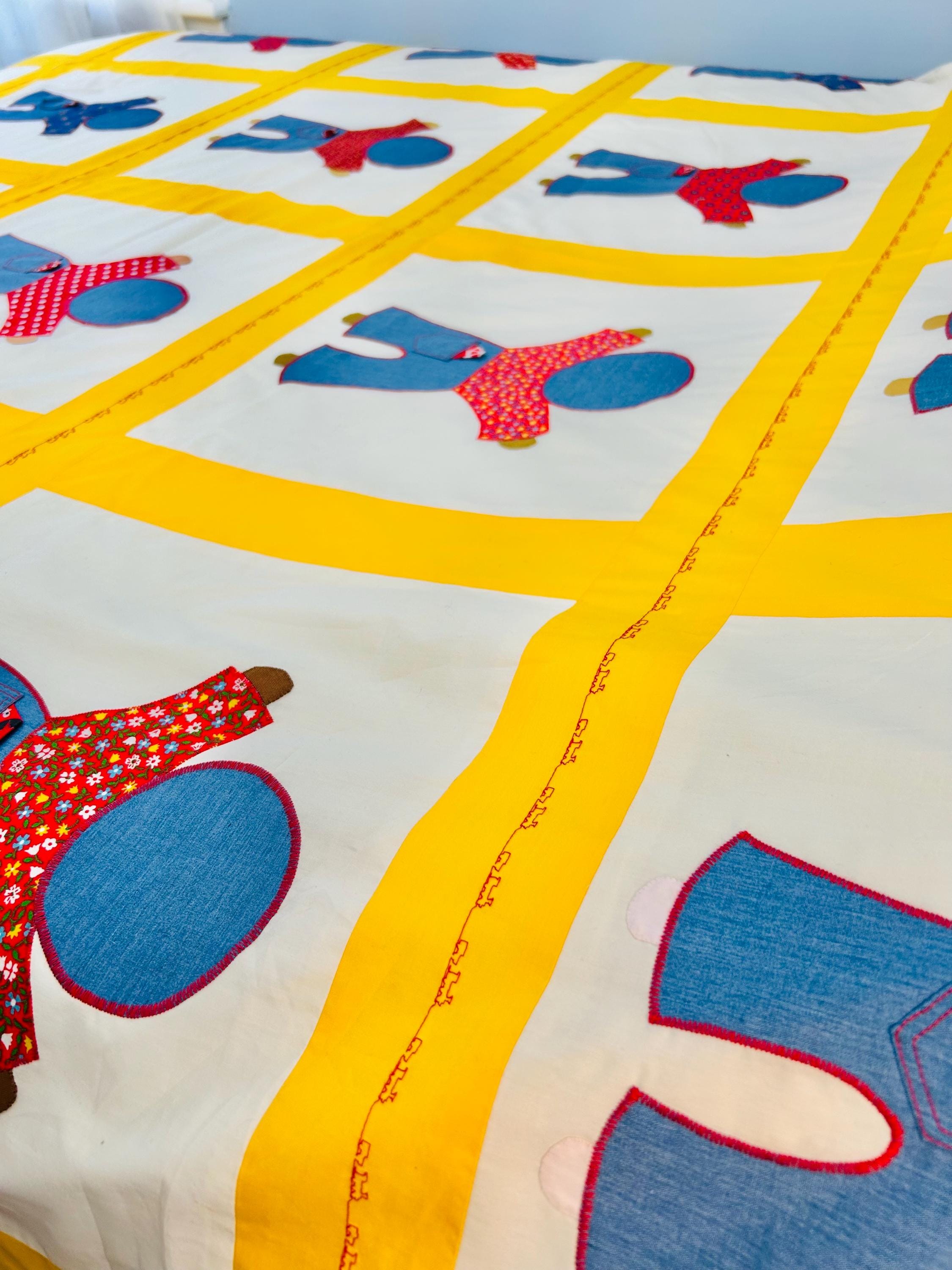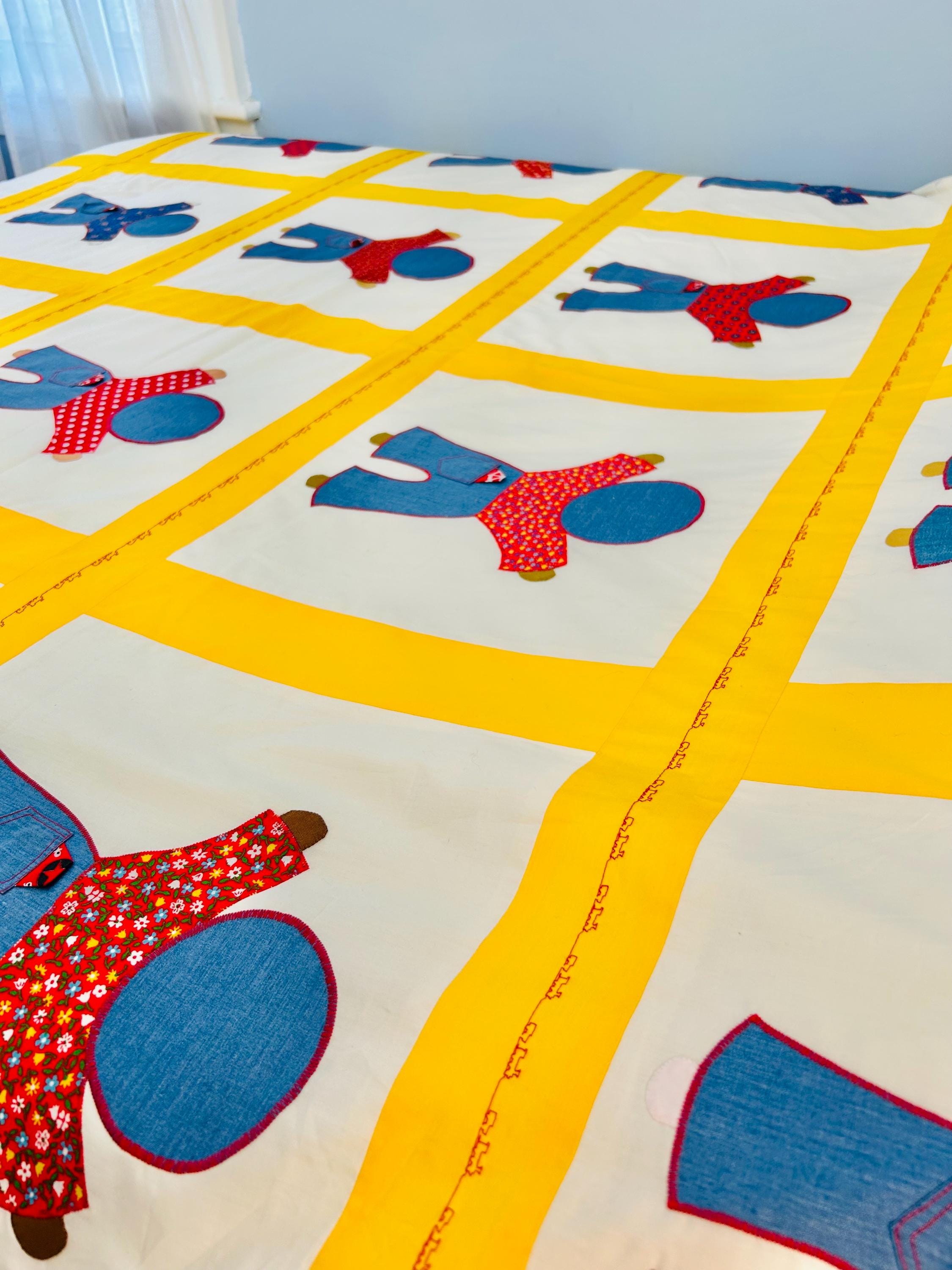 Details • Type: Vintage summer coverlet • Date: Circa 1940s–1950s • Design: Overall Sam • Size: 76” x 92” • Materials: Cotton fabrics with appliqué construction • Colors: White ground with yellow sashing, denim blue, red, and multicolor prints • Construction: Hand-guided appliqué with satin stitch edging