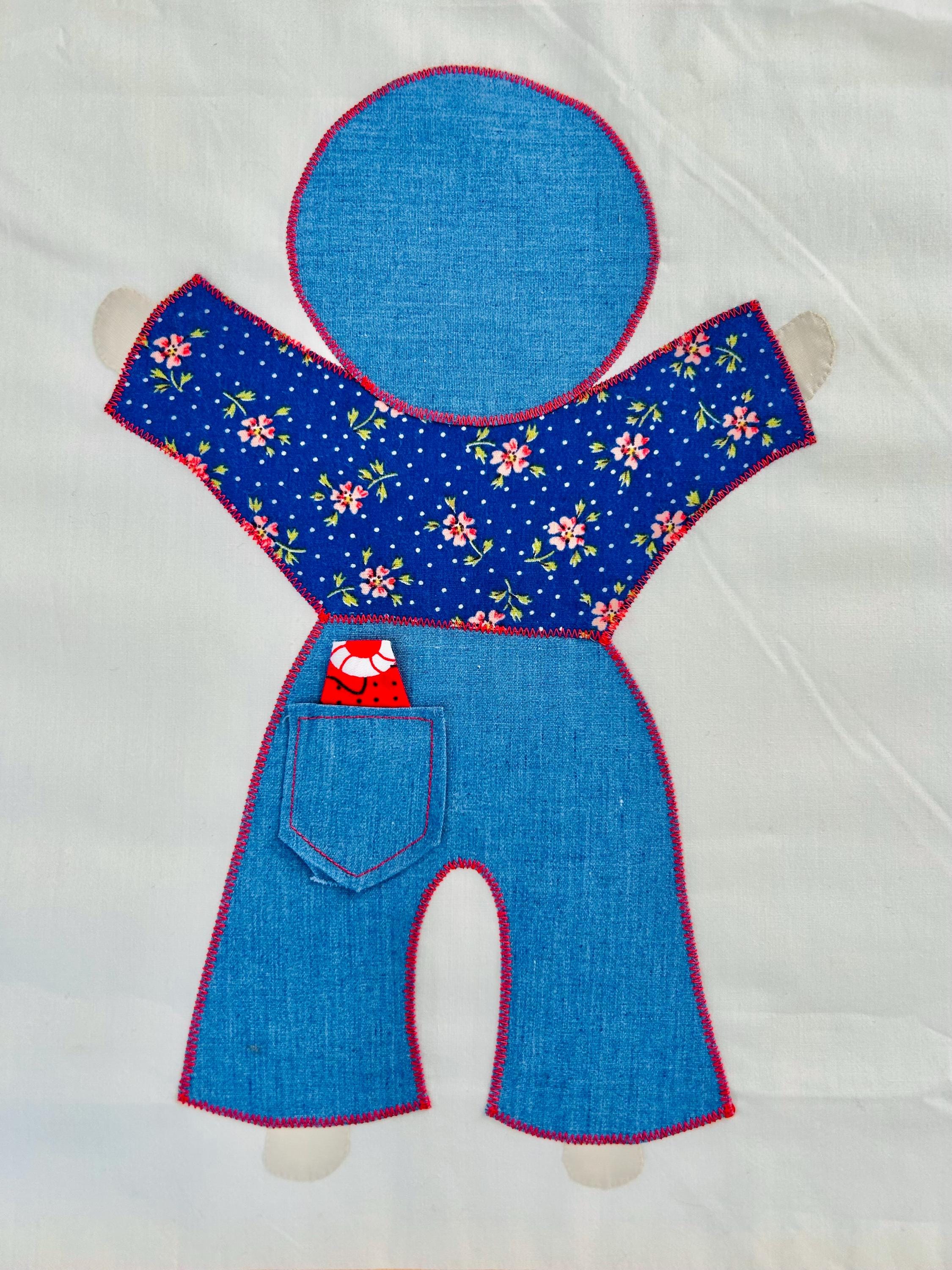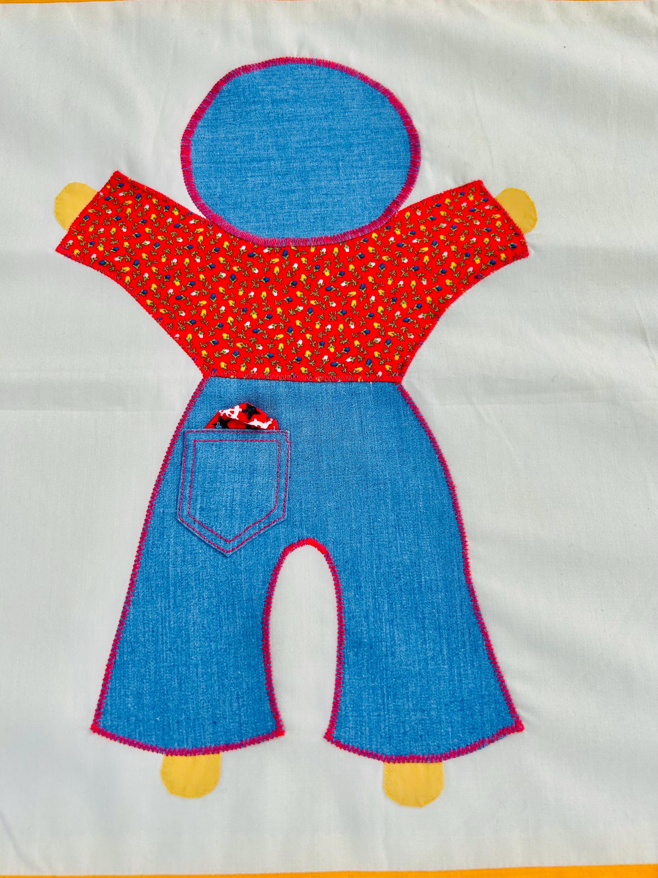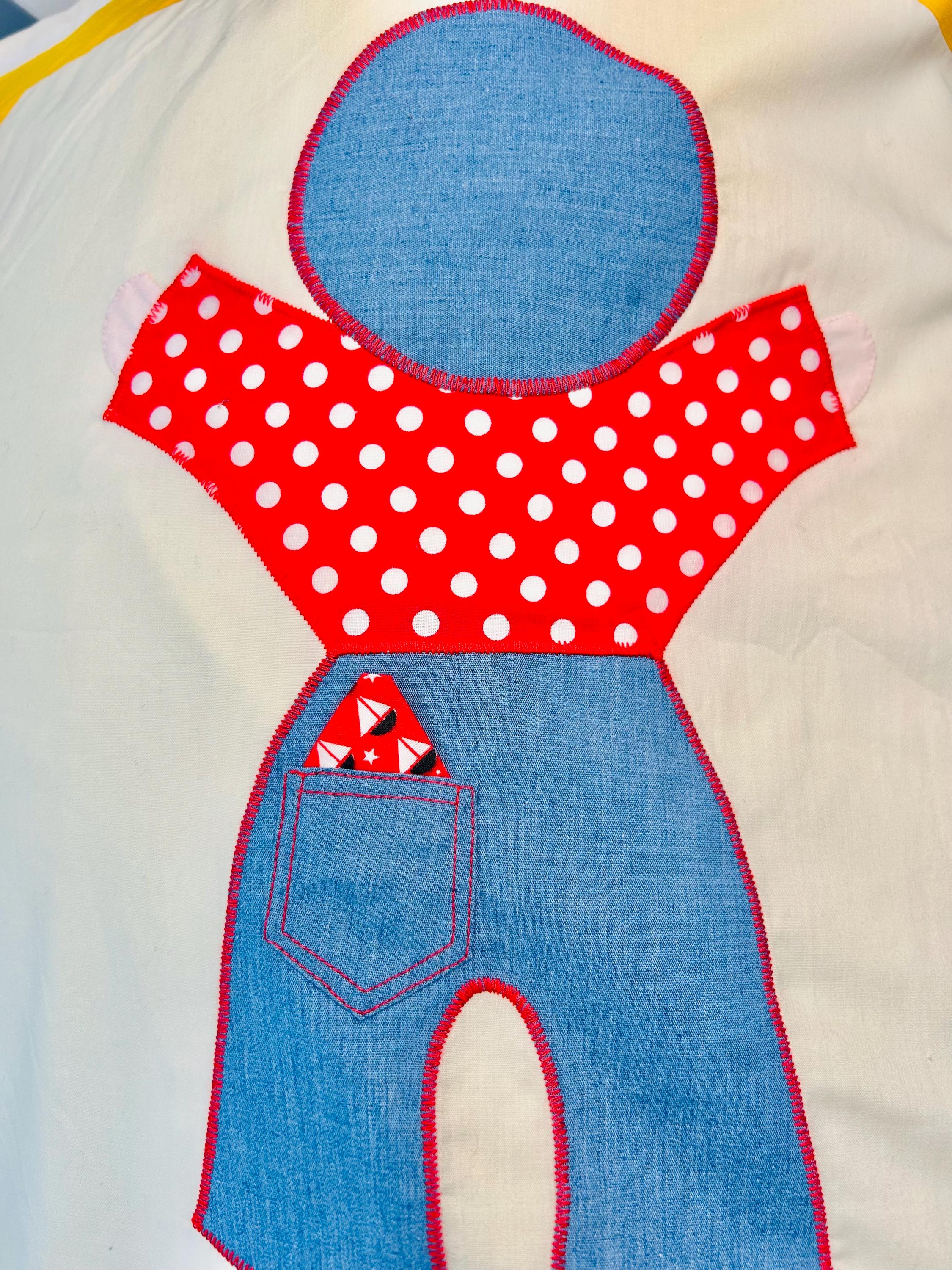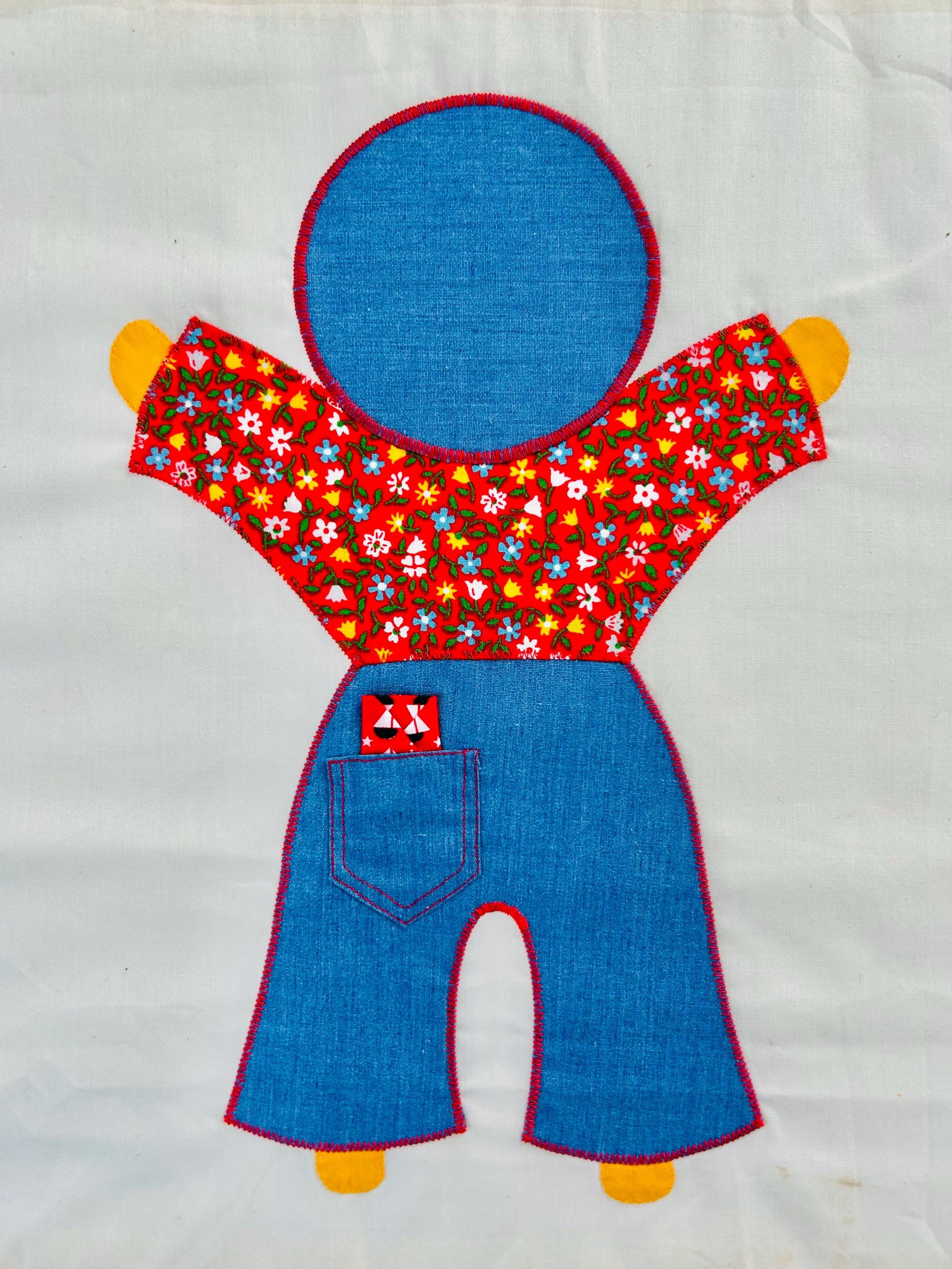 Details • Type: Vintage summer coverlet • Date: Circa 1940s–1950s • Design: Overall Sam • Size: 76” x 92” • Materials: Cotton fabrics with appliqué construction • Colors: White ground with yellow sashing, denim blue, red, and multicolor prints • Construction: Hand-guided appliqué with satin stitch edging